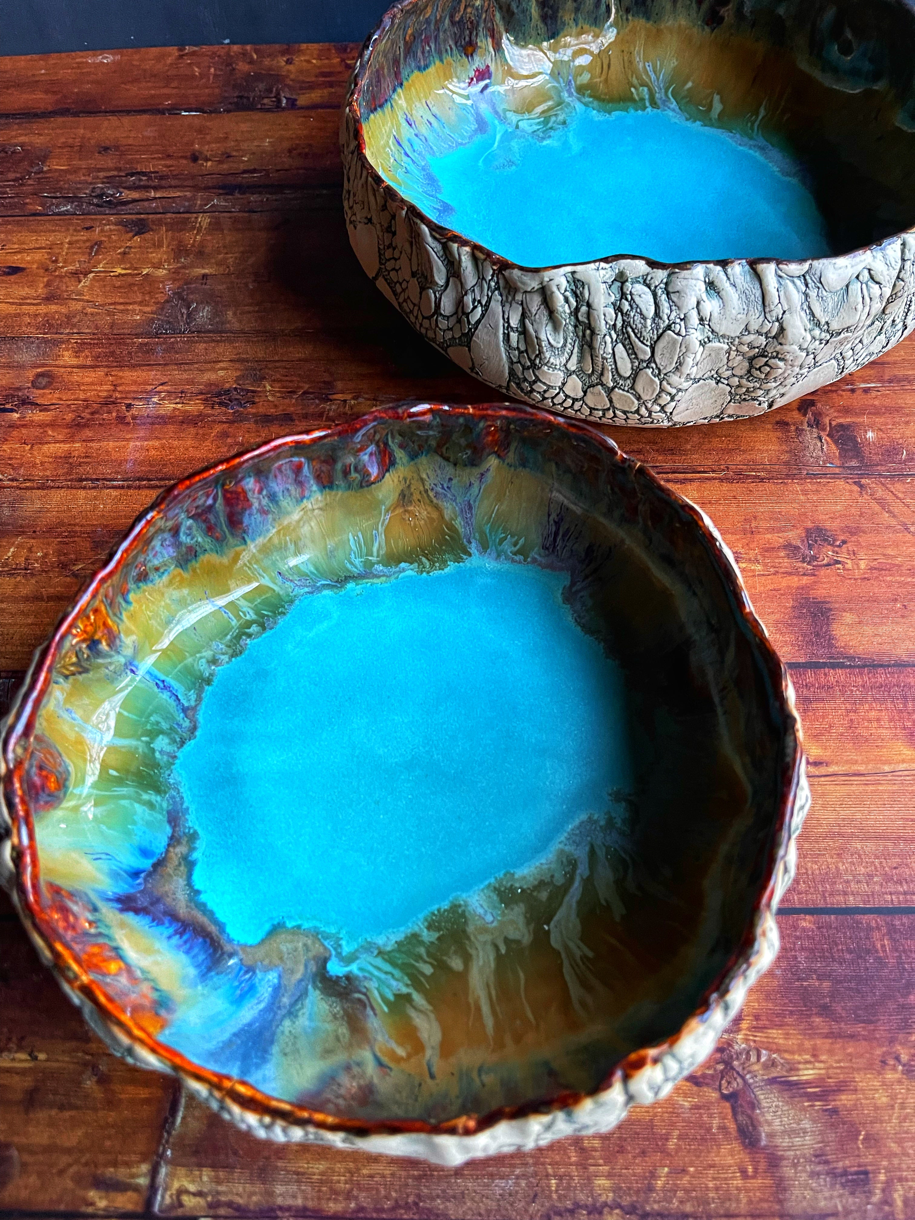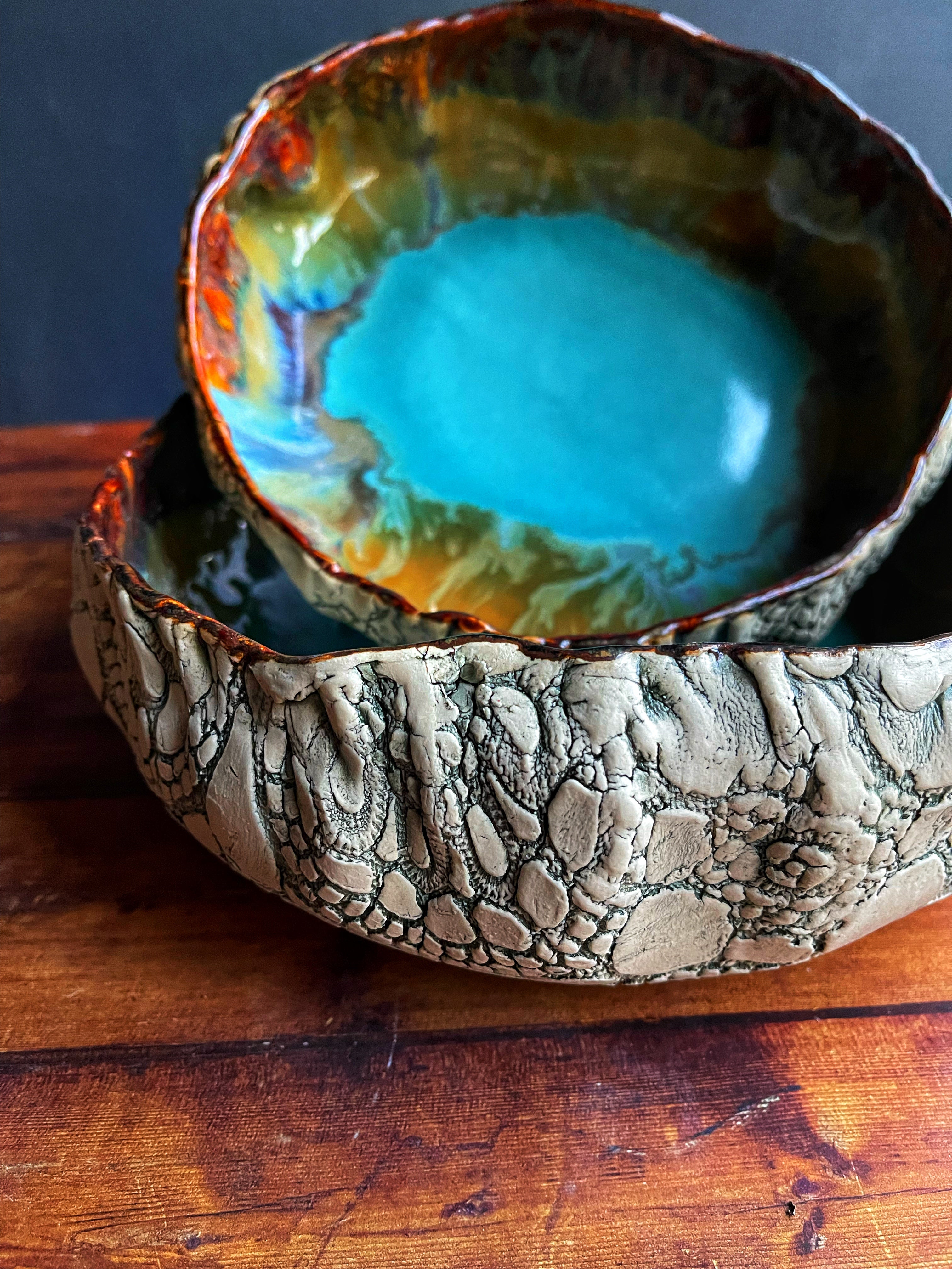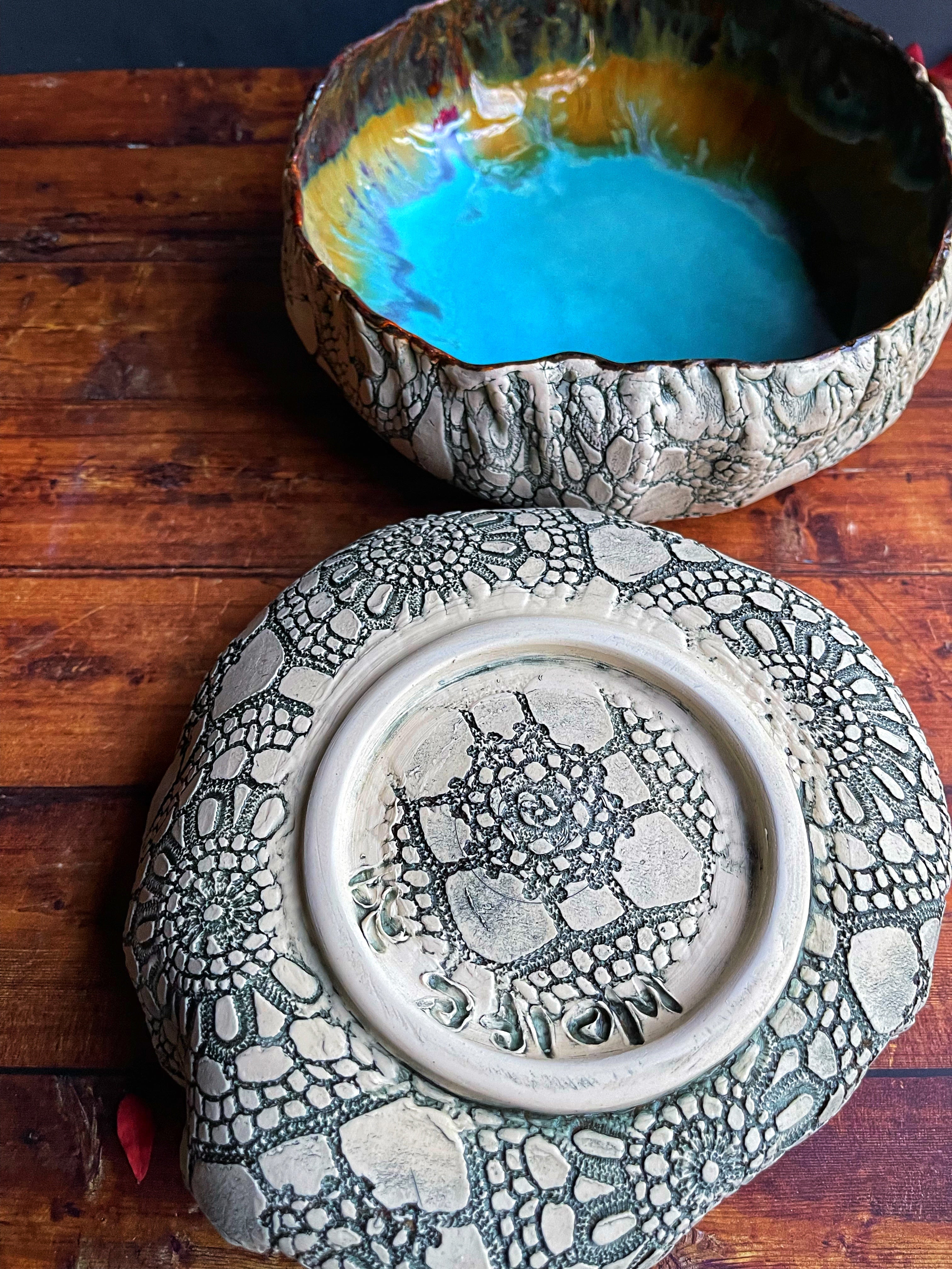 My rustic ceramic bowl collection marries sculpture with functional serving, and gives your table something as organic and nourishing as the food you serve. The outer texture is made by pressing my Nana's old crochet lace tablecloth into the wet clay.