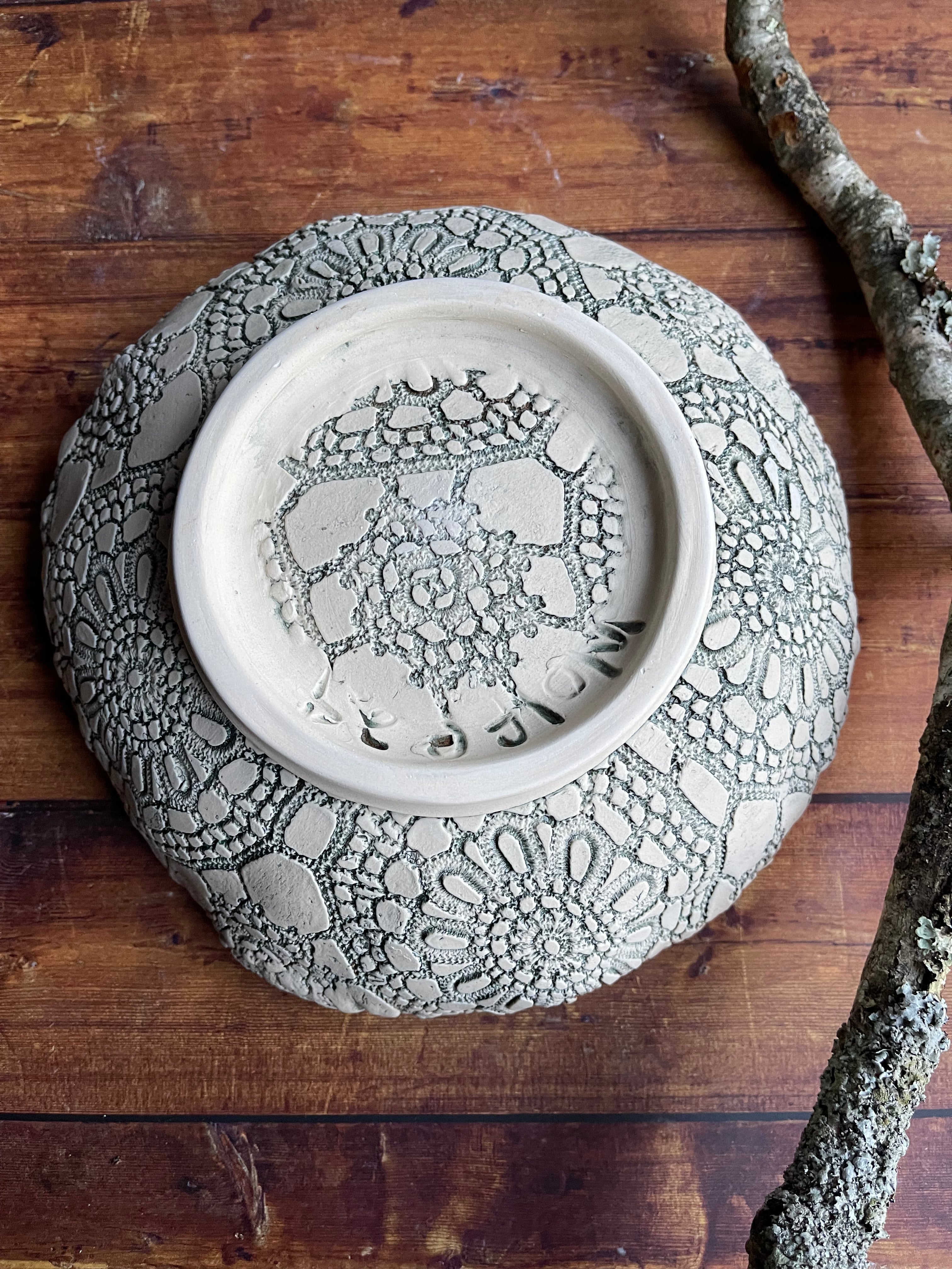My rustic ceramic bowl collection marries sculpture with functional serving, and gives your table something as organic and nourishing as the food you serve. The outer texture is made by pressing my Nana's old crochet lace tablecloth into the wet clay.