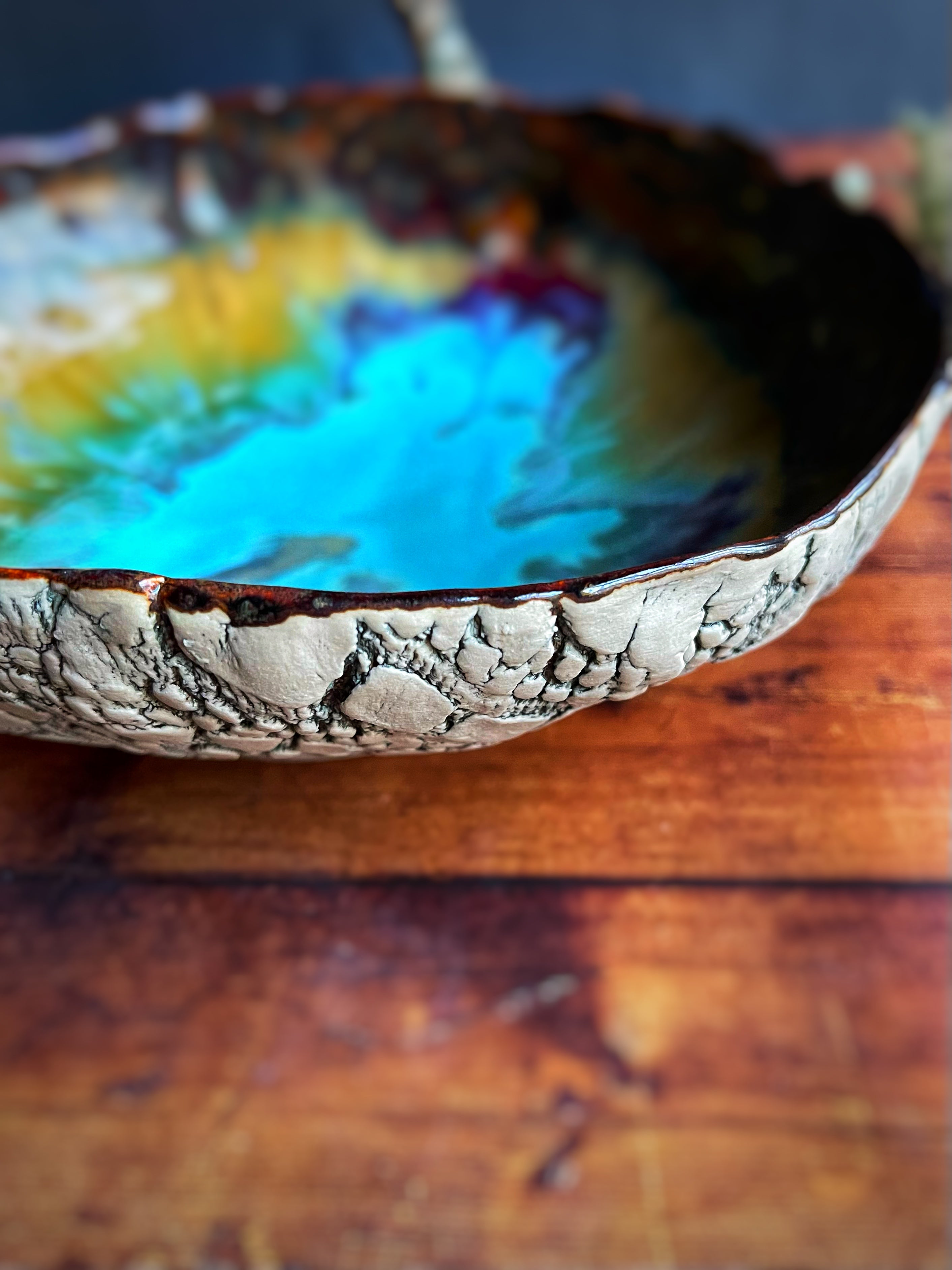 This is a taller bowl, allowing the glazes to flow beautifully . ItIs a statement piece that will also hold hold around 4 apples
