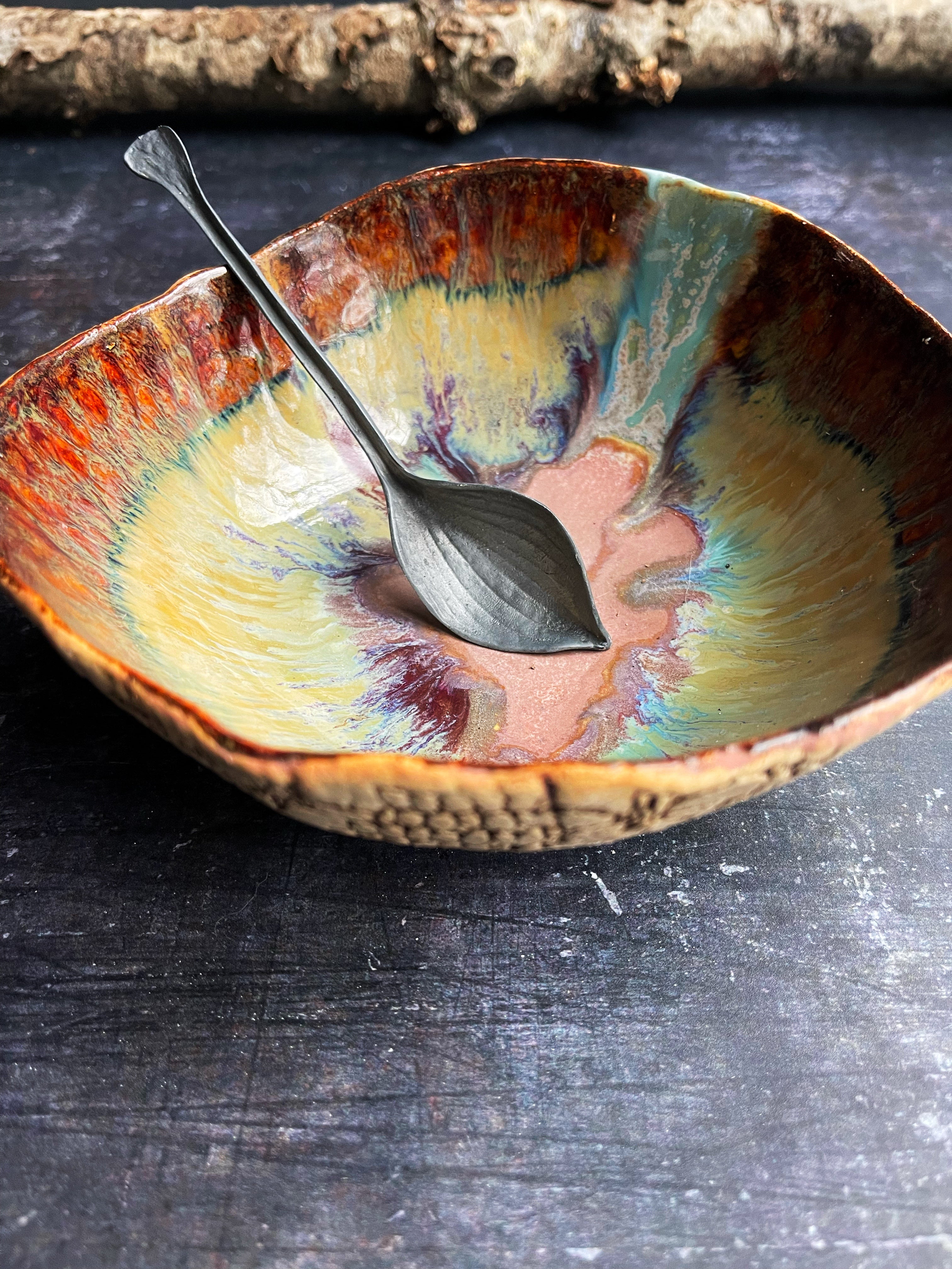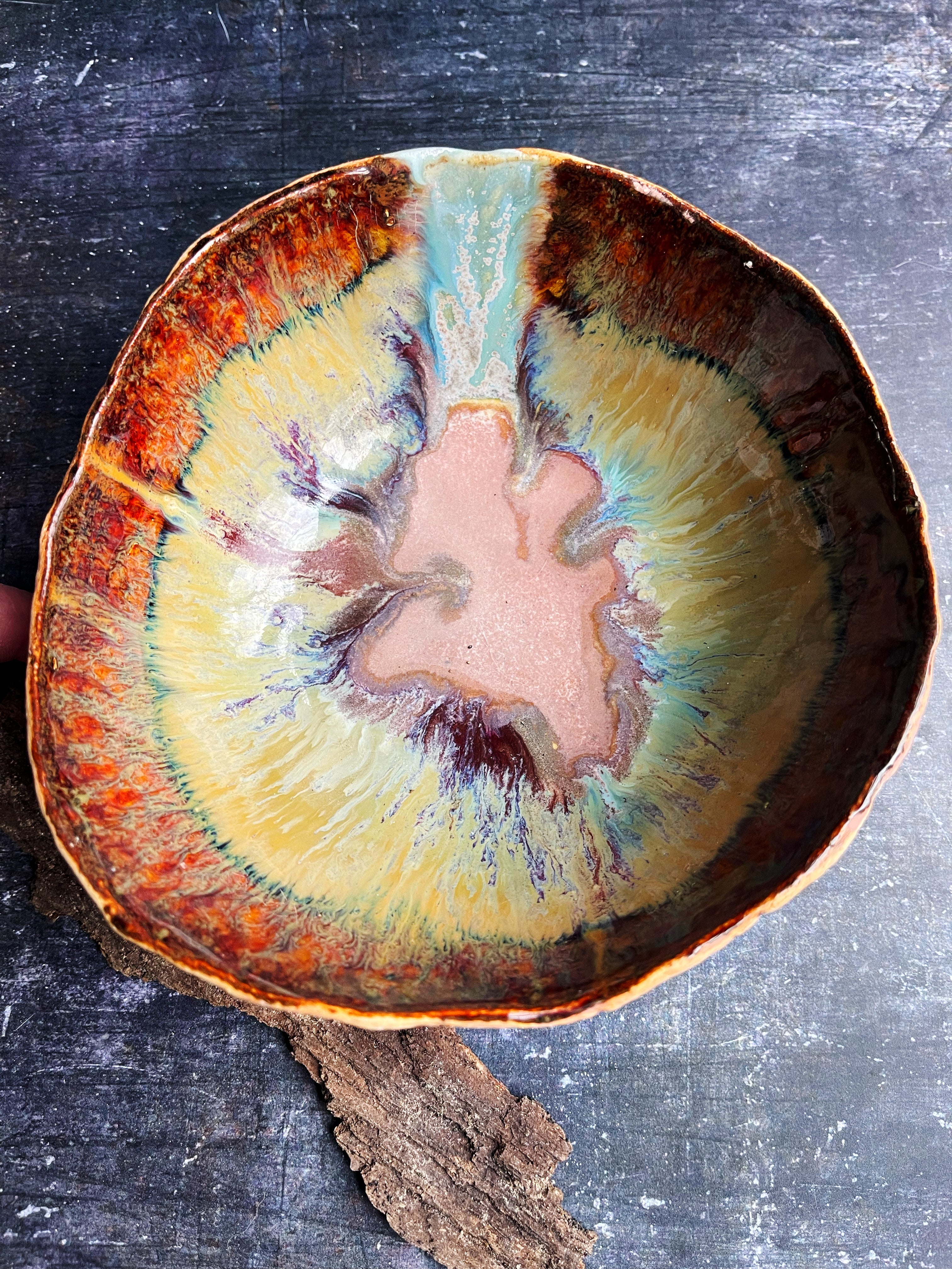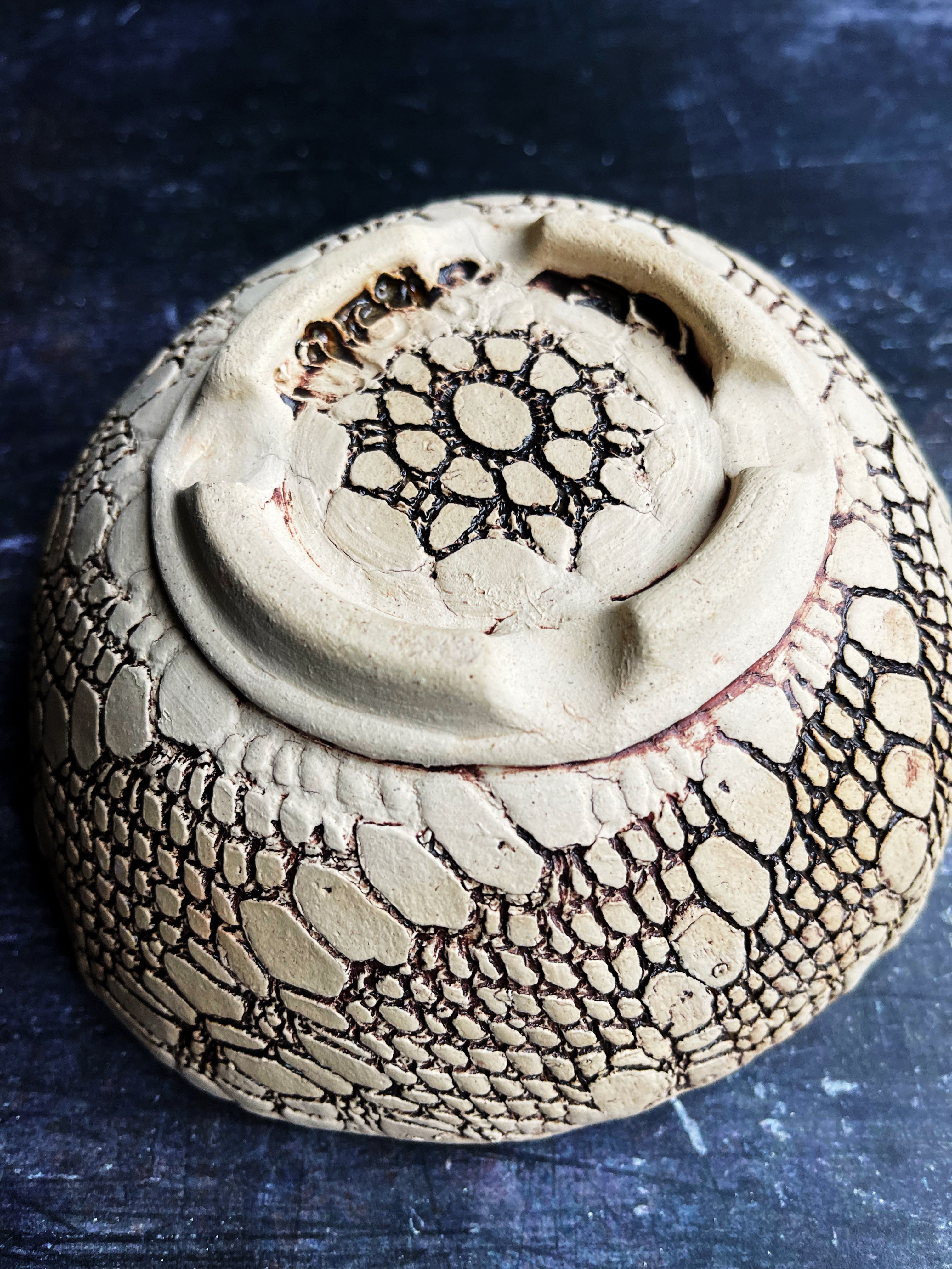 My rustic ceramic bowl collection marries sculpture with functional serving, and gives your table something as organic and nourishing as the food you serve. This one is glazed in River Journey; a blend of 5 glazes that depict the colors I see whitewater rafting in the Blue Ridge Mountains. The outer texture is made by pressing my Nana's old crochet lace tablecloth into the wet clay. The texture is accented by an iron oxide, permanently fired into the piece.