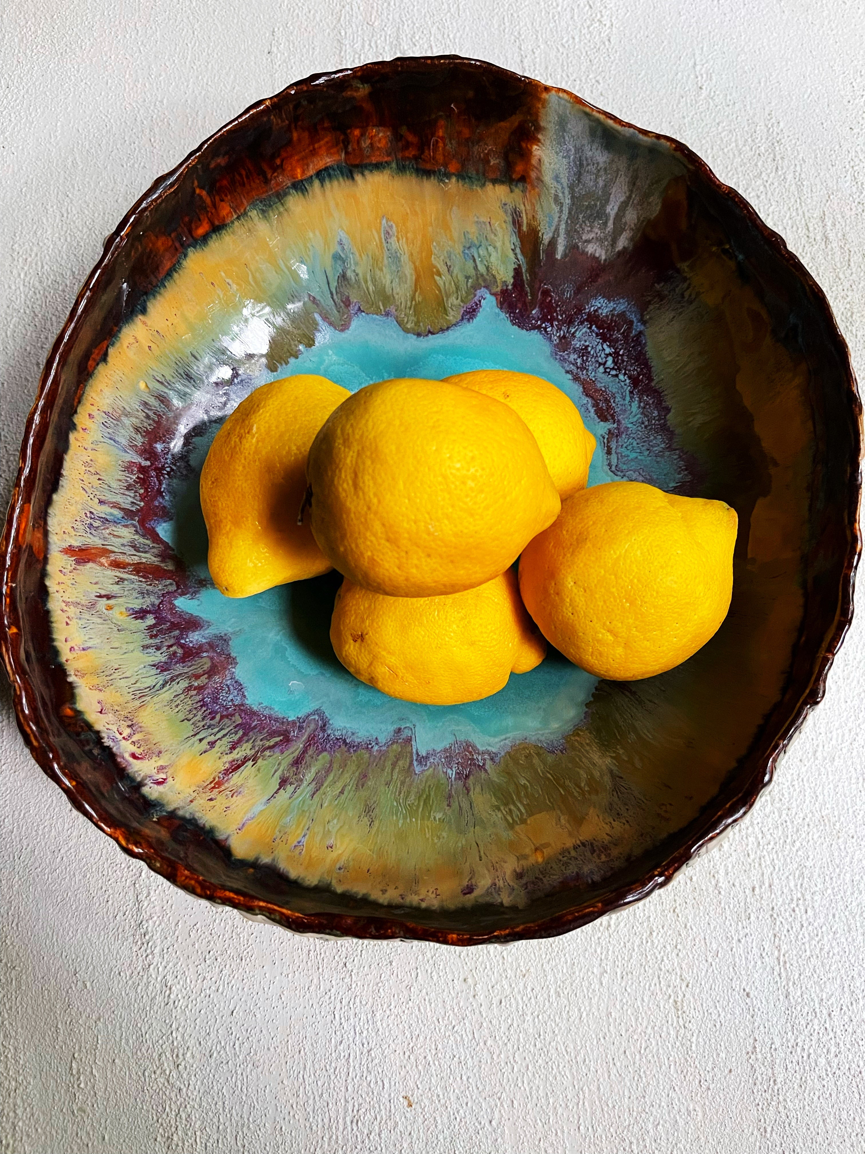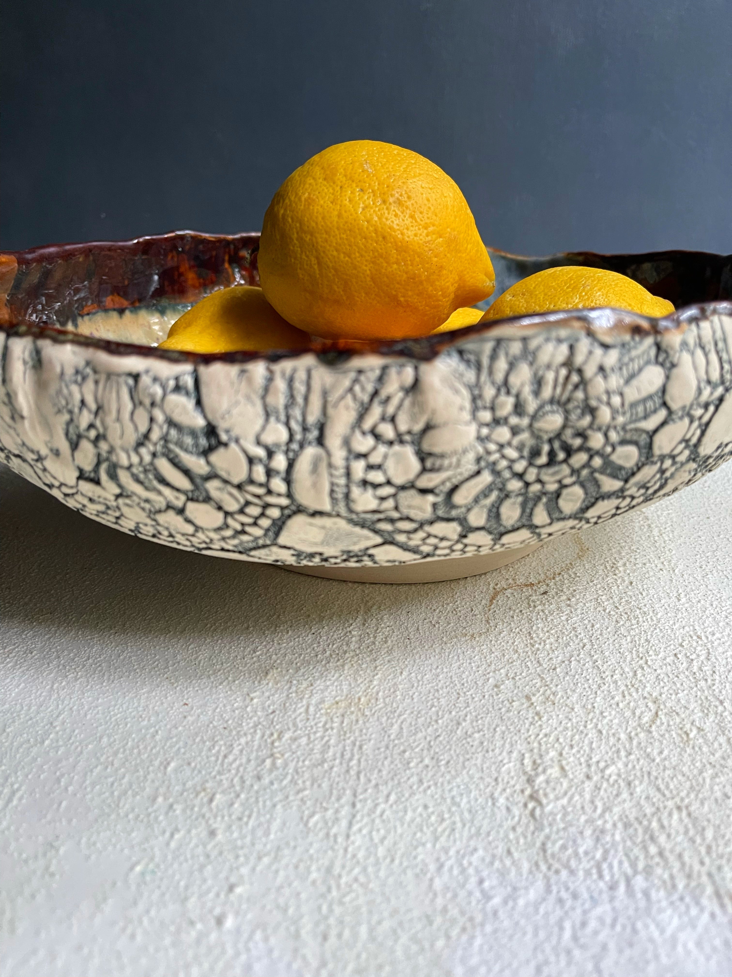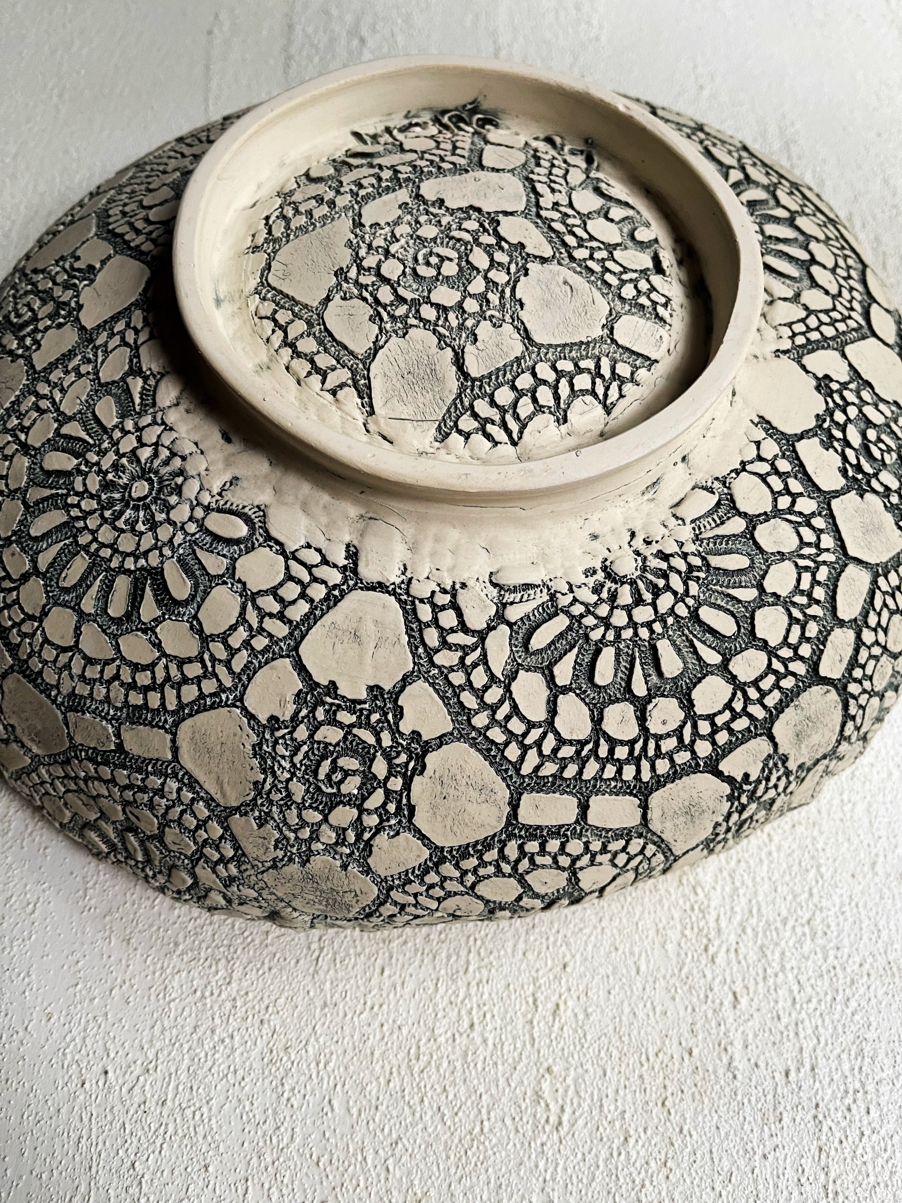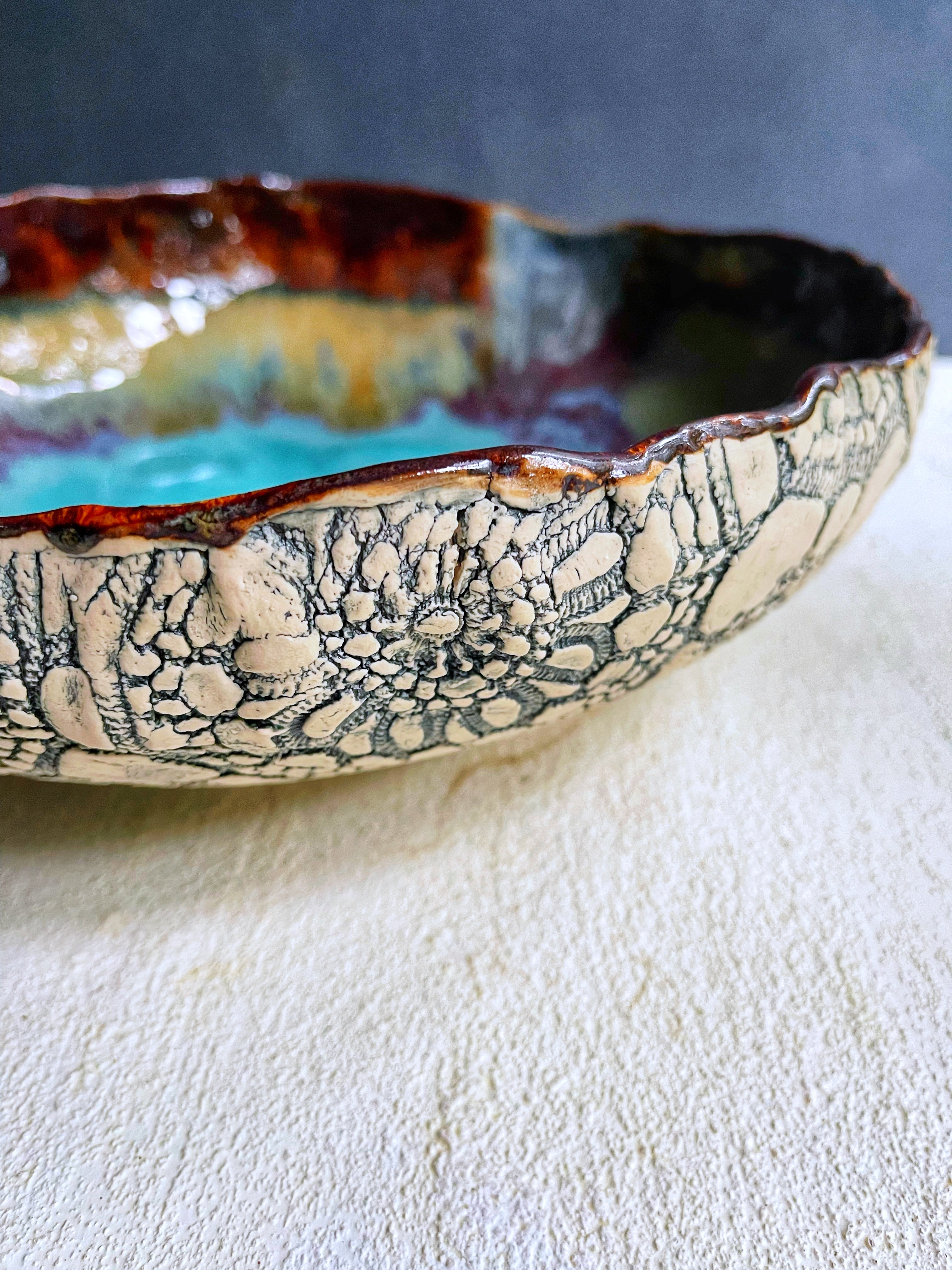 My rustic ceramic bowl collection marries sculpture with functional serving, and gives your table something as organic and nourishing as the food you serve. This one is glazed in River Journey; a blend of 5 glazes that depict the colors I see whitewater rafting in the Blue Ridge Mountains. The outer texture is made by pressing my Nana's old crochet lace tablecloth into the wet clay. The texture is accented by an iron gglaze , permanently fired into the piece.