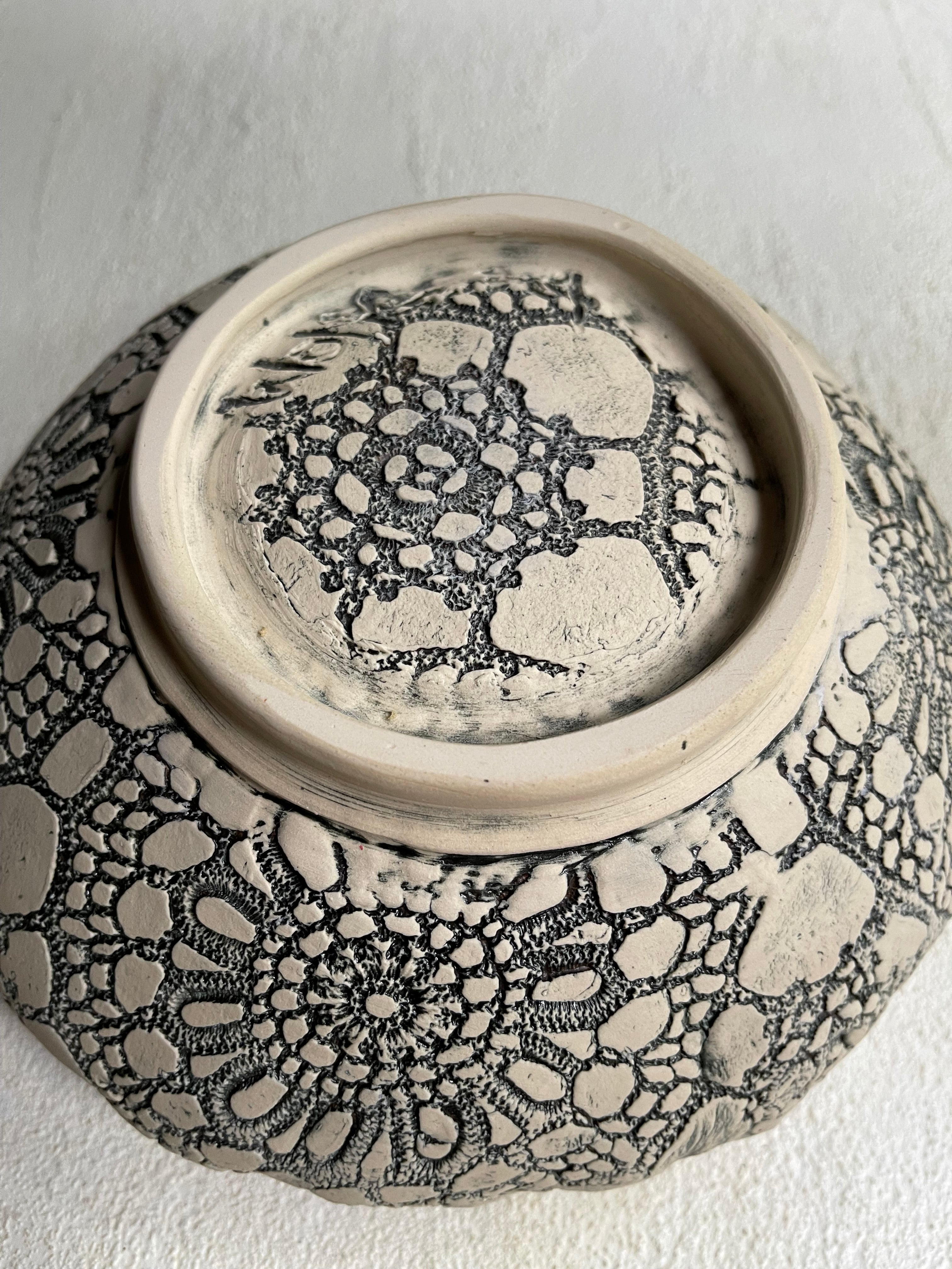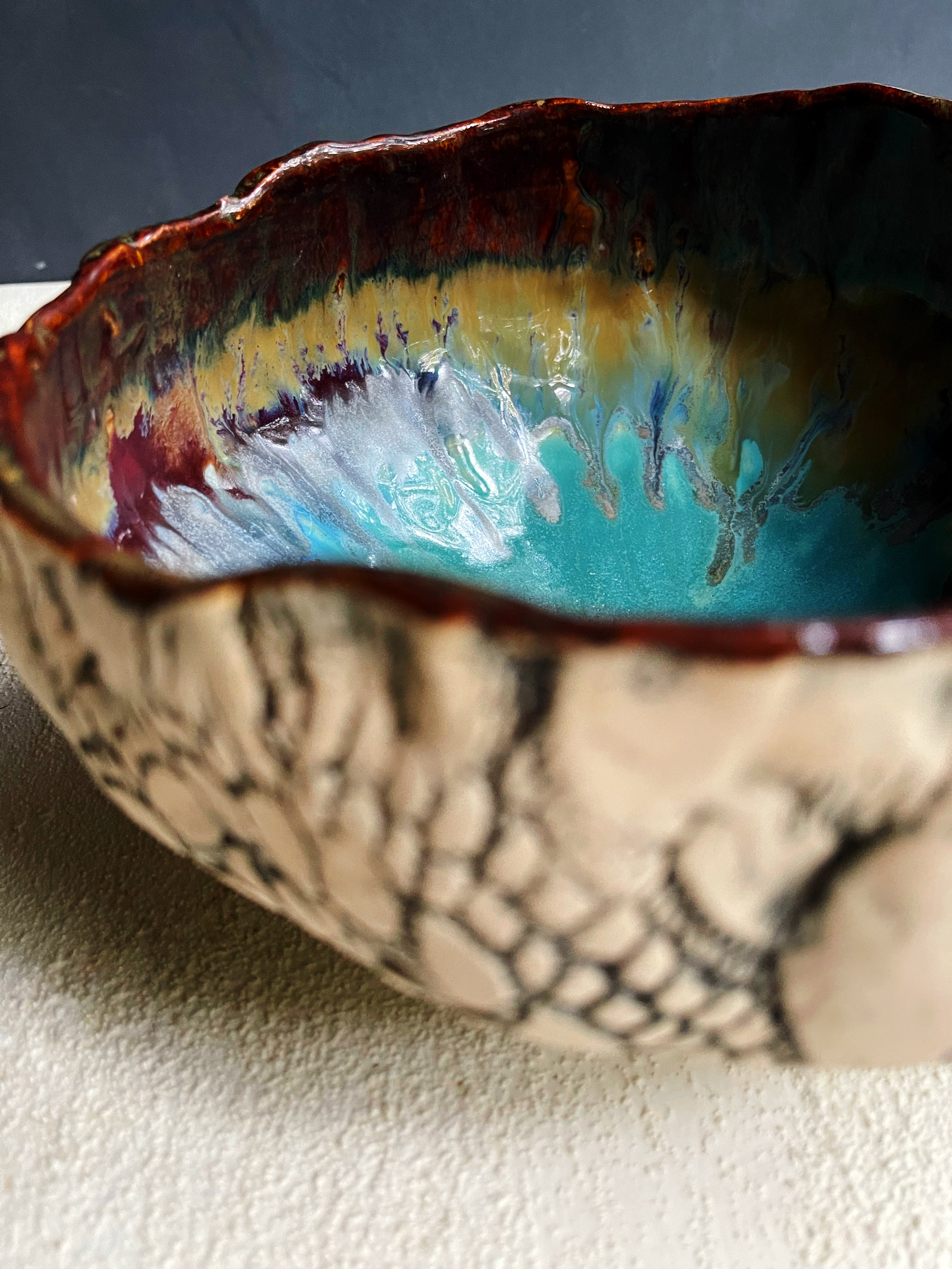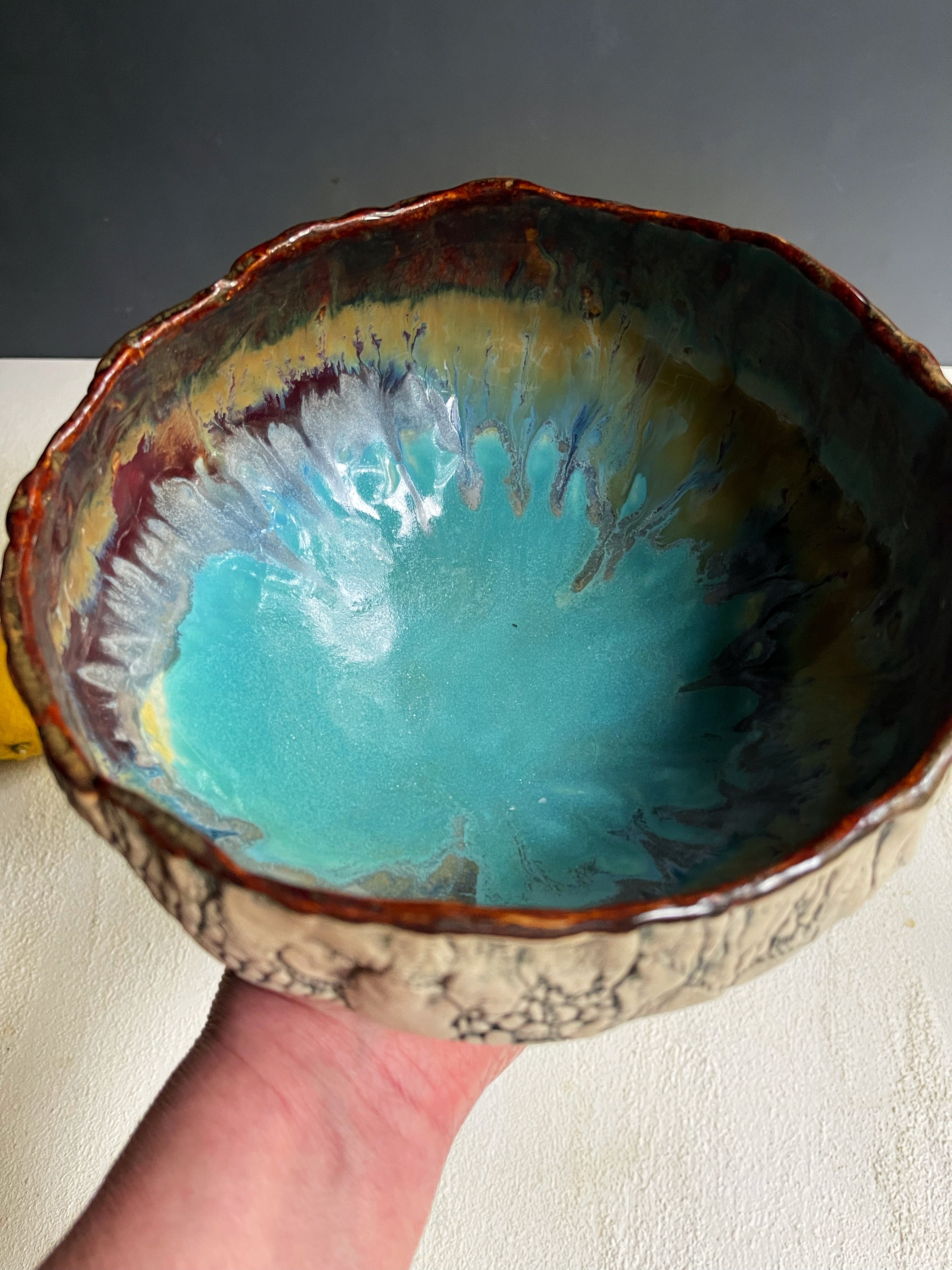 My rustic ceramic bowl collection marries sculpture with functional serving, and gives your table something as organic and nourishing as the food you serve. This one is glazed in River Journey; a blend of 5 glazes that depict the colors I see whitewater rafting in the Blue Ridge Mountains. The outer texture is made by pressing my Nana's old crochet lace tablecloth into the wet clay. The texture is accented by an iron gglaze , permanently fired into the piece.
