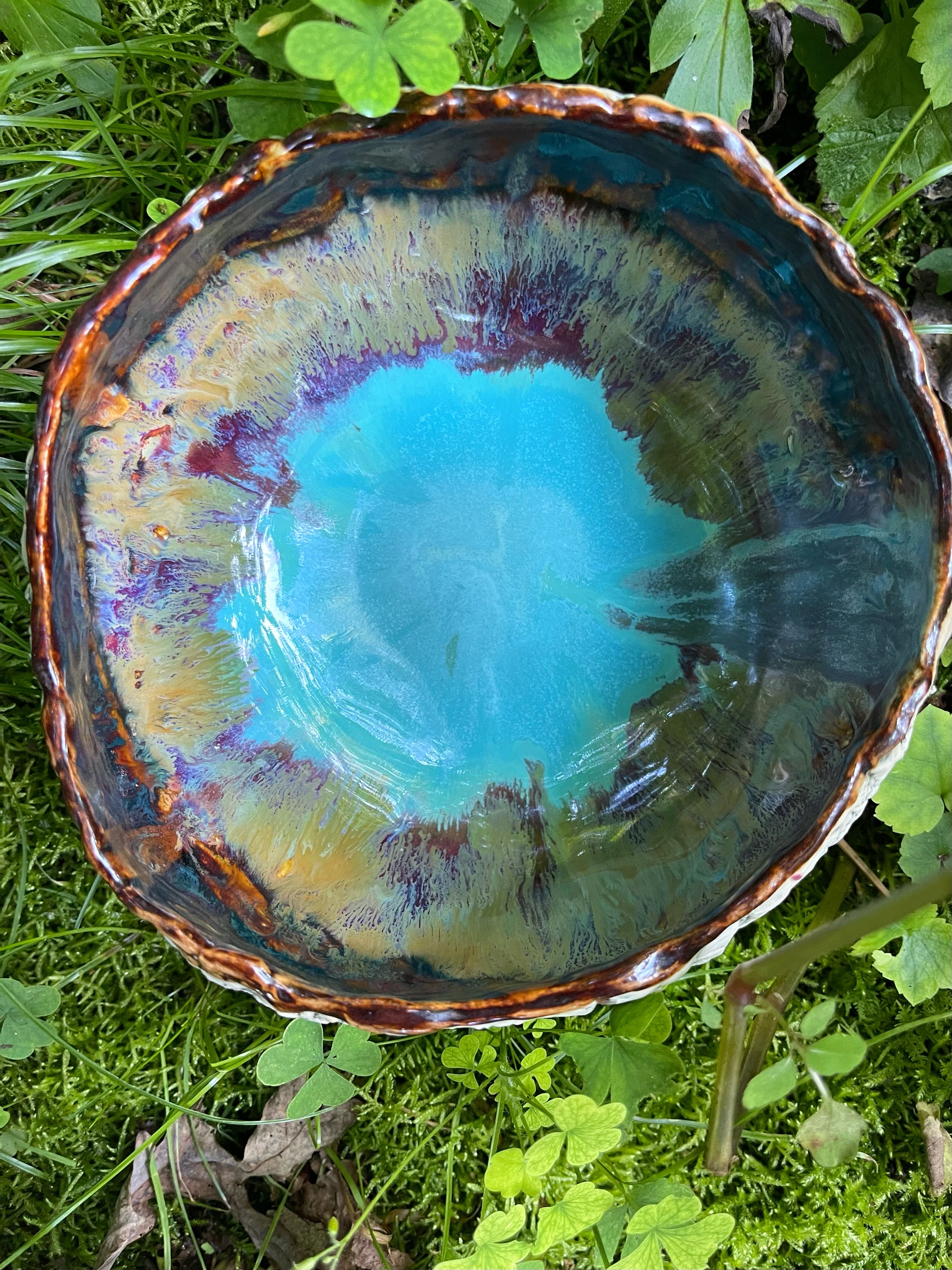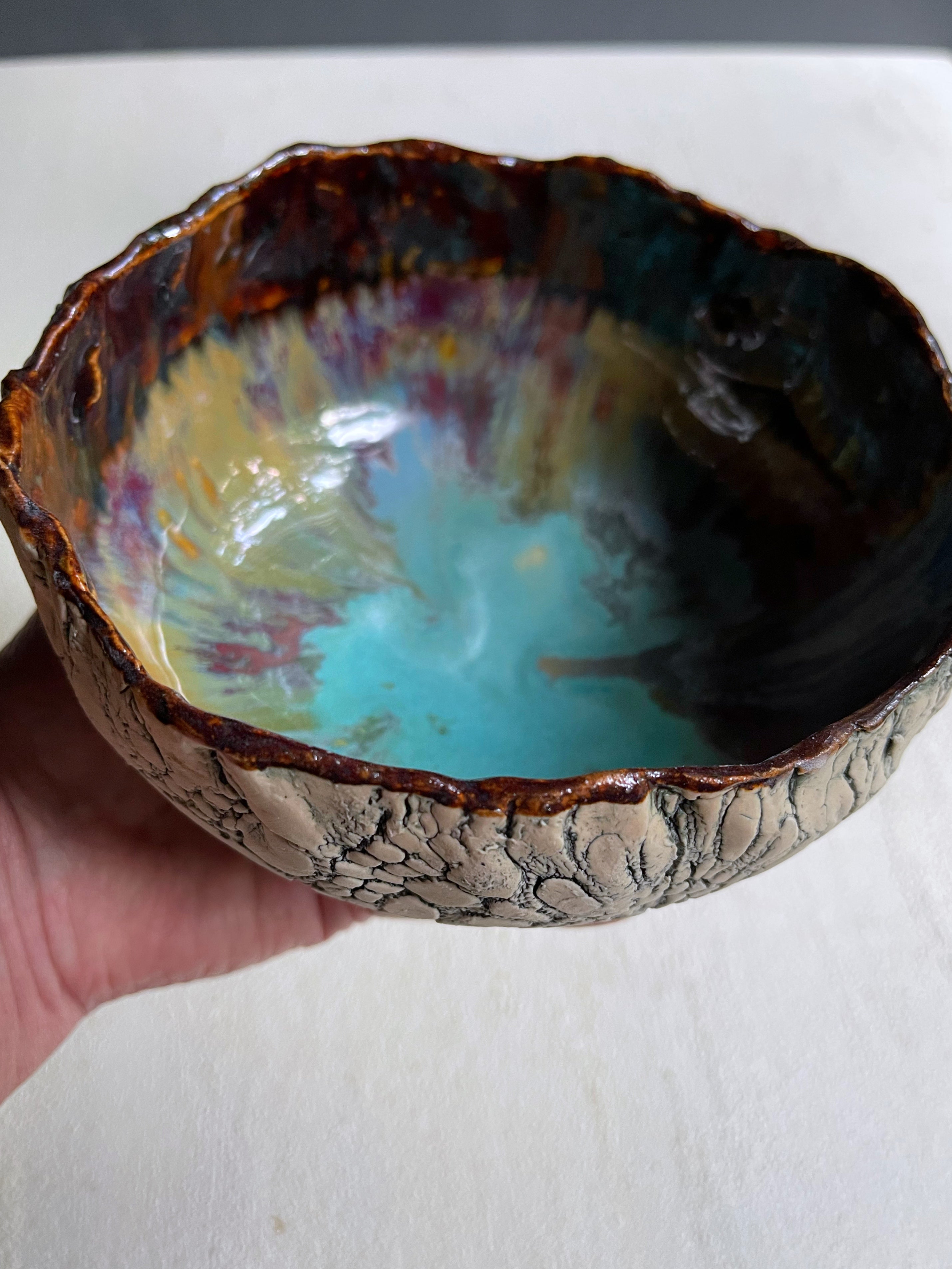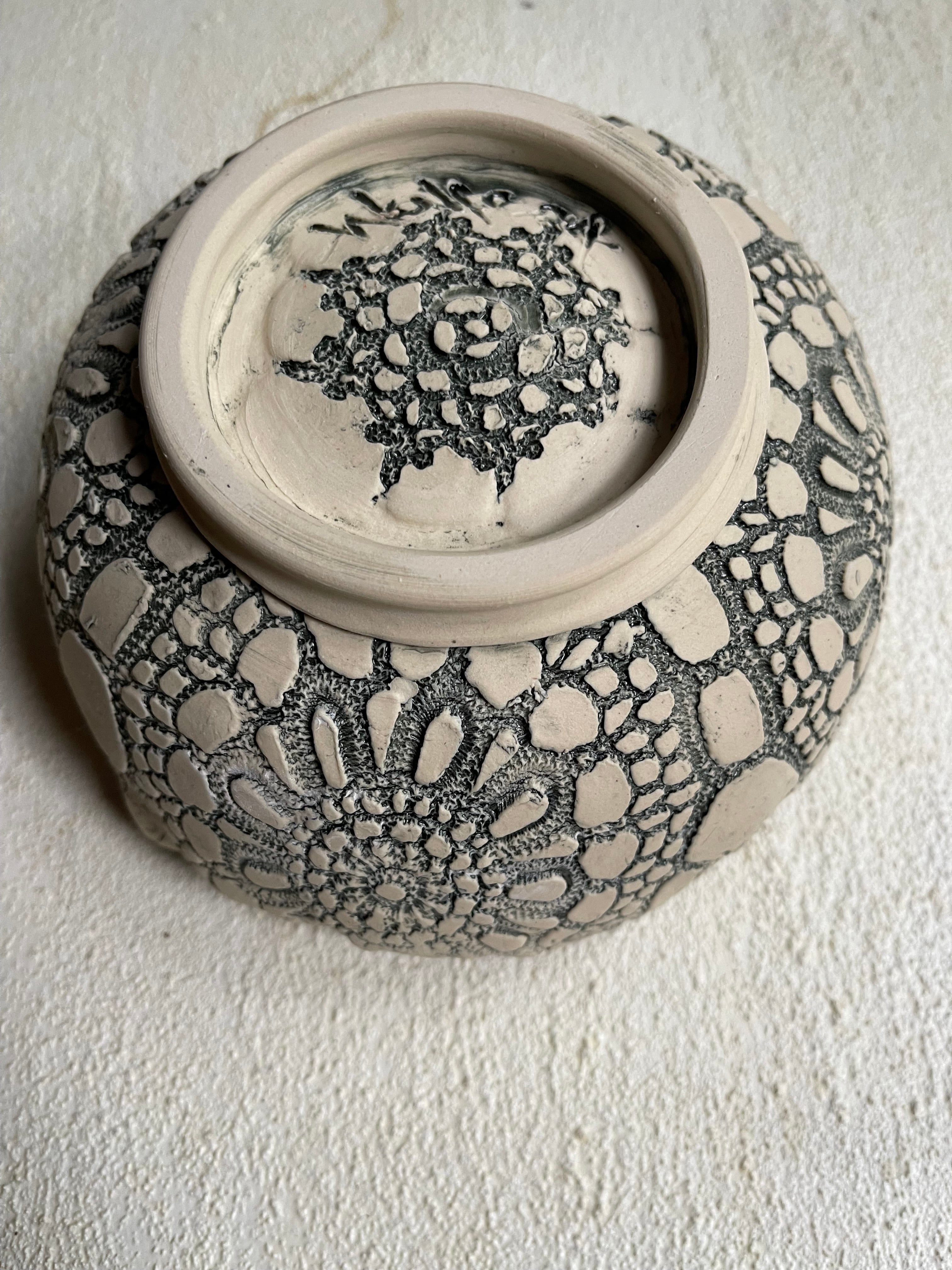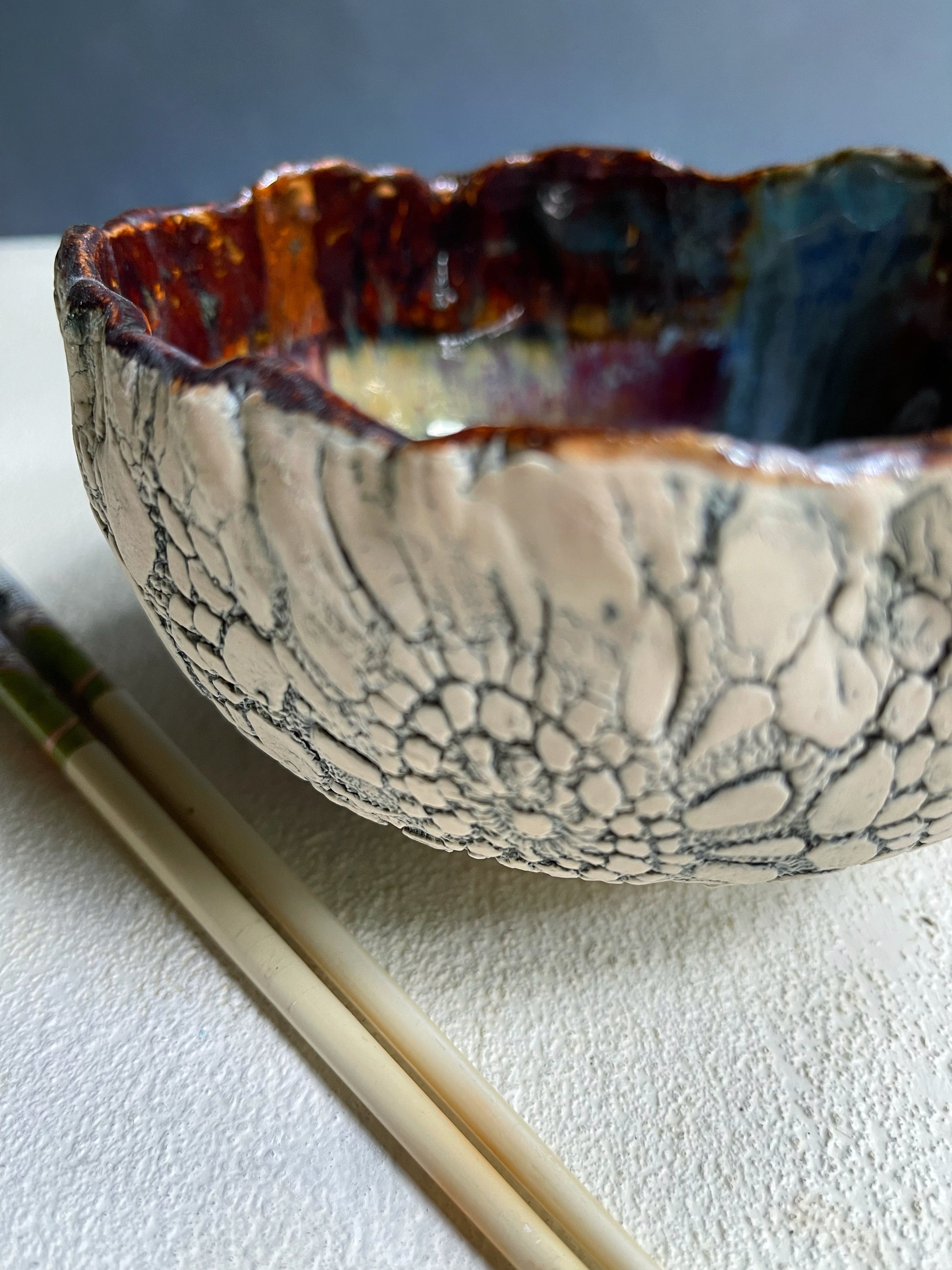 My rustic ceramic bowl collection marries sculpture with functional serving, and gives your table something as organic and nourishing as the food you serve. This one is glazed in River Journey; a blend of 5 glazes that depict the colors I see whitewater rafting in the Blue Ridge Mountains. The outer texture is made by pressing my Nana's old crochet lace tablecloth into the wet clay. The texture is accented by an iron gglaze , permanently fired into the piece.