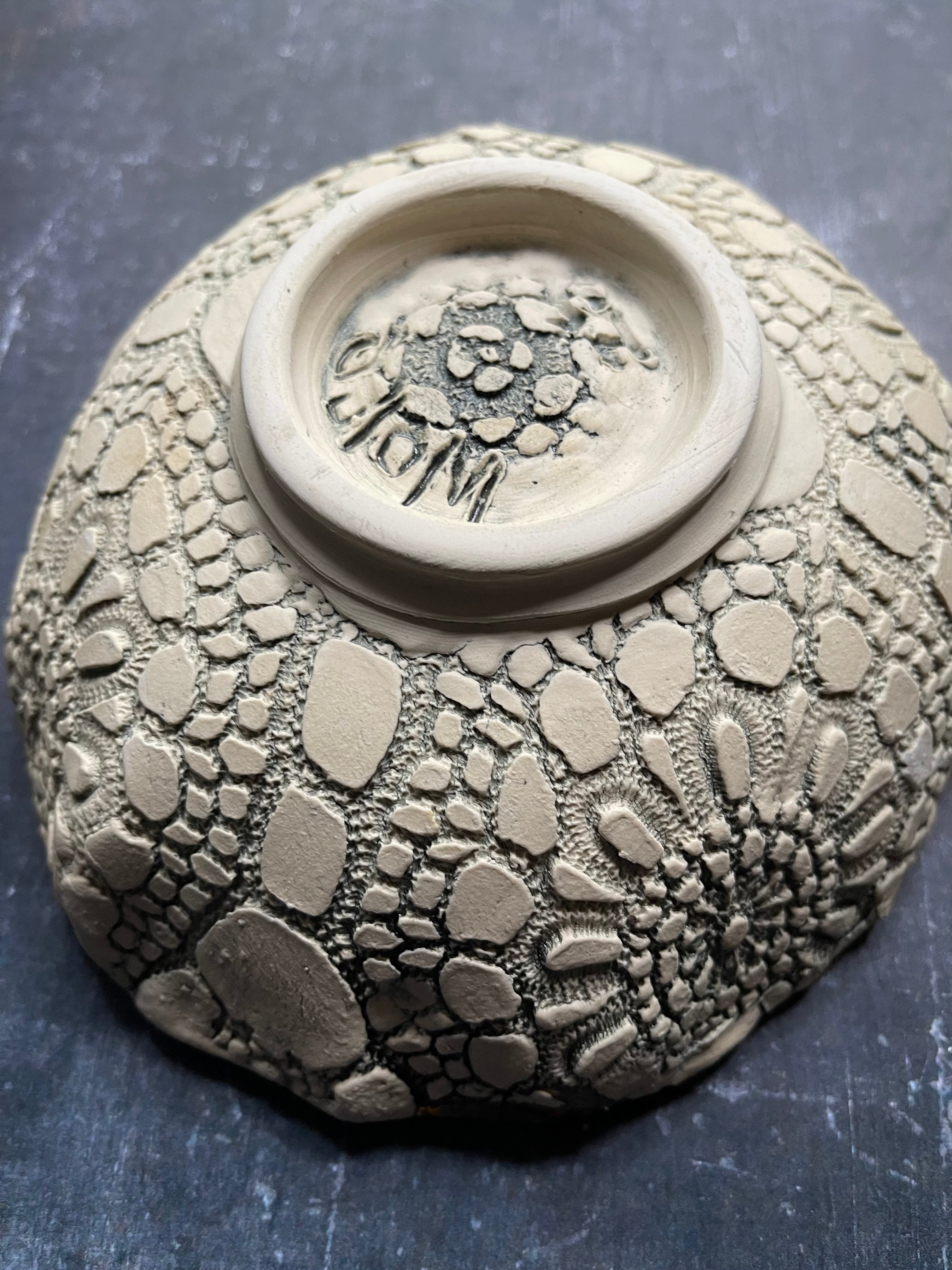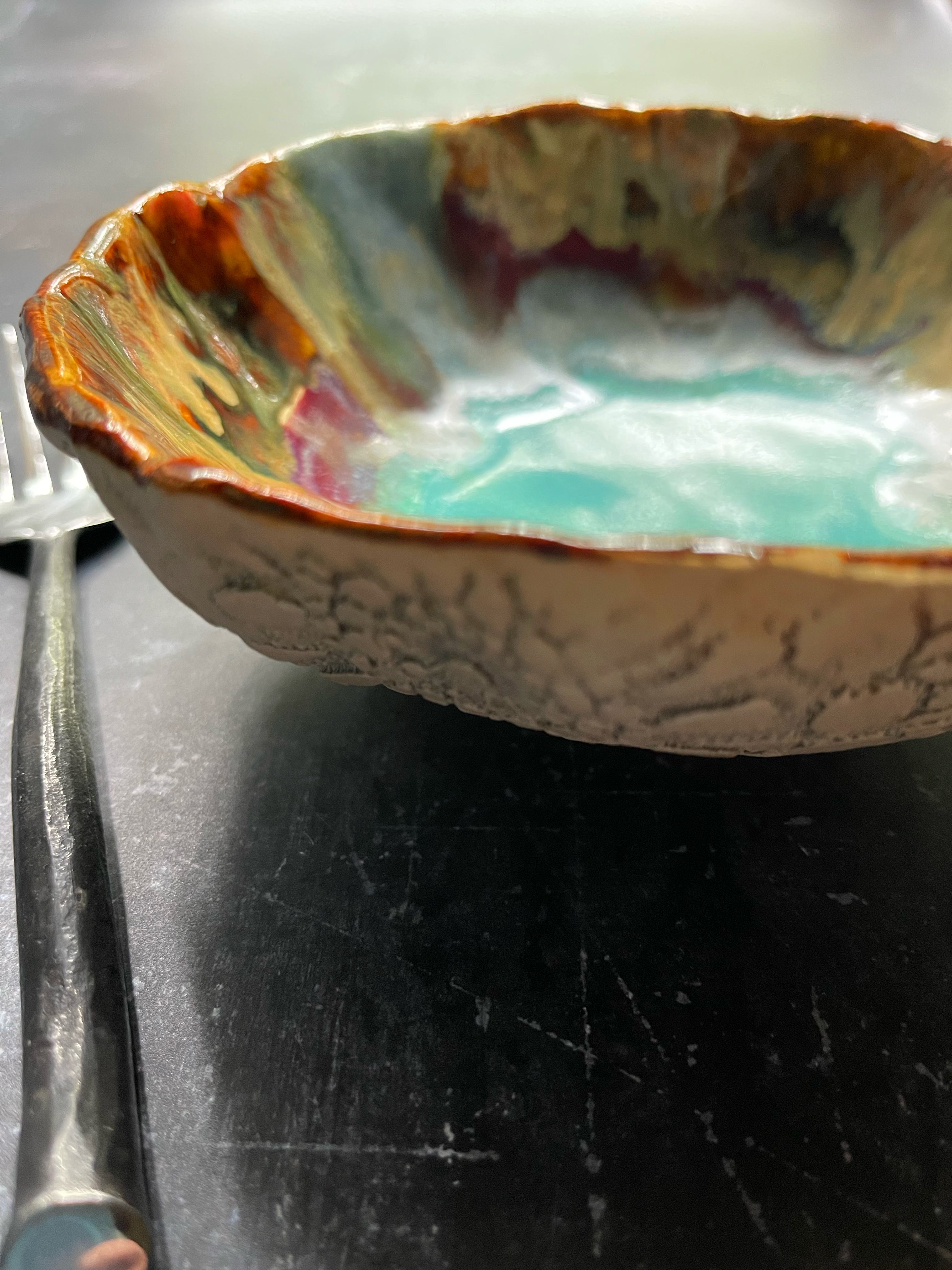 My rustic ceramic bowl collection marries sculpture with functional serving, and gives your table something as organic and nourishing as the food you serve. This one is glazed in River Journey; a blend of 5 glazes that depict the colors I see whitewater rafting in the Blue Ridge Mountains. The outer texture is made by pressing my Nana's old crochet lace tablecloth into the wet clay. The texture is accented by an iron gglaze , permanently fired into the piece.