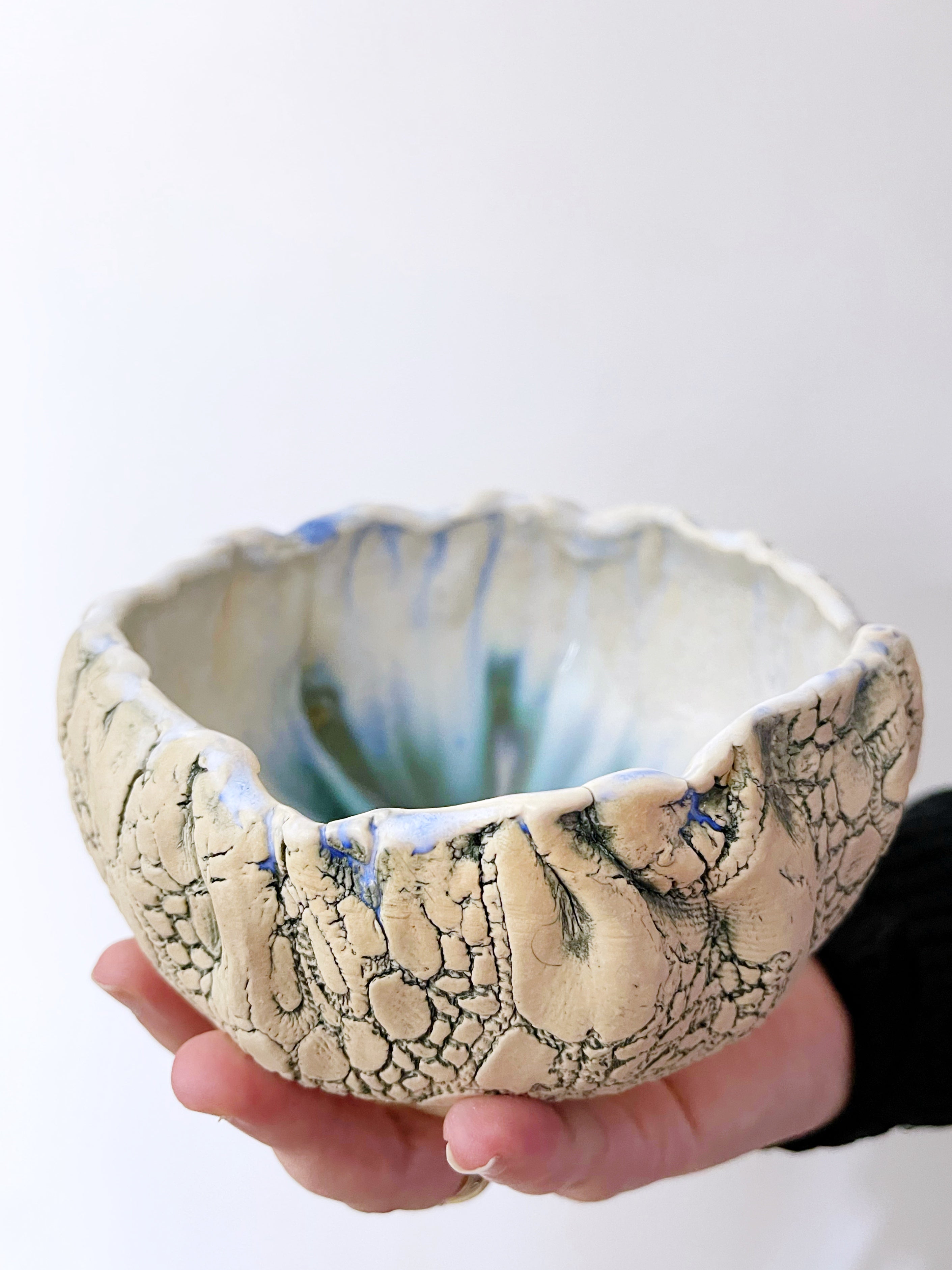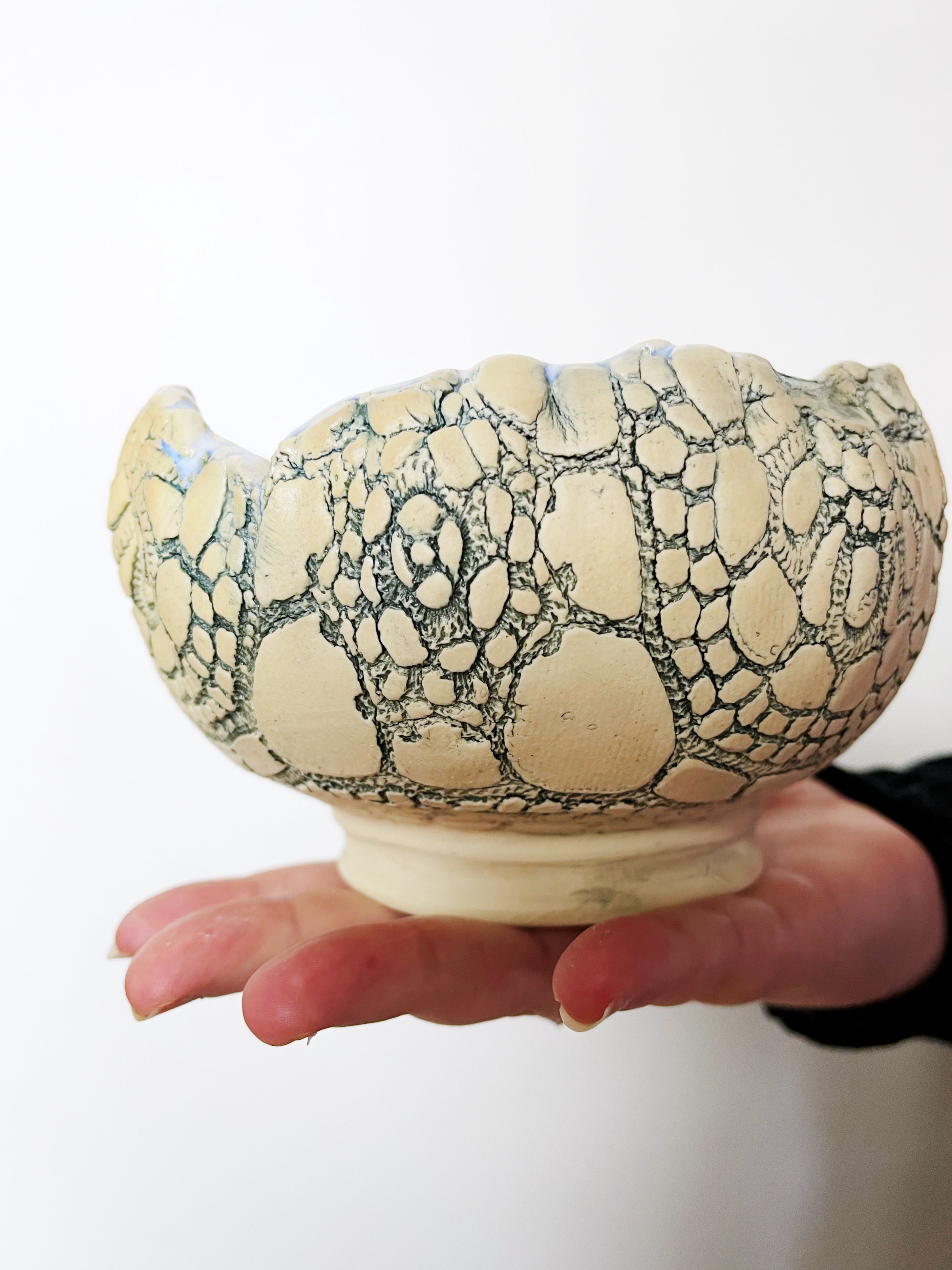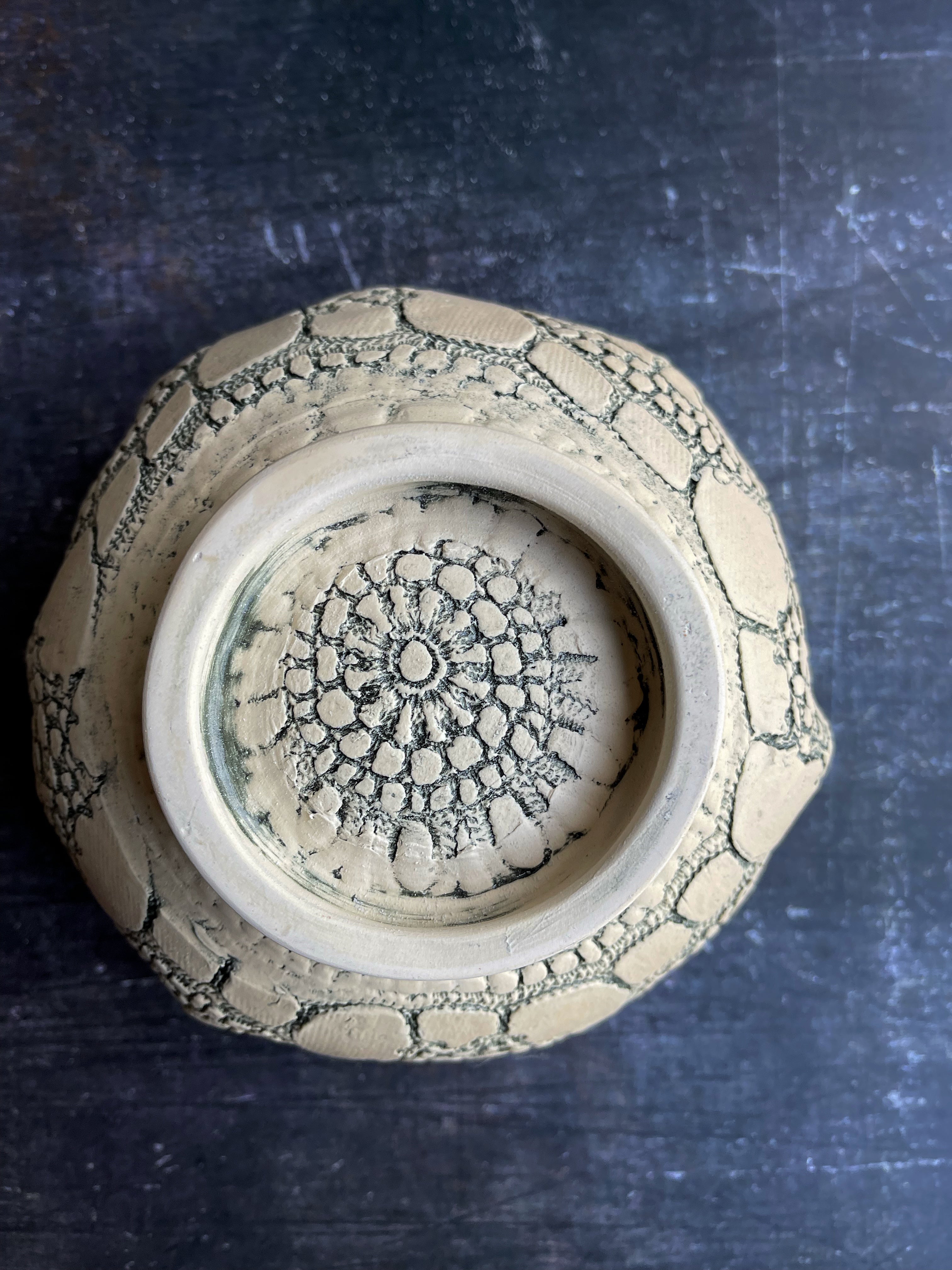 My rustic ceramic bowl collection marries sculpture with functional serving, and gives your table something as organic and nourishing as the food you serve. The outer texture is made by pressing my Nana's old crochet lace tablecloth into the wet clay. The texture is accented by an iron oxide, permanently fired into the piece.