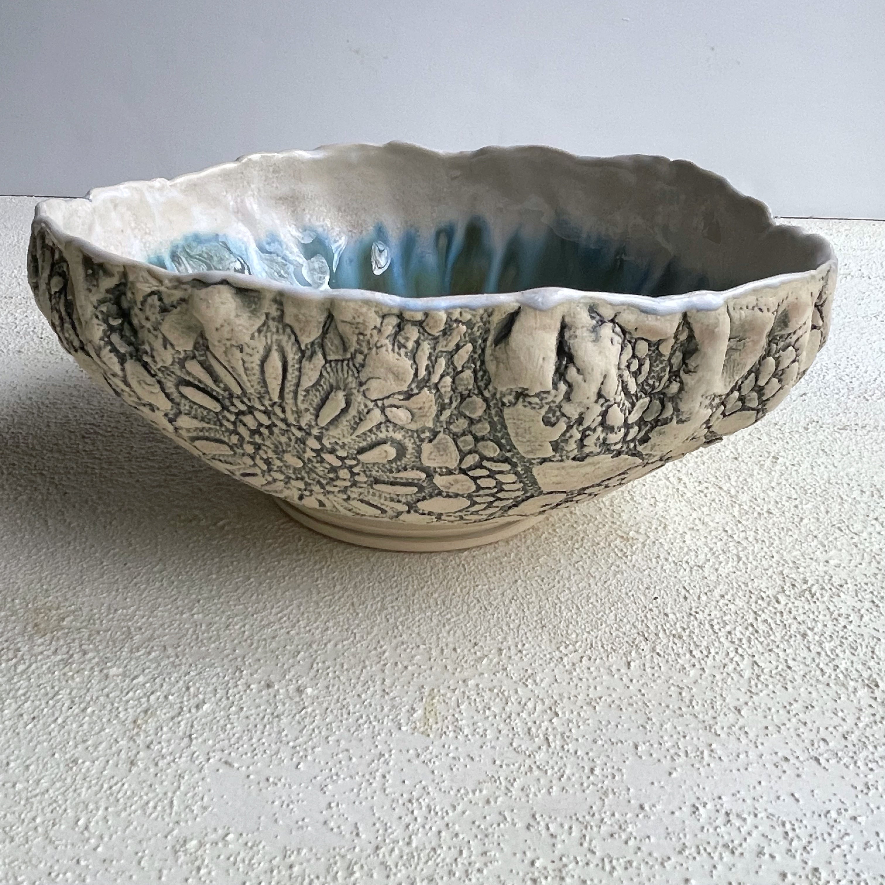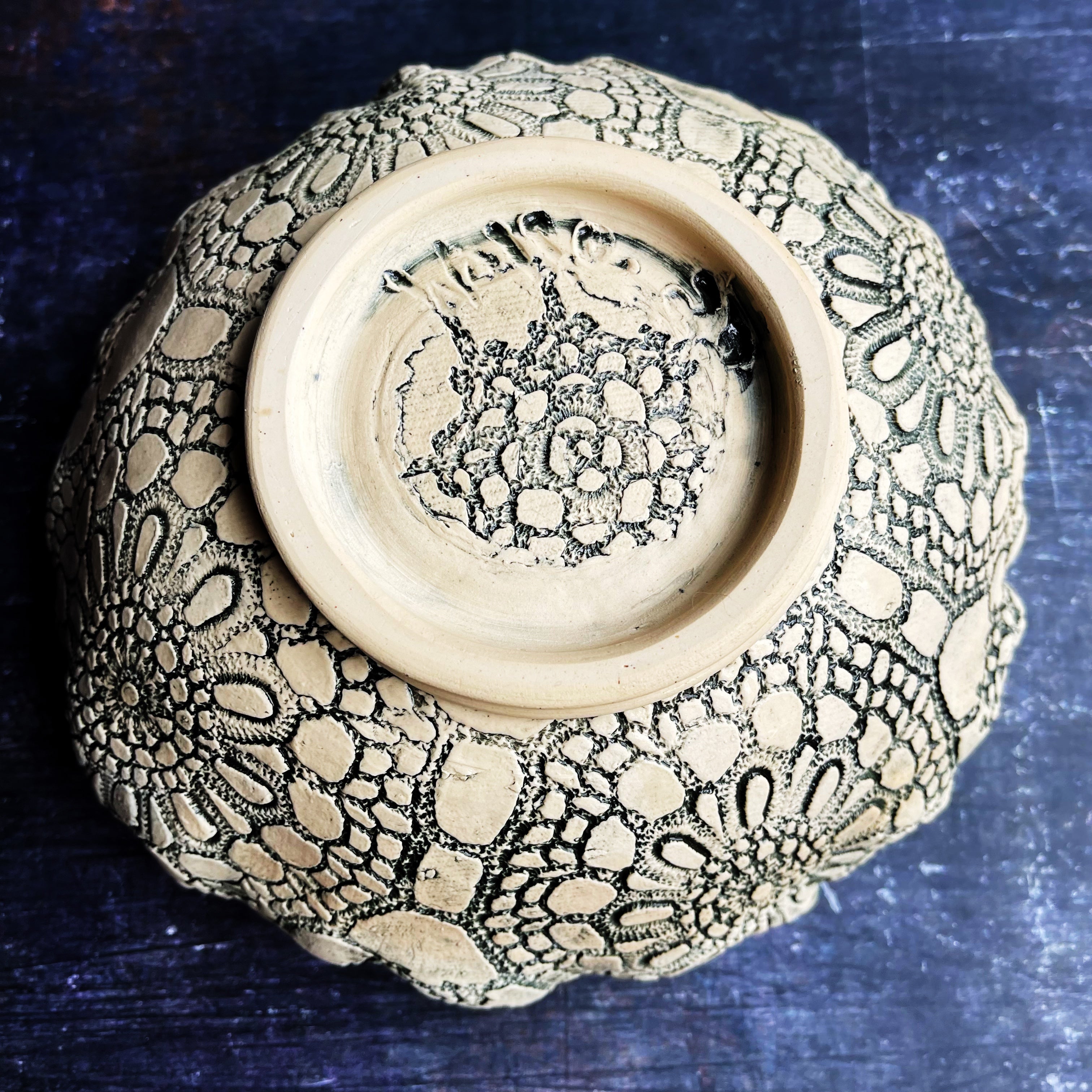 My rustic ceramic bowl collection marries sculpture with functional serving, and gives your table something as organic and nourishing as the food you serve. The outer texture is made by pressing my Nana's old crochet lace tablecloth into the wet clay. The texture is accented by an iron oxide, permanently fired into the piece.