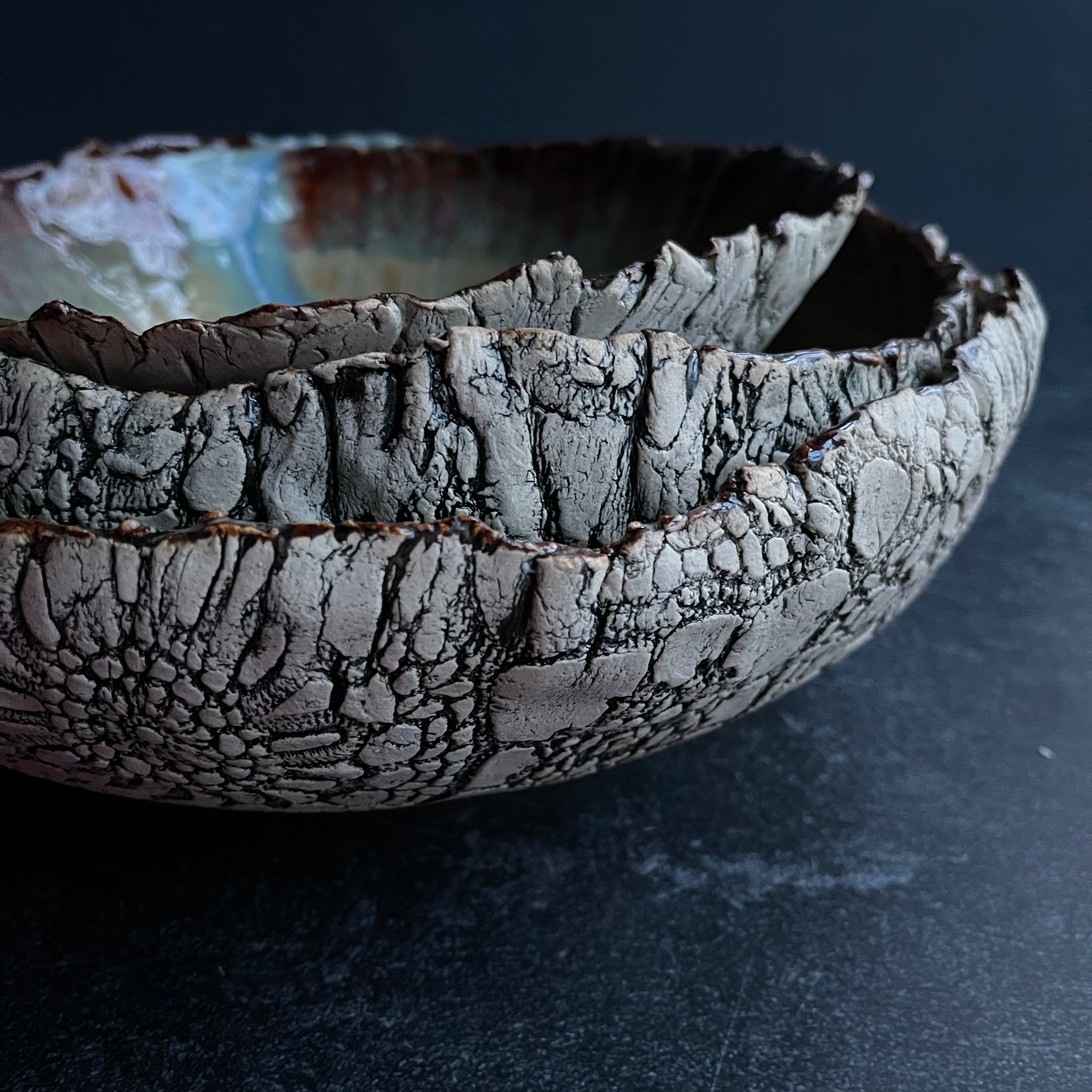 My rustic ceramic bowl collection marries sculpture with functional serving, and gives your table something as organic and nourishing as the food you serve. The outer texture is made by pressing my Nana's old crochet lace tablecloth into the wet clay. The texture is accented by an iron oxide, permanently fired into the piece.