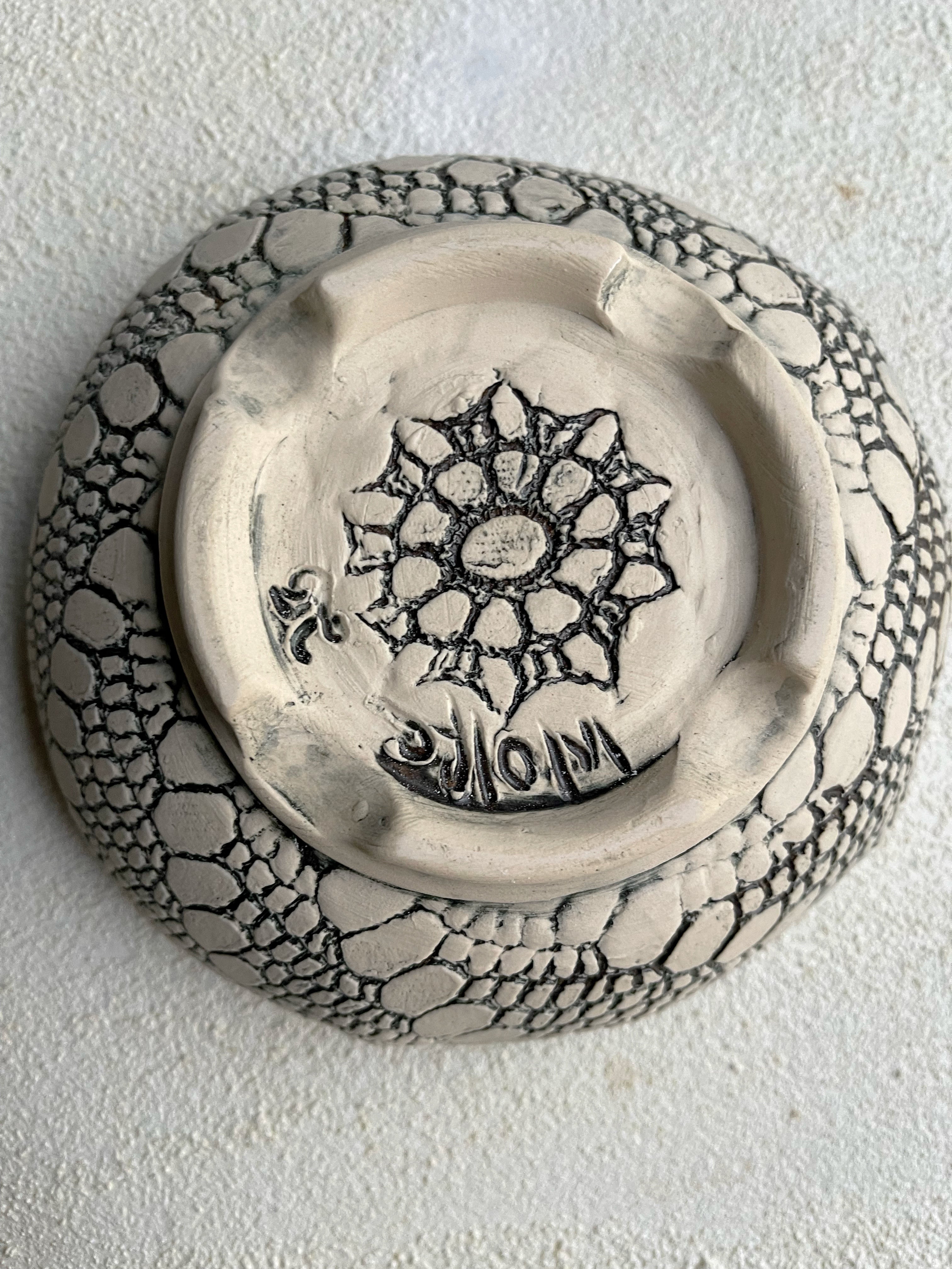 This hand built stoneware bowl has a a textured raw clay exterior and colorful flowy glazes inside.