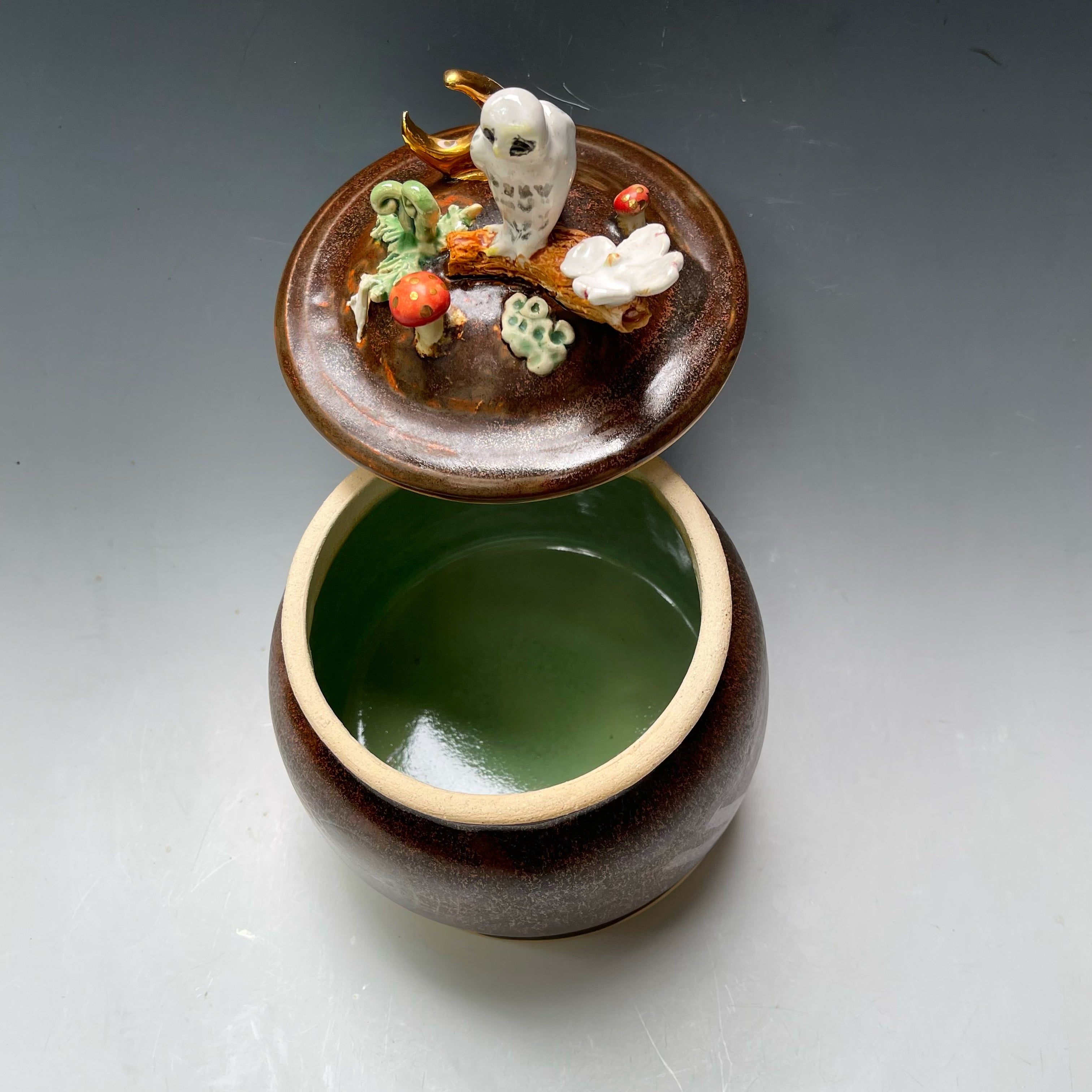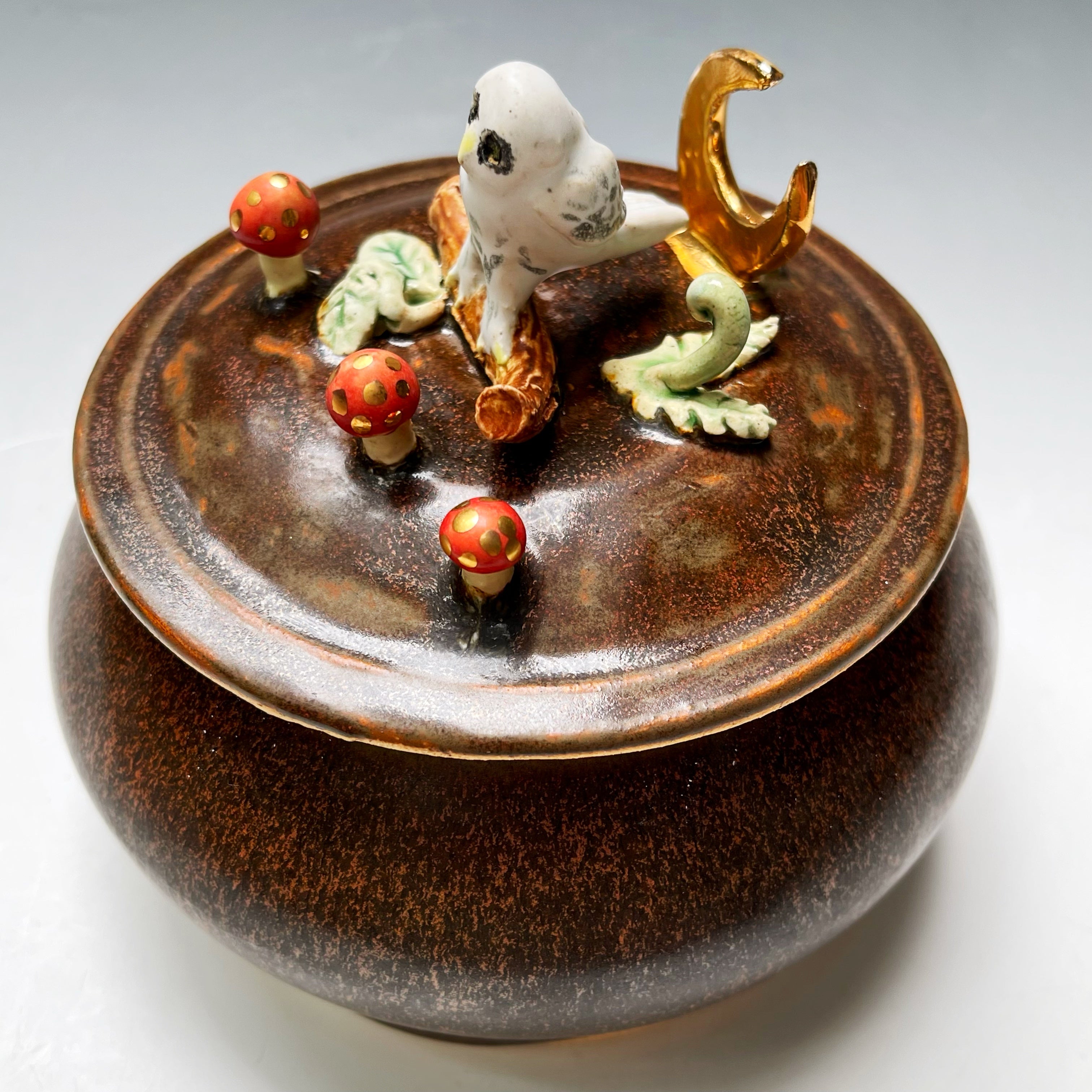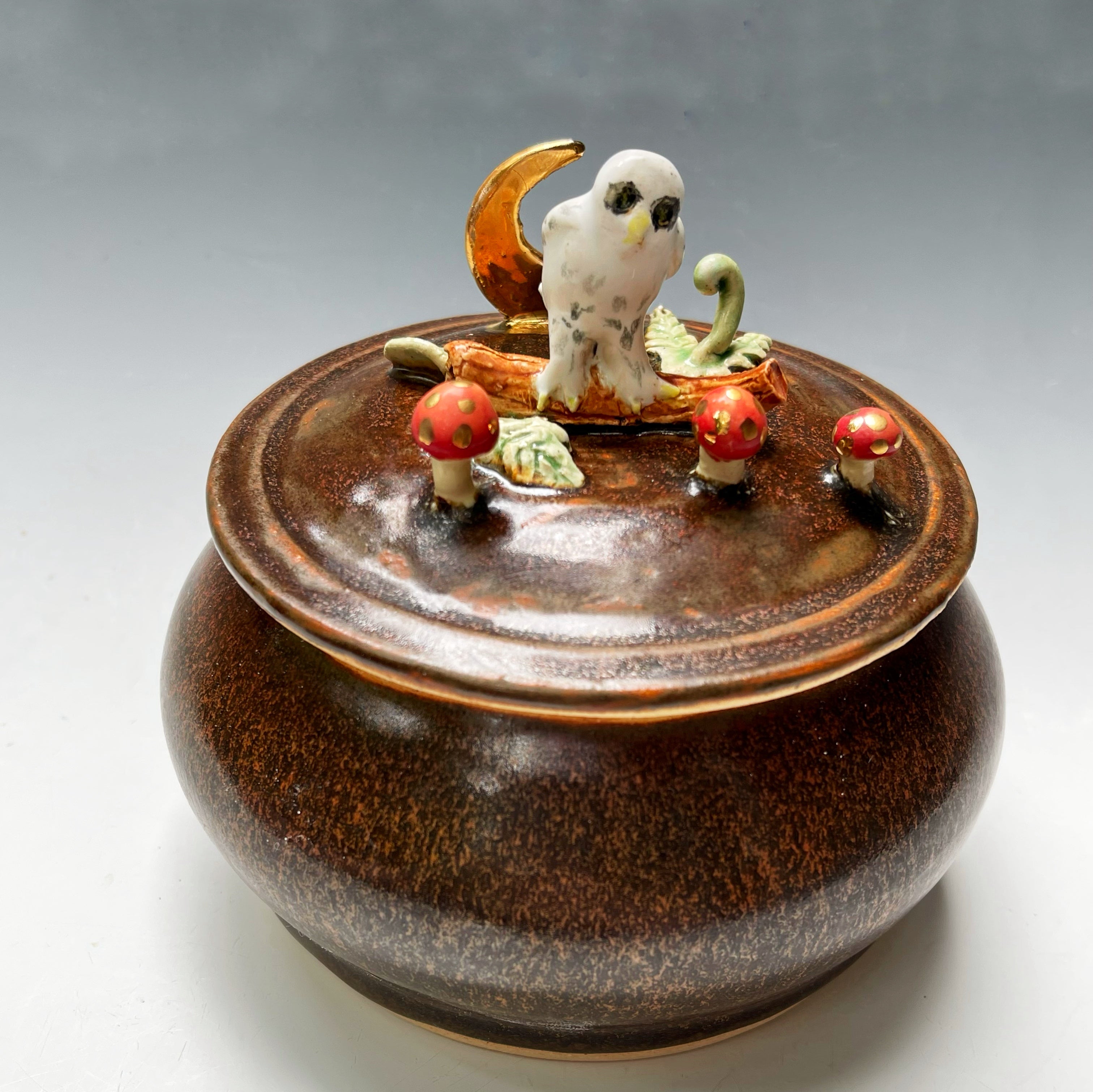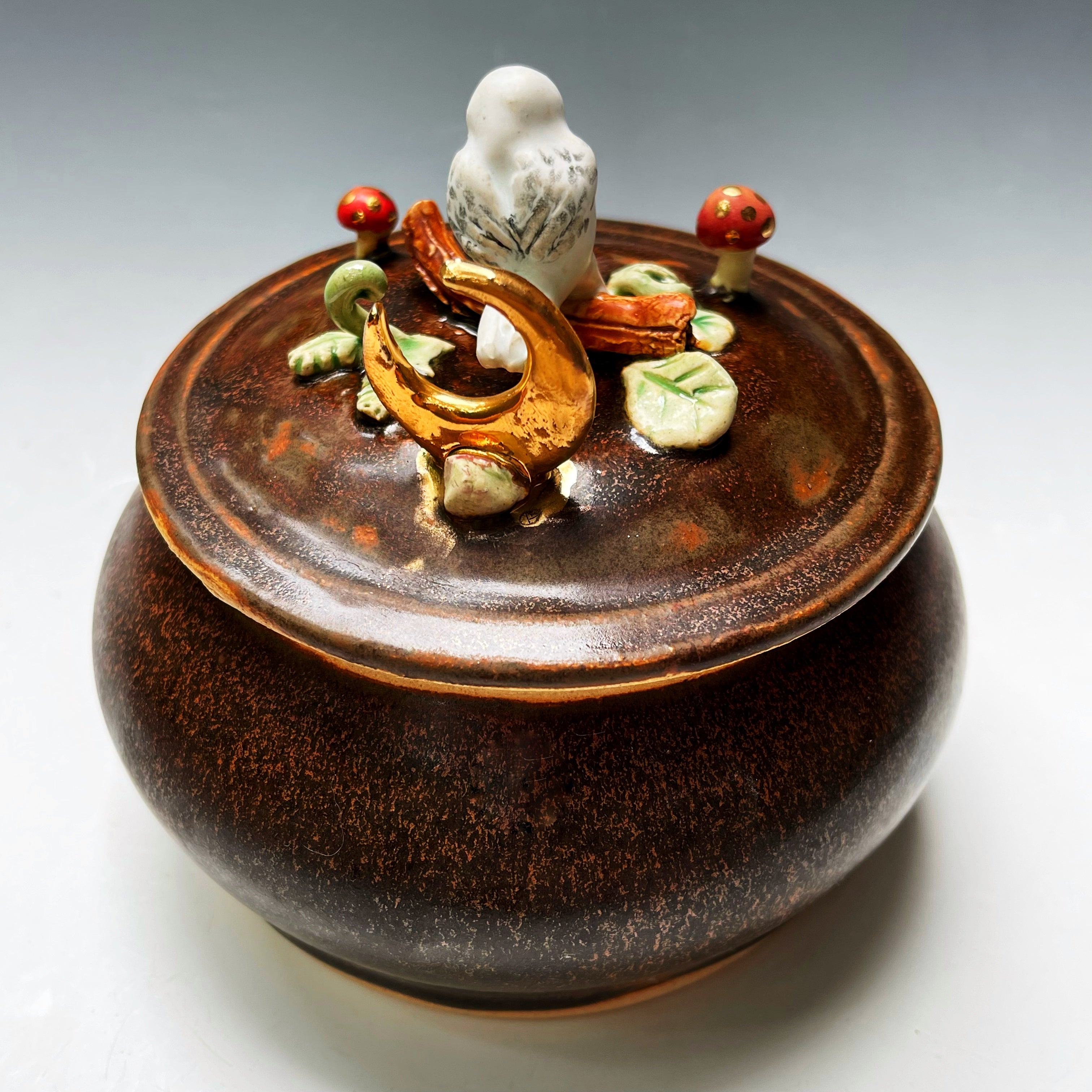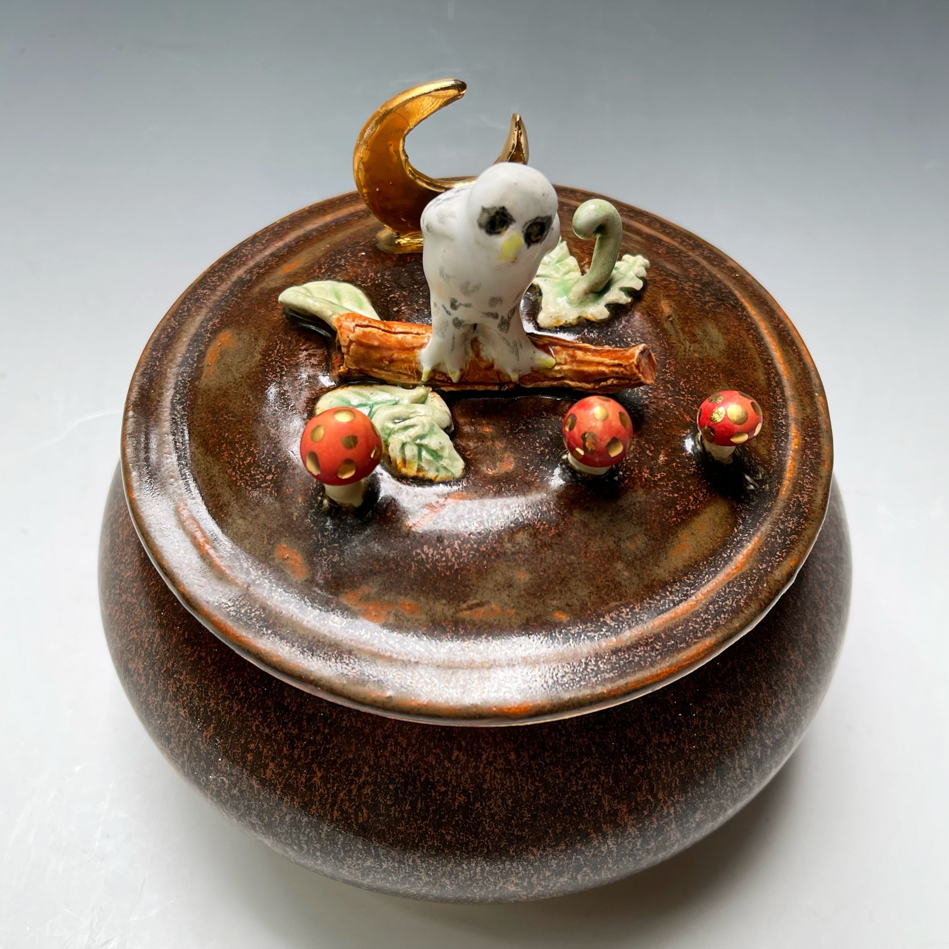 This jar was thrown, then hand sculpted with an Enchanted Forest motif. The moon is glazed with 22K gold.
