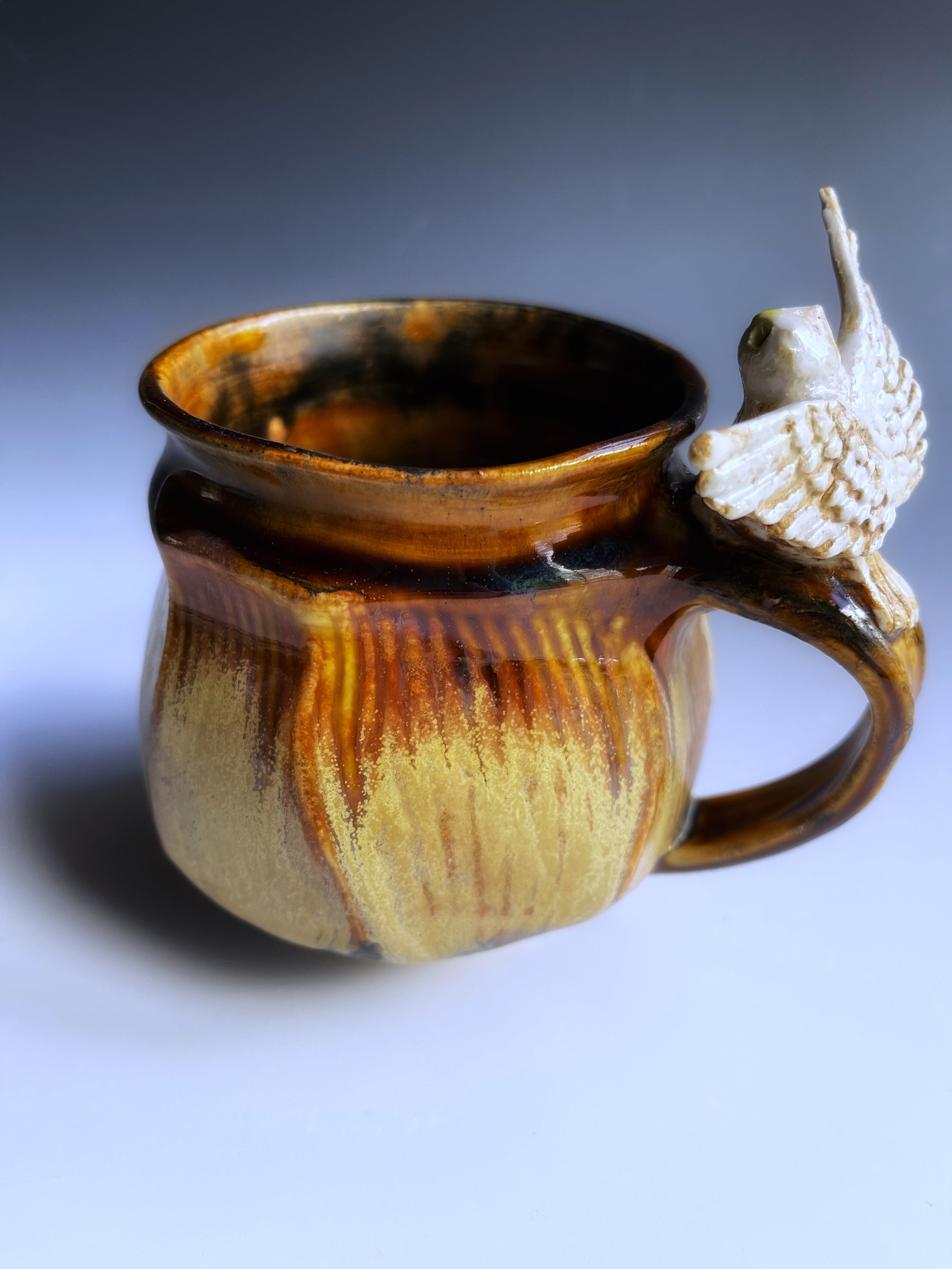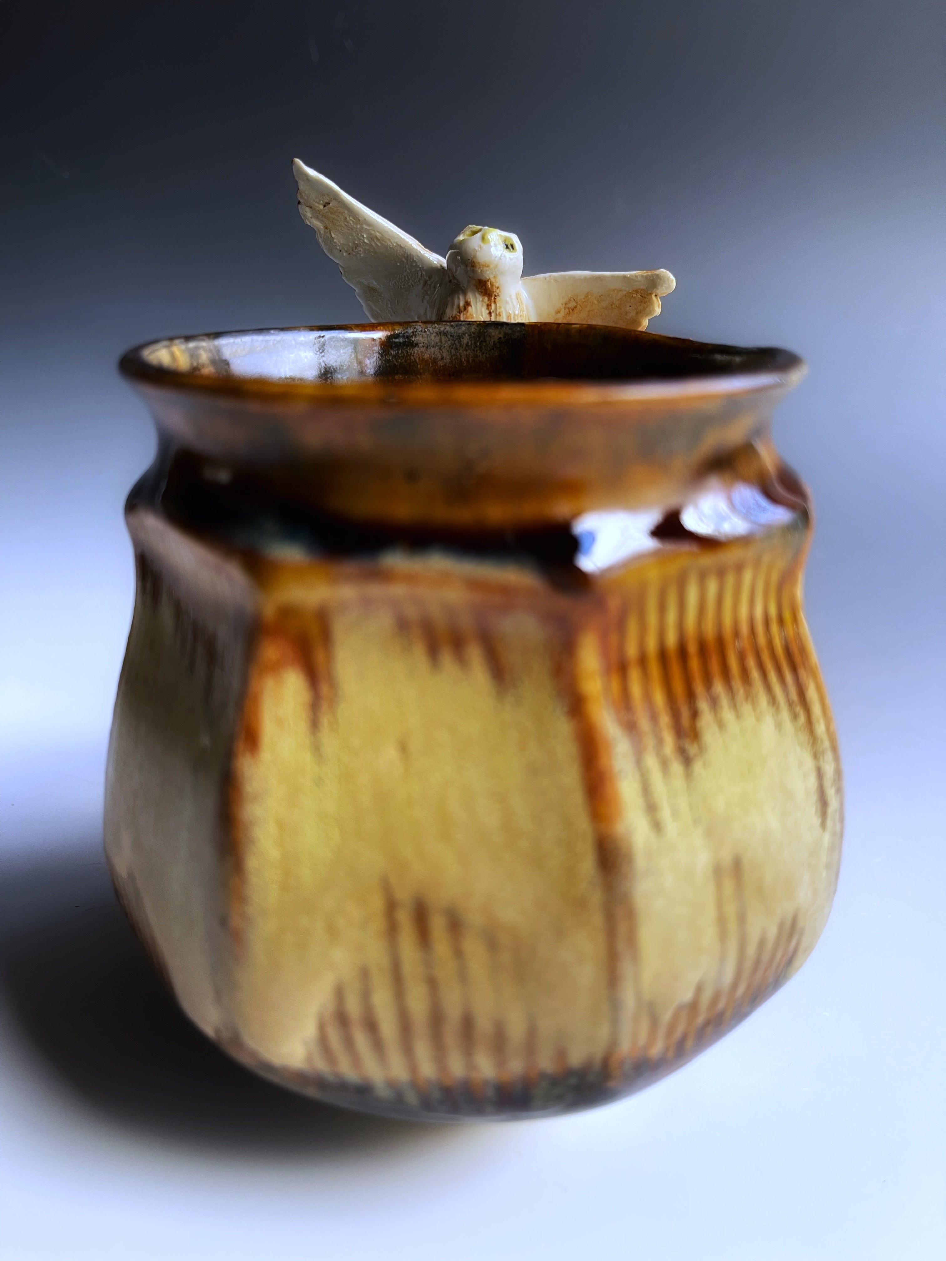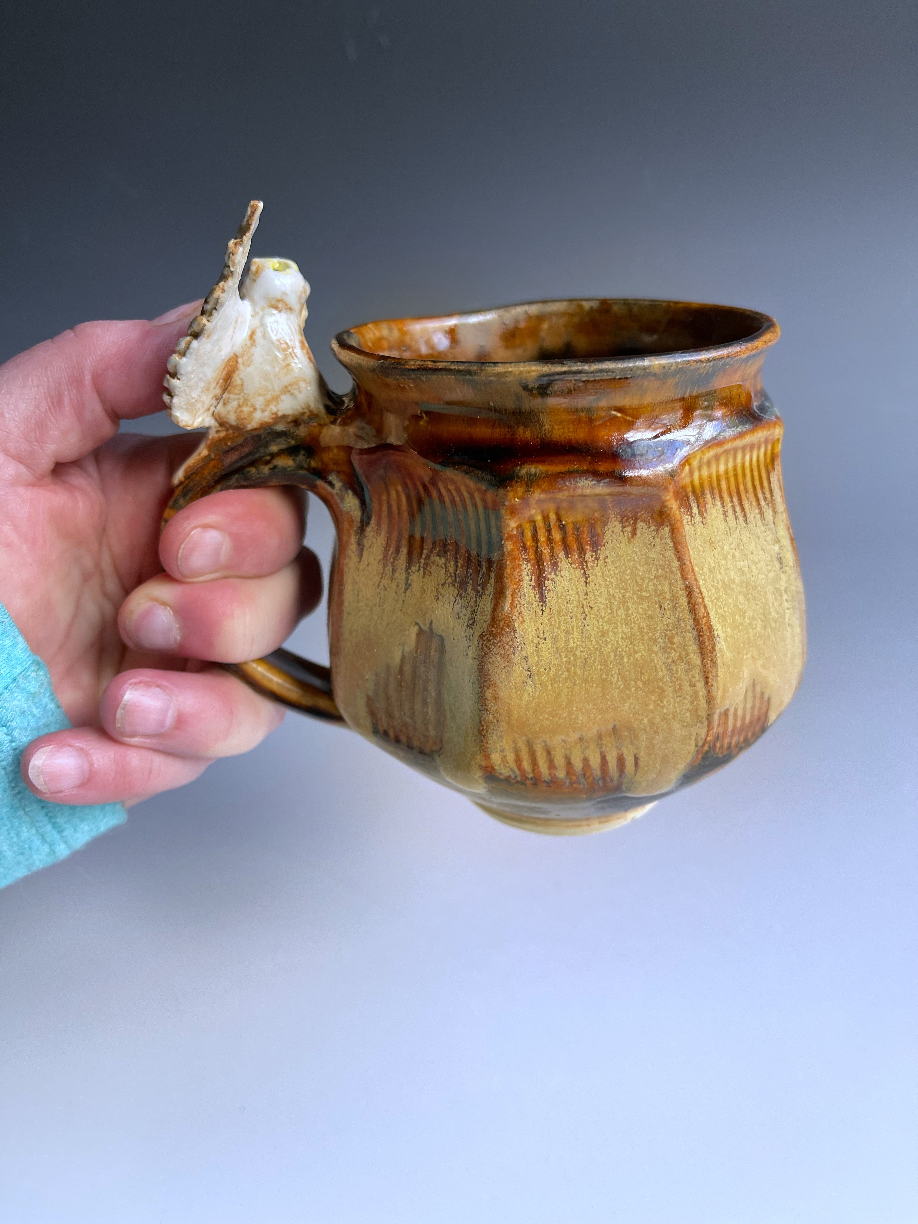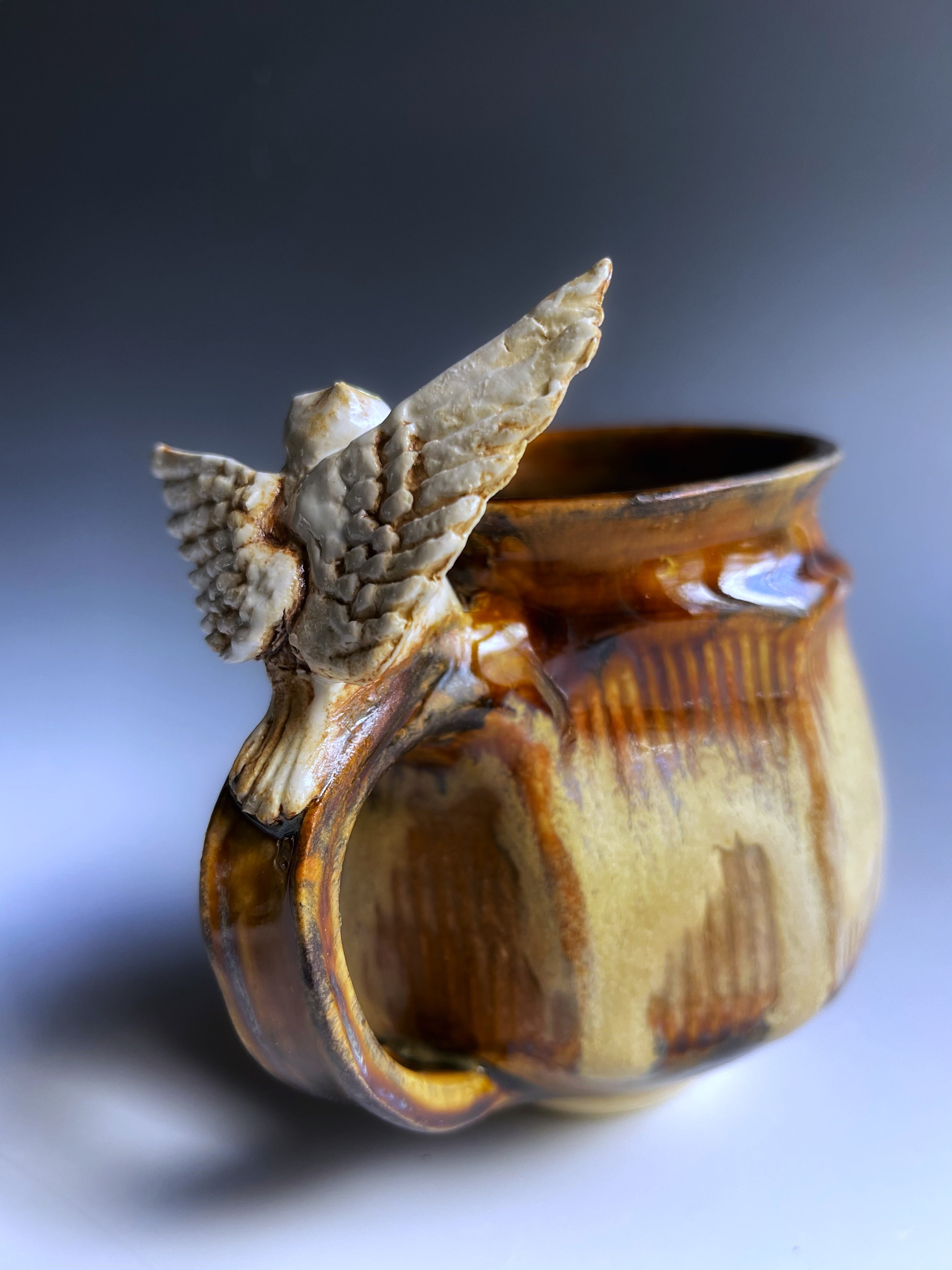 A hand sculpted owl sits on the handle of a thrown and facetted mg. Charming and very well balanced.