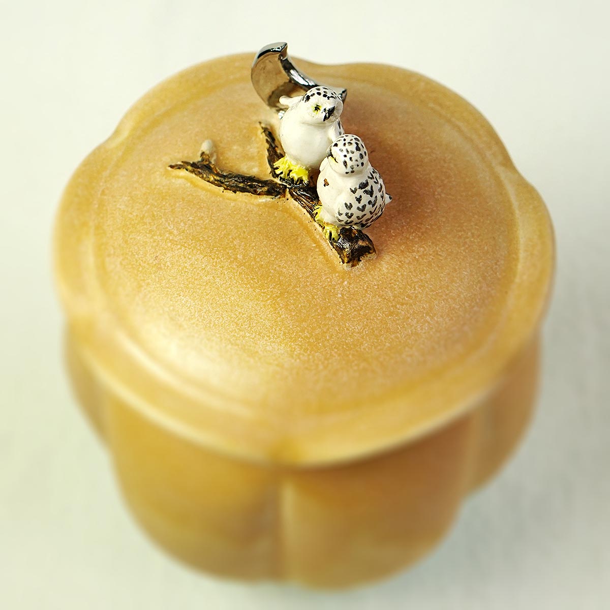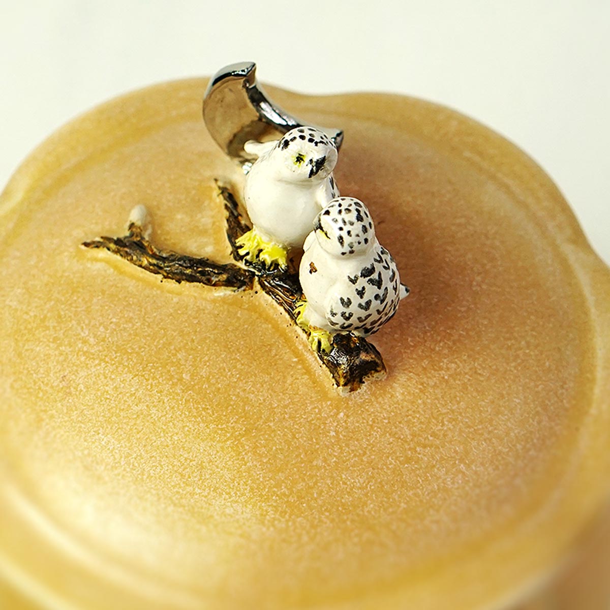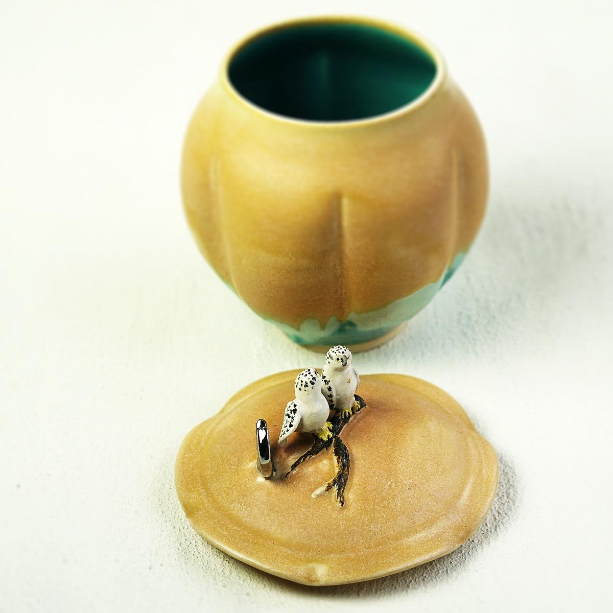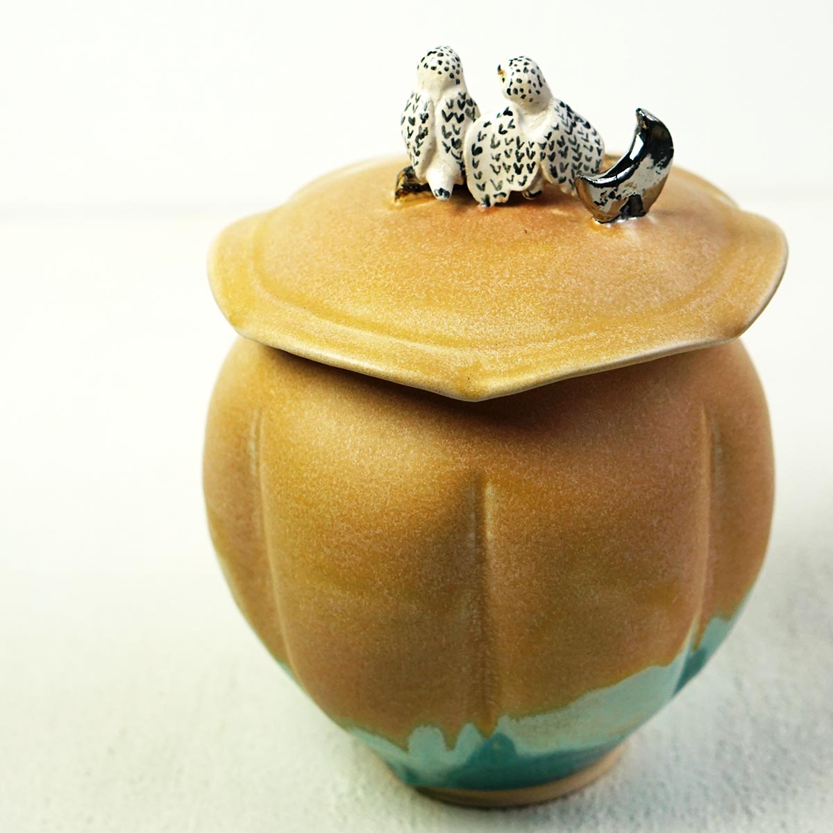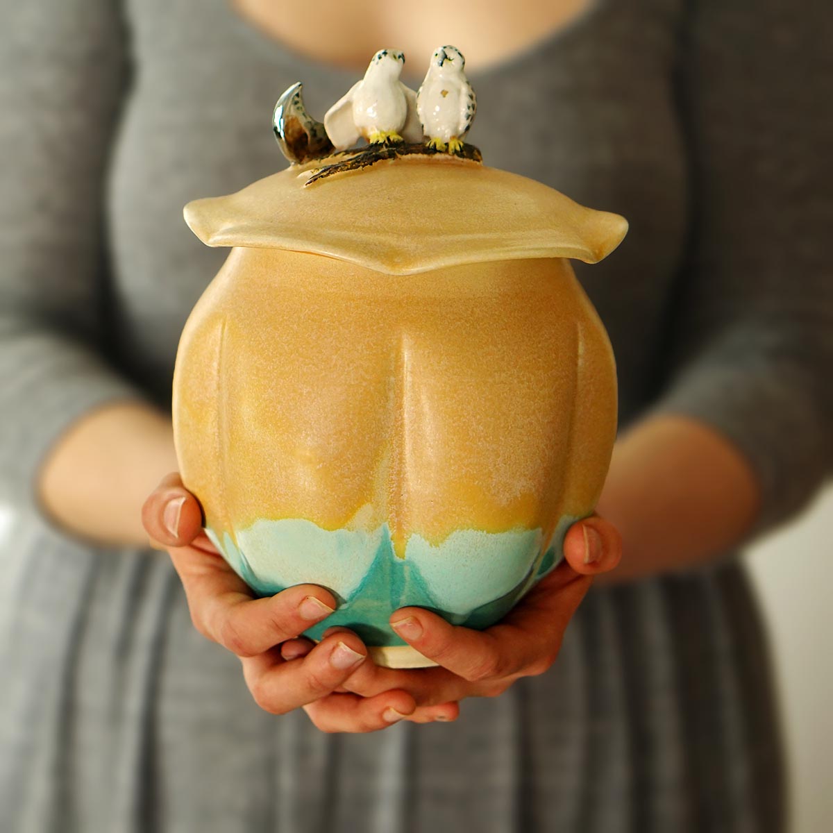 This jar was thrown, altered into a a gourd shape, with hand sculpted owls and a crescent moon. The moon is glazed with 22K white gold. If your Divine Feminine Self conjured your perfect mate it would look like this! Use this sculptured totem jar to store crystals and special mementos. Write your wishes on parchment and store it inside. Let the magic dance!