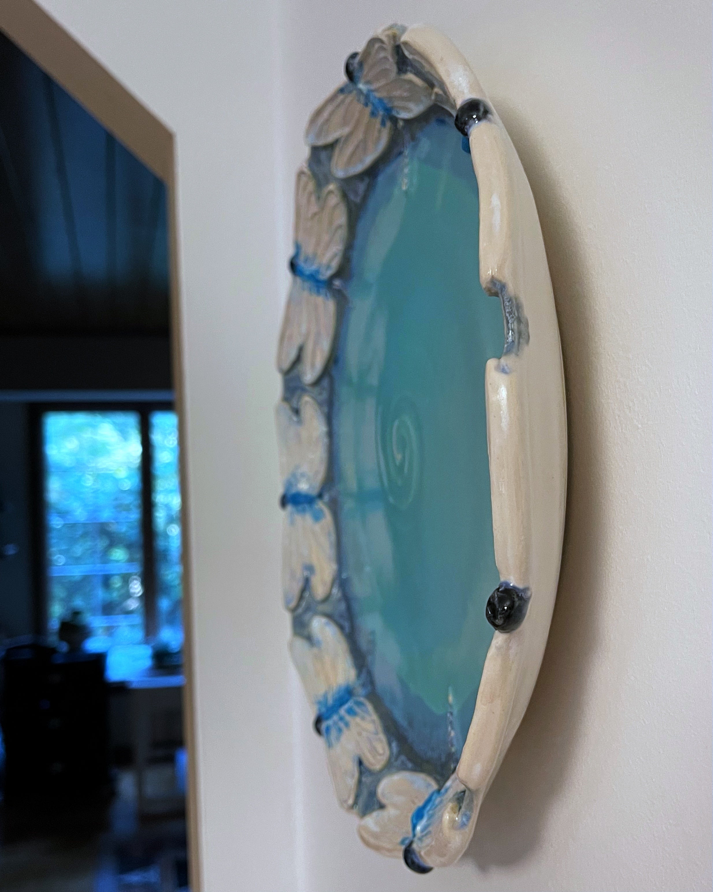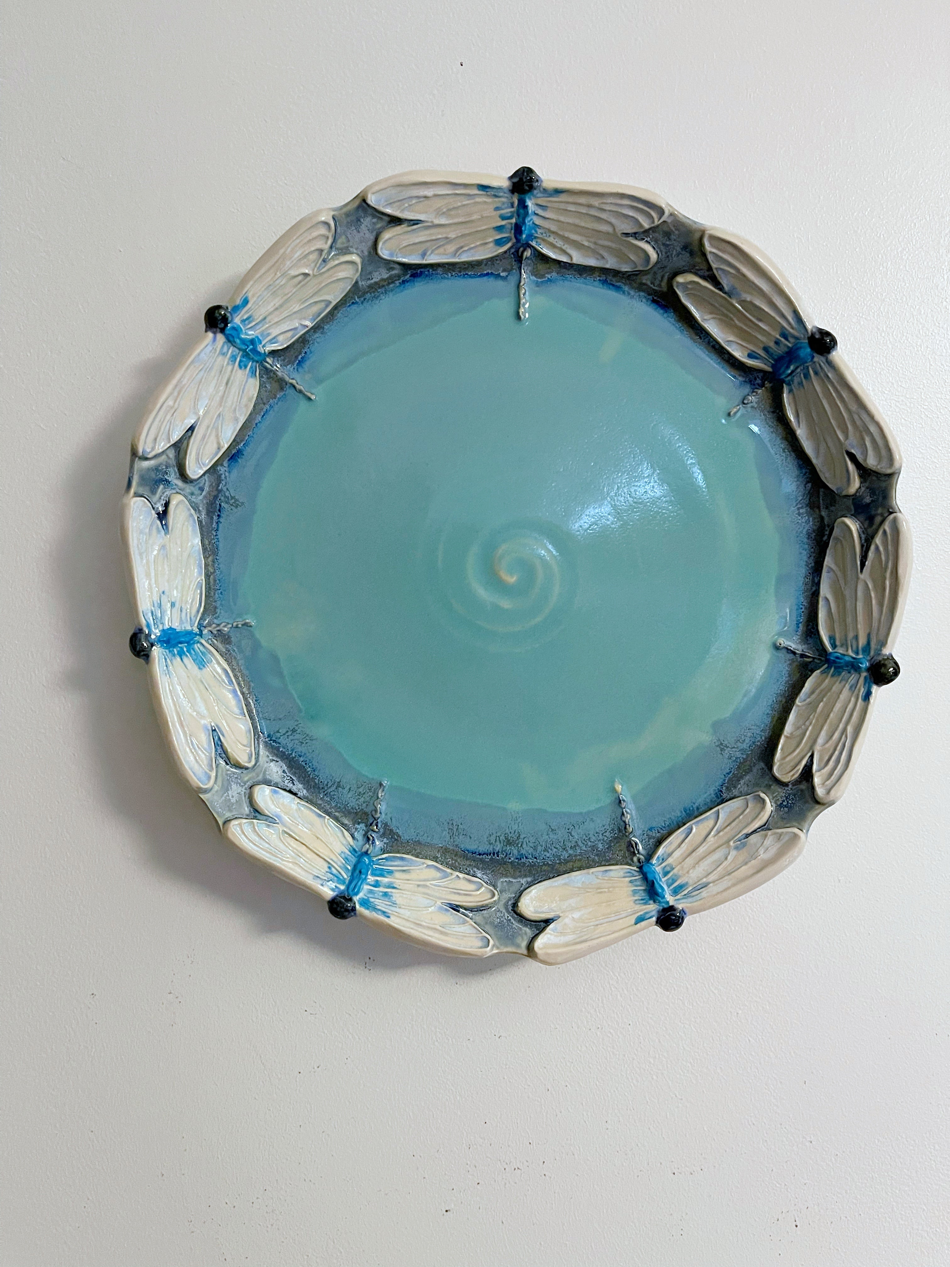 This functional stoneware serving platter is also a hanging piece of wall art! As there is no wire needed for hanging you can grab it off the wall and use it to serve as you chose. She was thrown then sculpted with a ring of dragonflies.