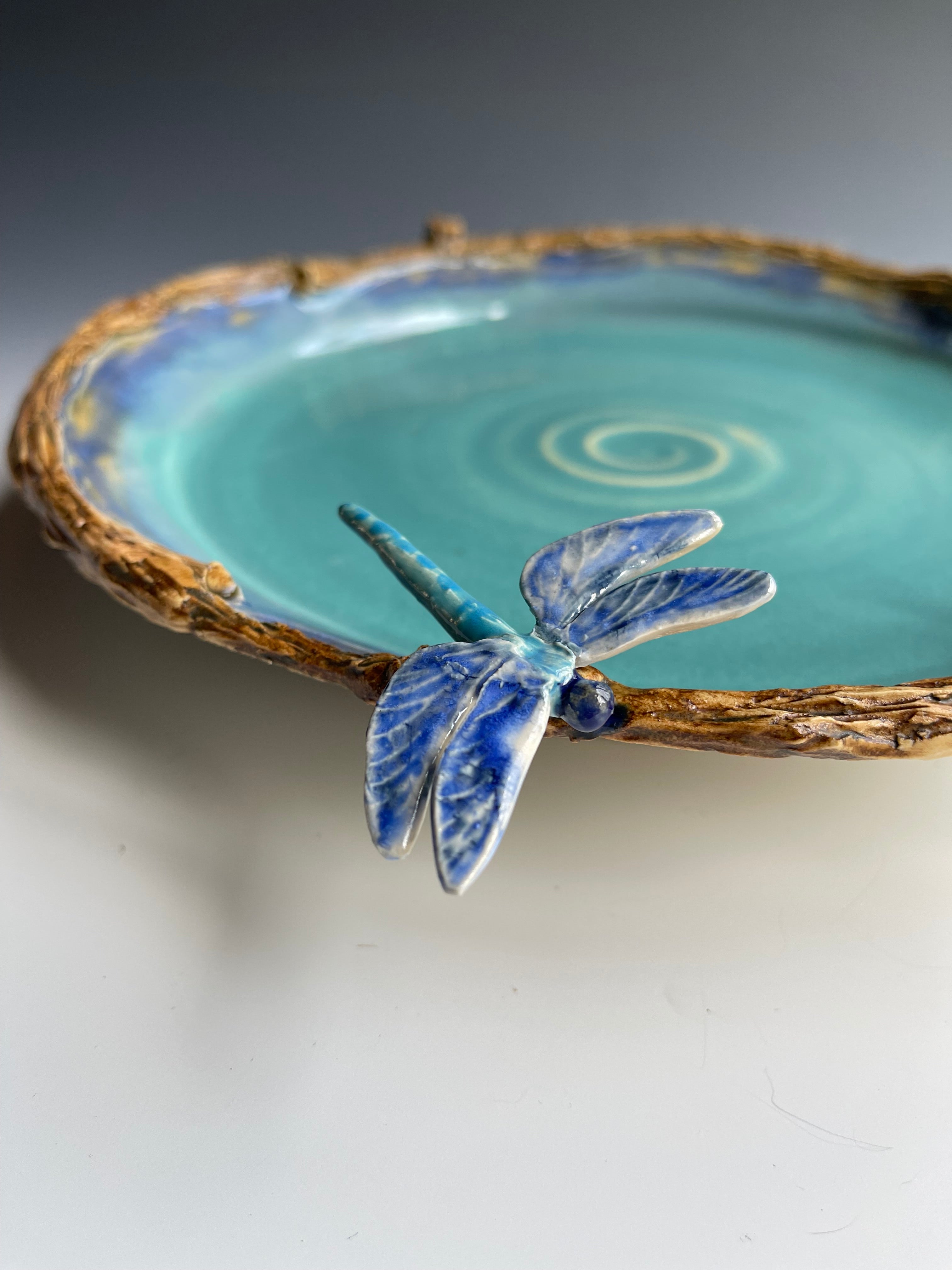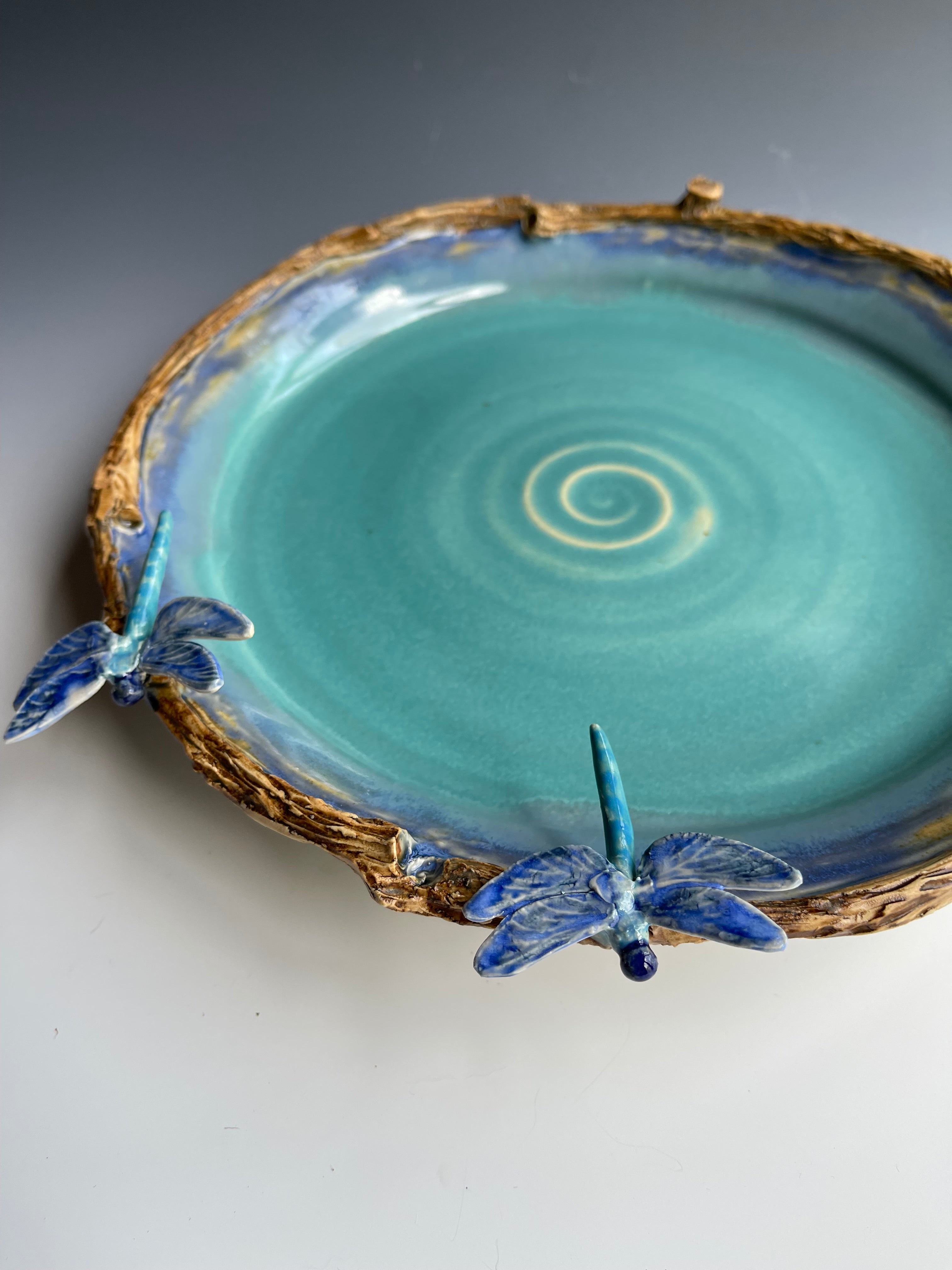 This functional stoneware serving platter is the beginning of a new series. It has 3 dragonflies on a tree branch rim.