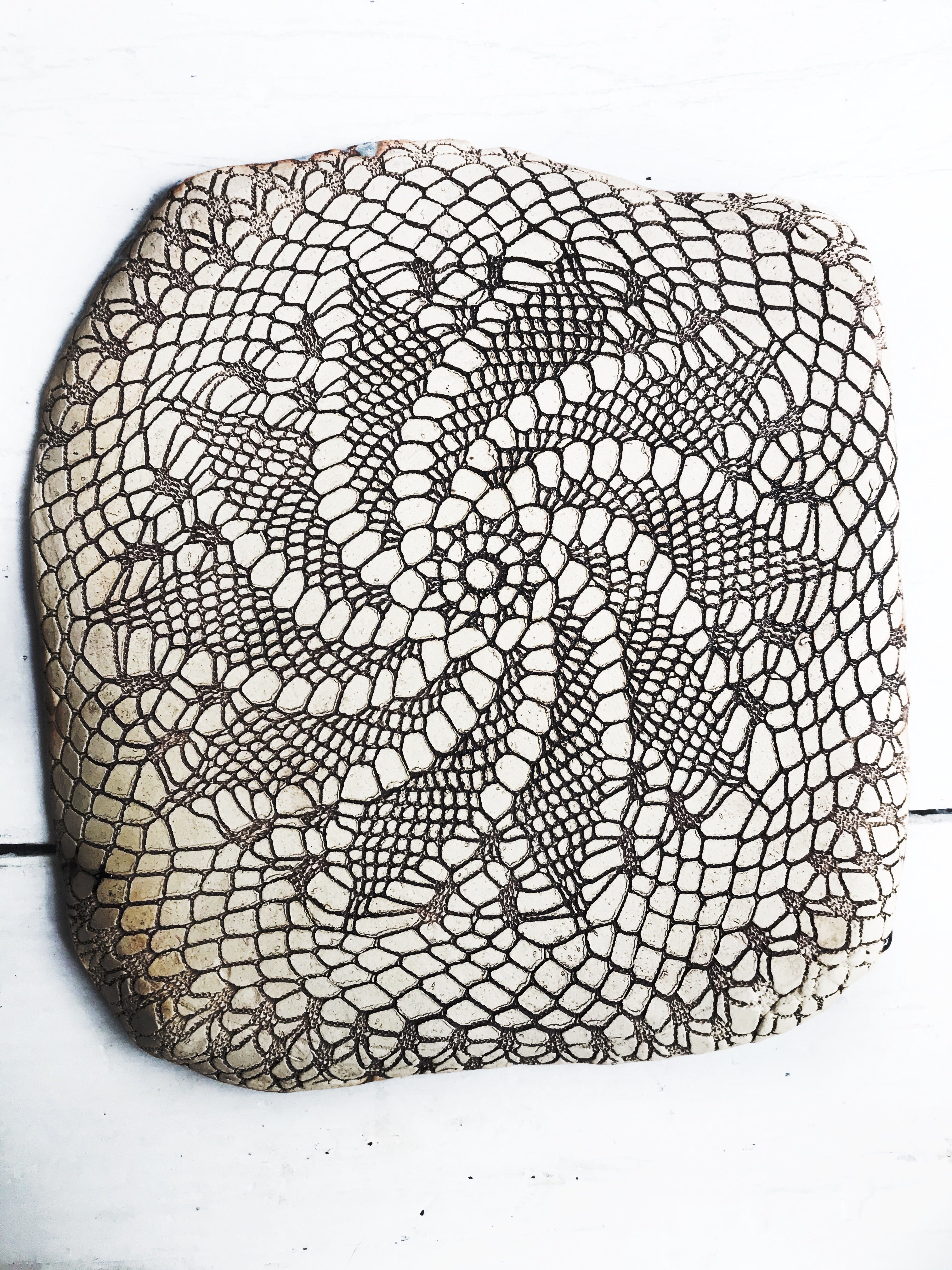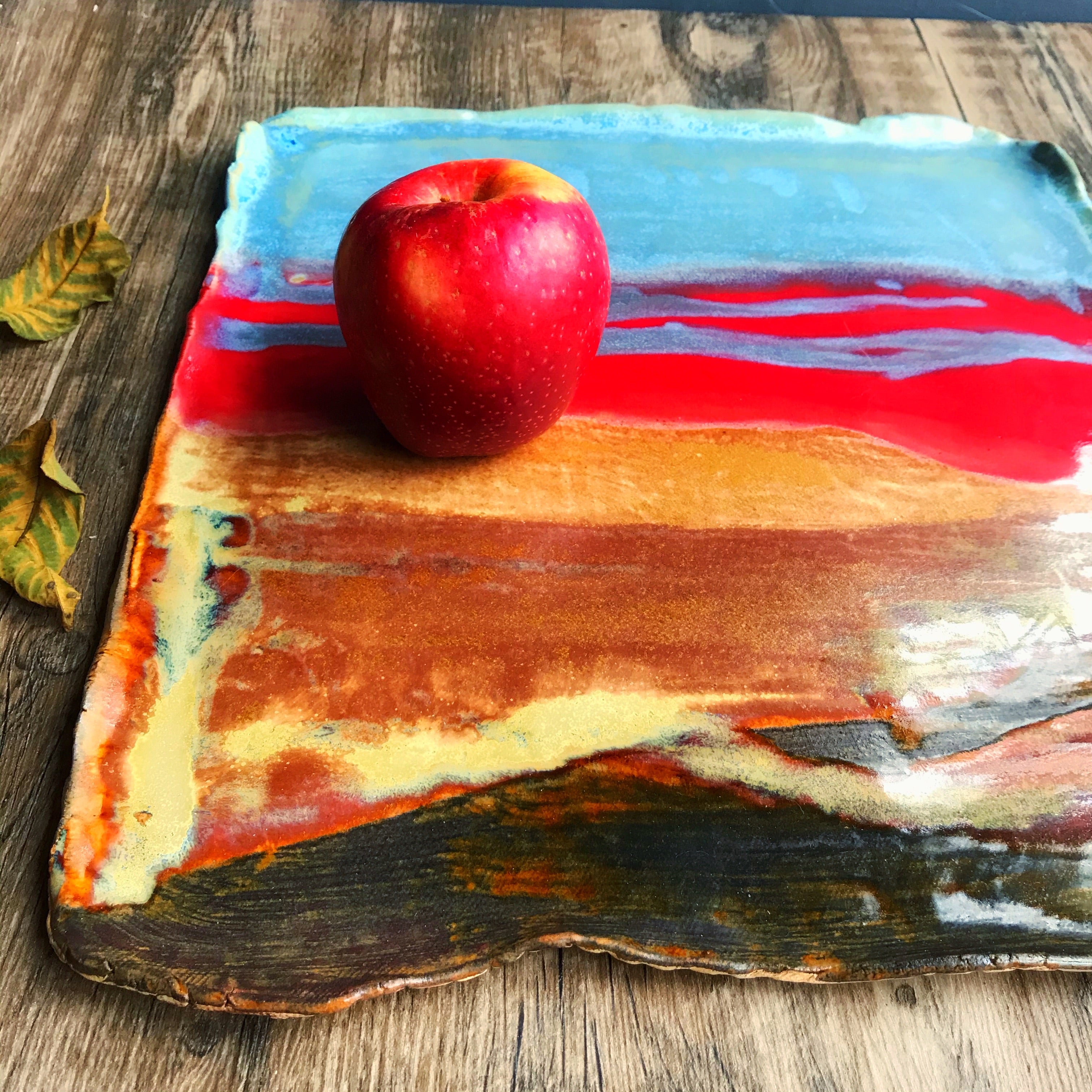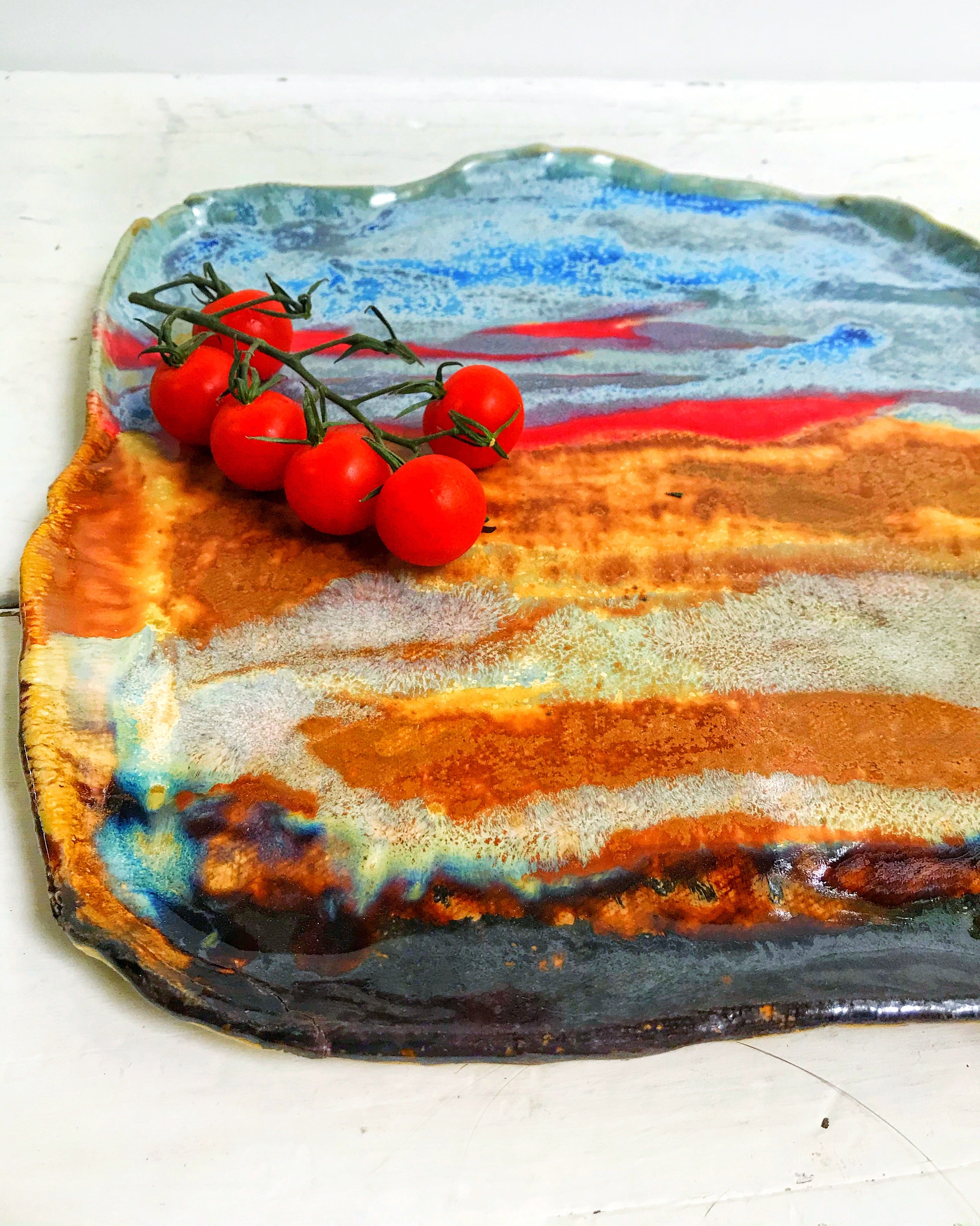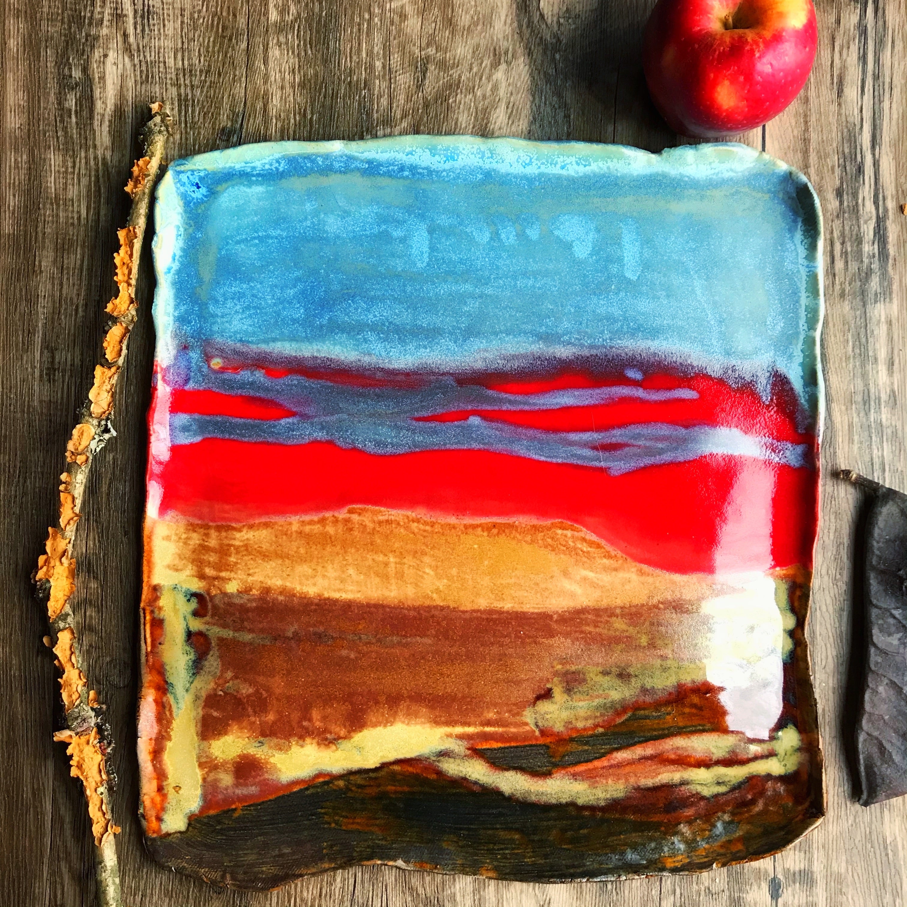 Hand built in stoneware clay. A landscape was made by hand pouring layers of glaze. The back has a hand embossed lace pattern. All glazes are permanent and food safe.