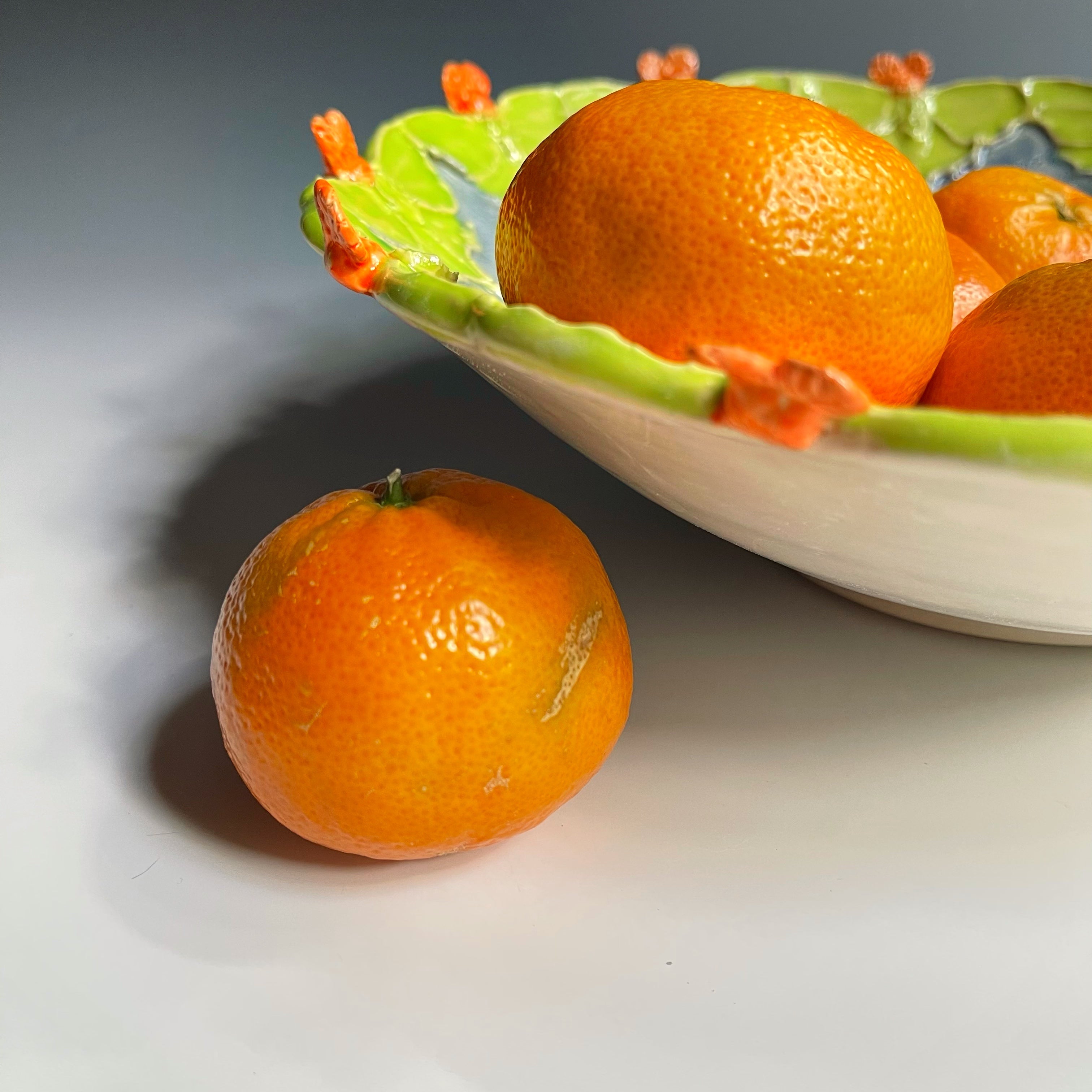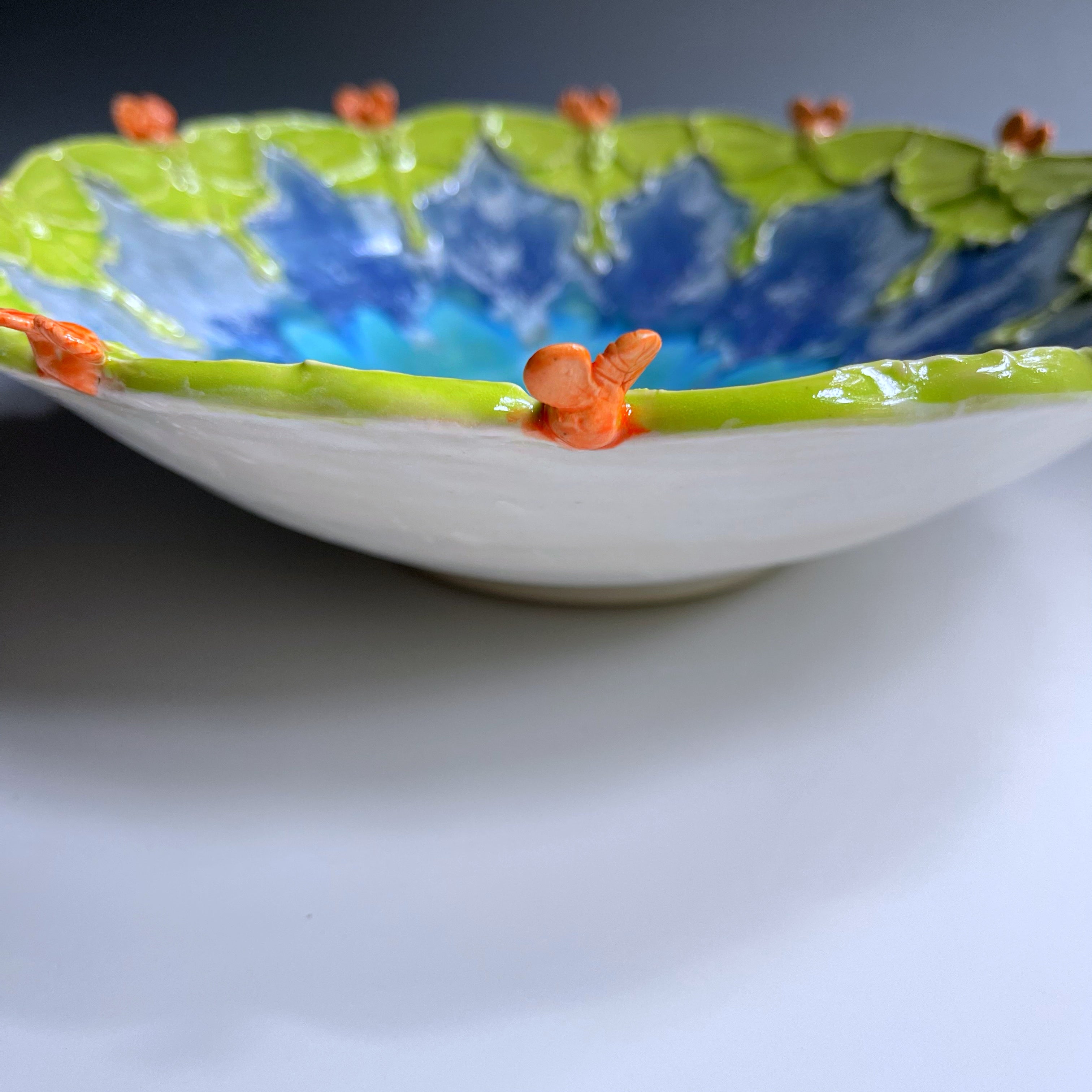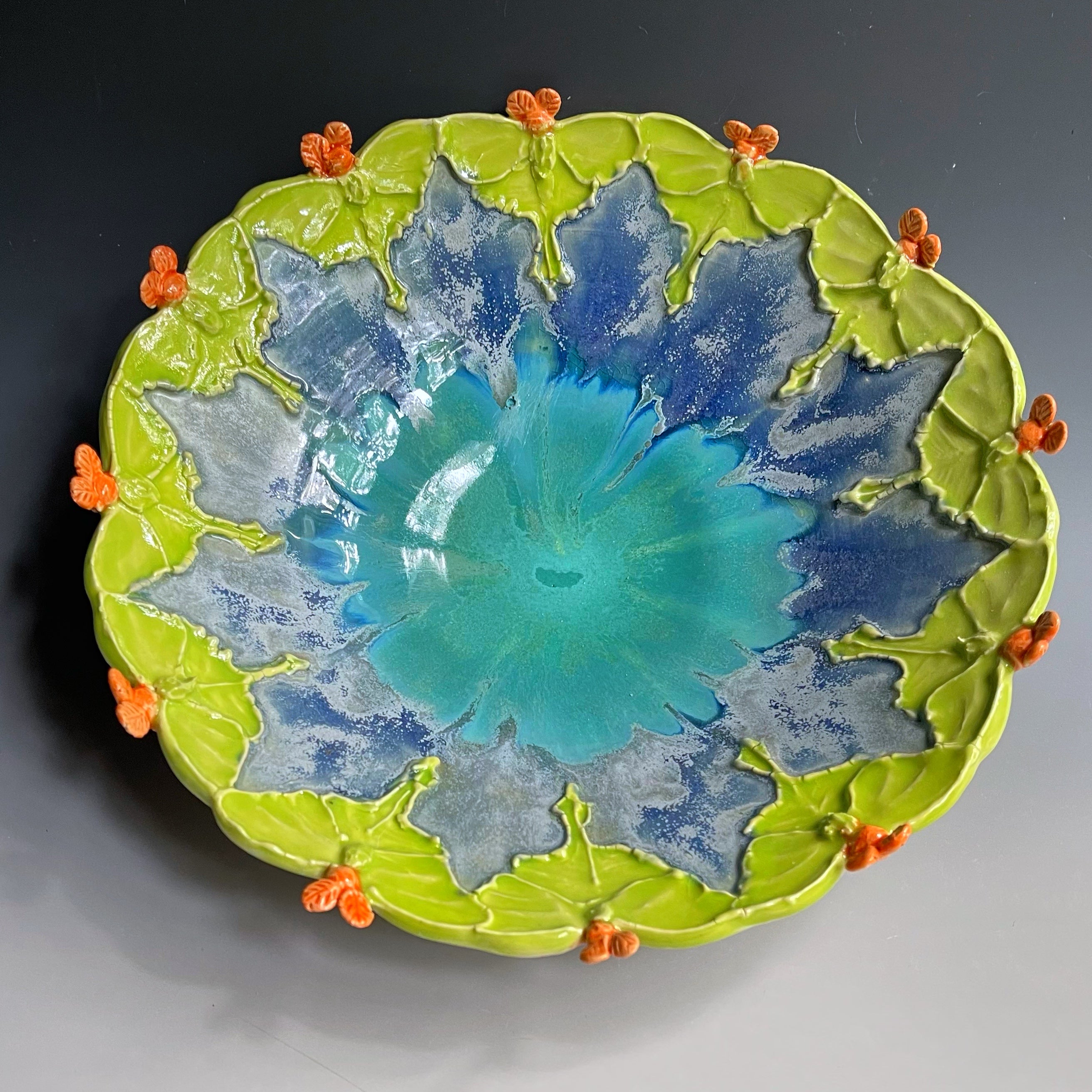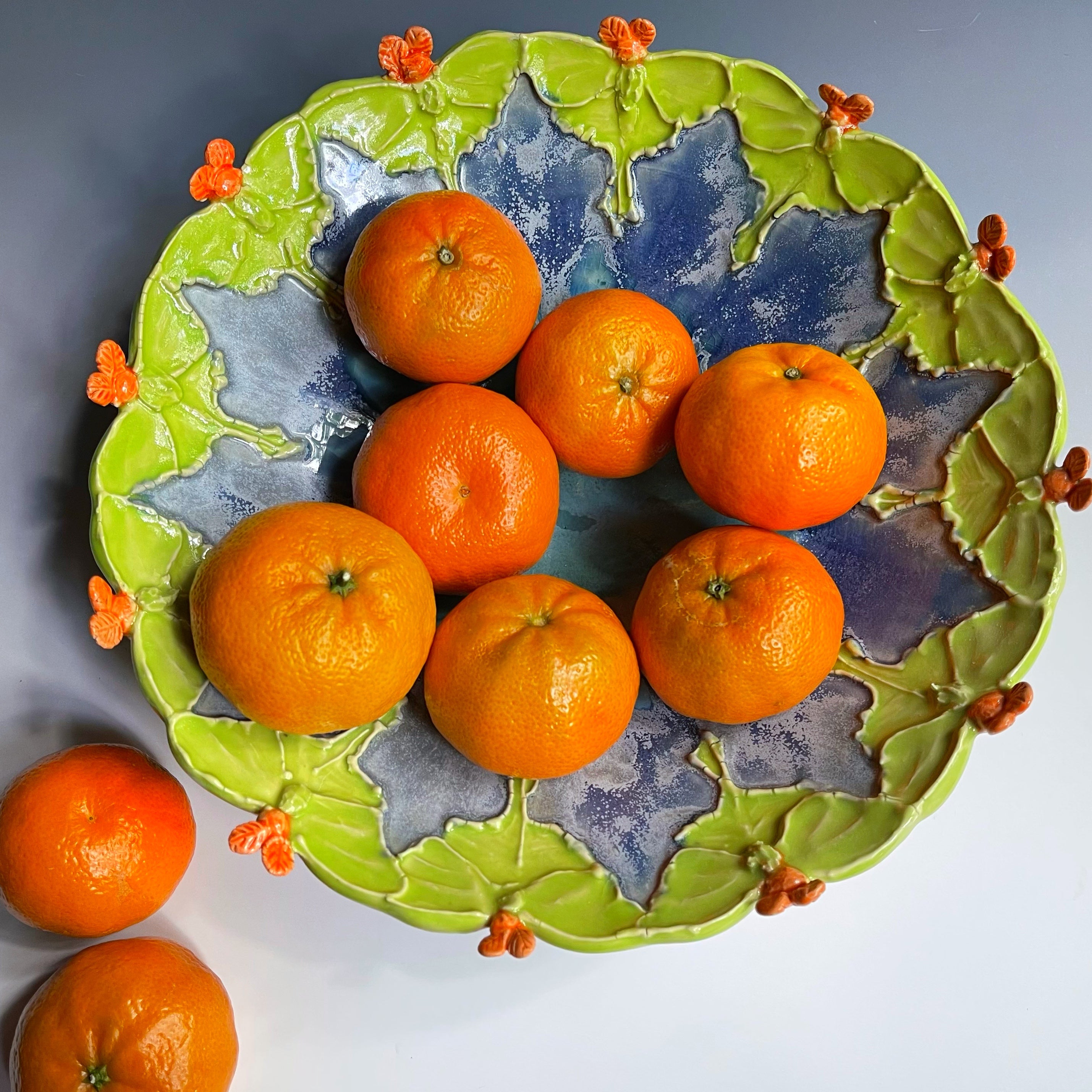 This functional stoneware serving platter was thrown then sculpted with a ring of luna moths. The Luna moth is believed to bring good luck.