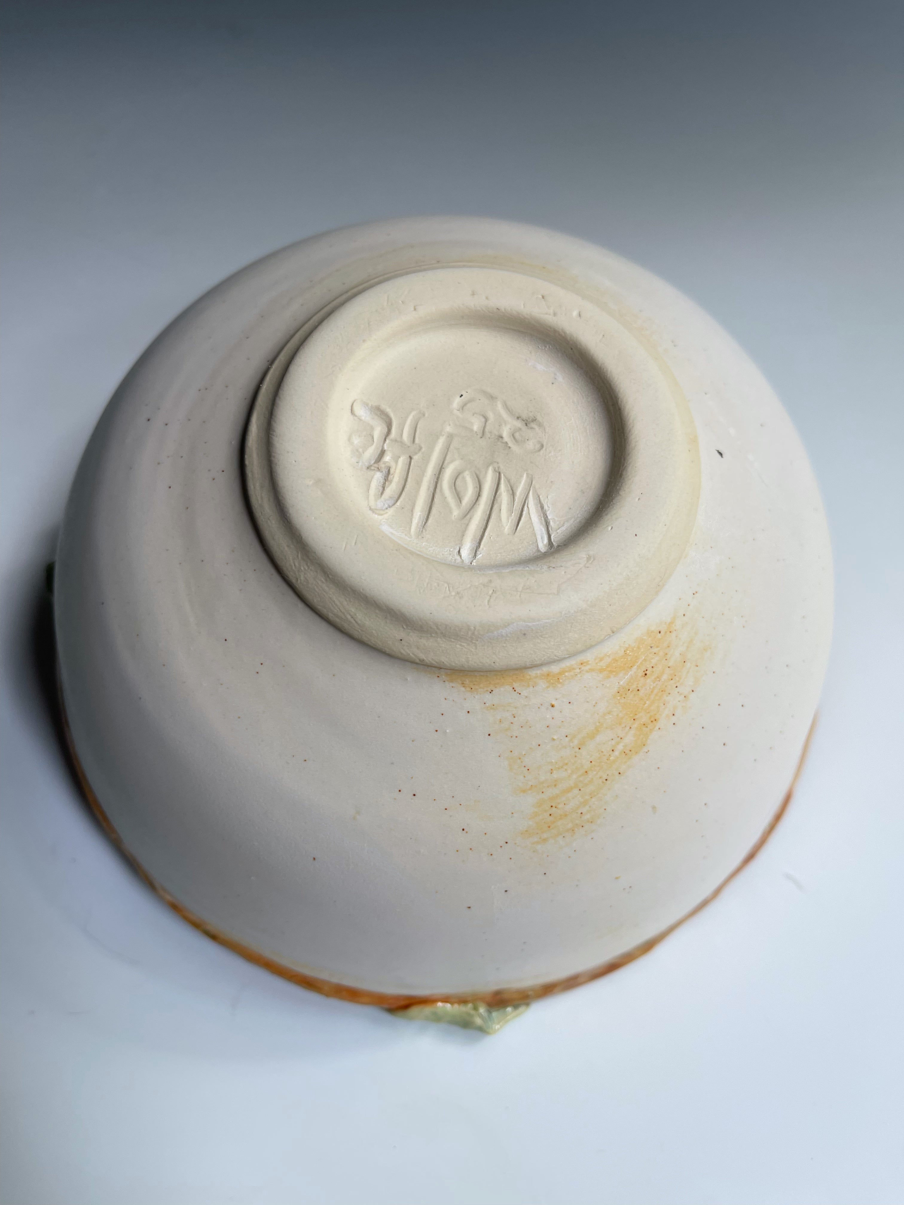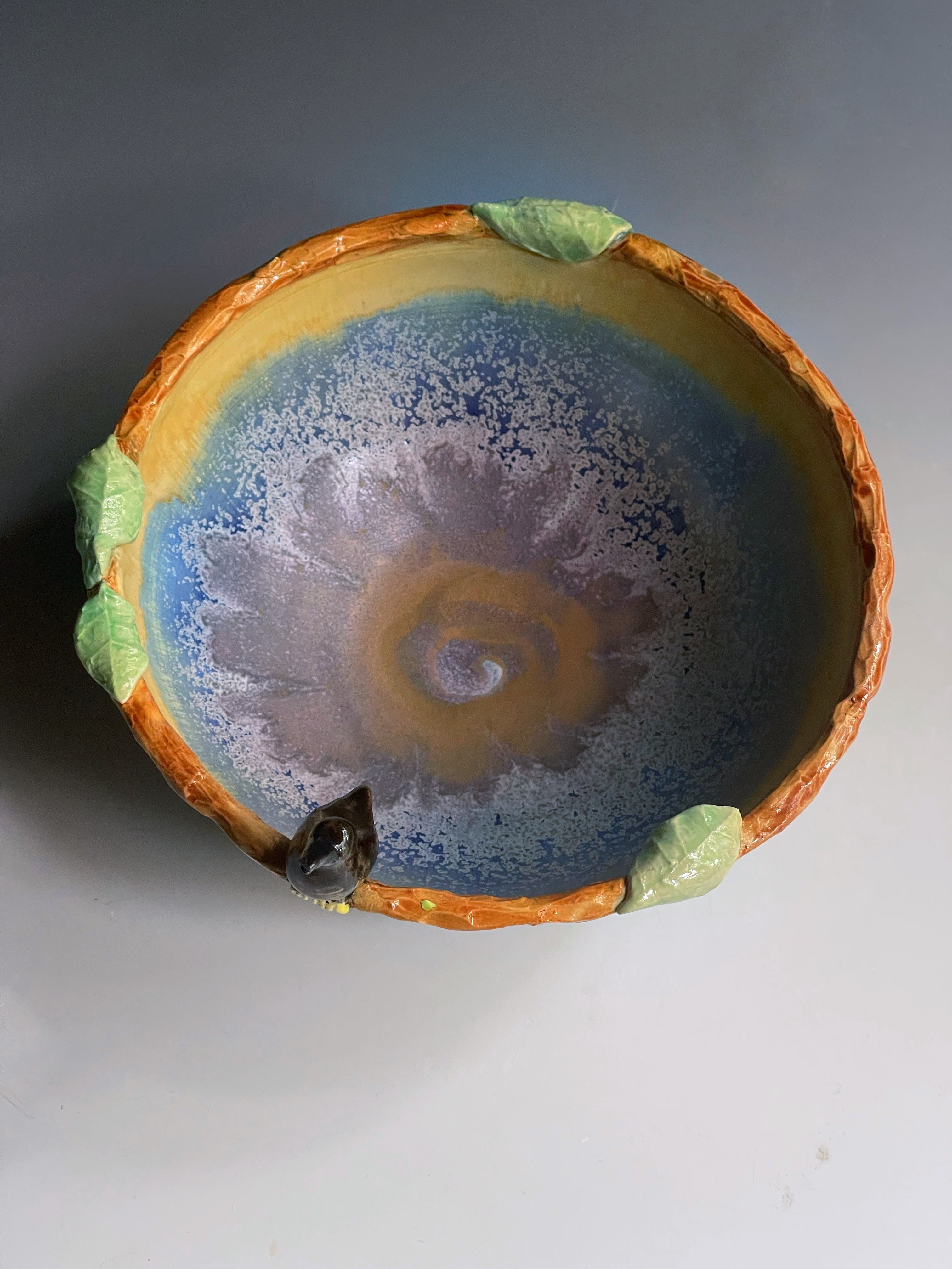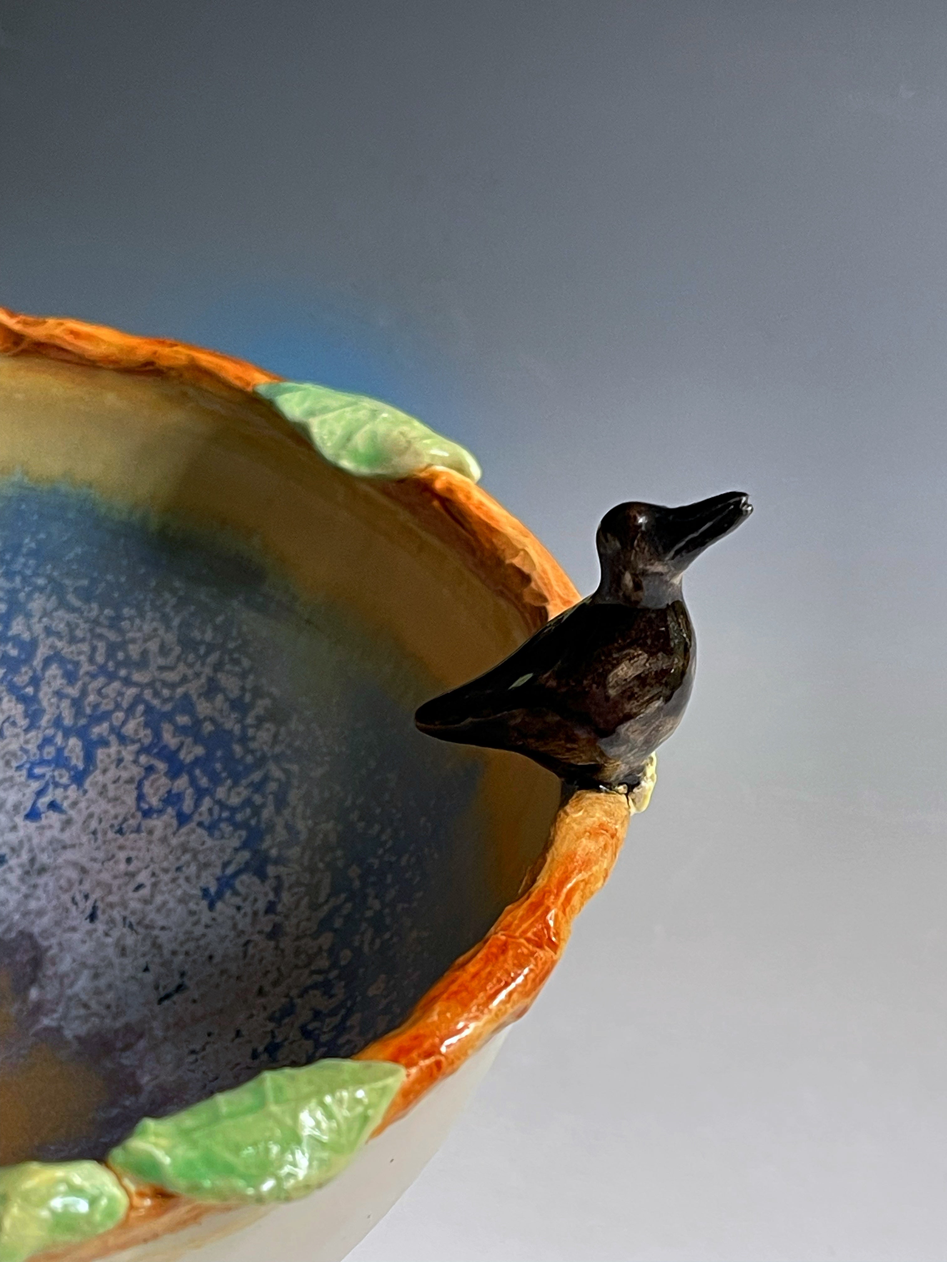 Textured tree branch rimmed bowl with a raven on a branch glazed in multicolor glazes inside.