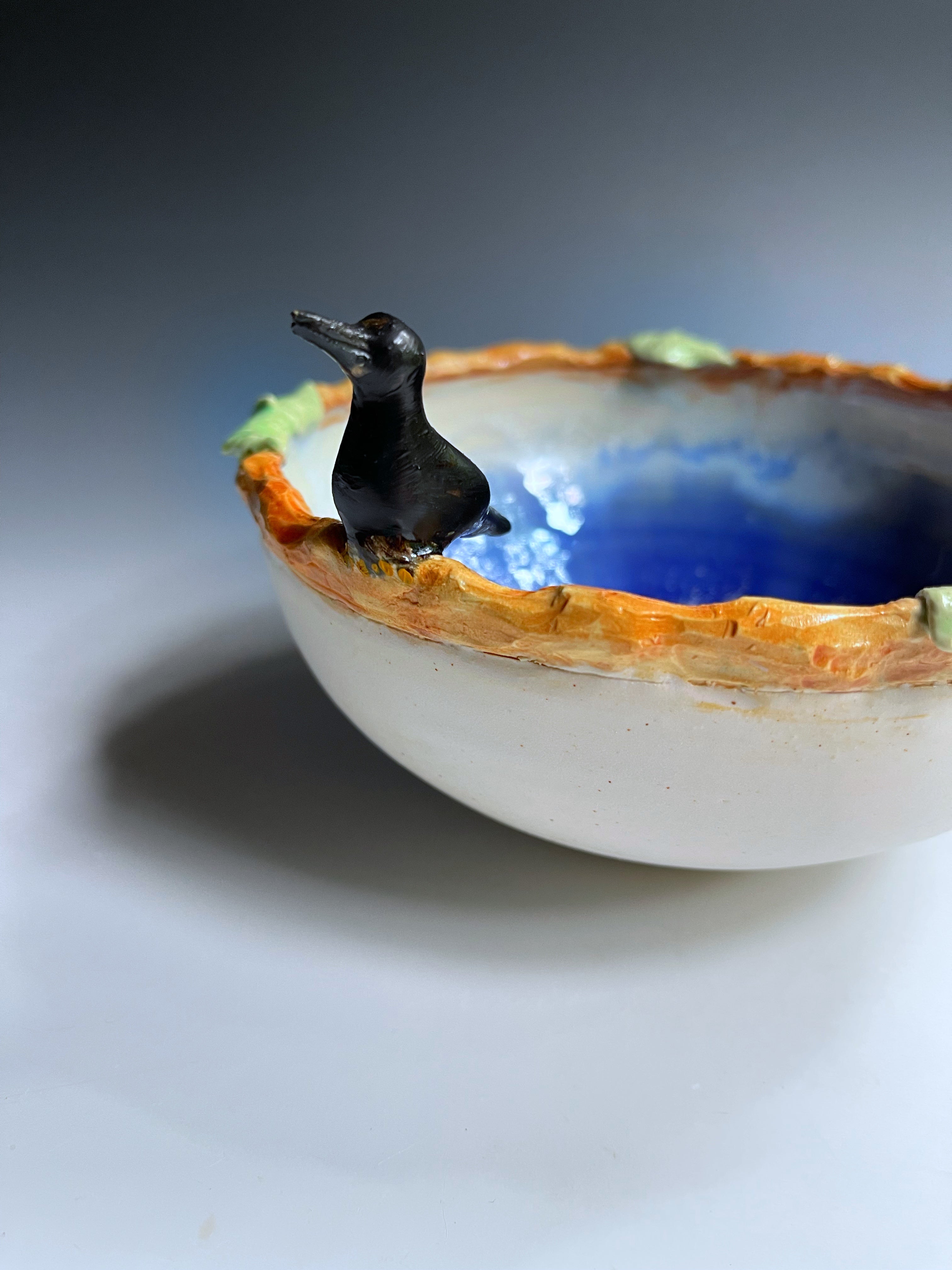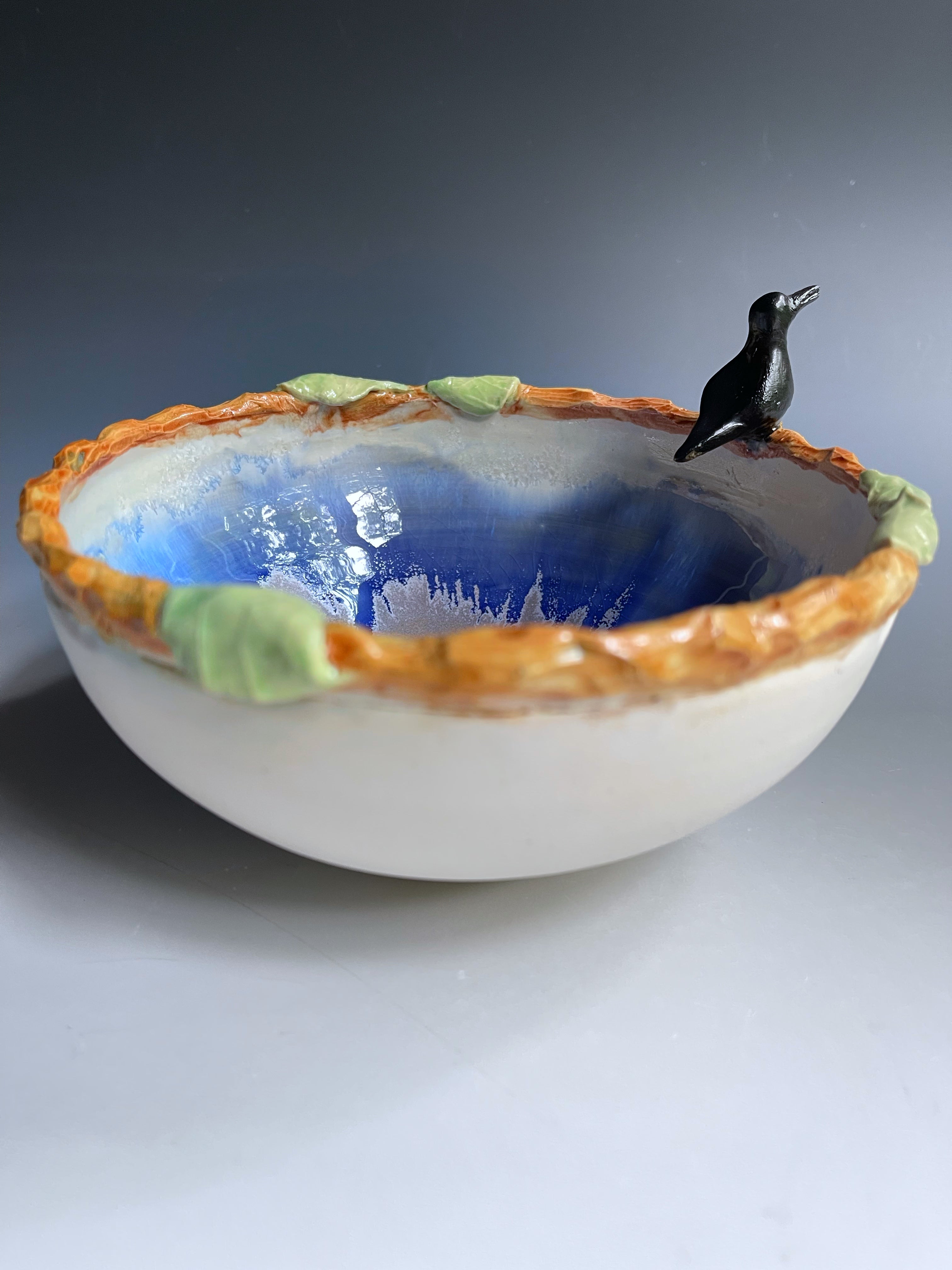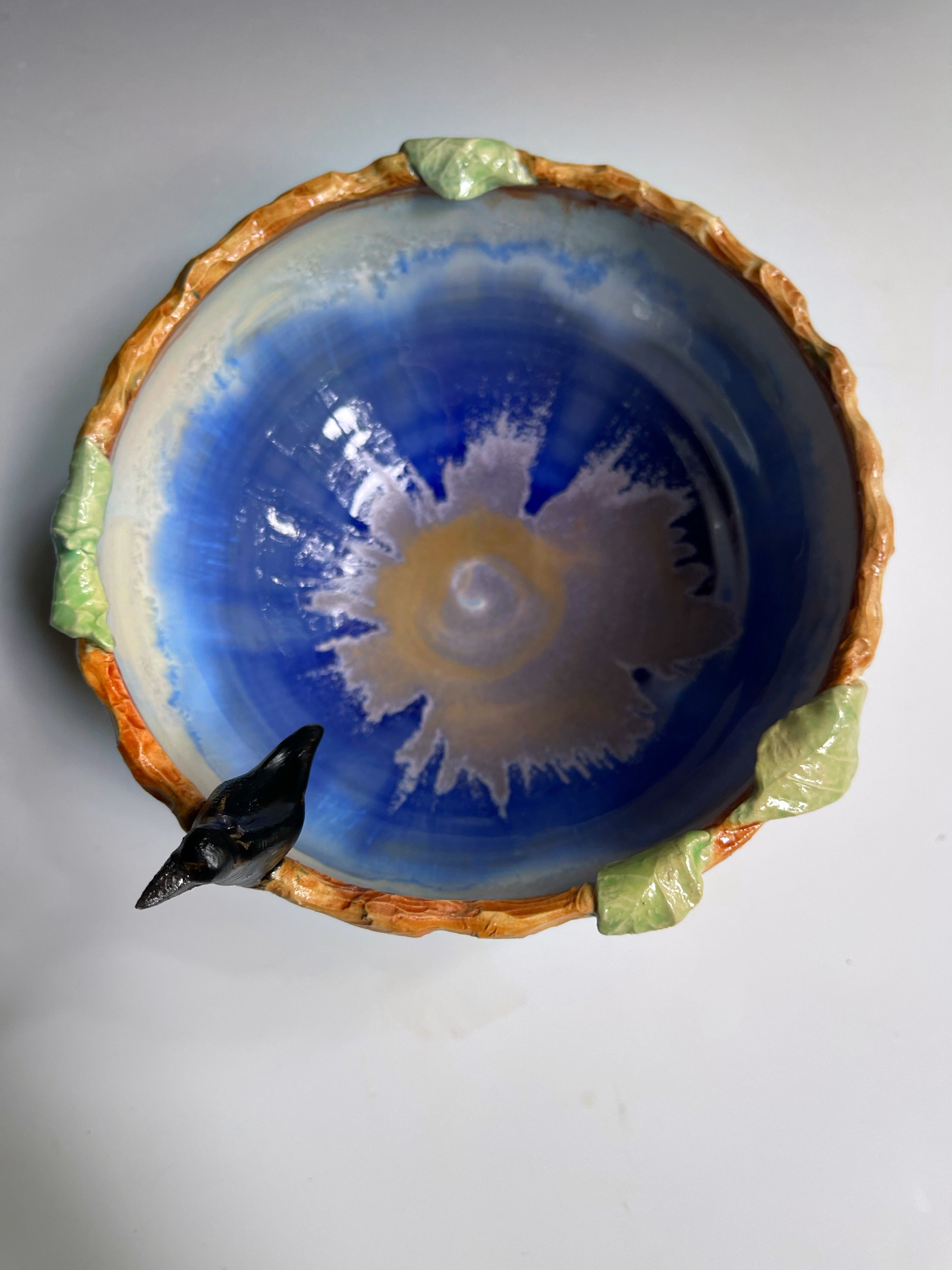 Textured tree branch rimmed bowl with a raven on a branch glazed in multicolor glazes inside.