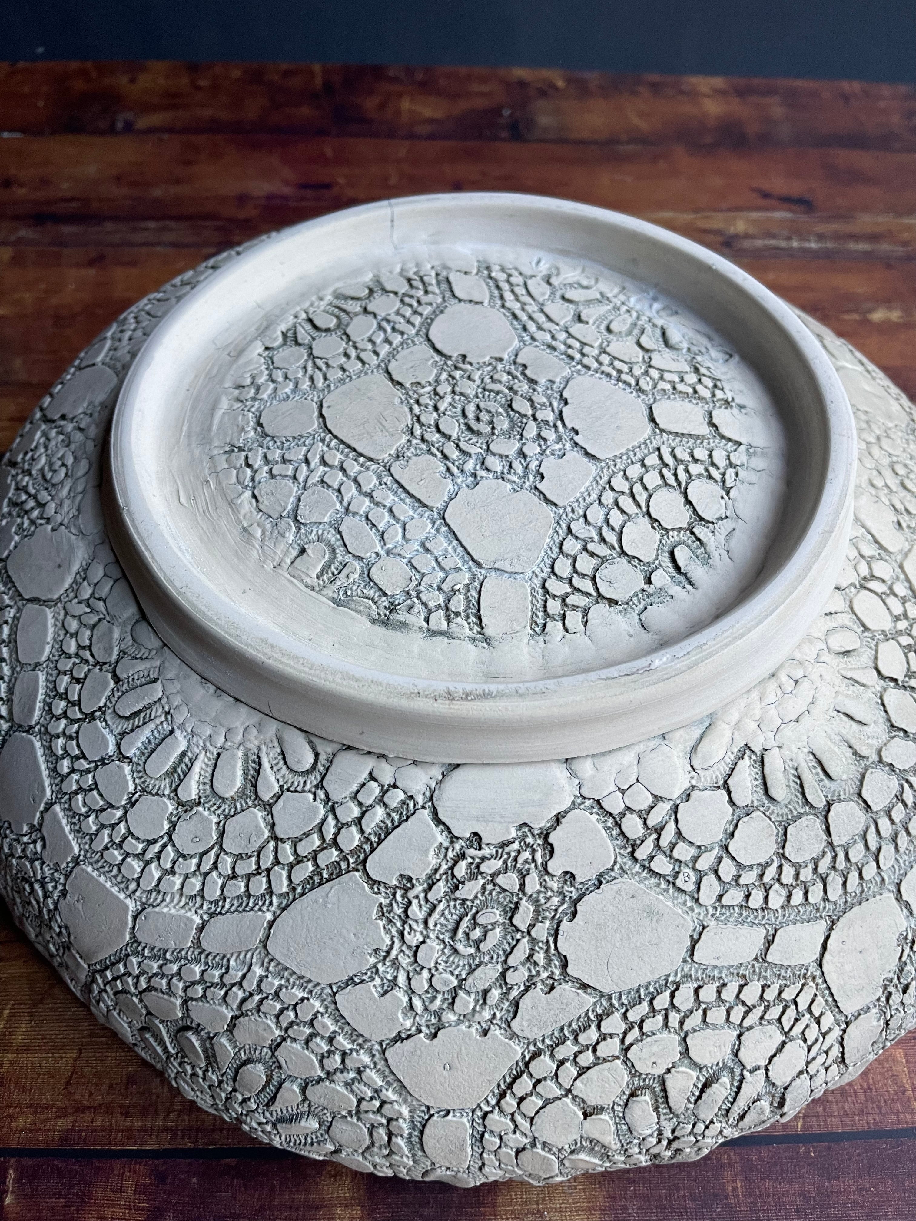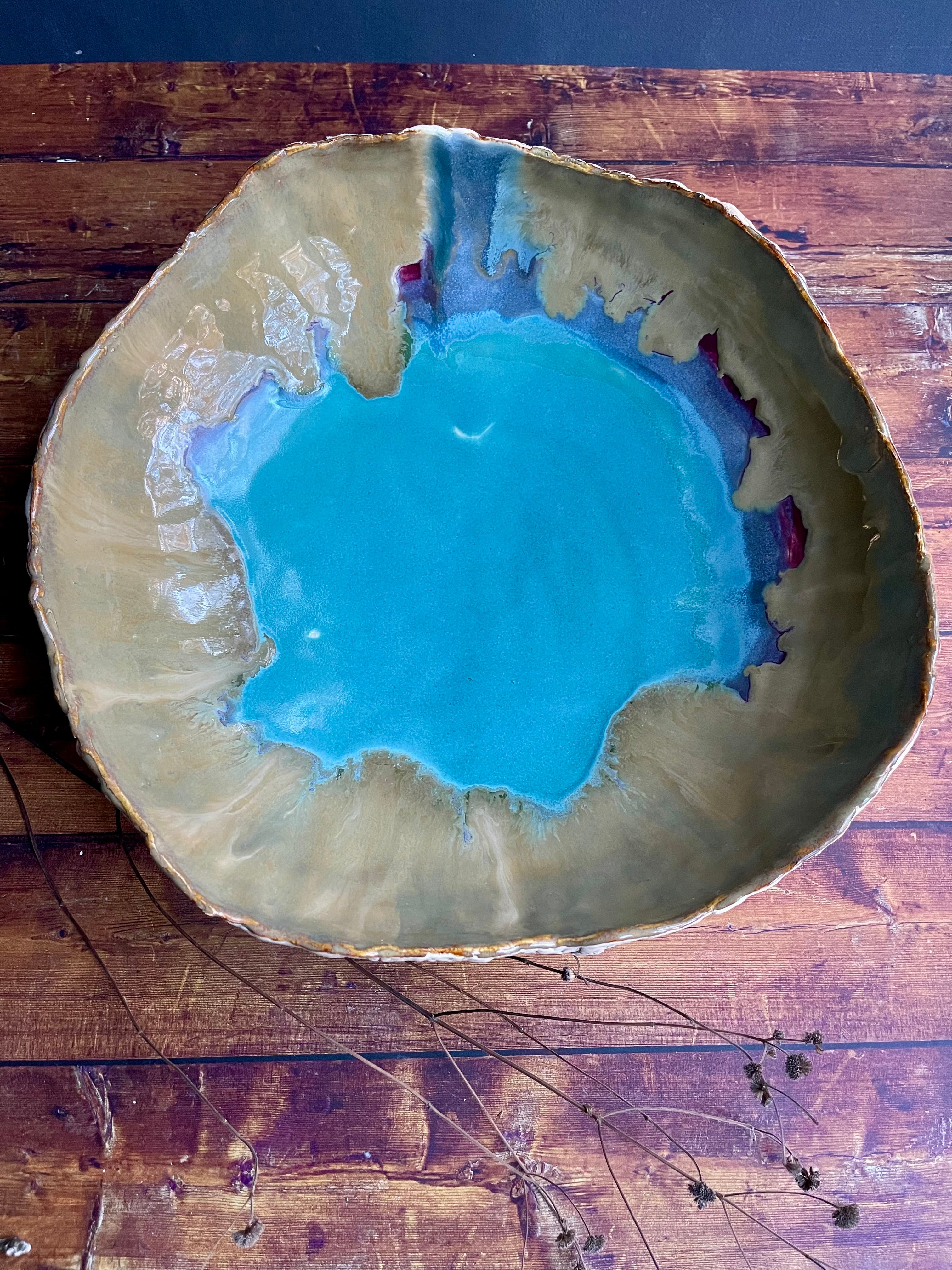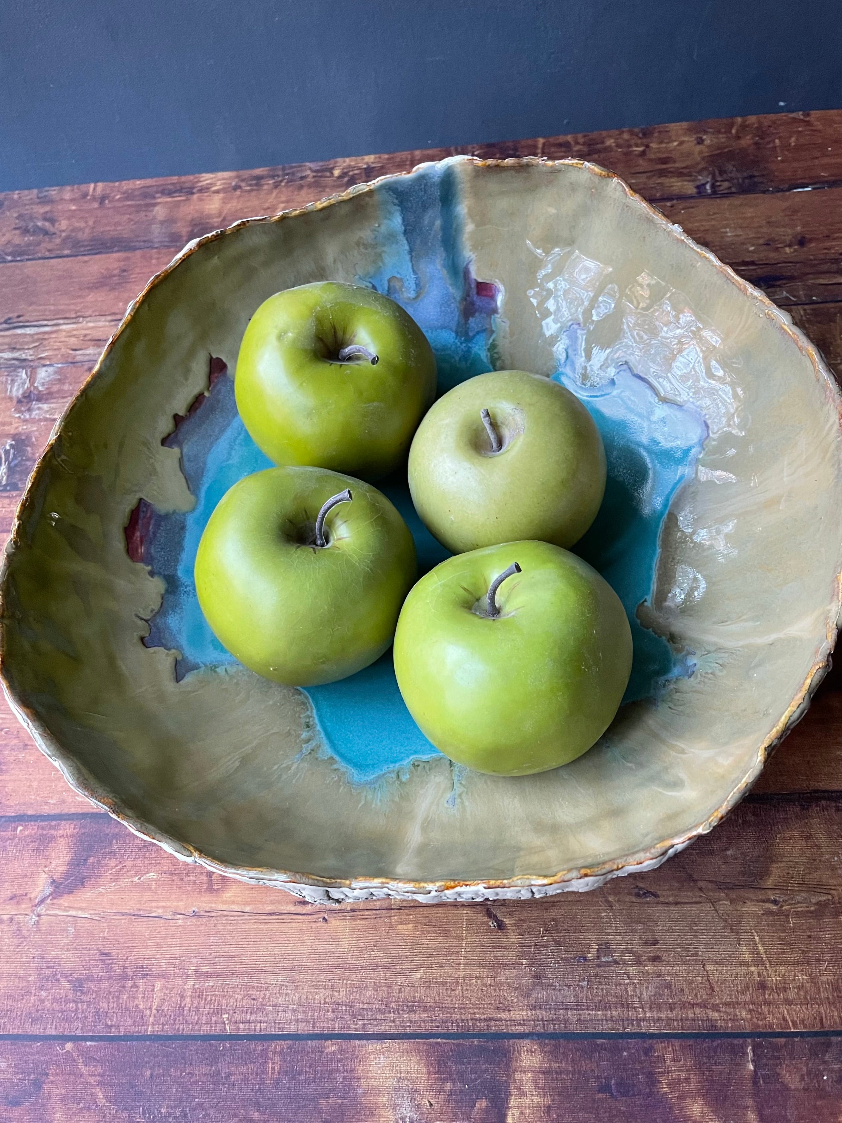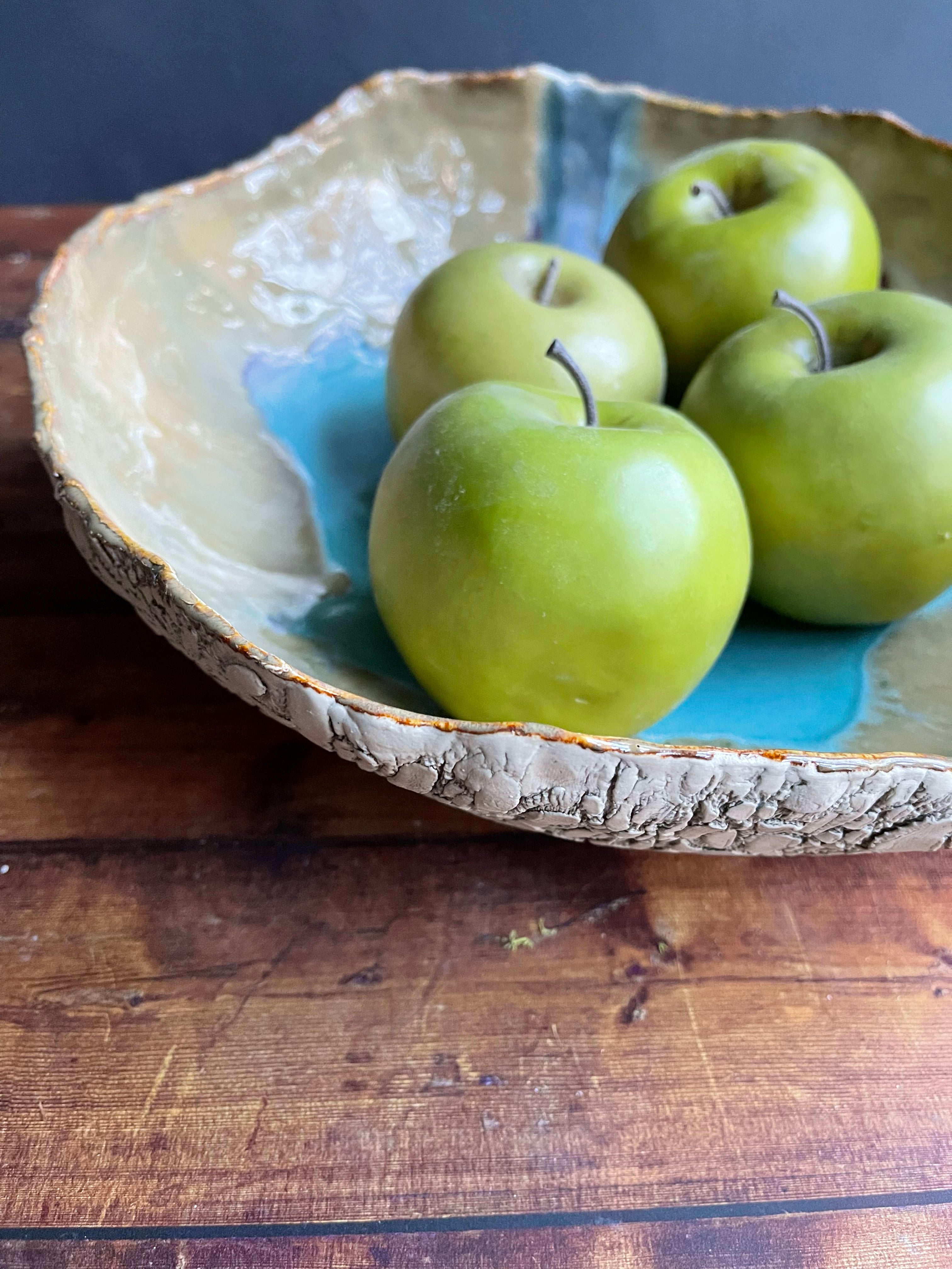 SECOND: beautiful… with some issues. There is a crack in the rim that filled in with glaze and you might never see it! The foot rim also has a crack. The turquoise glaze in the center has spots which won’t show if you use it as a fruit bowl. These won’t get worse with use and you might even like them. Enjoy the savings