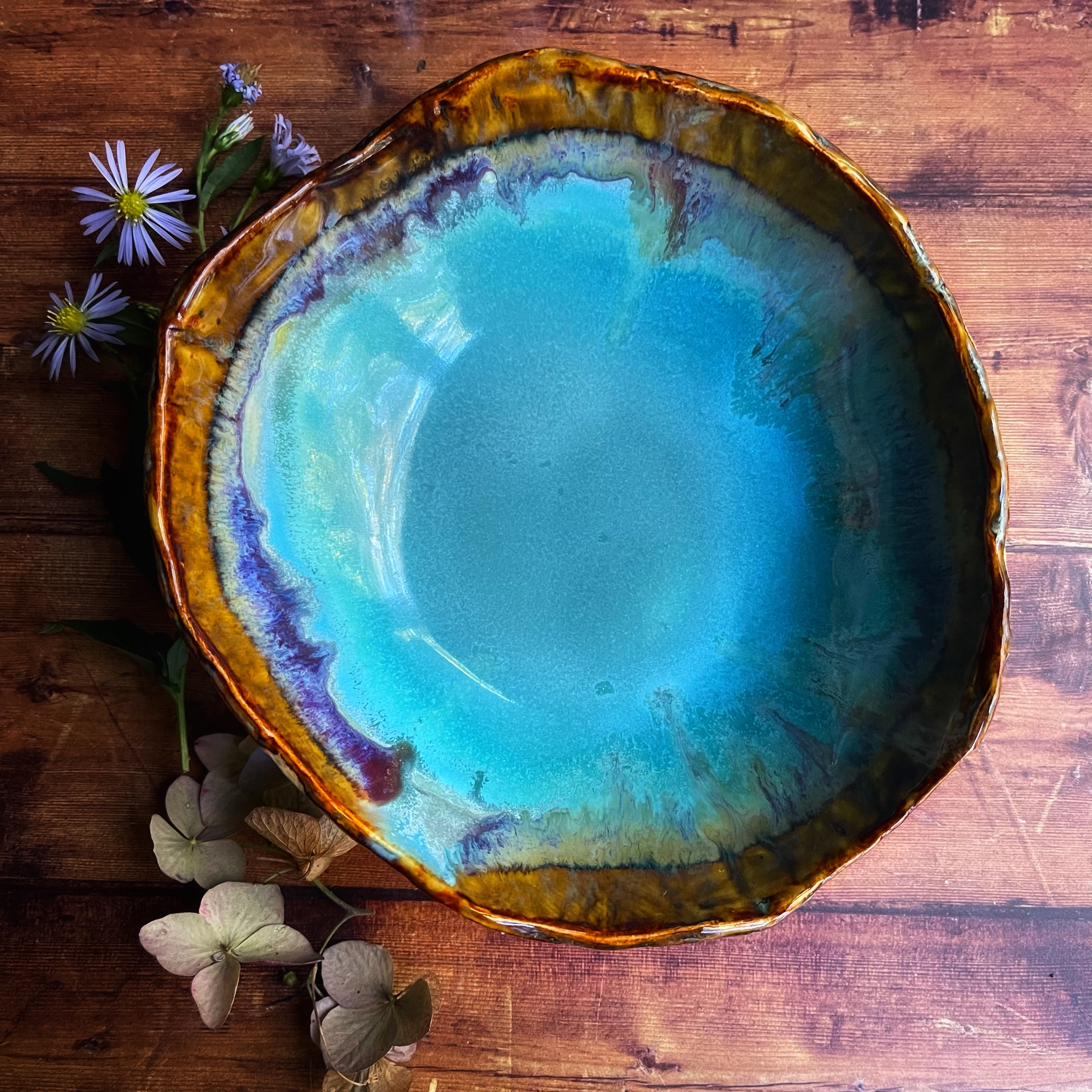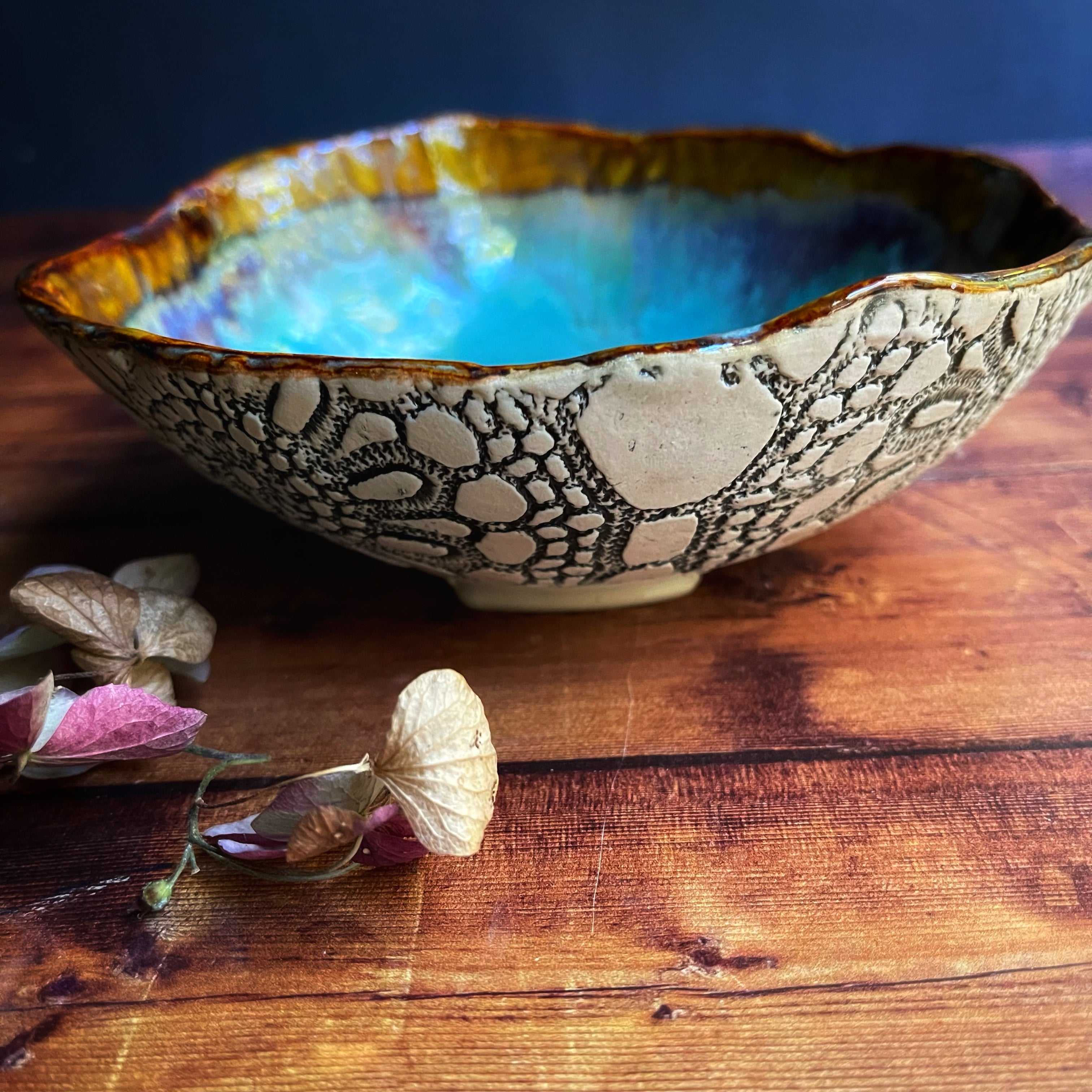 This hand built stoneware bowl has a a textured raw clay exterior and colorful flowy glazes inside.
