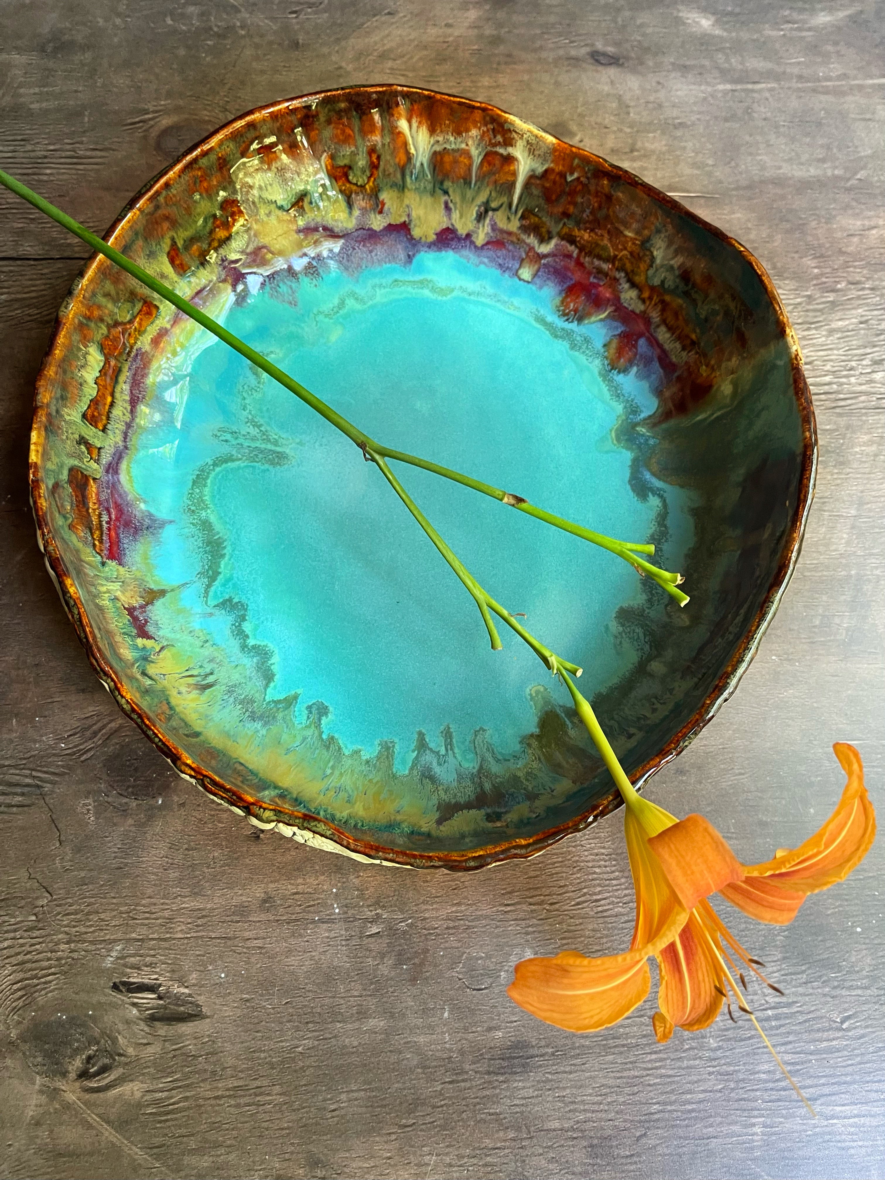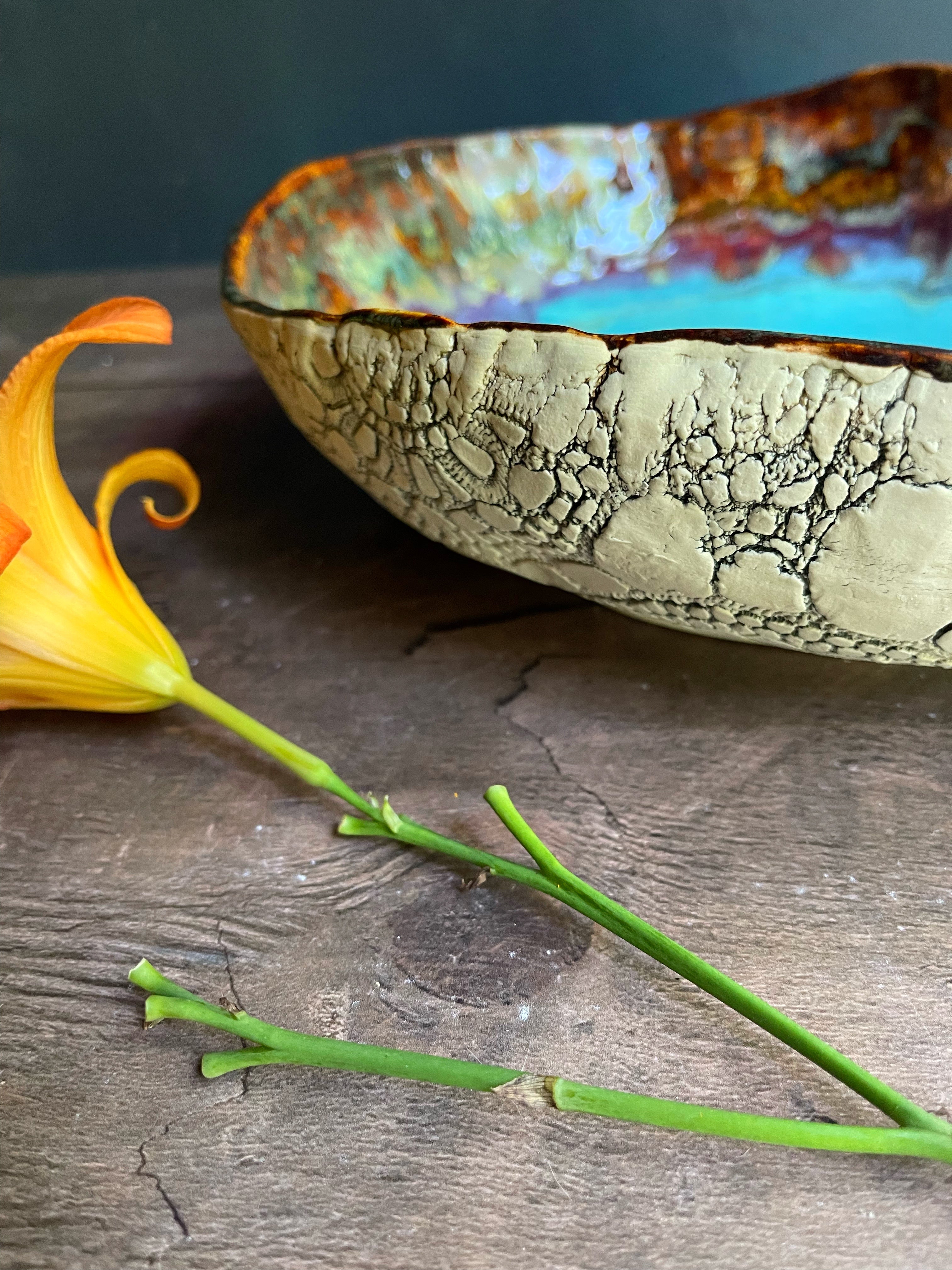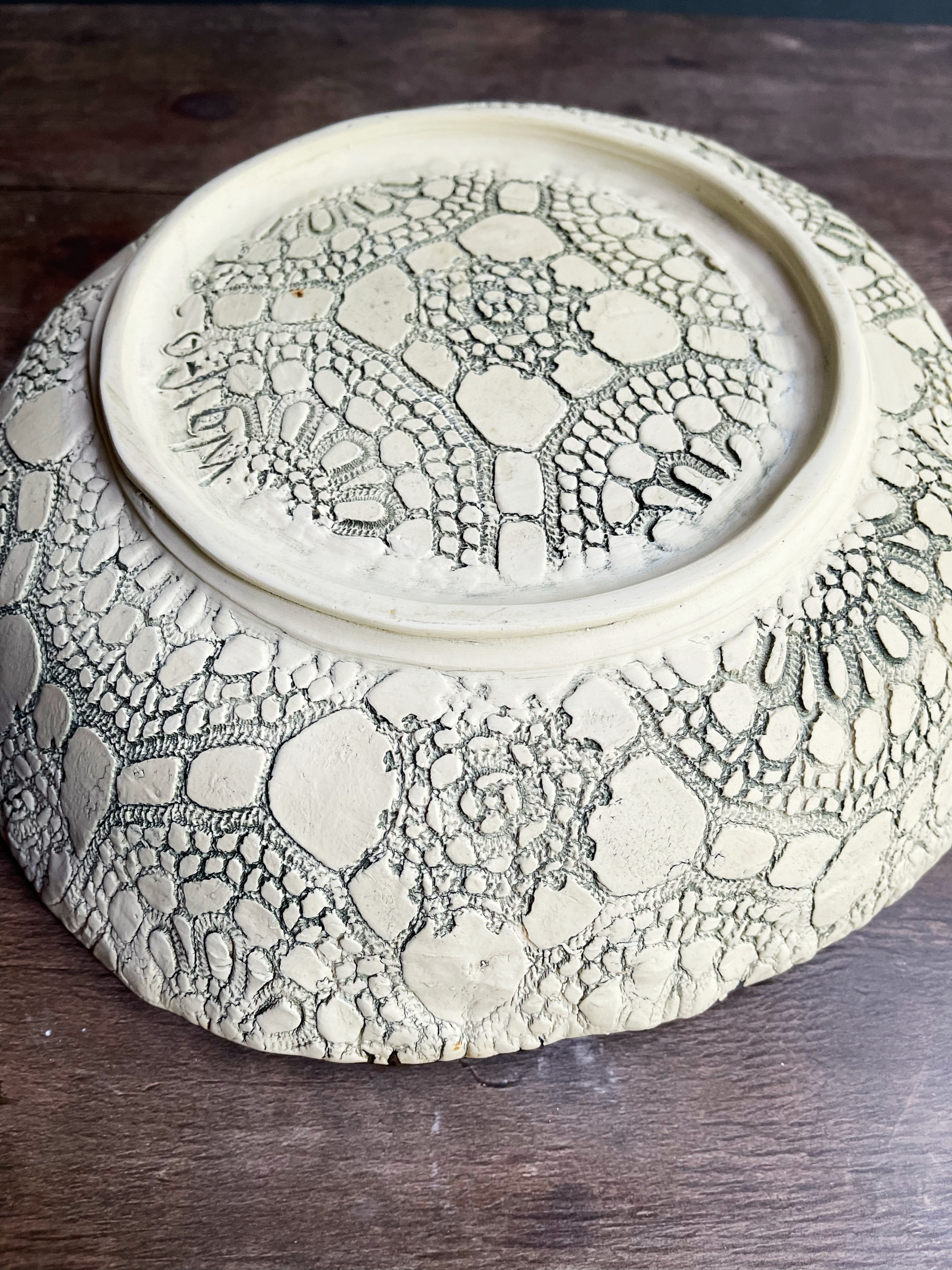 My rustic ceramic bowl collection marries sculpture with functional serving, and gives your table something as organic and nourishing as the food you serve. The outer texture is made by pressing my Nana's old crochet lace tablecloth into the wet clay. The texture is accented by an iron gglaze , permanently fired into the piece.
