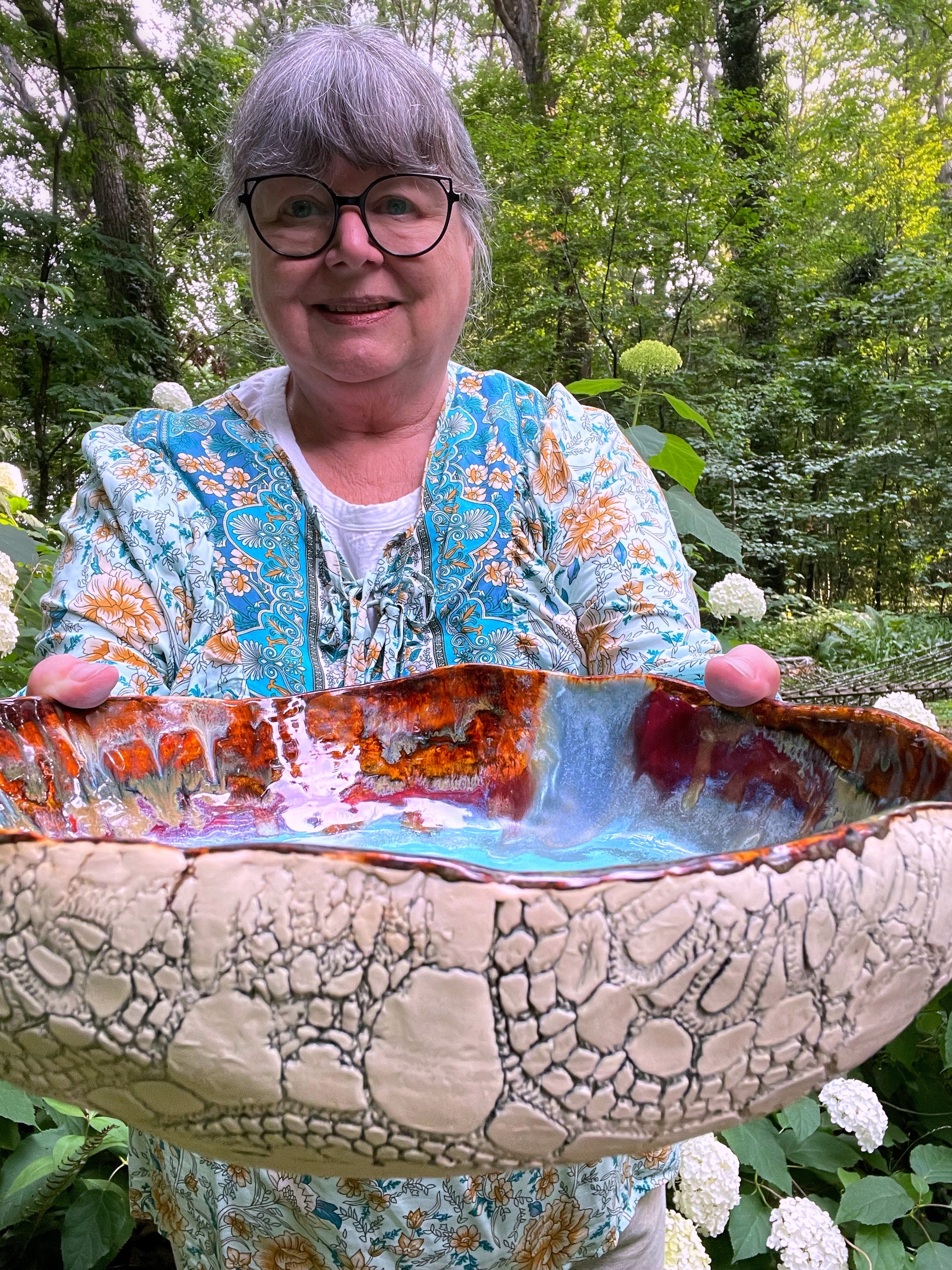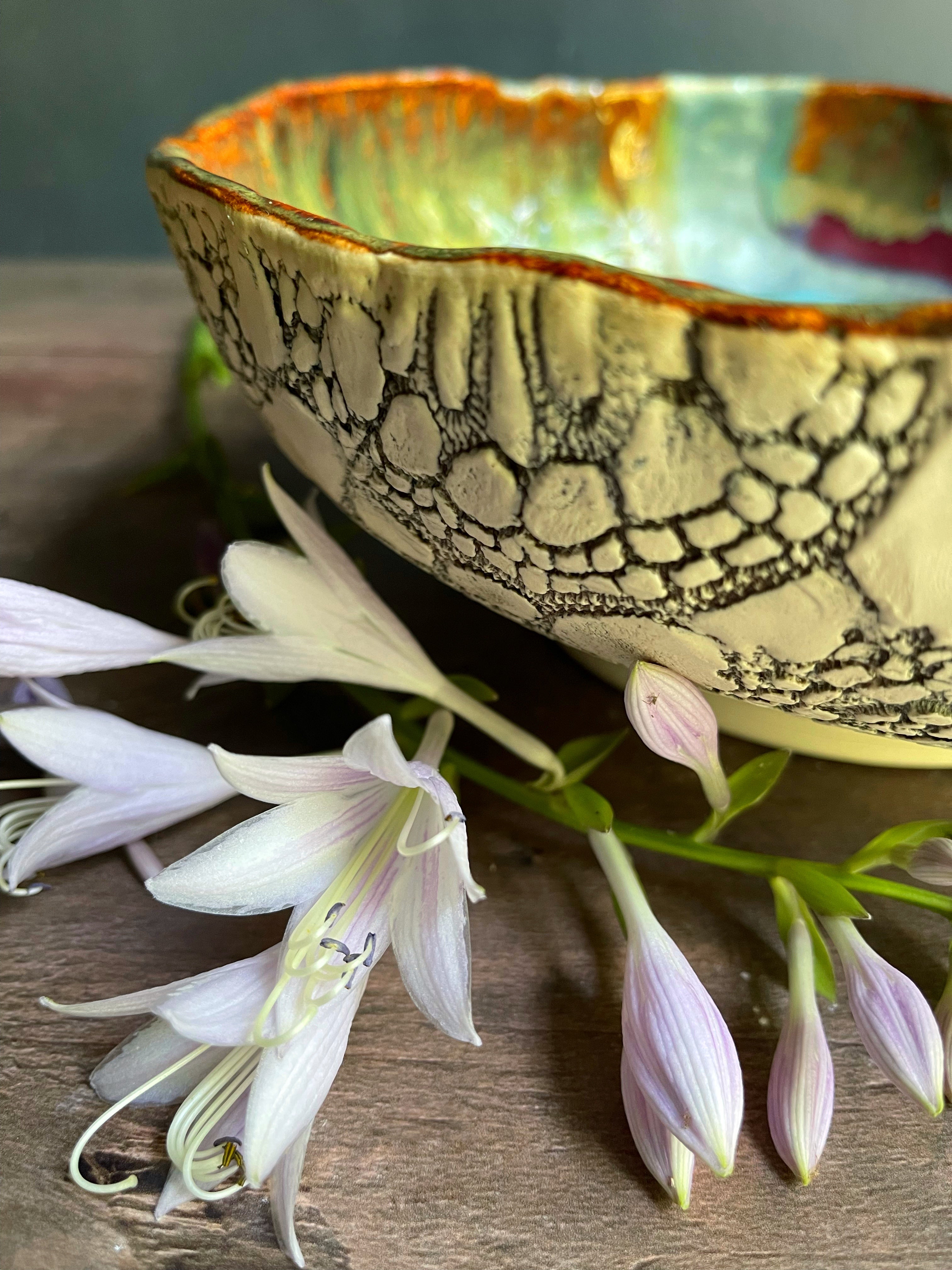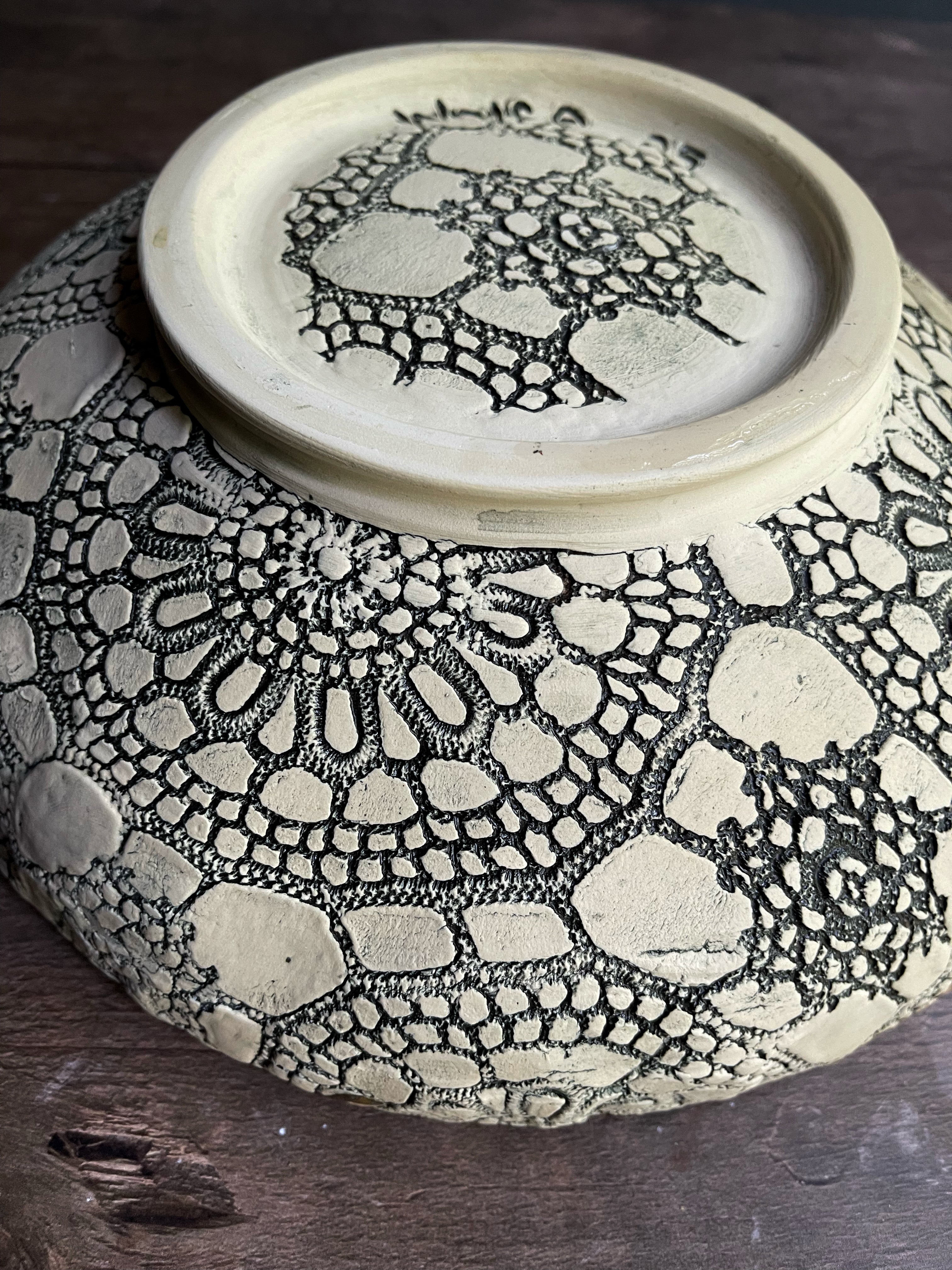 My rustic ceramic bowl collection marries sculpture with functional serving, and gives your table something as organic and nourishing as the food you serve. The outer texture is made by pressing my Nana's old crochet lace tablecloth into the wet clay. The texture is accented by an iron gglaze , permanently fired into the piece.