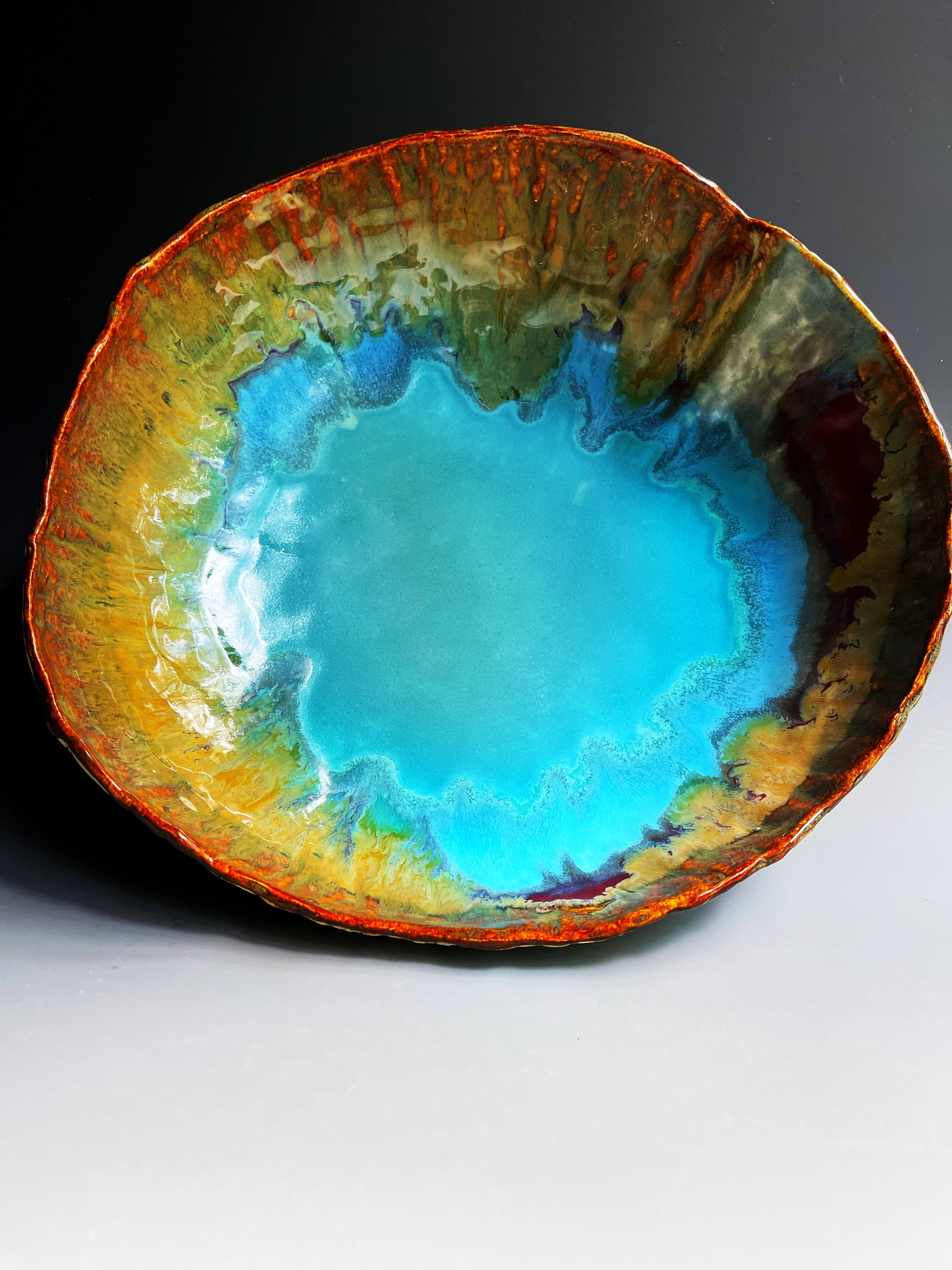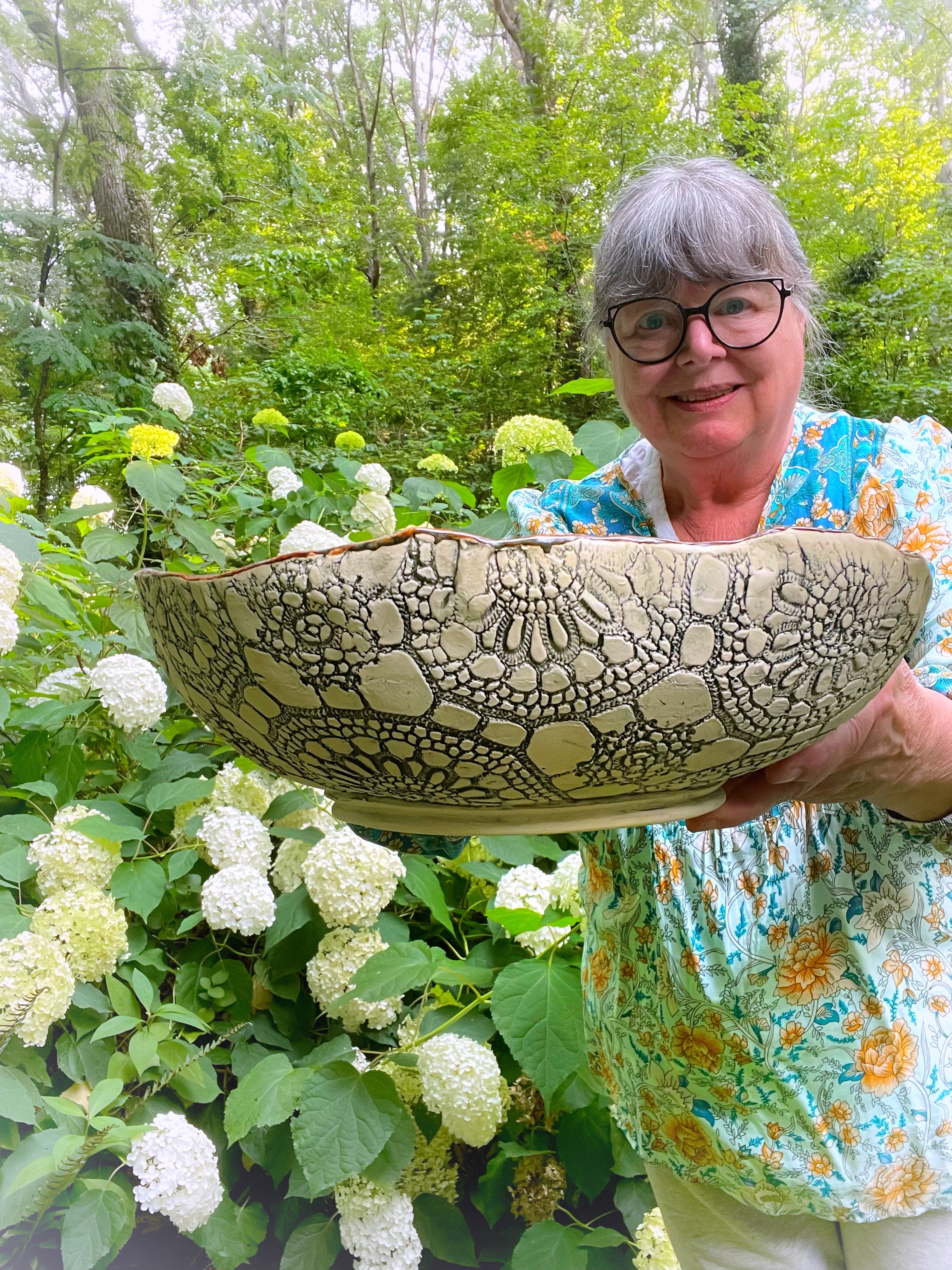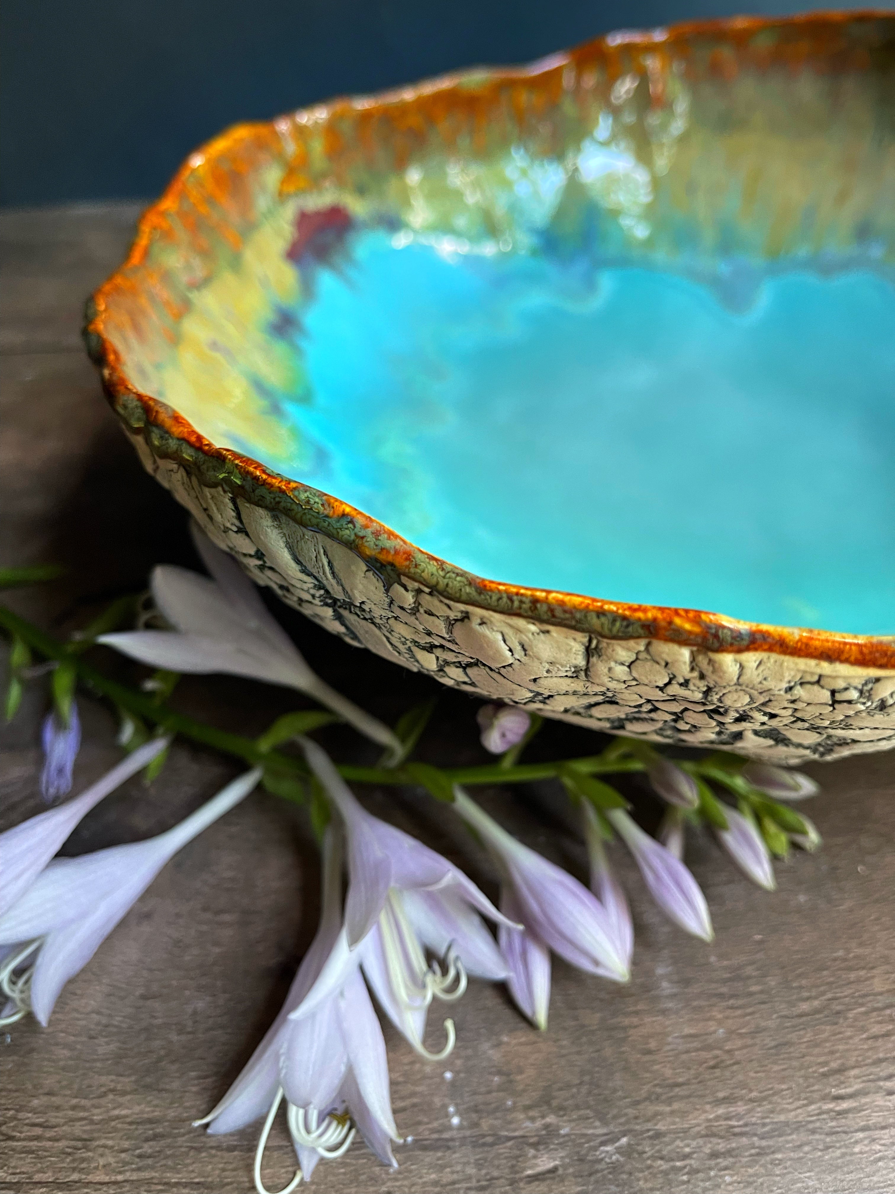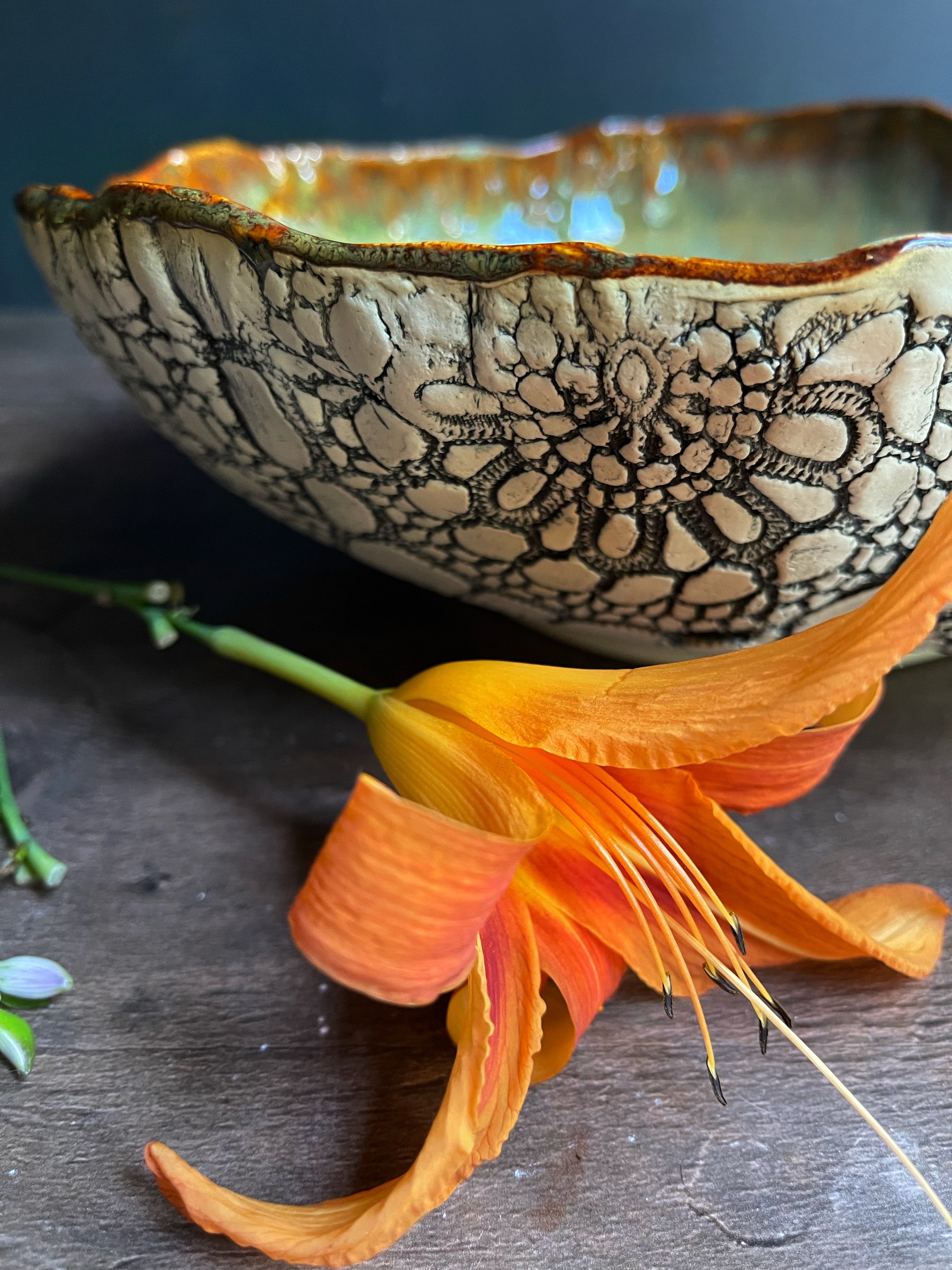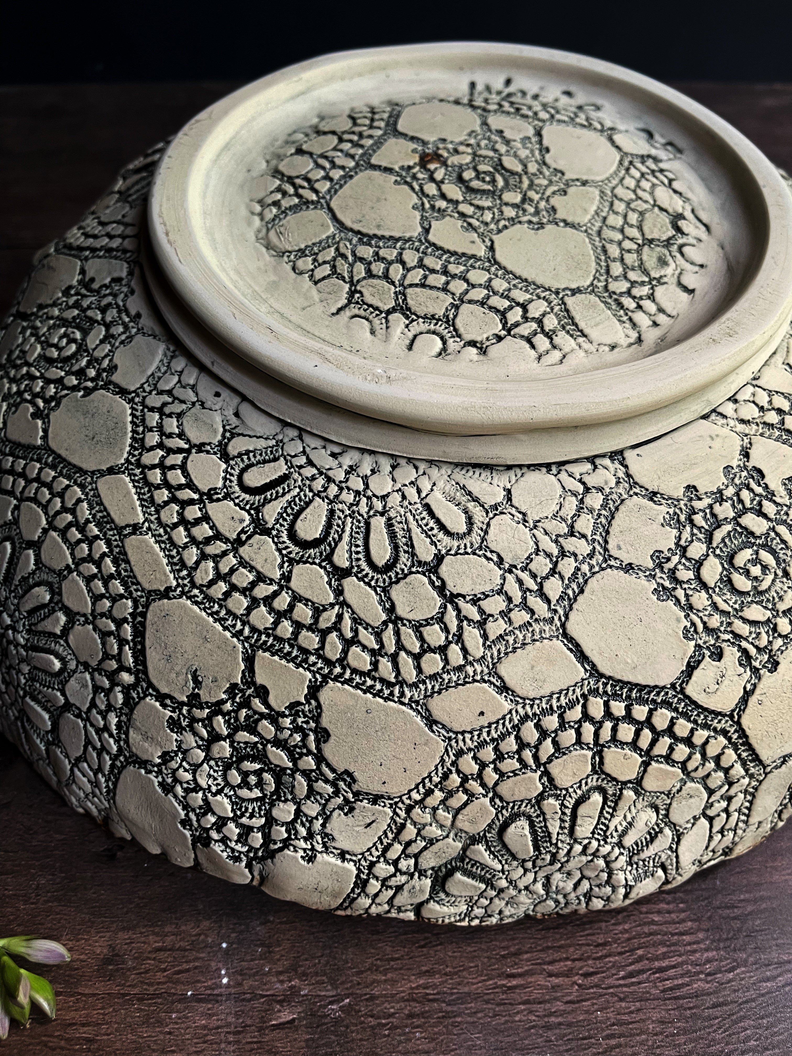 My rustic ceramic bowl collection marries sculpture with functional serving, and gives your table something as organic and nourishing as the food you serve. The outer texture is made by pressing my Nana's old crochet lace tablecloth into the wet clay. The texture is accented by an iron gglaze , permanently fired into the piece.