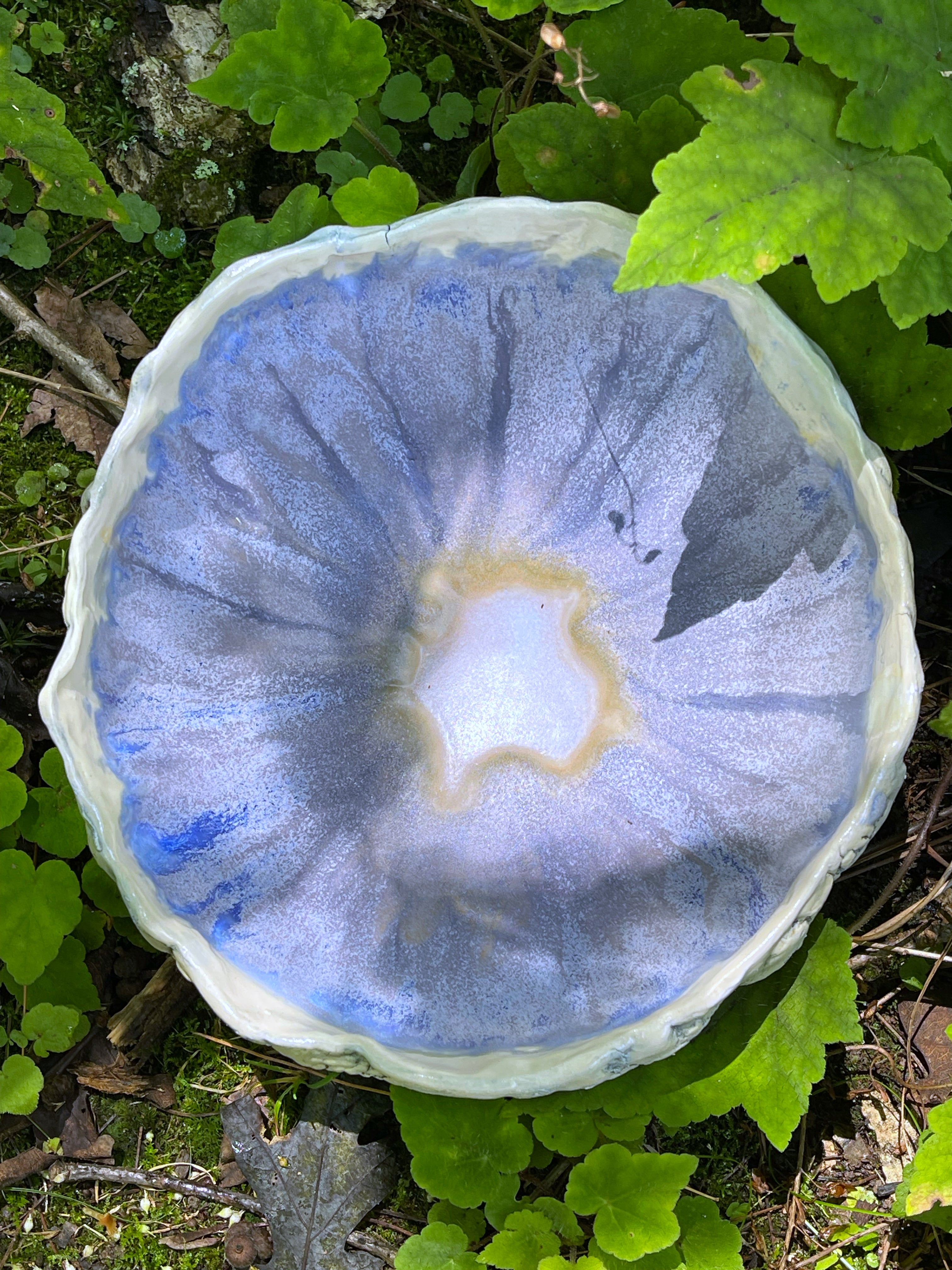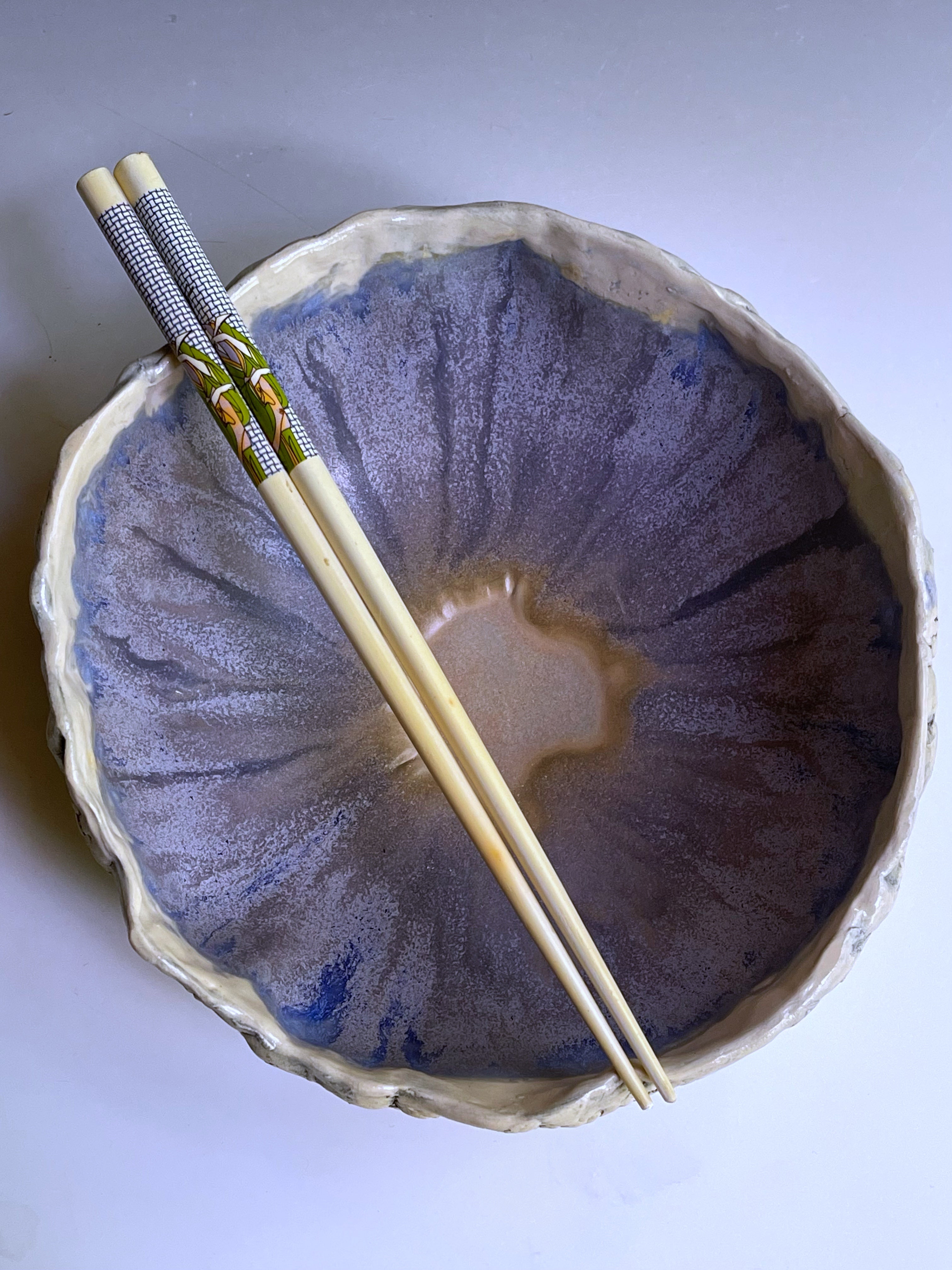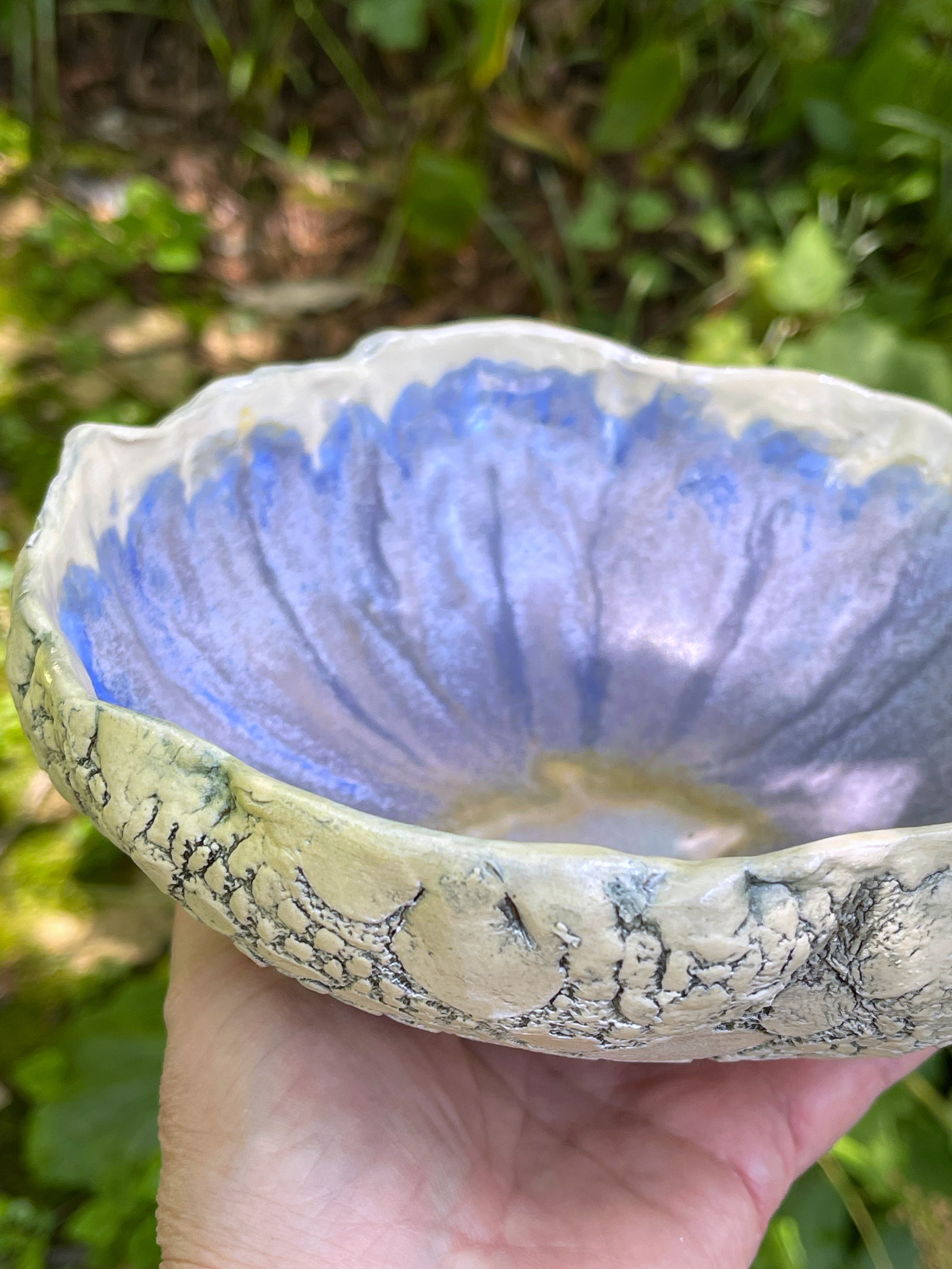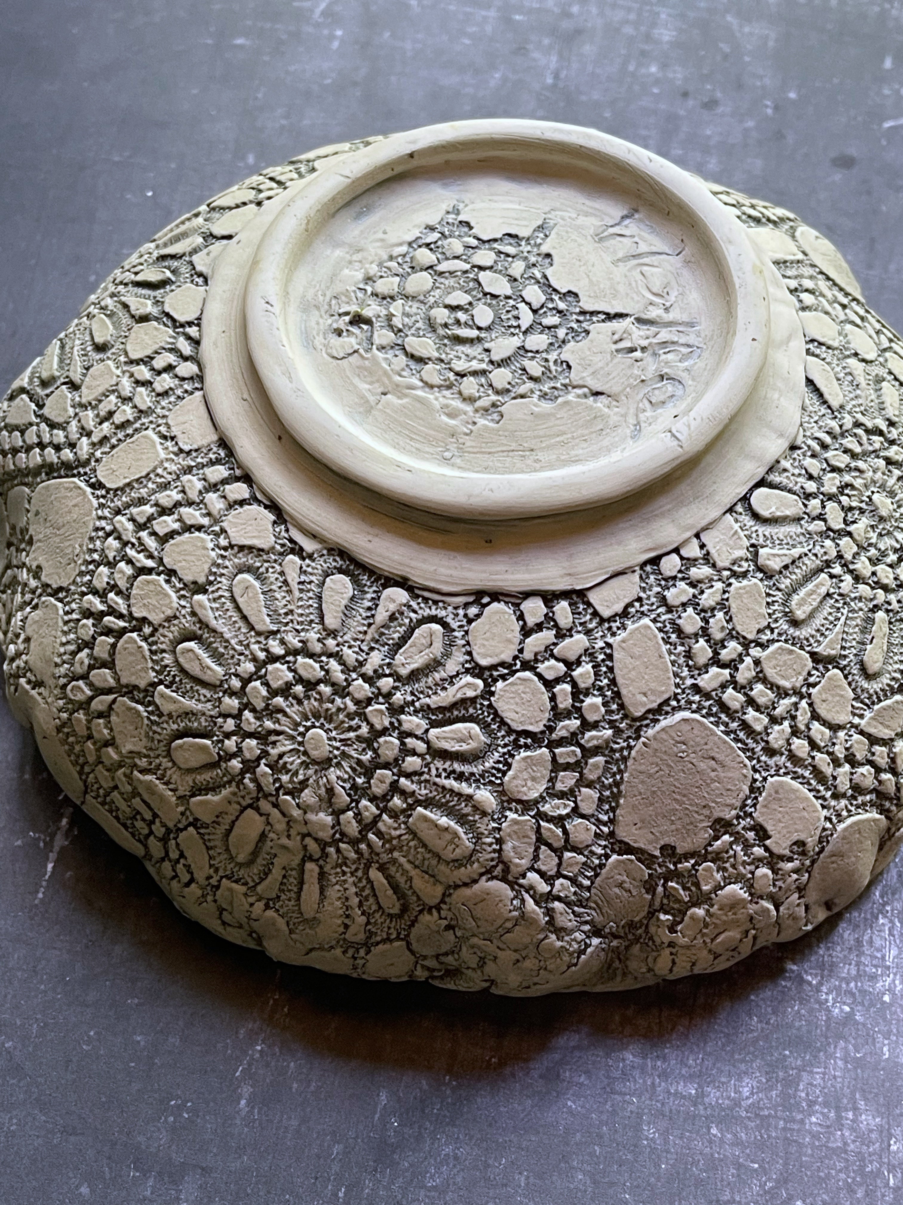 My rustic ceramic bowl collection marries sculpture with functional serving, and gives your table something as organic and nourishing as the food you serve. The outer texture is made by pressing my Nana's old crochet lace tablecloth into the wet clay. The texture is accented by an iron gglaze , permanently fired into the piece.