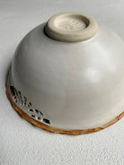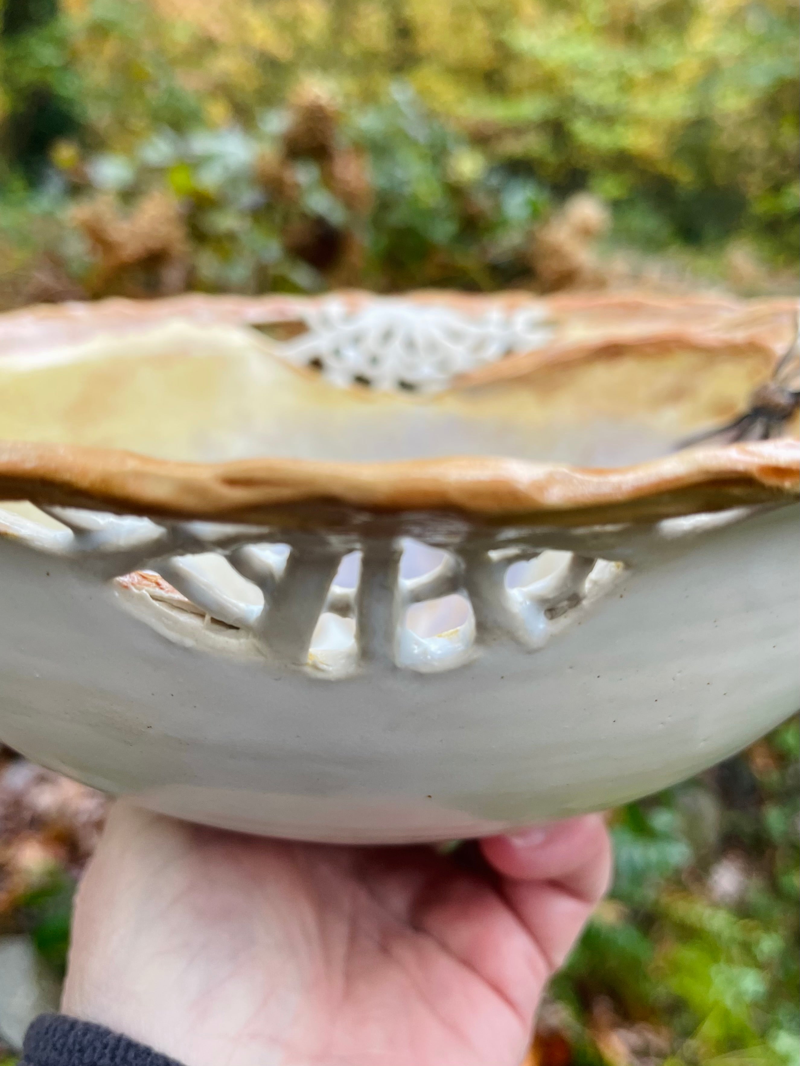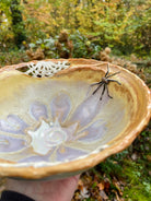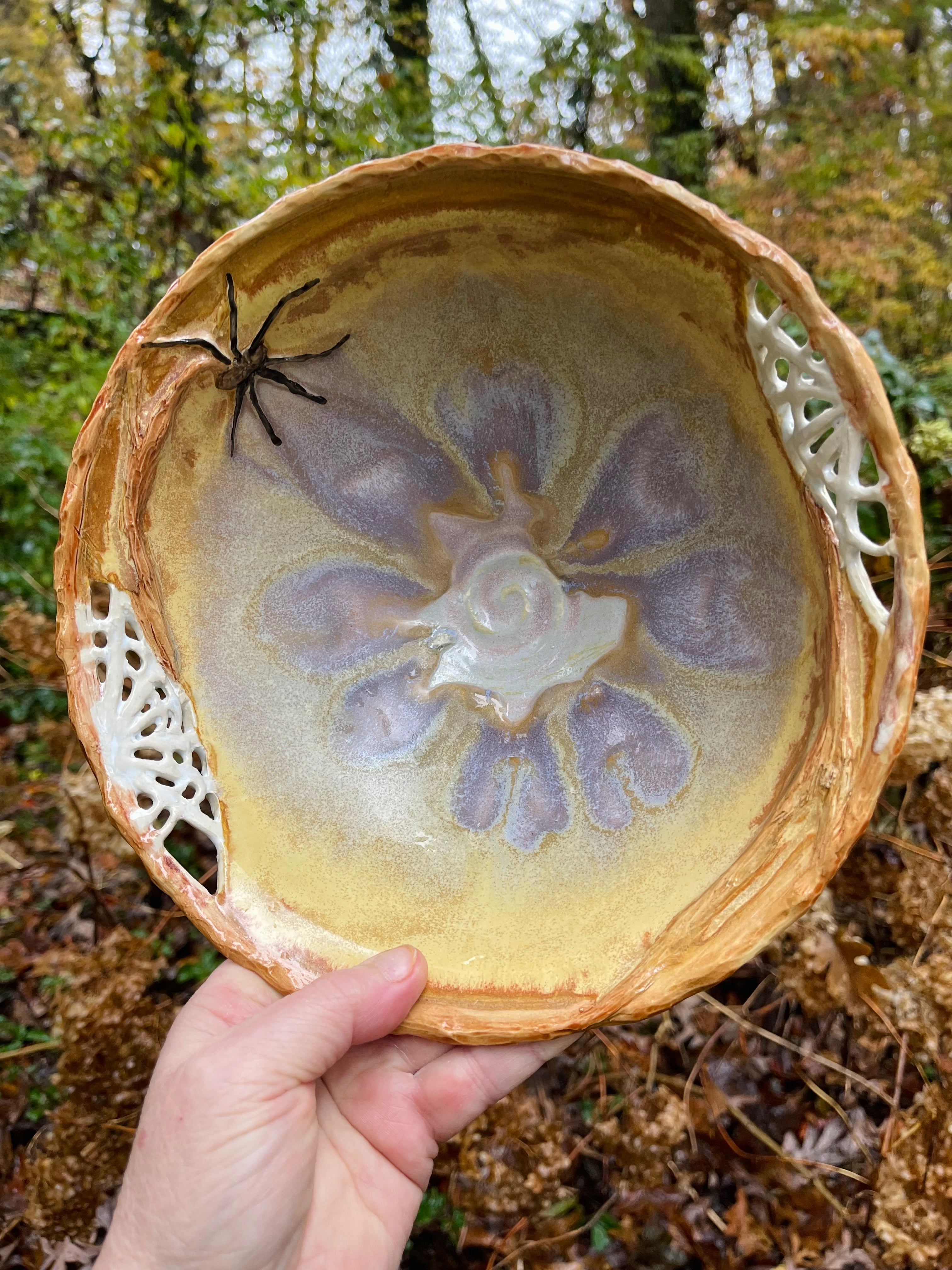 Textured tree branch rimmed bowl with 2 spider webs and a dangling spider, glazed in a mandala glaze inside.