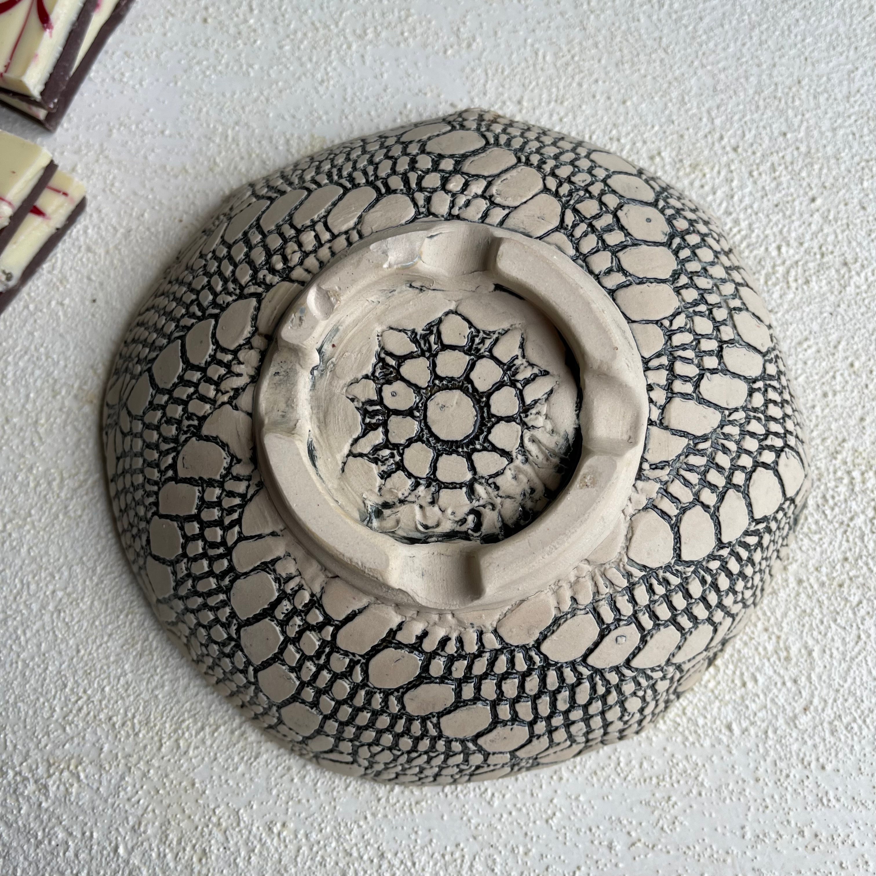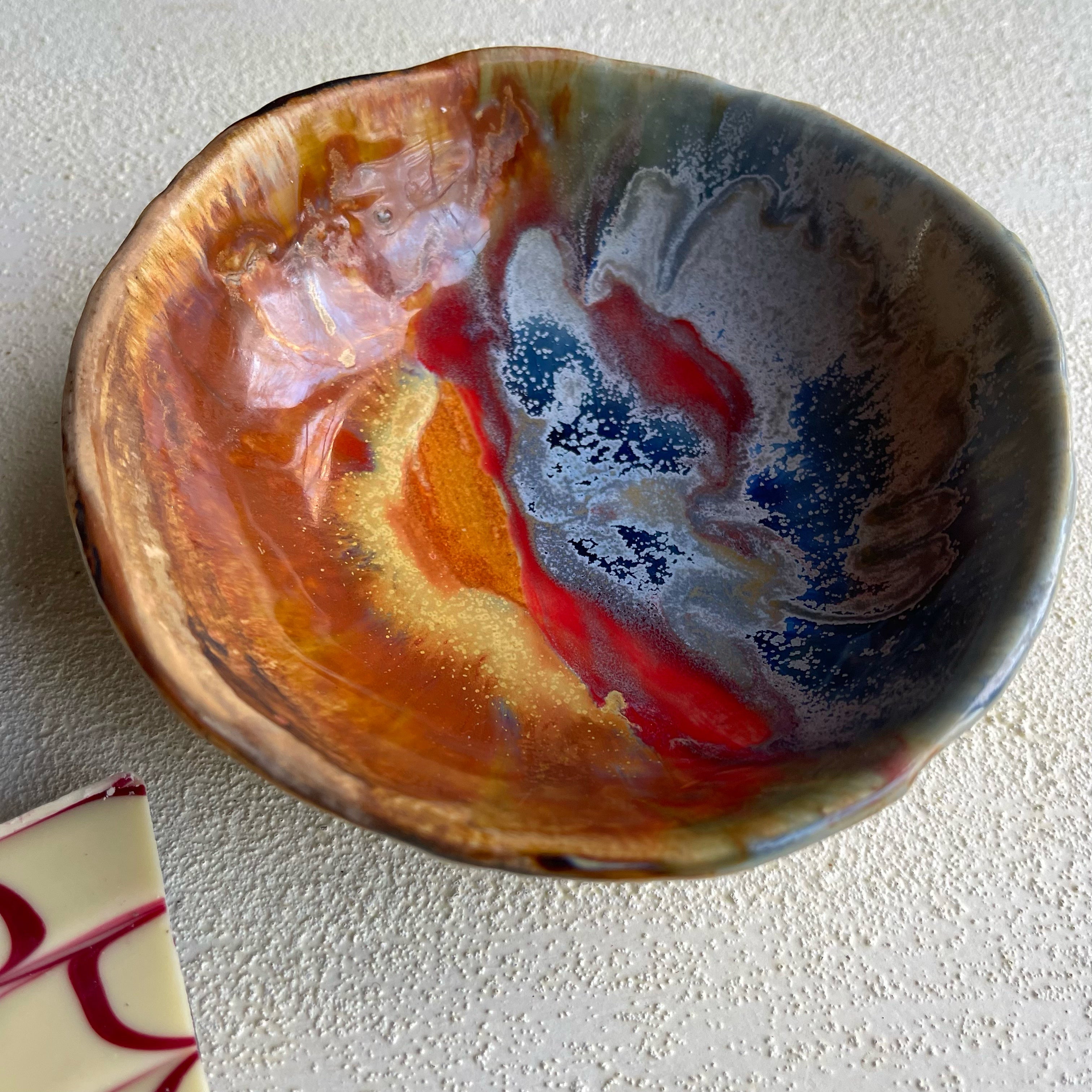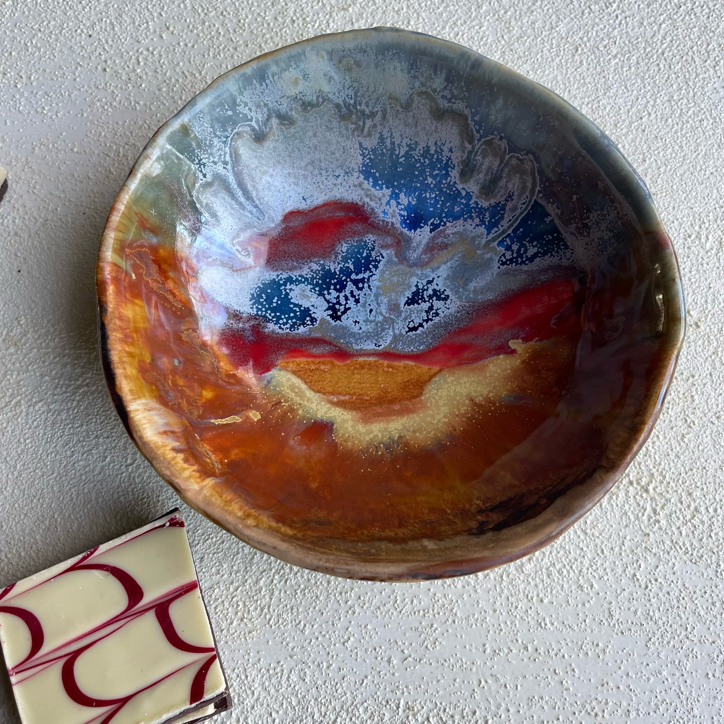 Textured lace bowl glazed in multicolor glazes inside emulating a blazing red sunset.