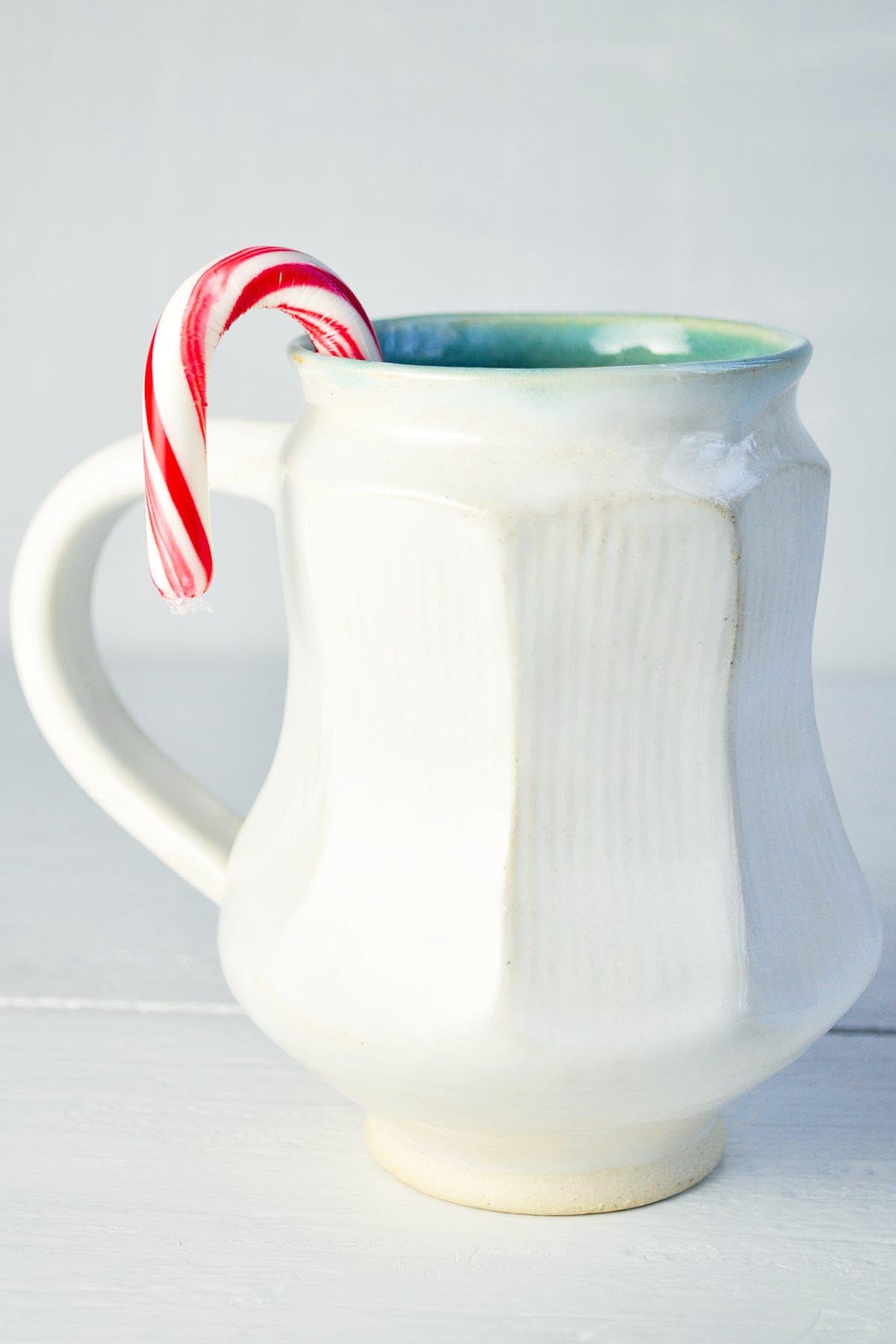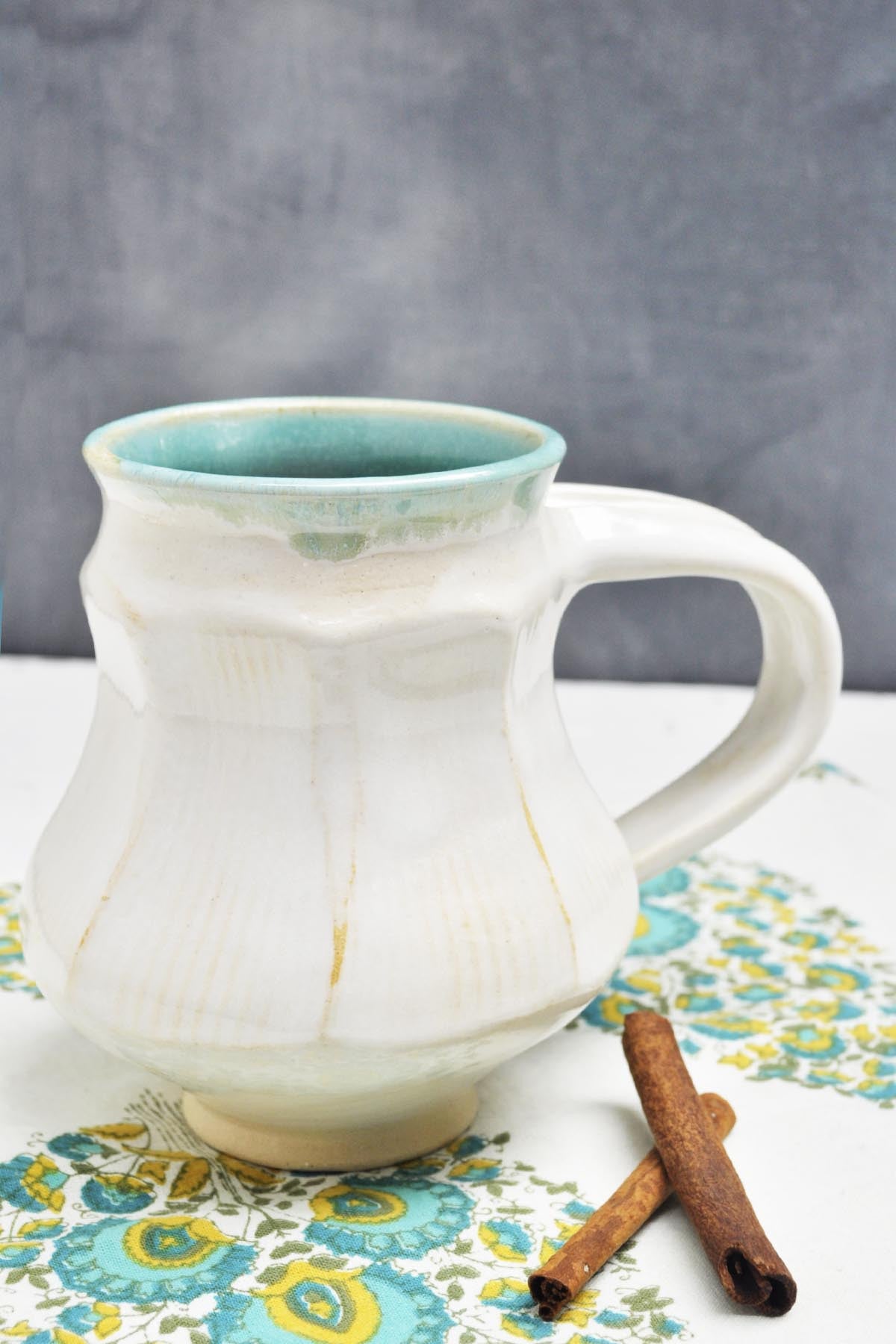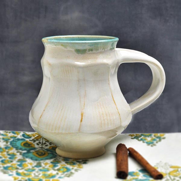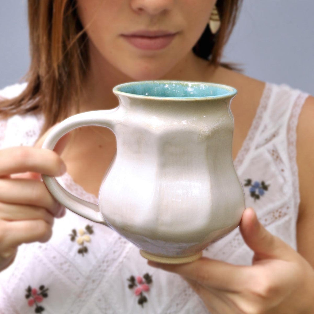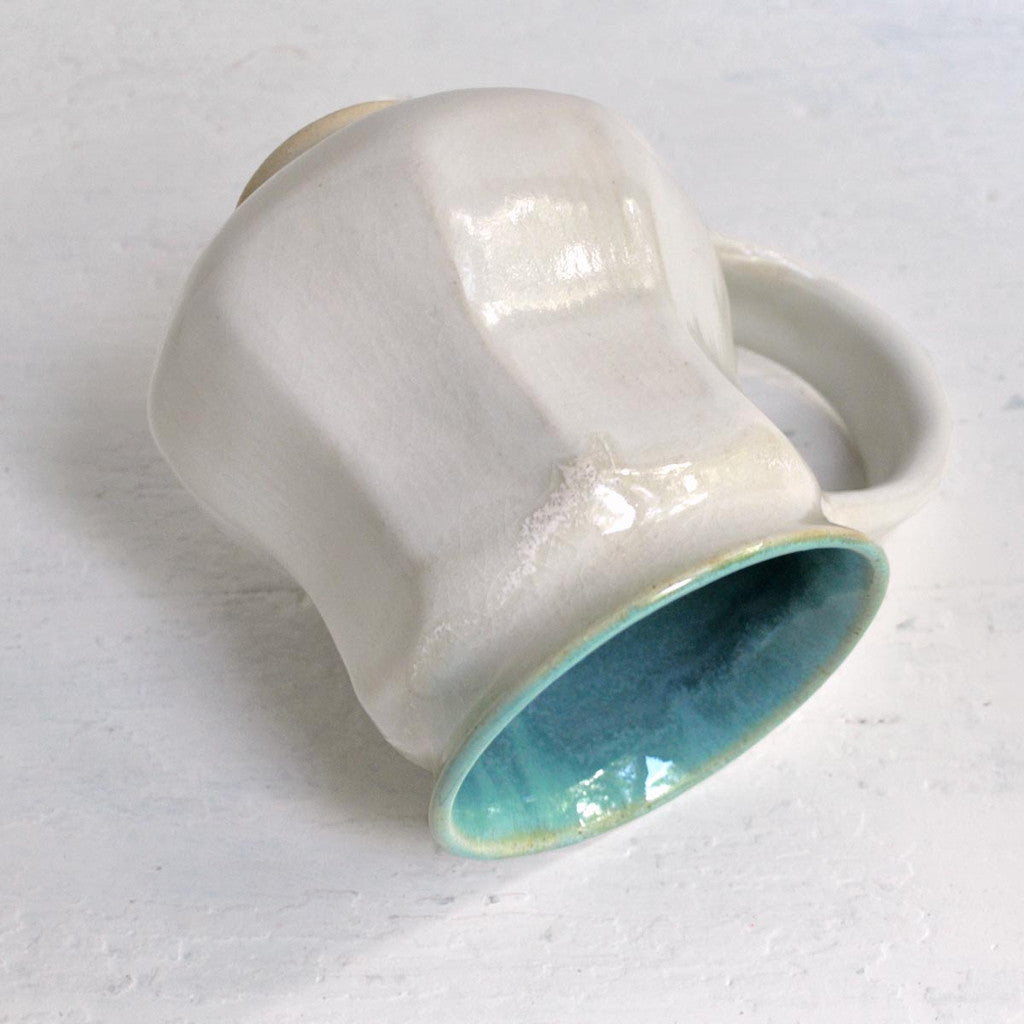 A white wheel thrown mug with faceted angles in an art deco shape. It has a large handle for a comfortable grip. The mug is 5" tall and holds 16 oz of your favorite brew.