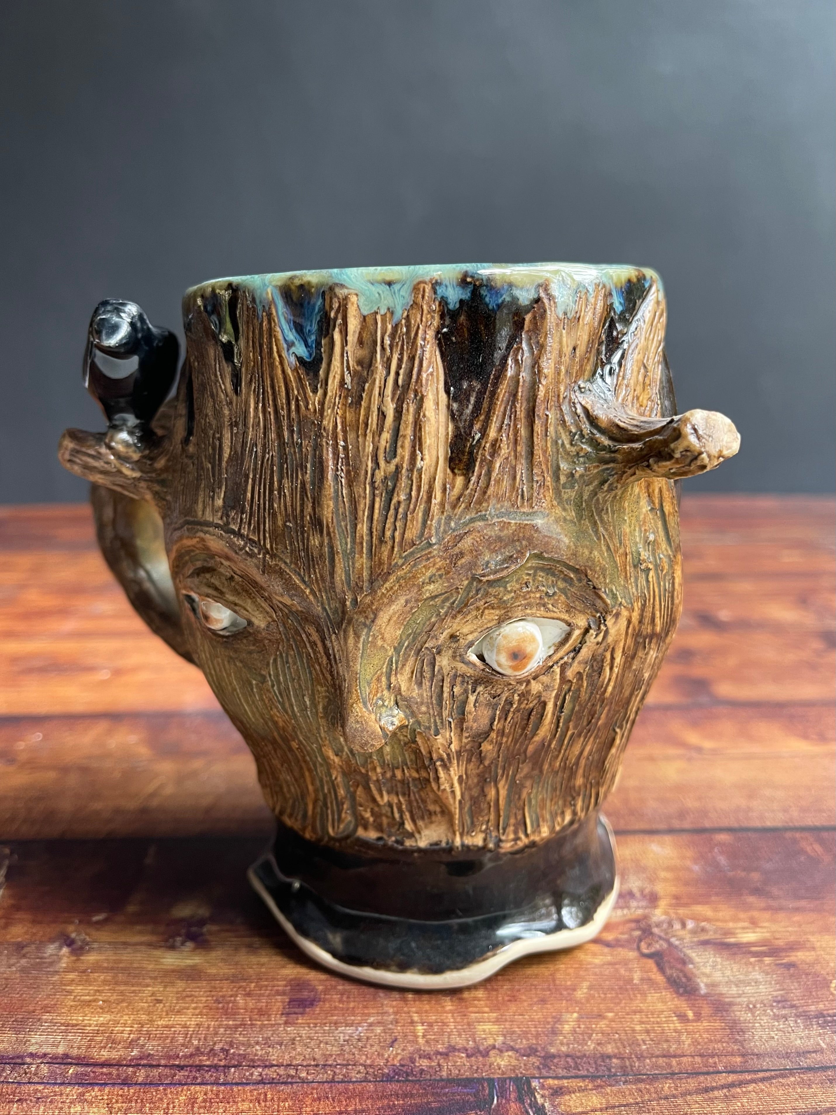 Wheel thrown and sculpted mug with tree wInness and raven.