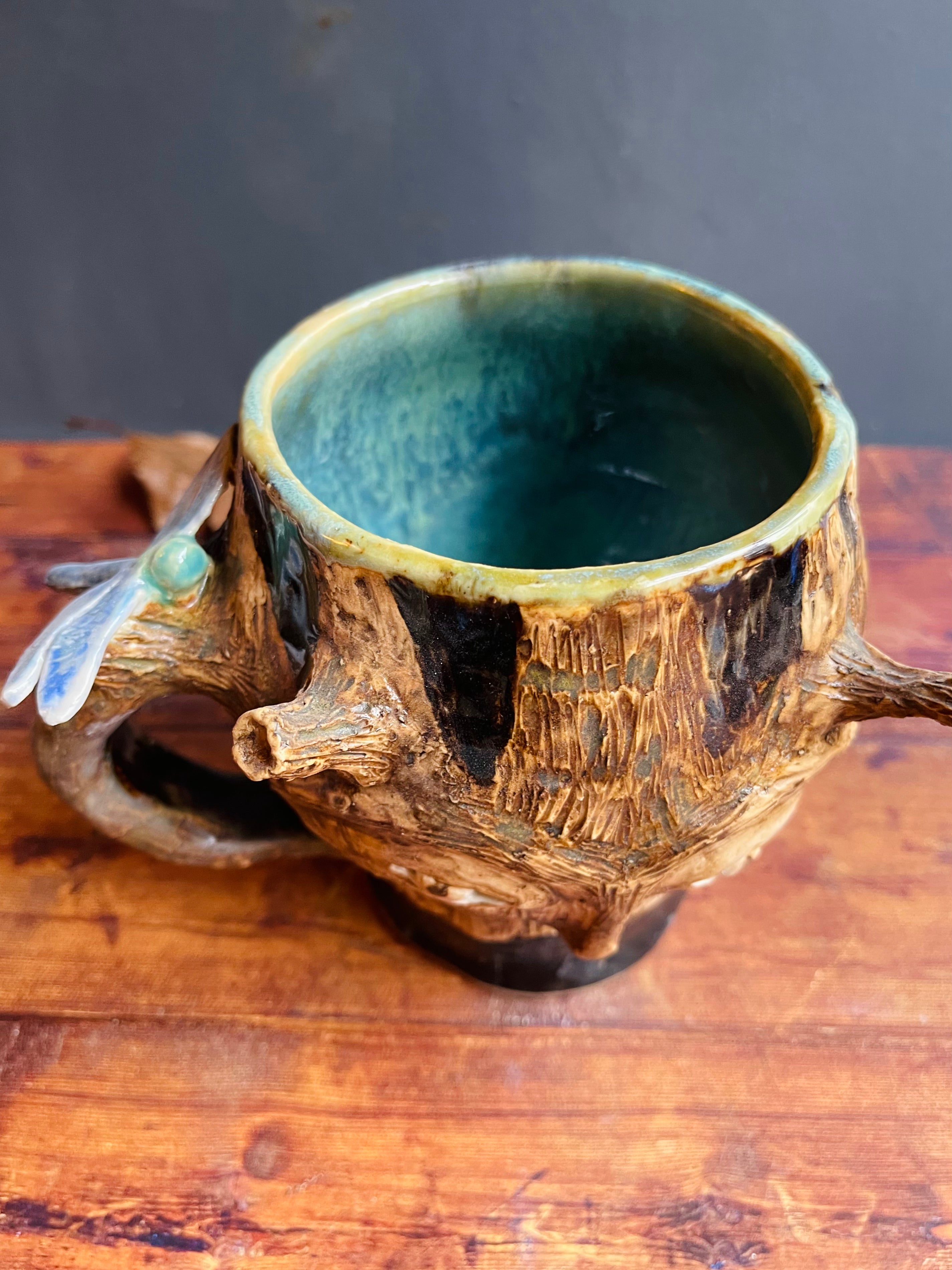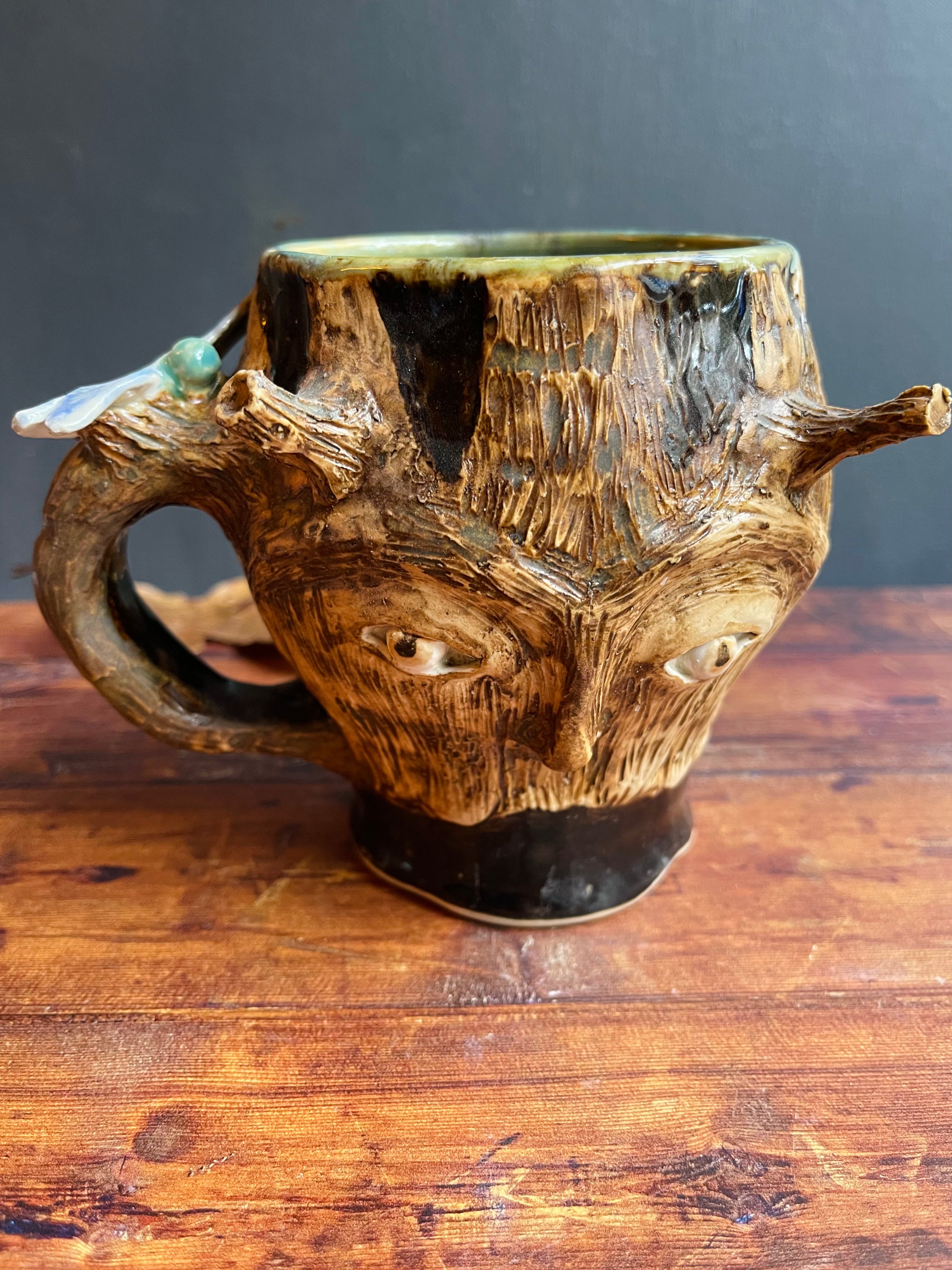 Wheel thrown and sculpted mug with tree wInness and dragonfly.