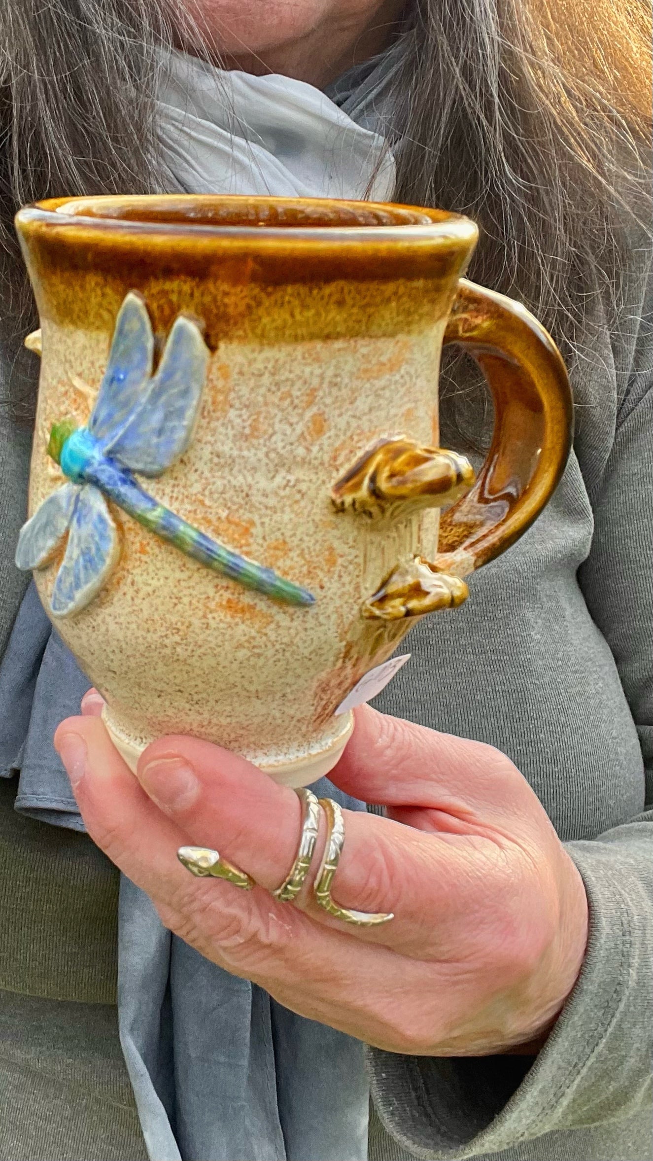 Mug with detailed dragonfly and assorted mushrooms prototype