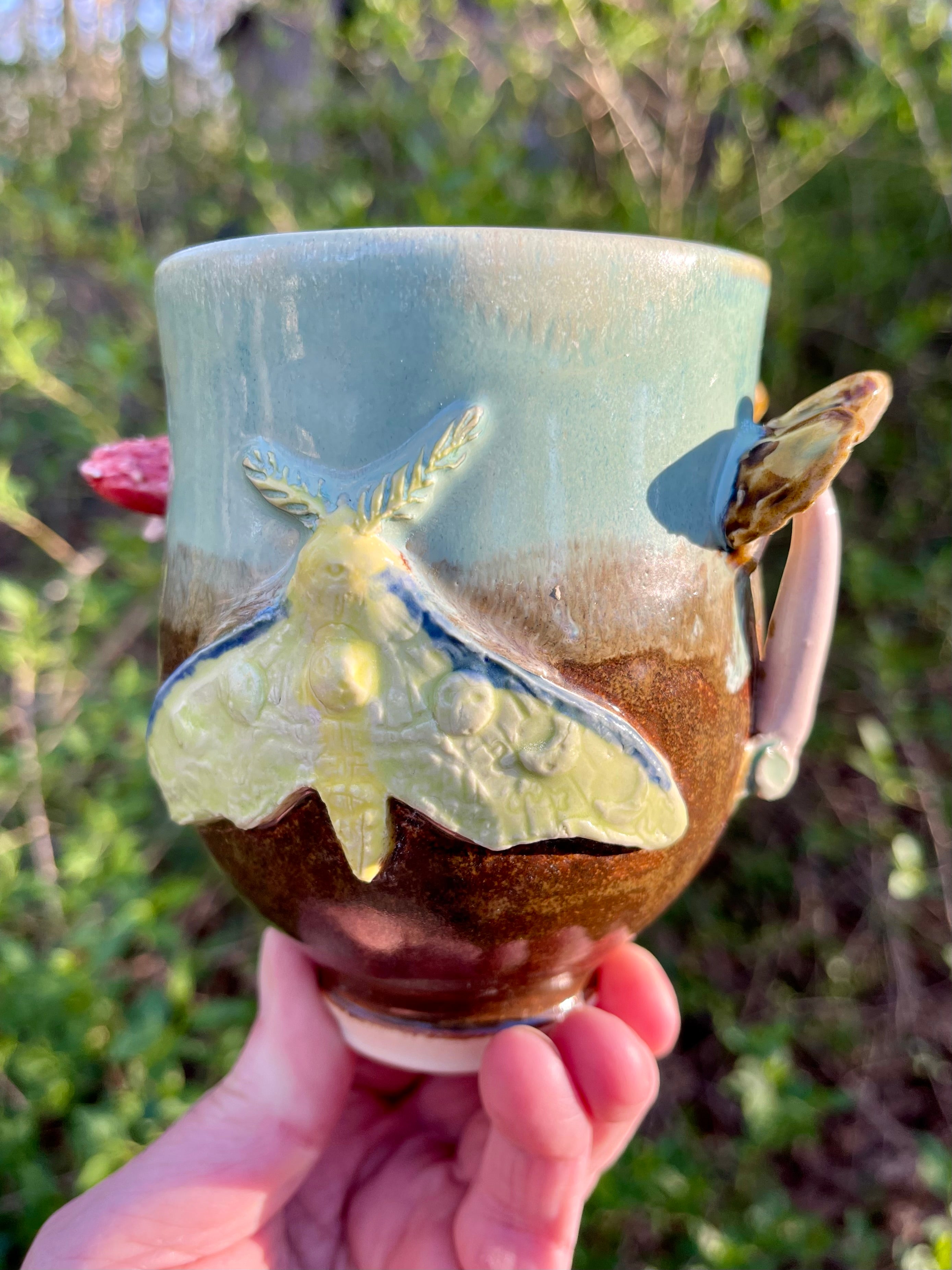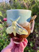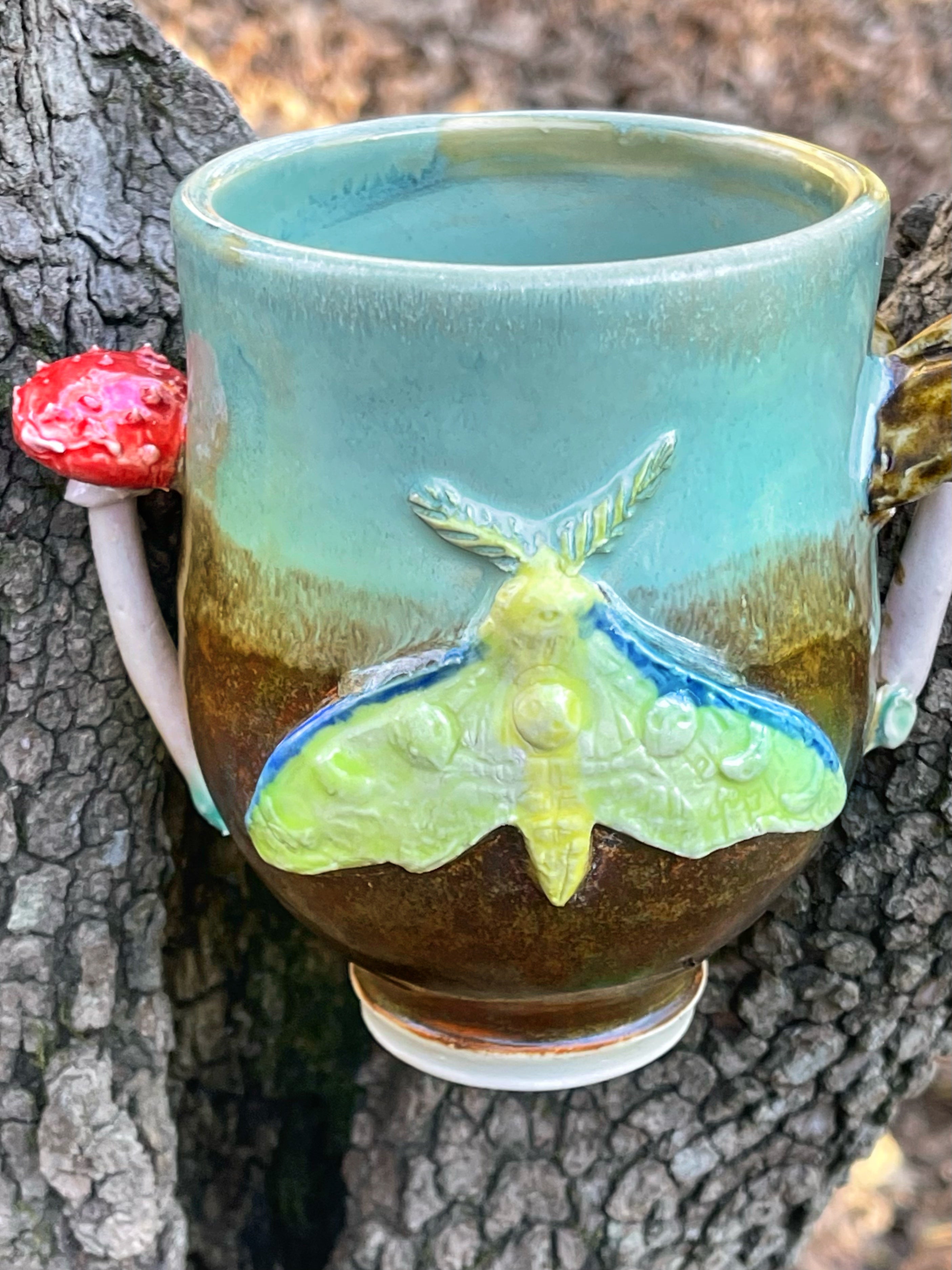 Mug with luna moth and mushrooms clusters. Very soft glazing with so many details!
