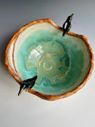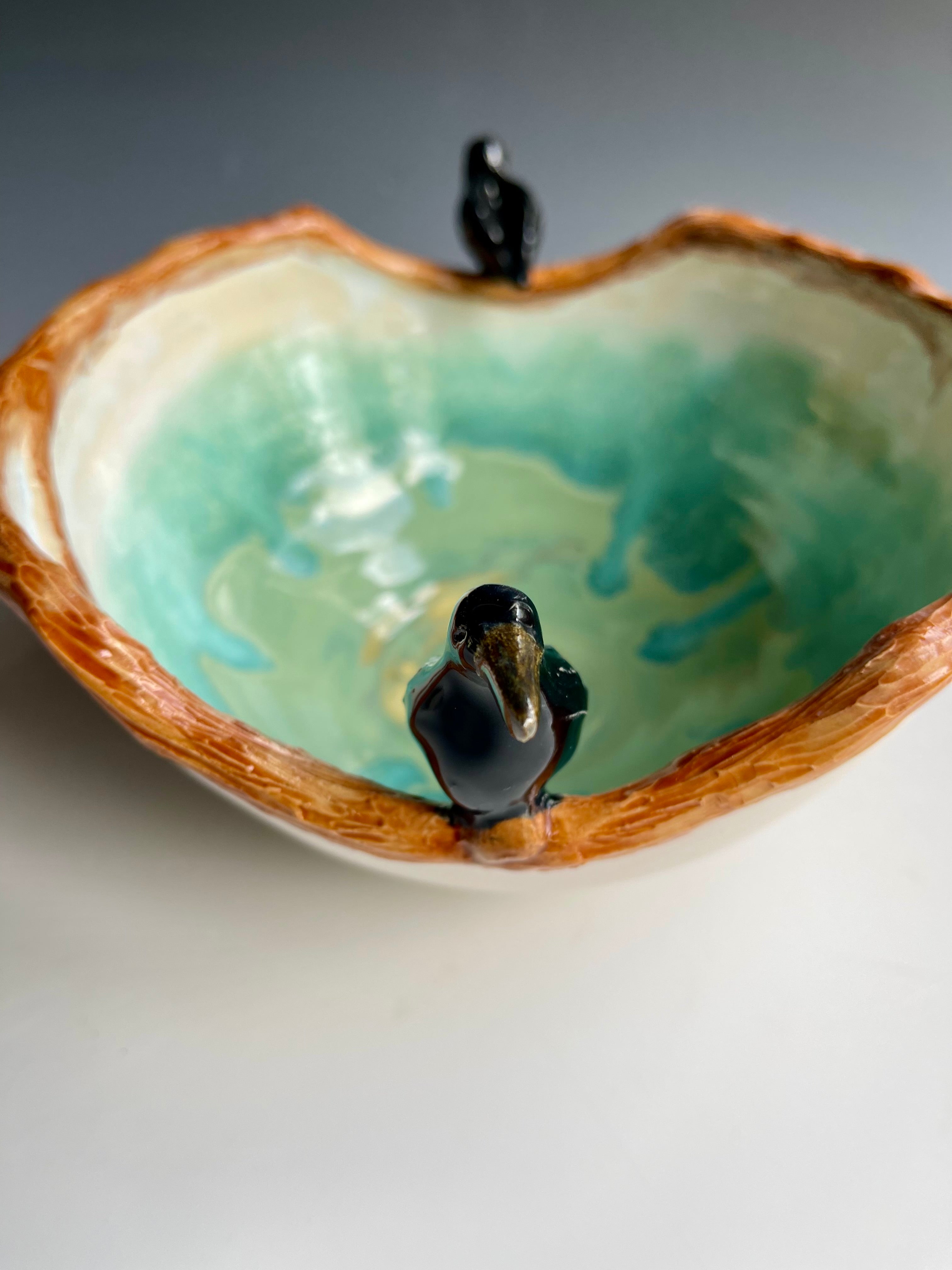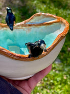 Textured tree branch rimmed bowl with 2 ravens glazed in flowing microcrystalline glazes inside. These ravens are very alive!