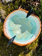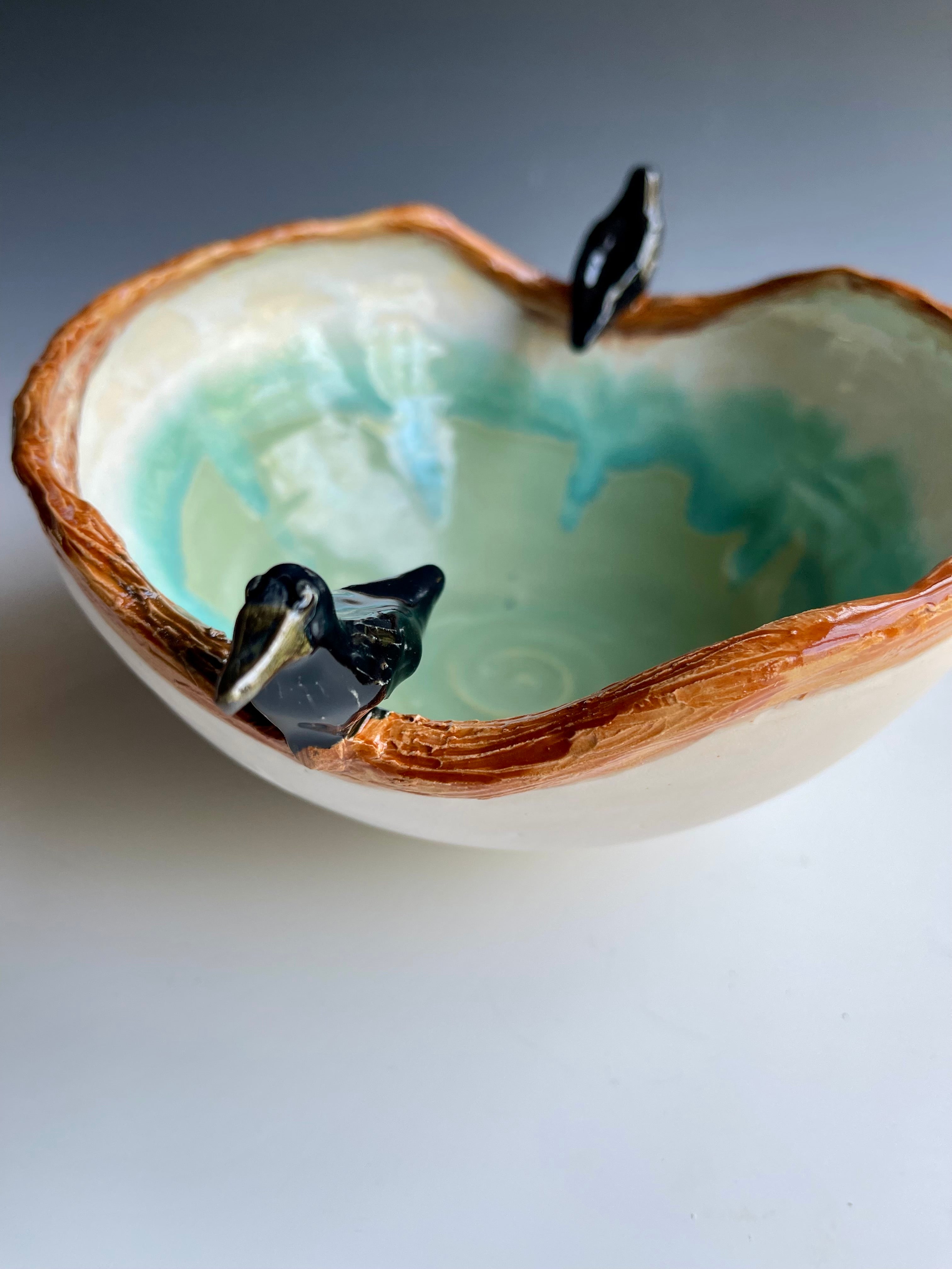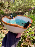 Textured tree branch rimmed bowl with 2 ravens glazed in flowing microcrystalline glazes inside. These ravens are very alive!