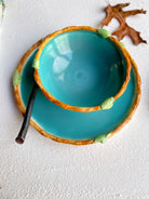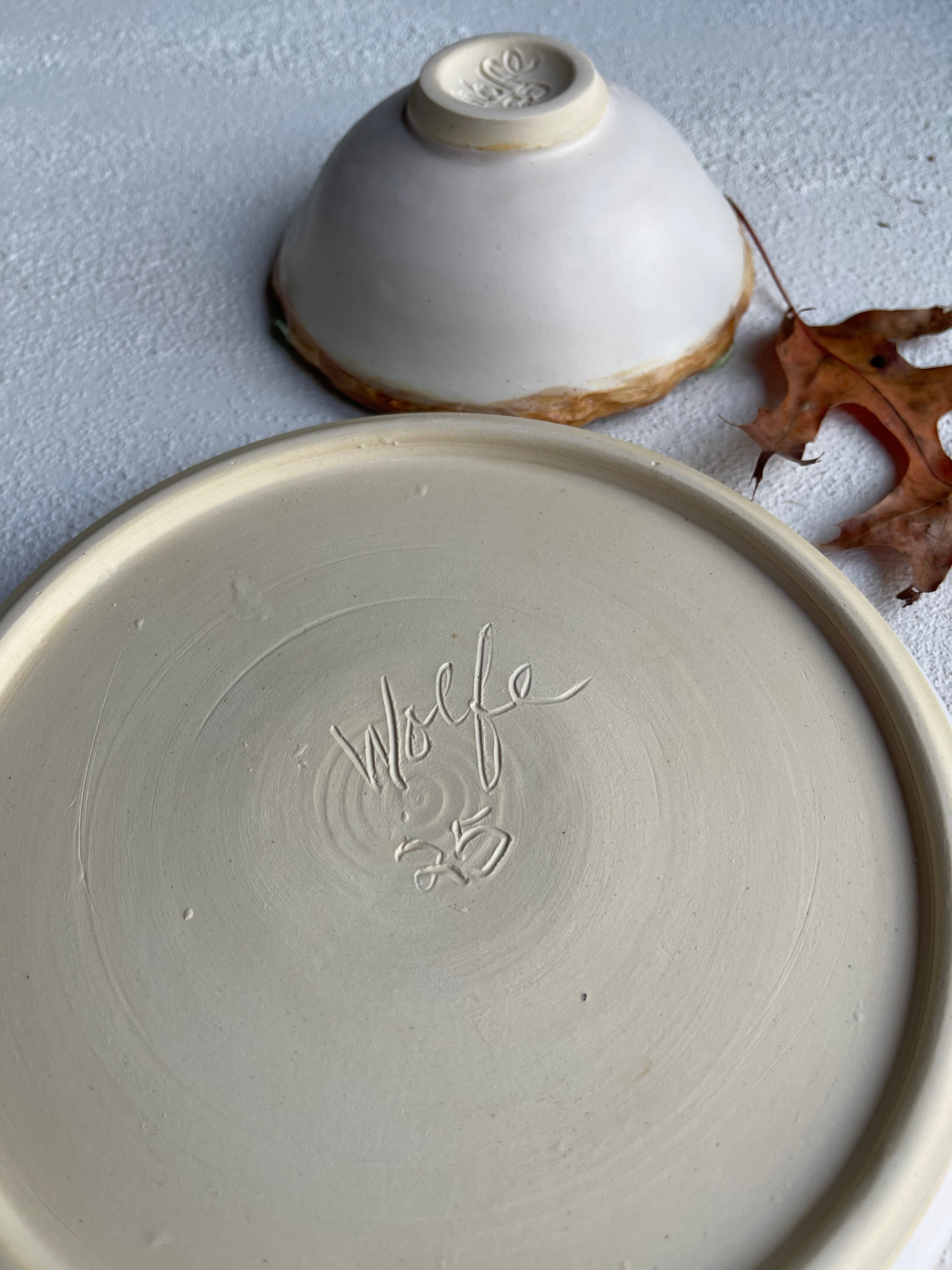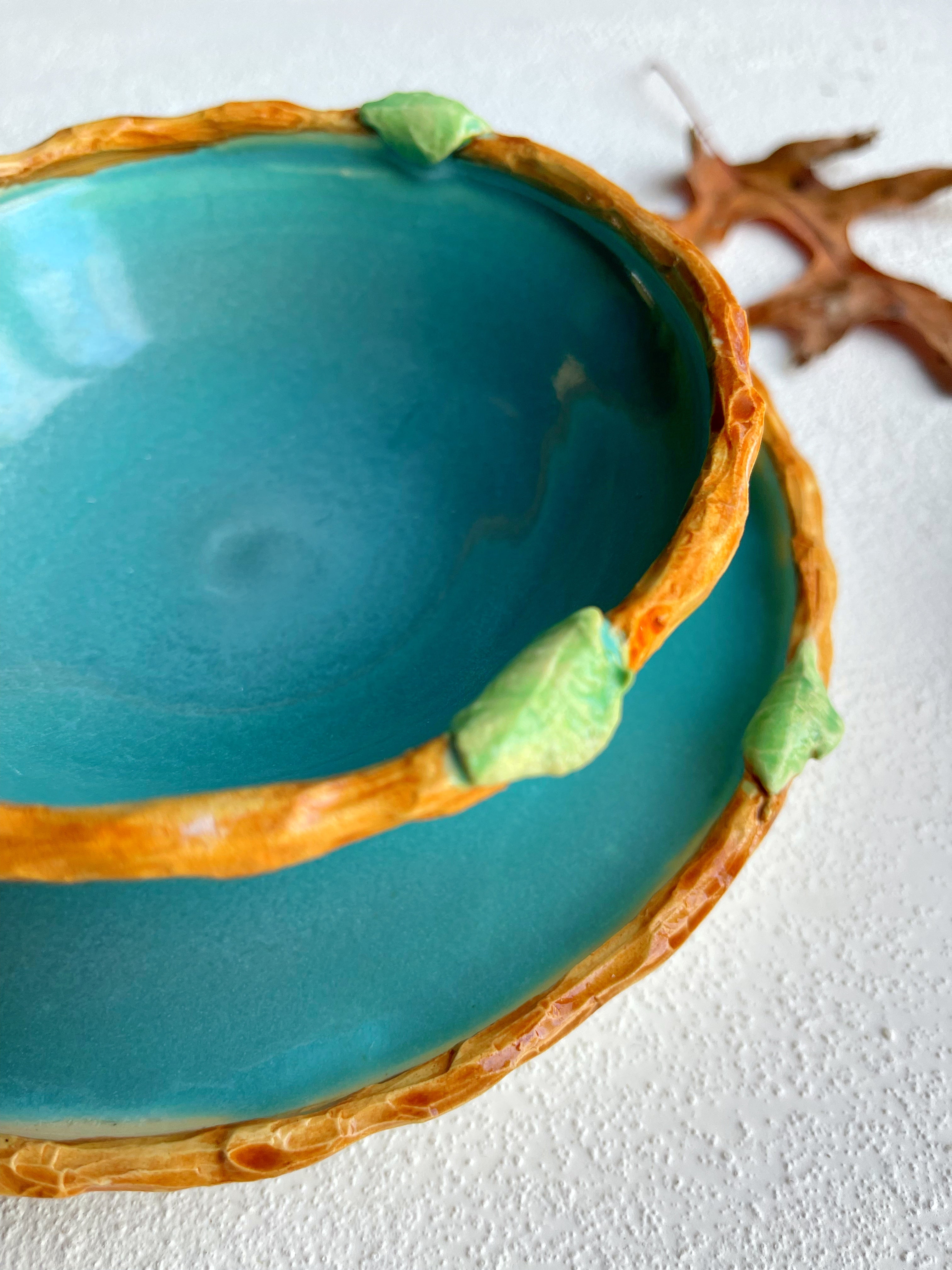 Wheel thrown plate and bowl with tree branch rims