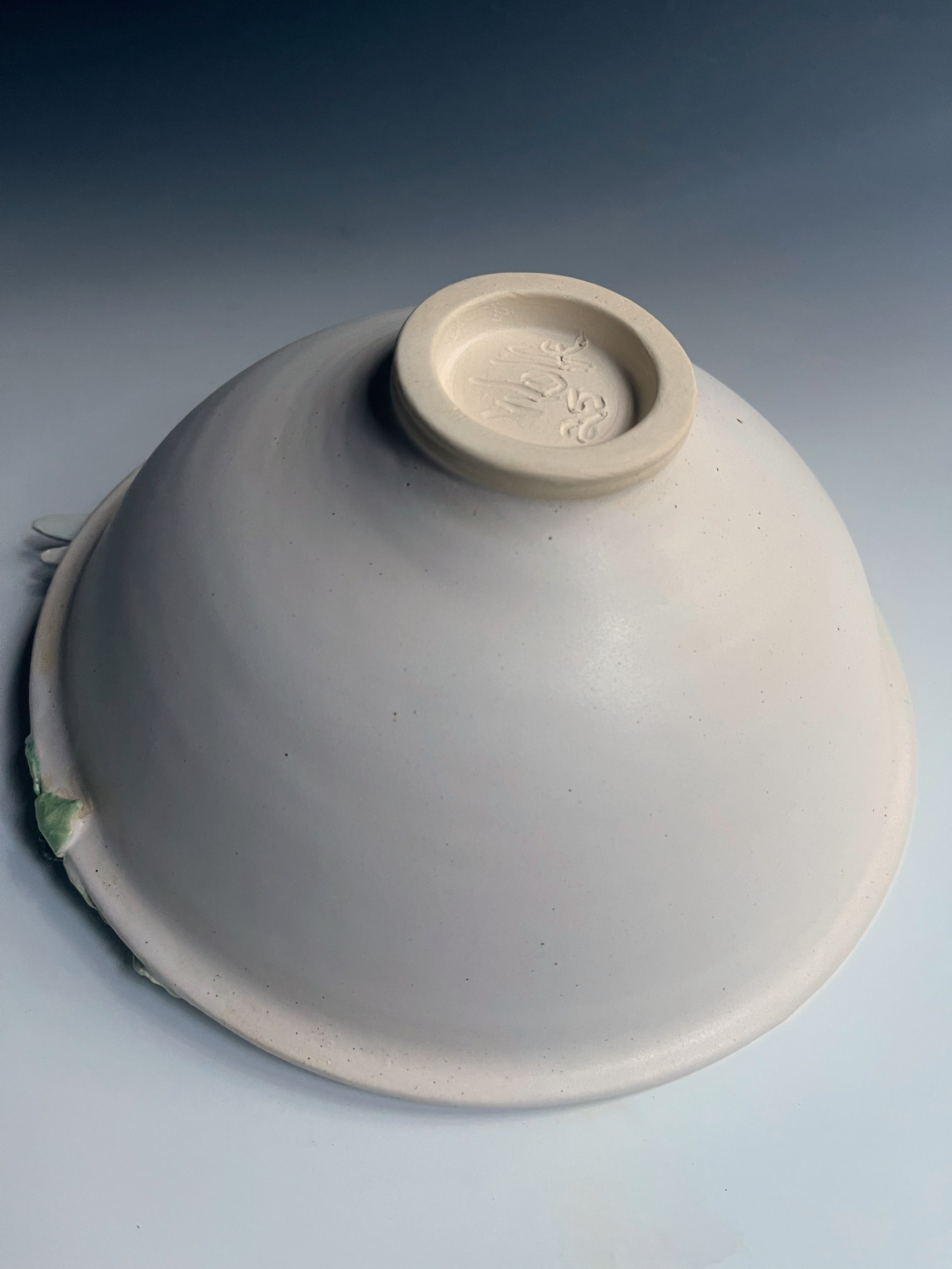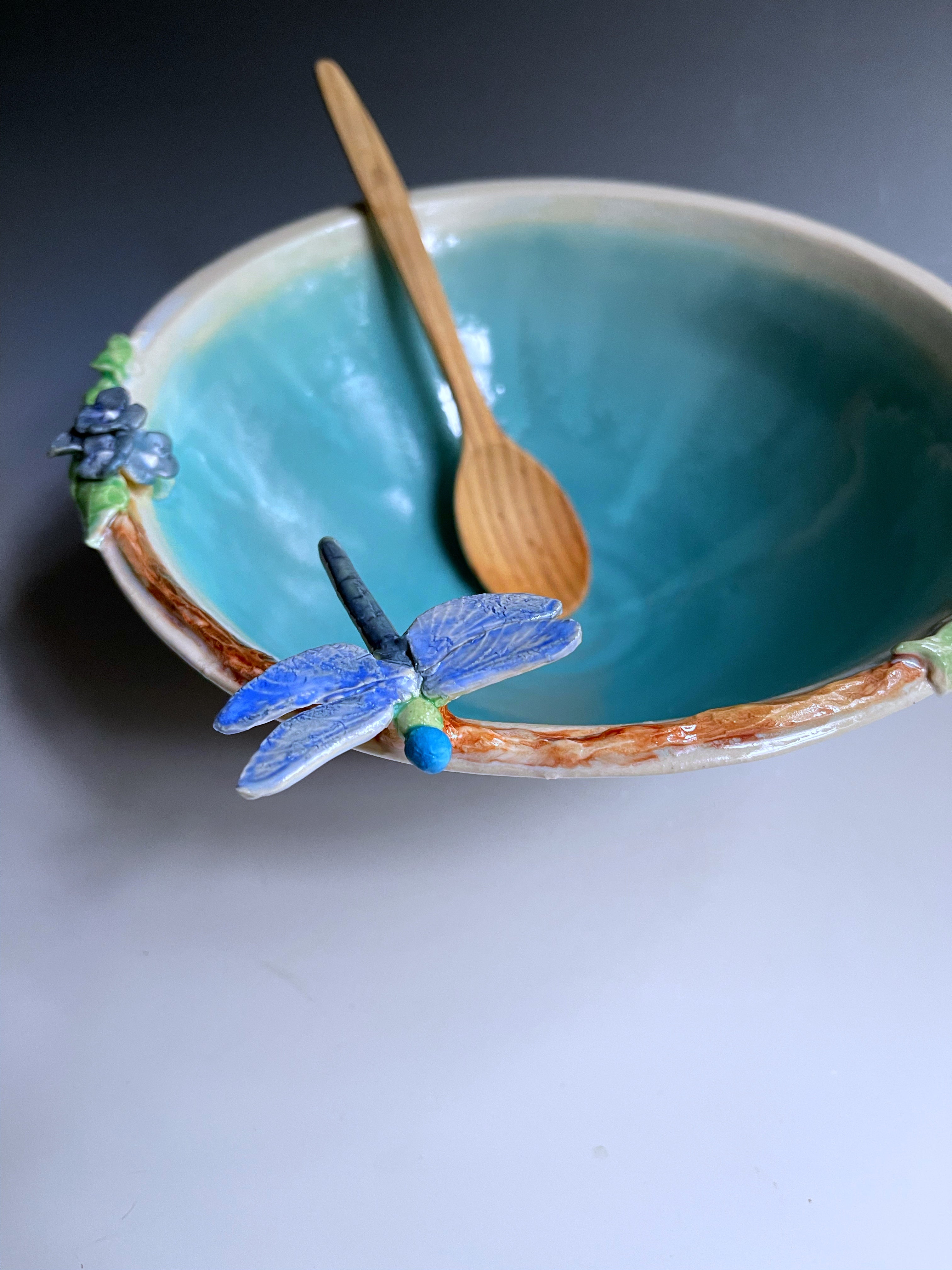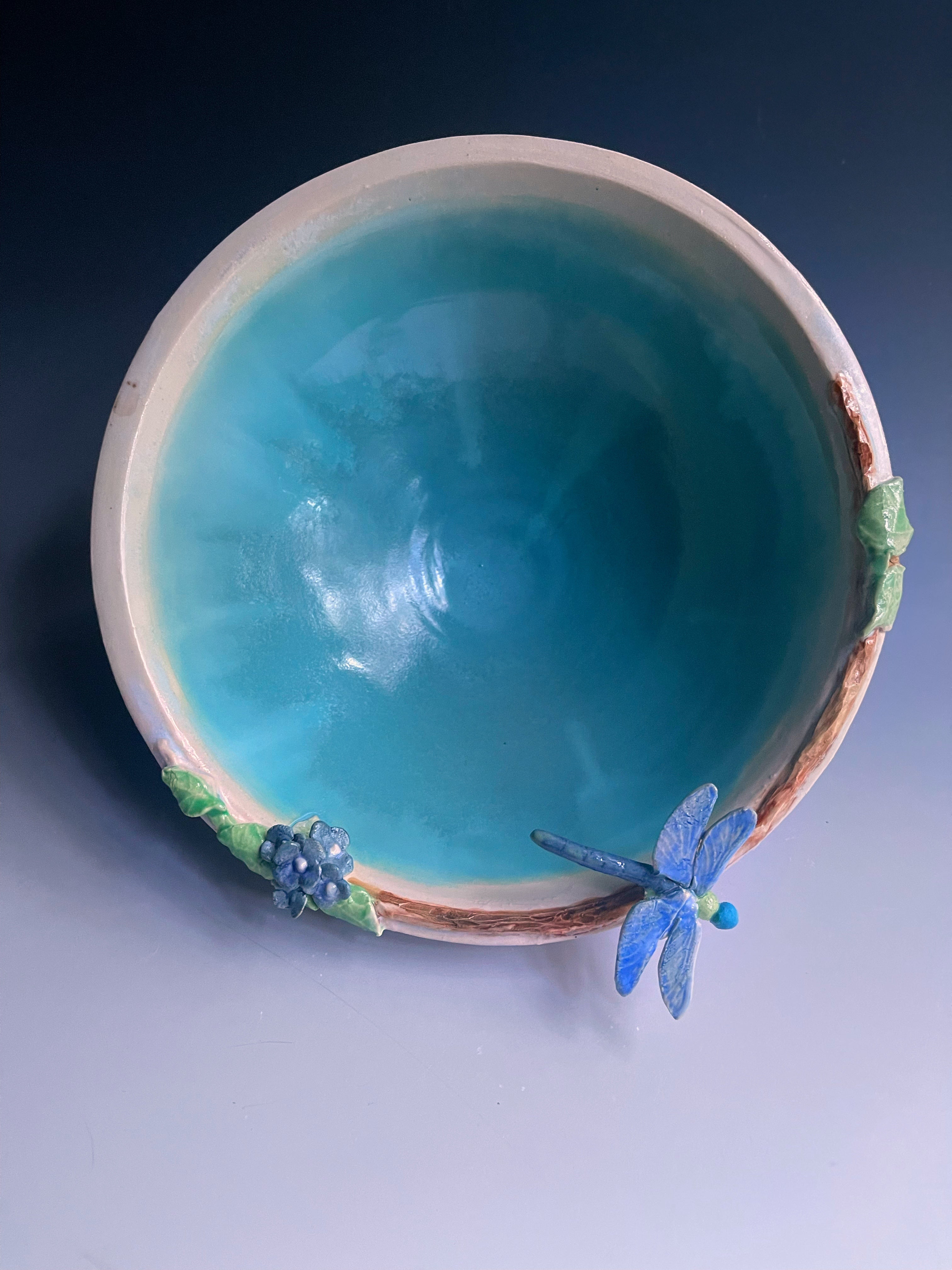 Textured tree branch rimmed bowl with a dragonfly and hydrangea blooms on the rim glazed in microcrystalline glazes inside.