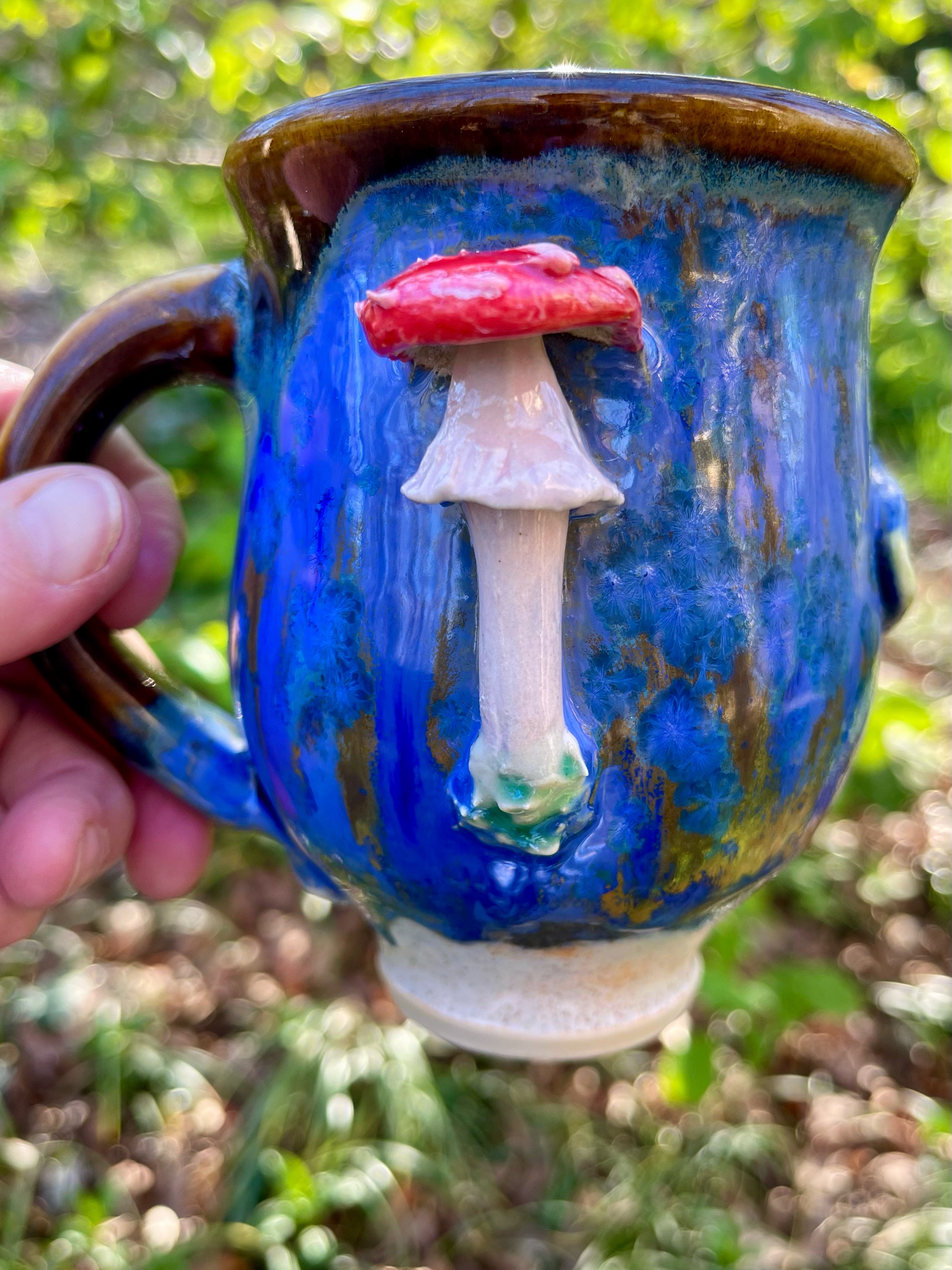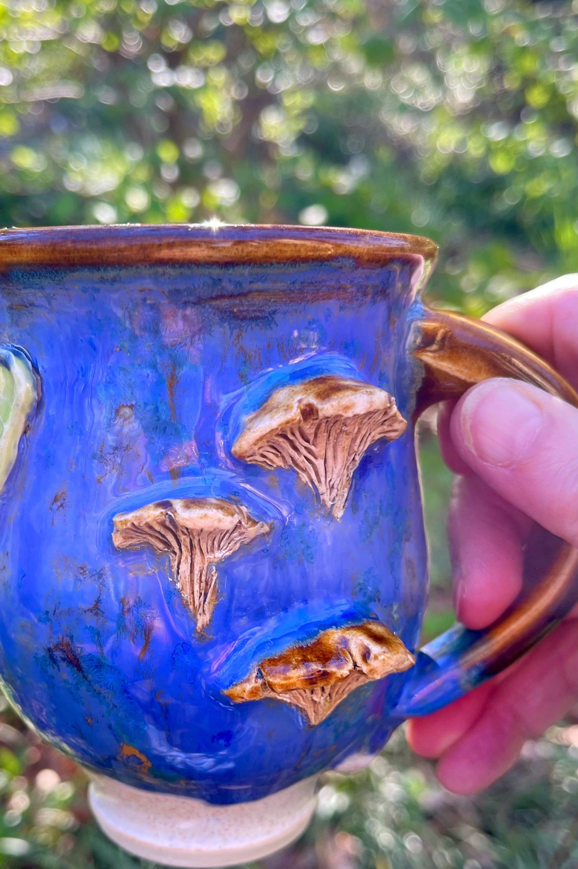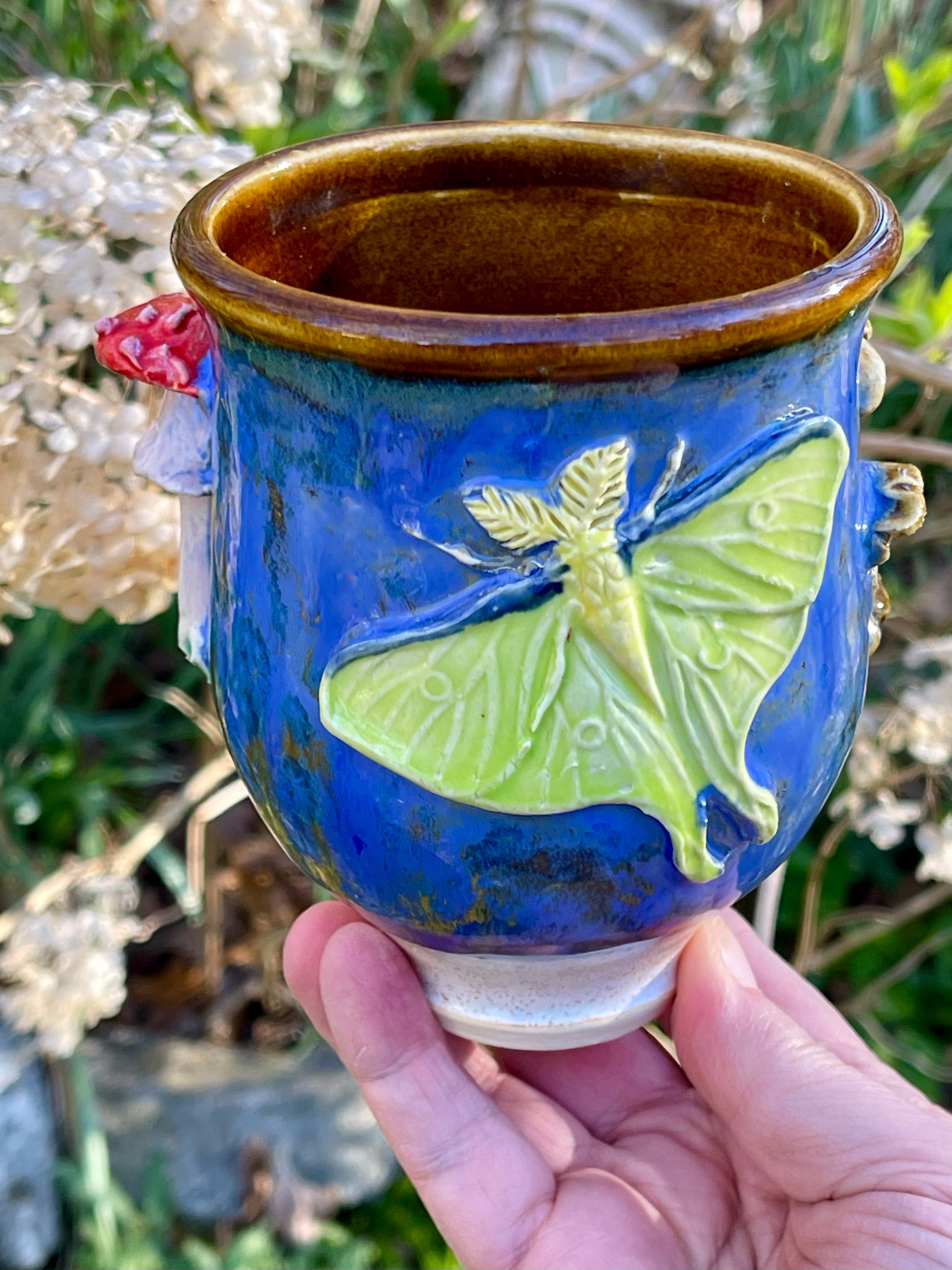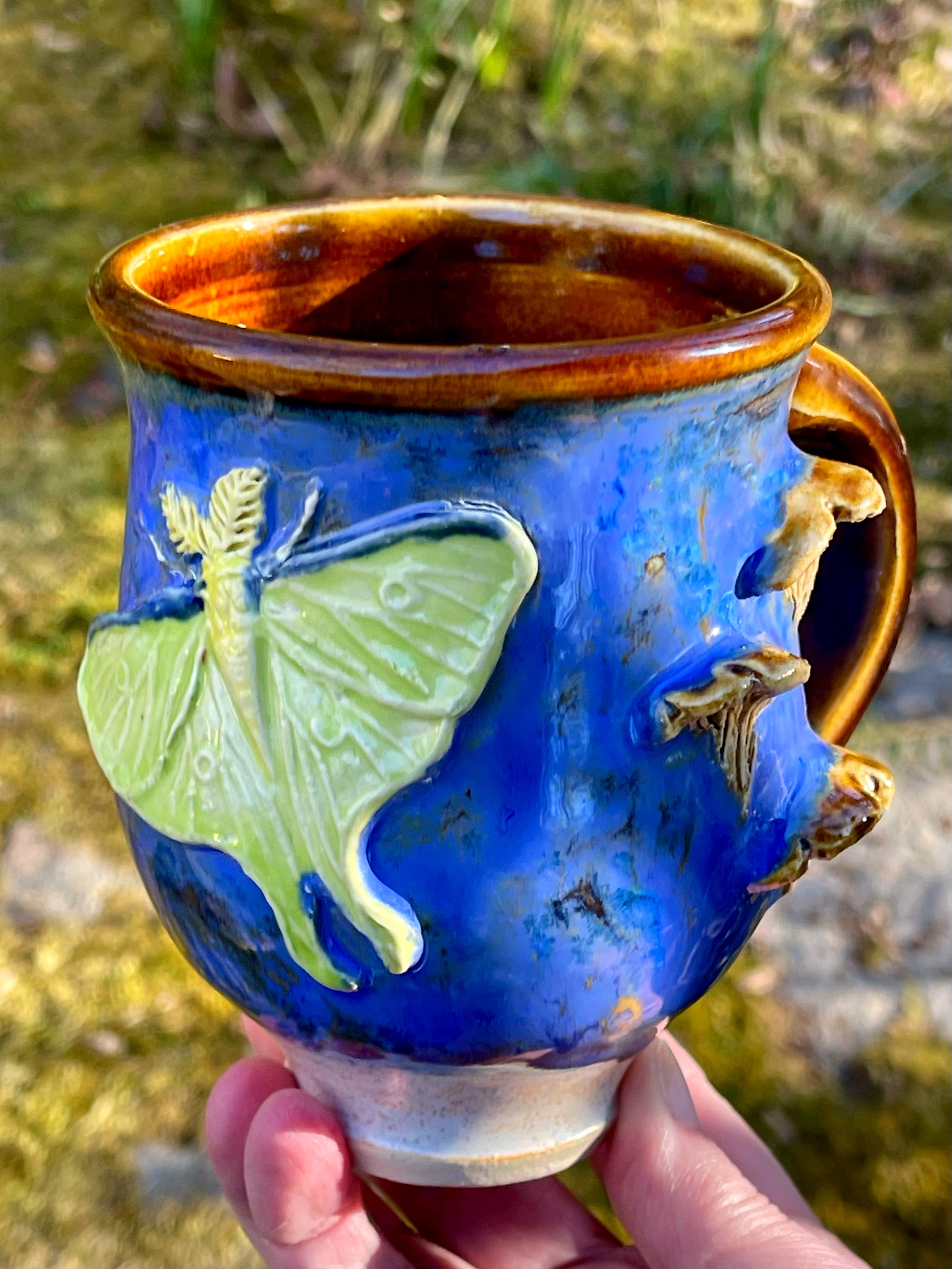 Mug with luna moth and l mushrooms clusters. Very beautiful glazing!