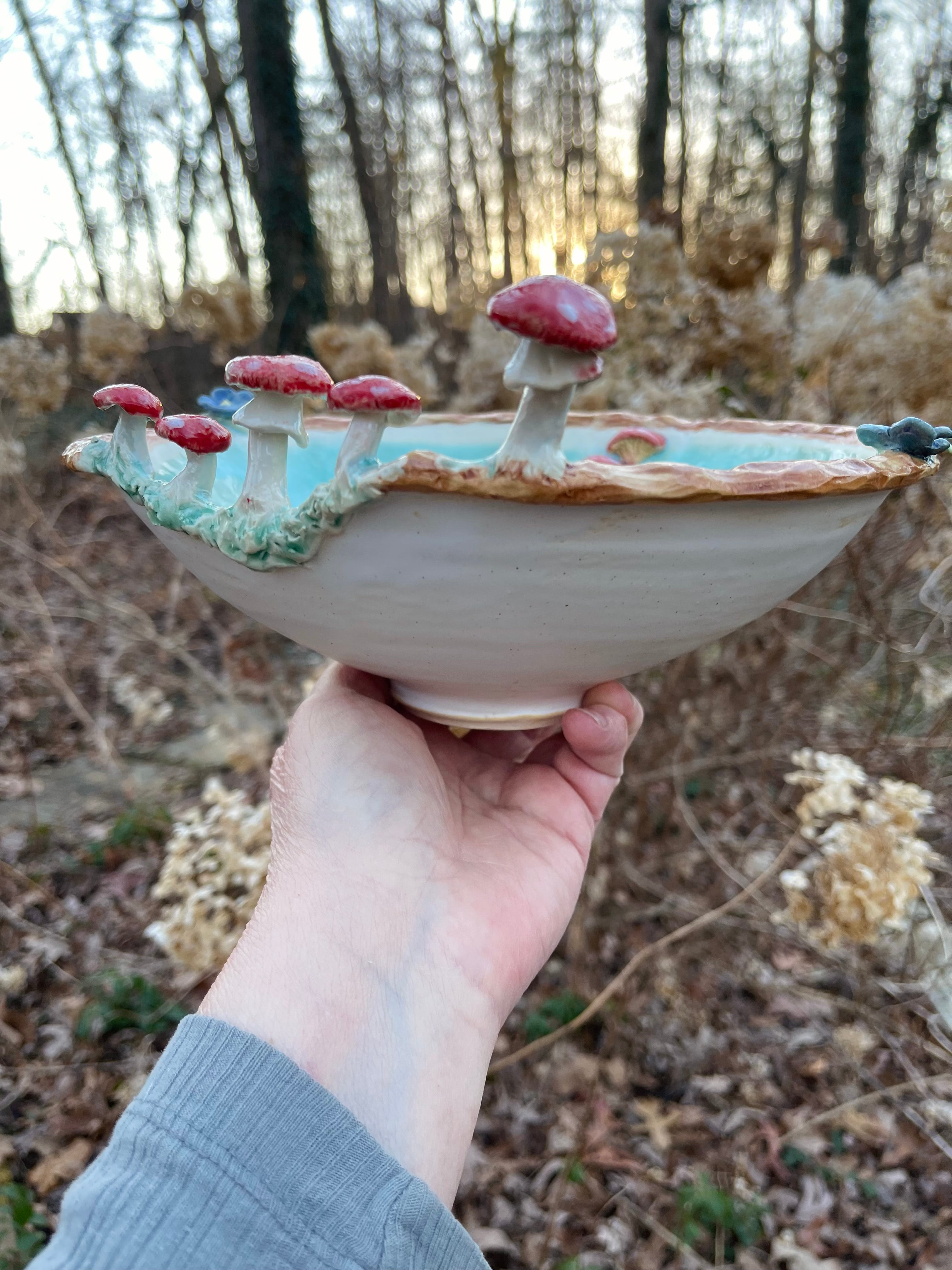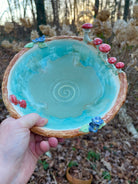 Textured tree branch rimmed bowl with mushrooms, moss and hydrangea blooms on the rim glazed in microcrystalline glazes inside.