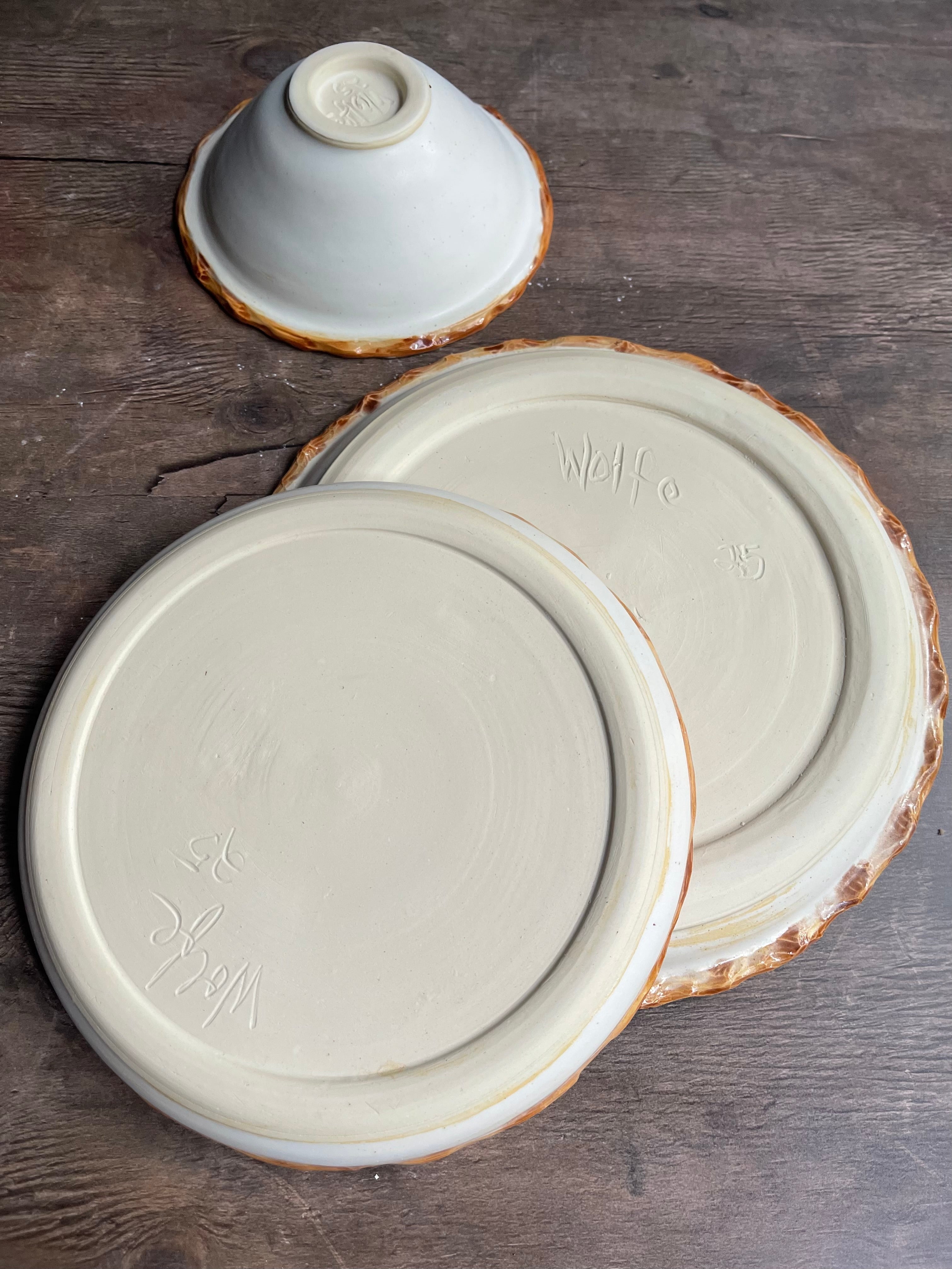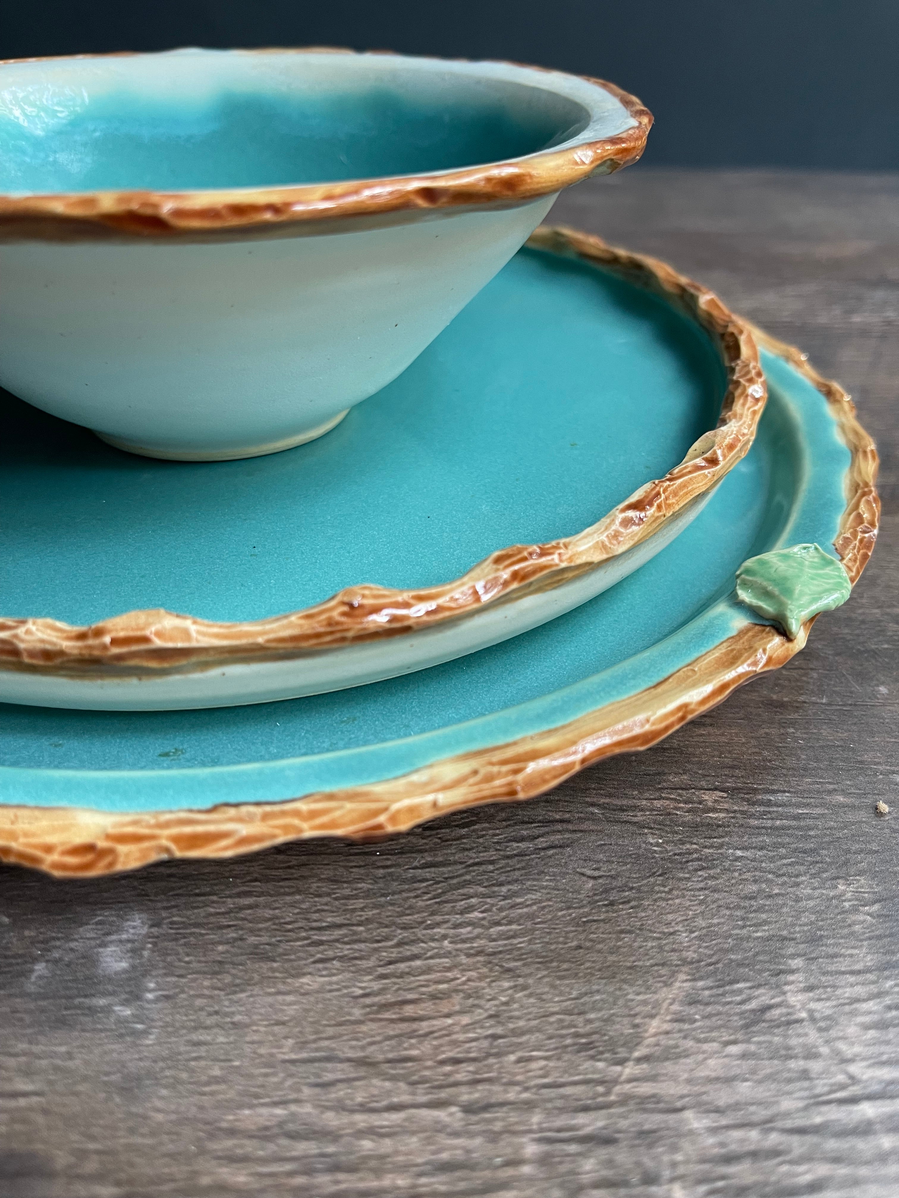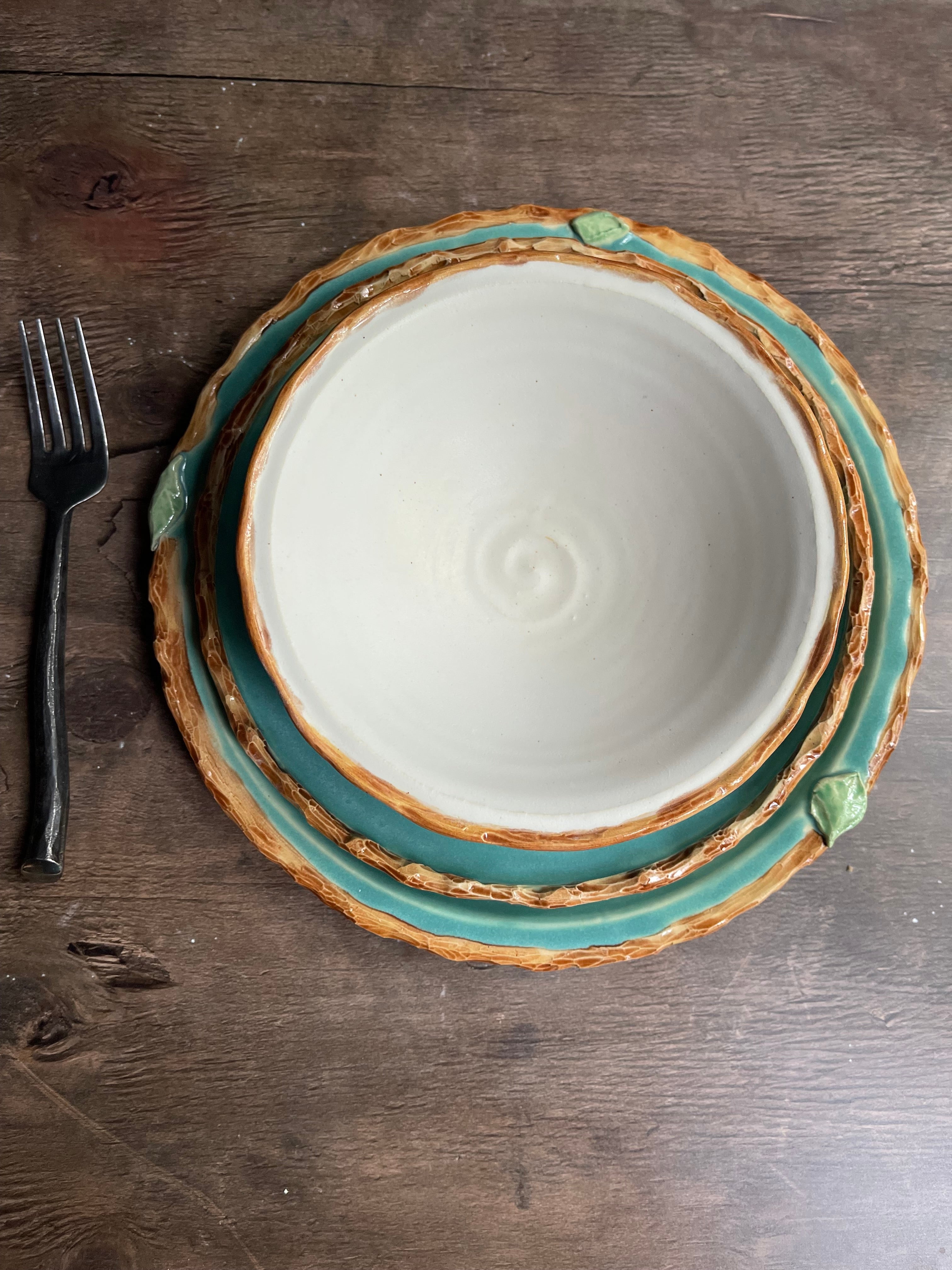 Set is thrown on a wheel and trimmed with a foot rim. The tree bark rim is hand carved with small sculpted leaves. You can choose the bowl you like best!