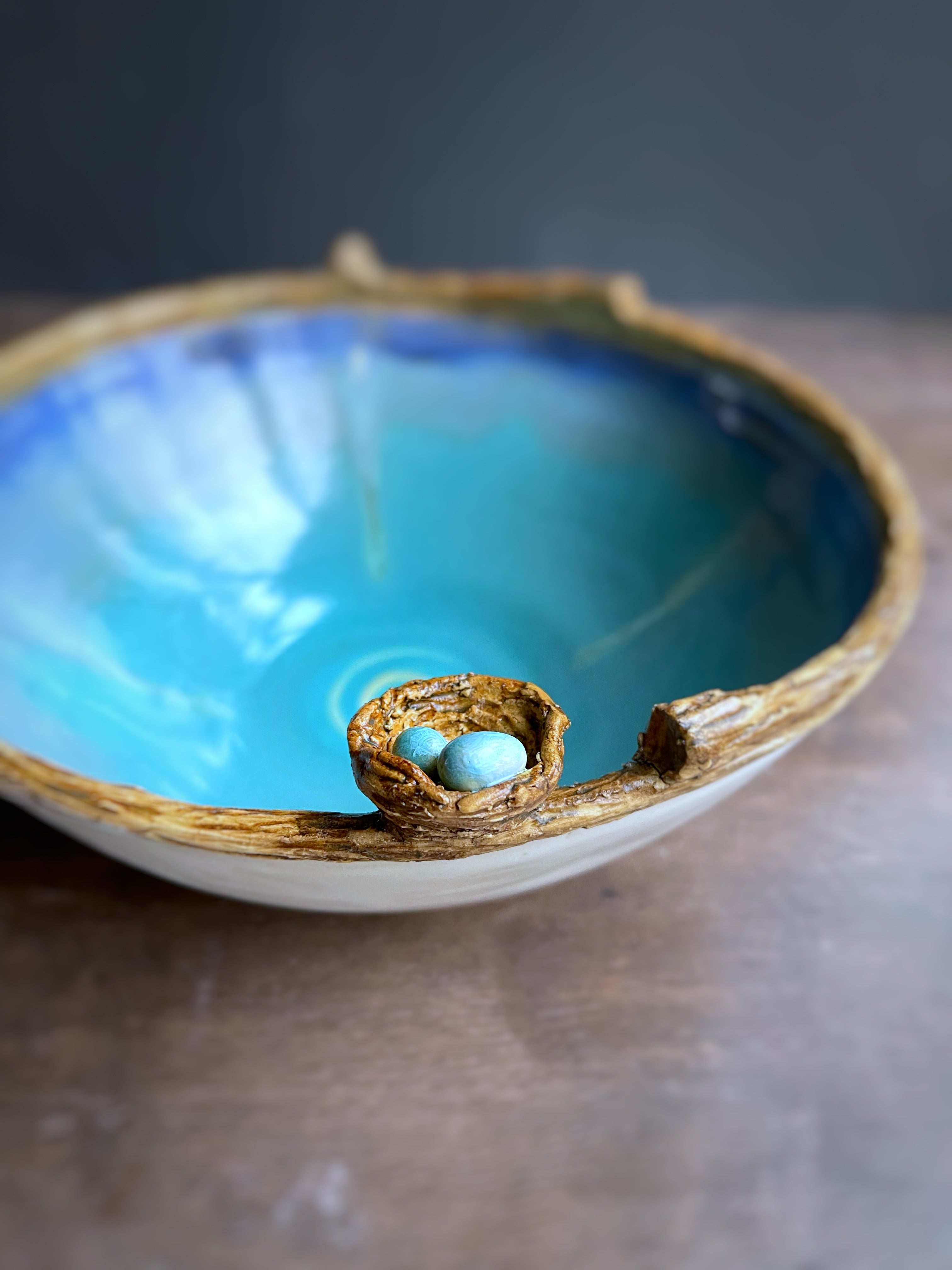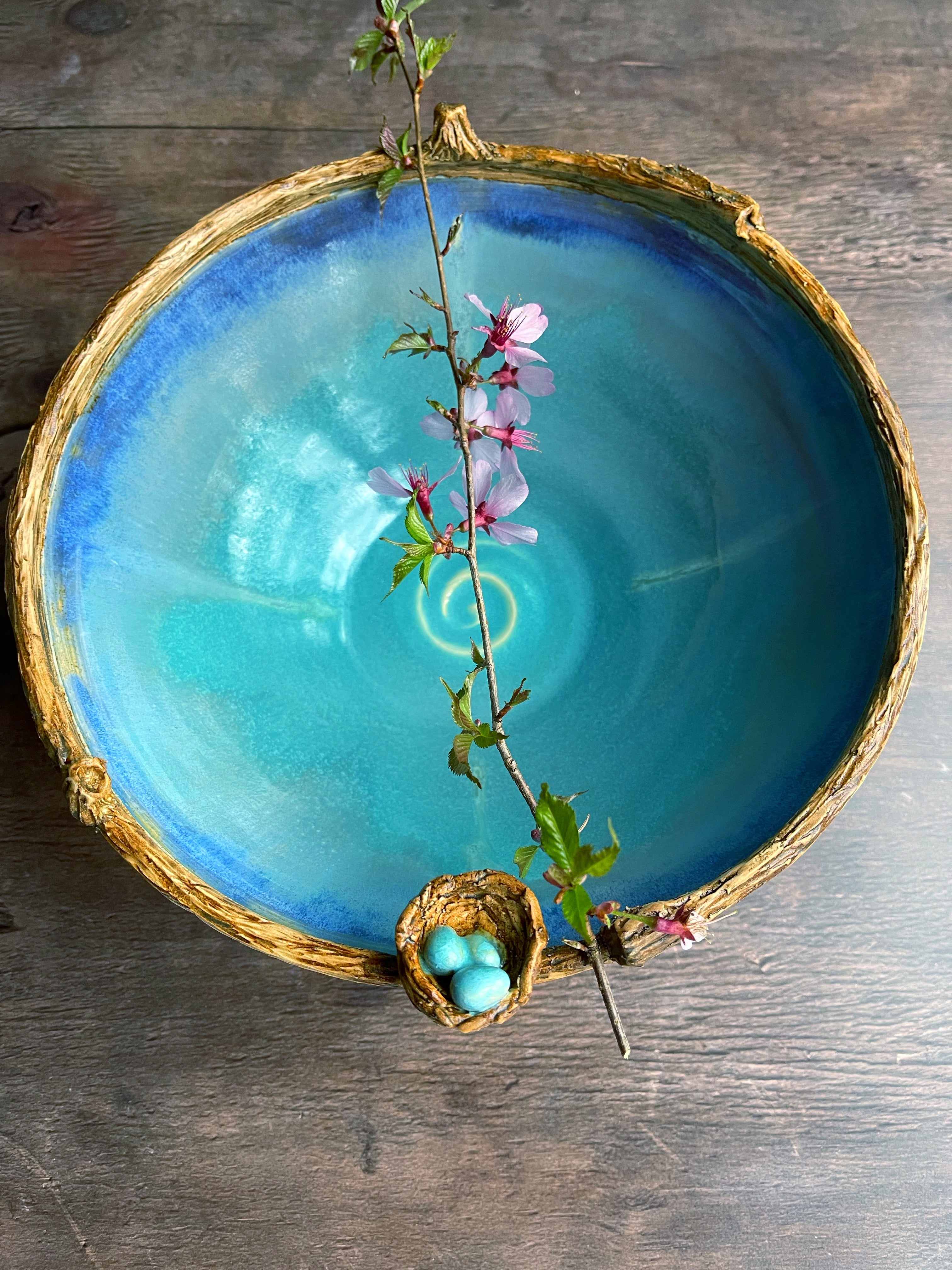Textured tree branch rimmed bowl with tiny birds nest glazed in multicolor glazes inside.