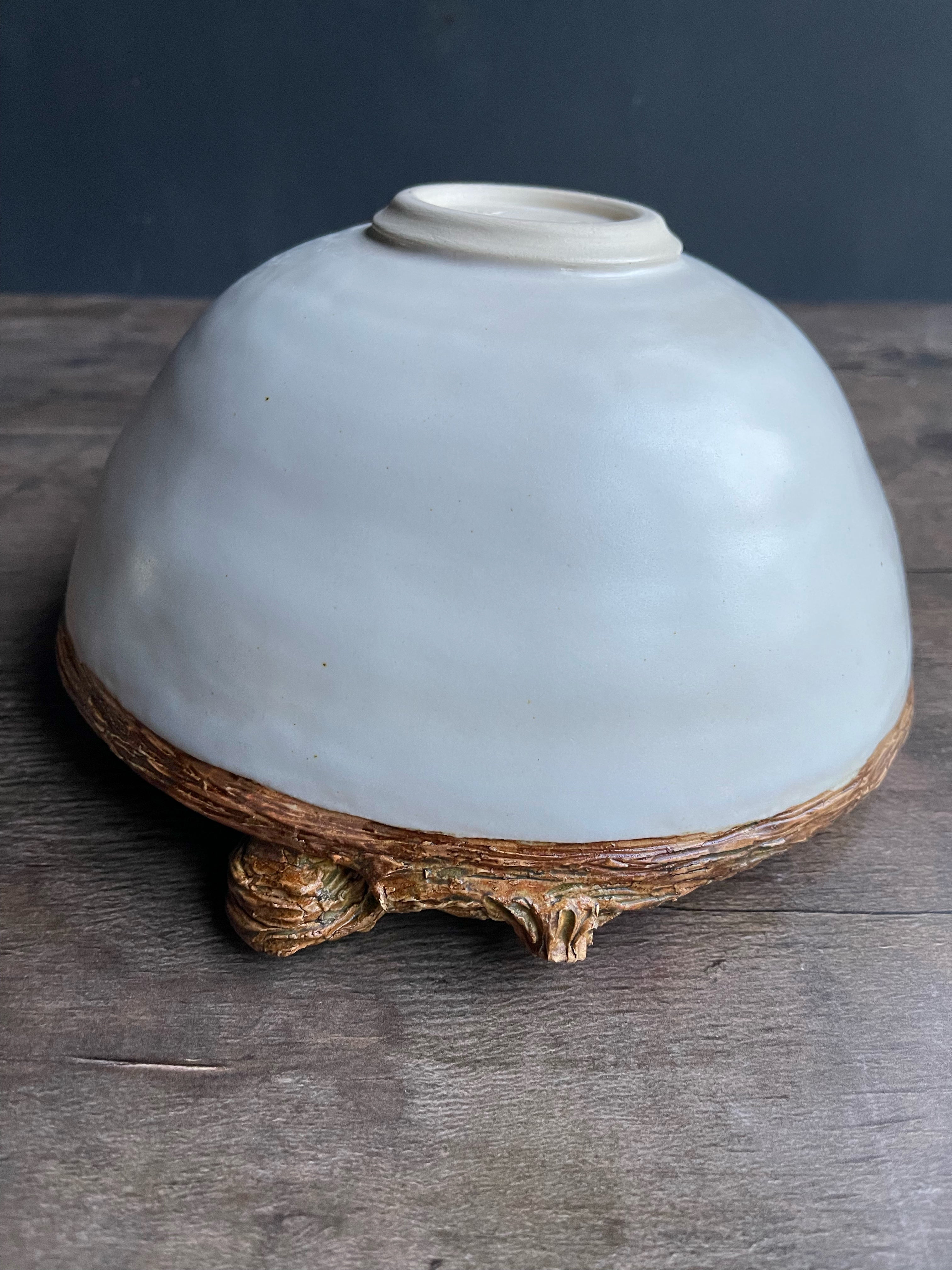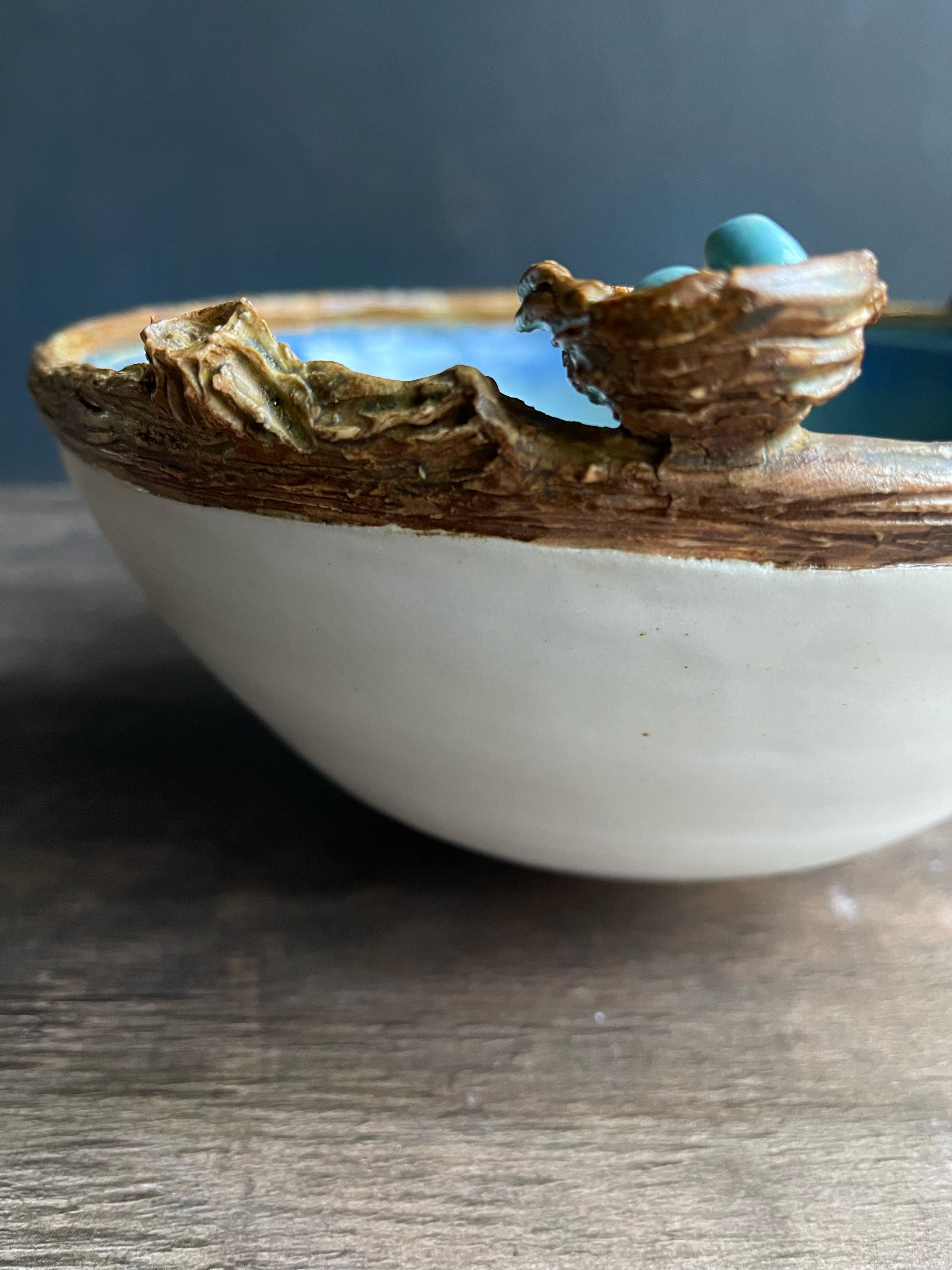 Textured tree branch rimmed bowl with tiny birds nest glazed in multicolor glazes inside.