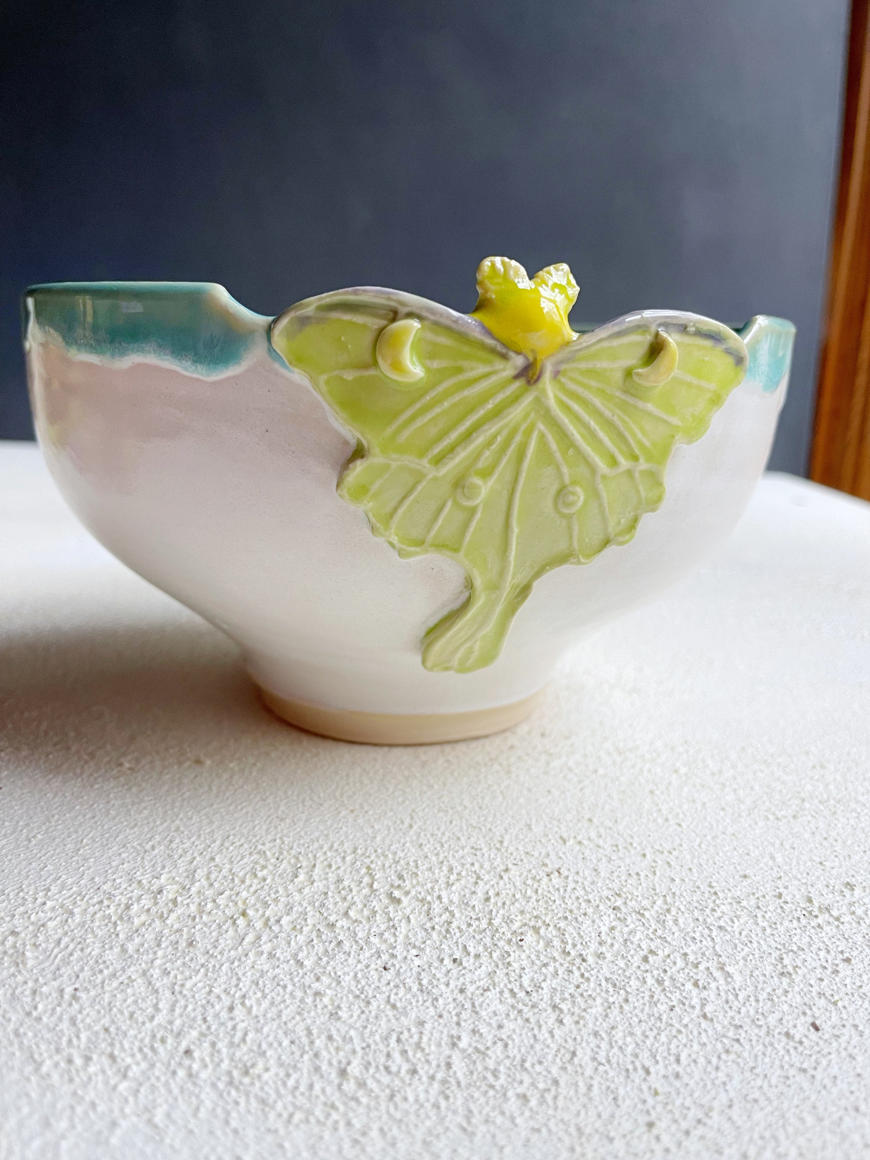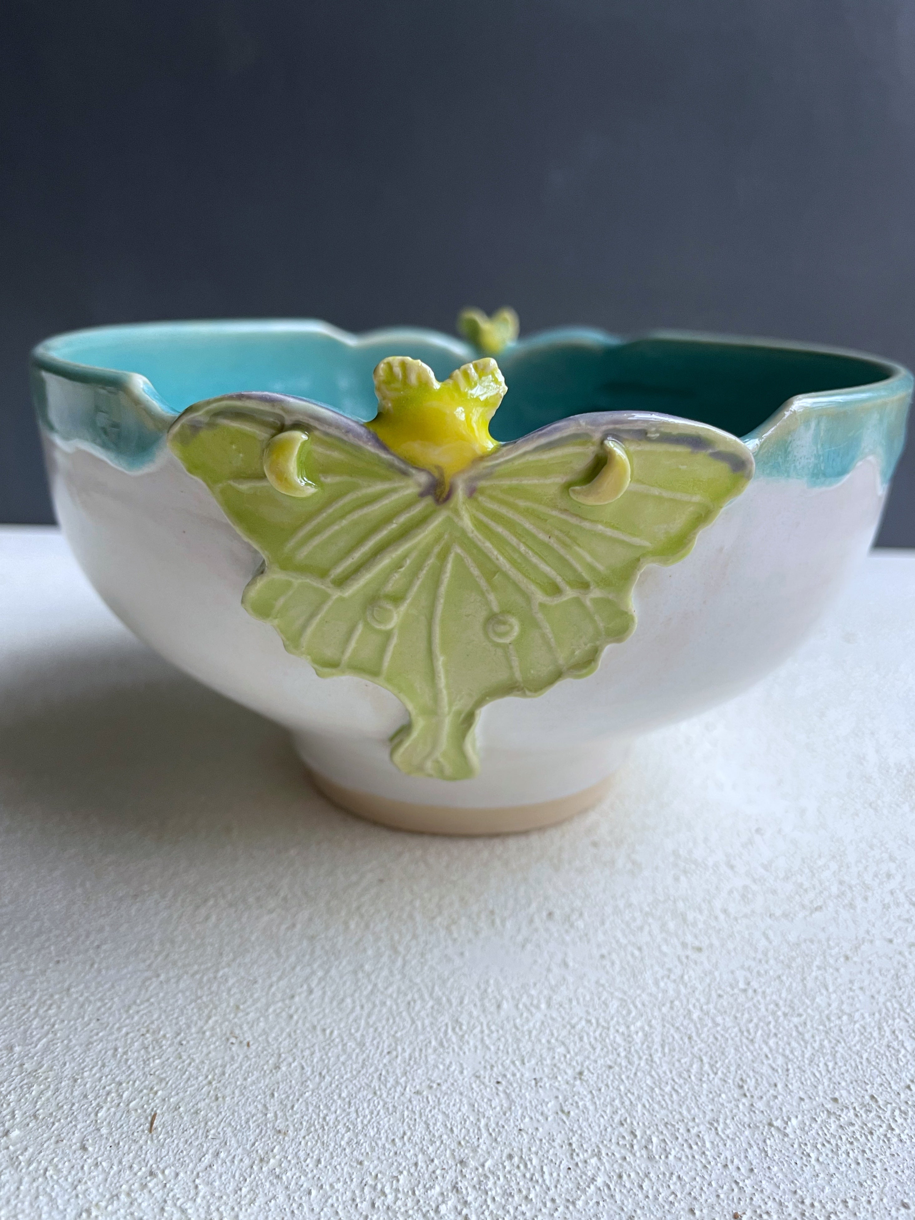 A carved bowl thrown on a wheel with 2 luna moth sculptures on opposing sides. Very elaborate sculpting and glaze work. This makes a charming serving bowl or centerpiece