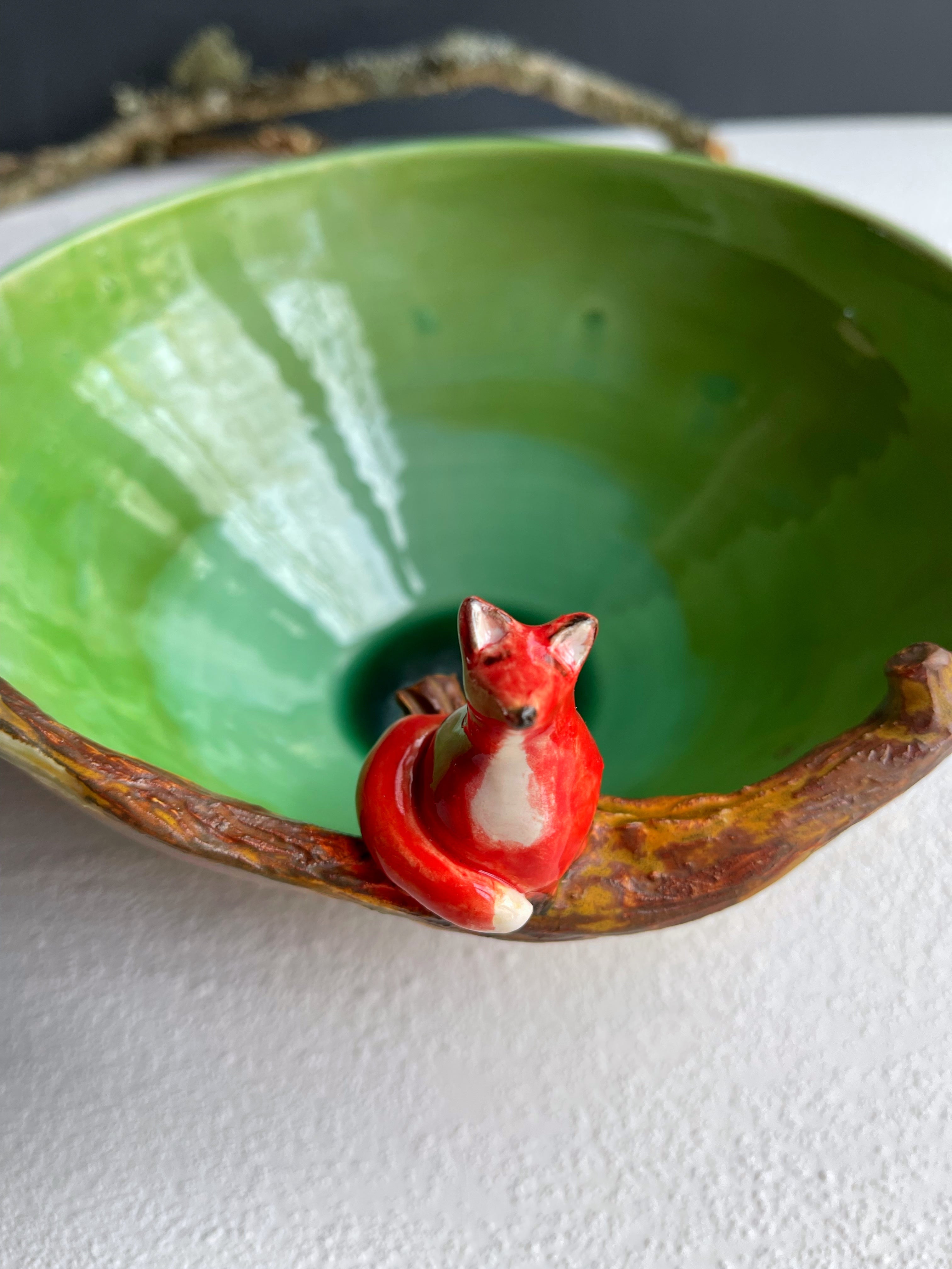 A hand sculpted fox sits on a lof. This special piece may be used as a special centerpiece or as a serving bowl. An owl sighting is often believed to signify guidance from one’s ancestors. As a spirit animal the fox is a guardian and brings your cunning intuitive insights.