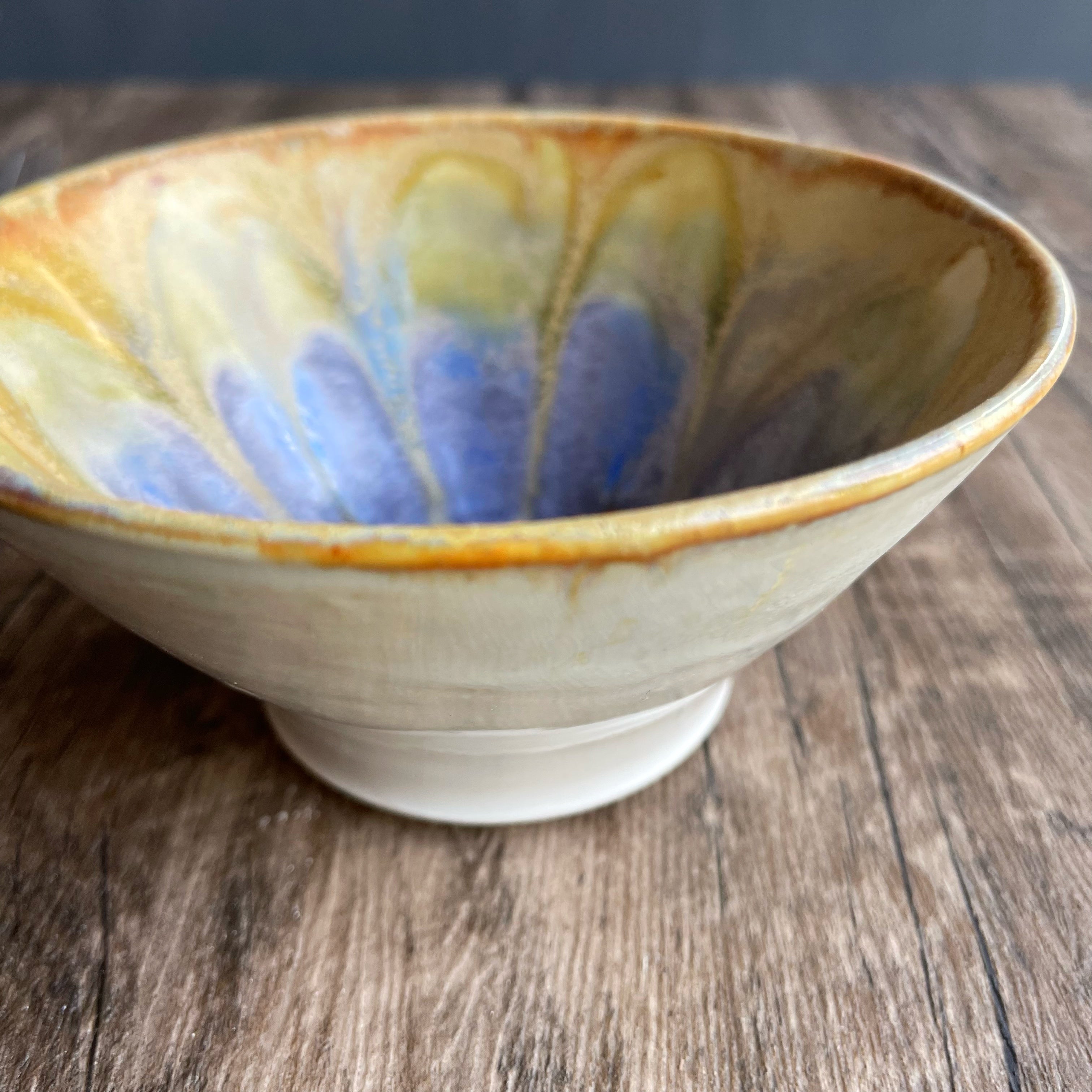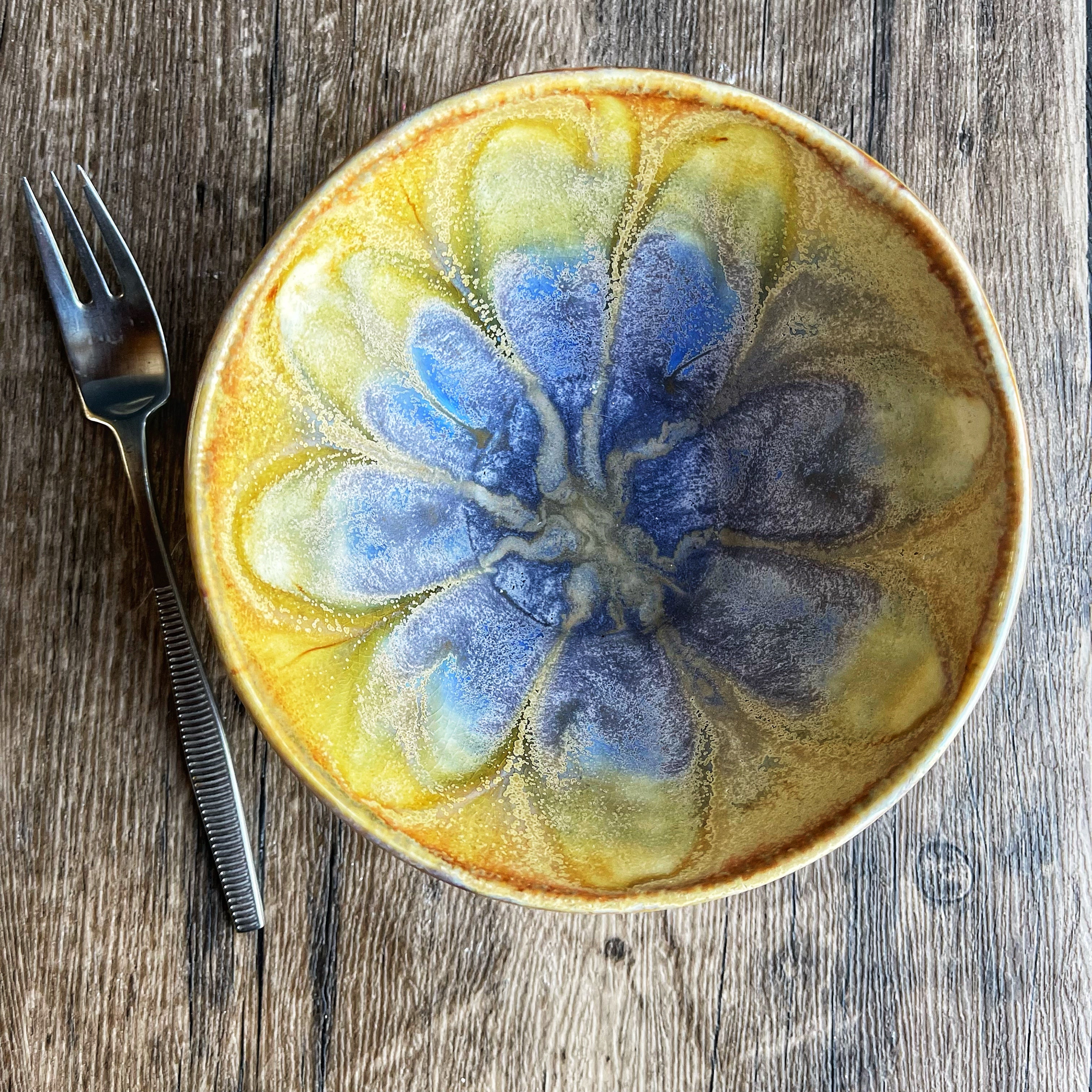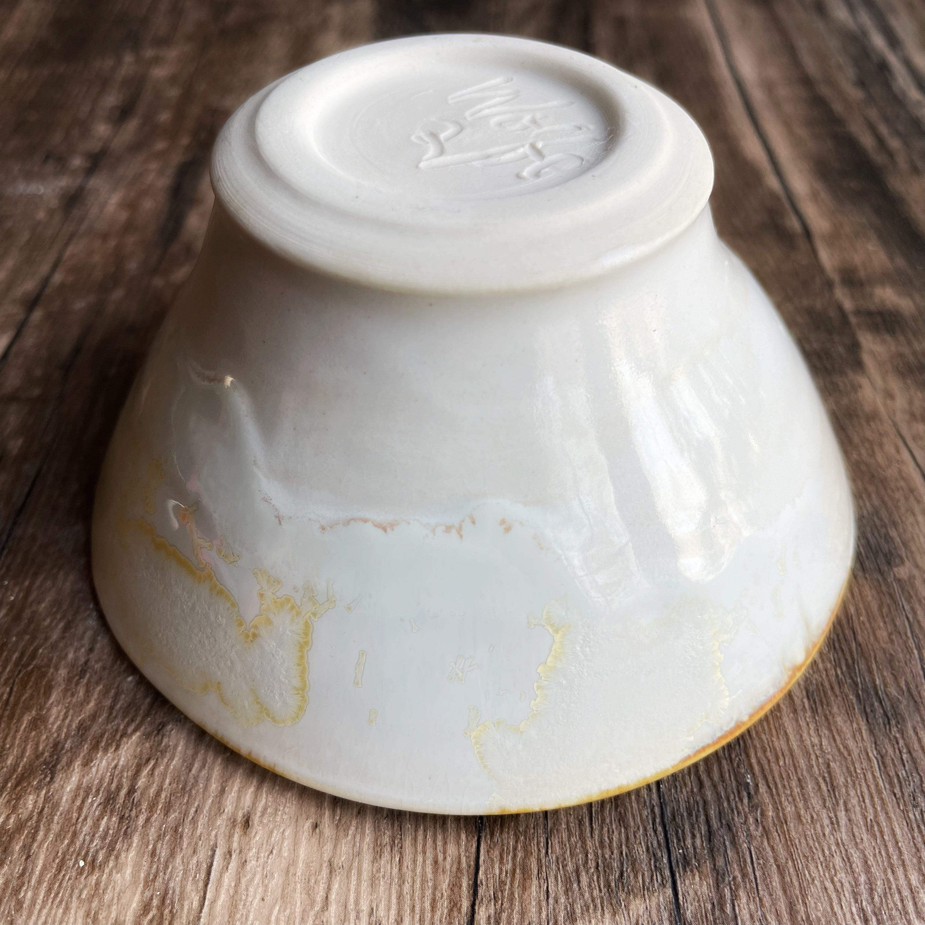 This is a test bowl I made in porcelain clay that turned out quite beautifully. It has soft golden and lavender microcrystals.