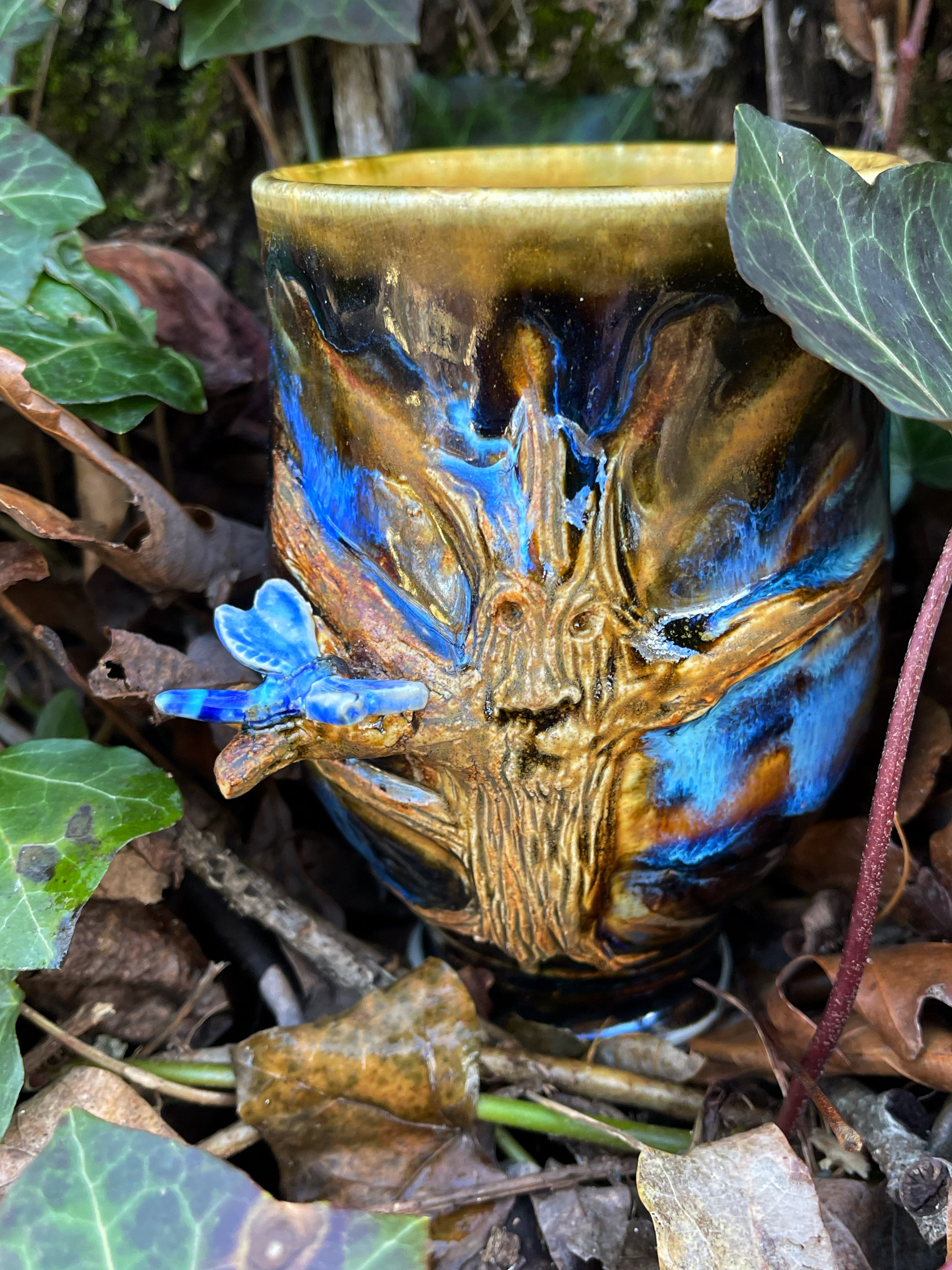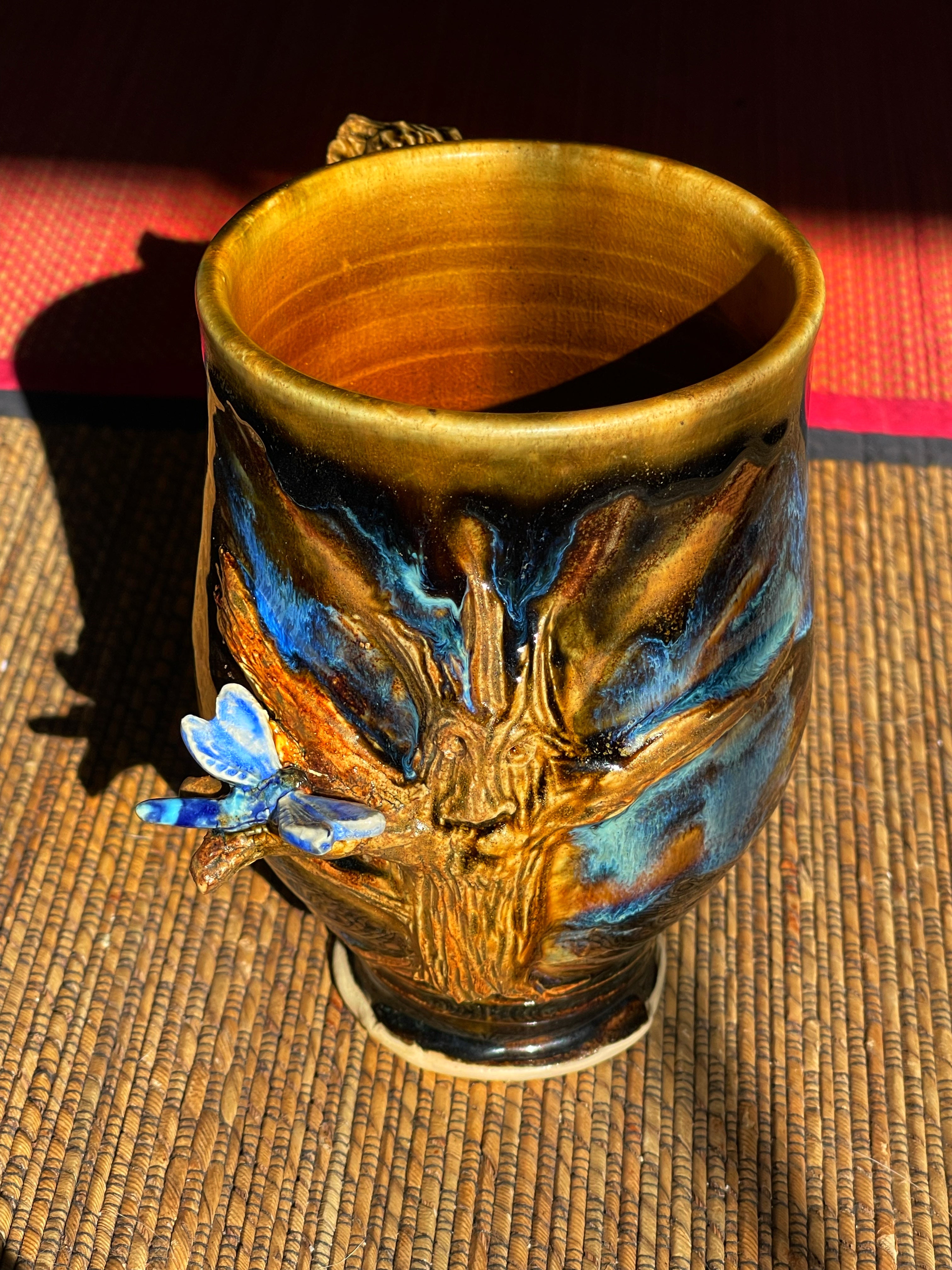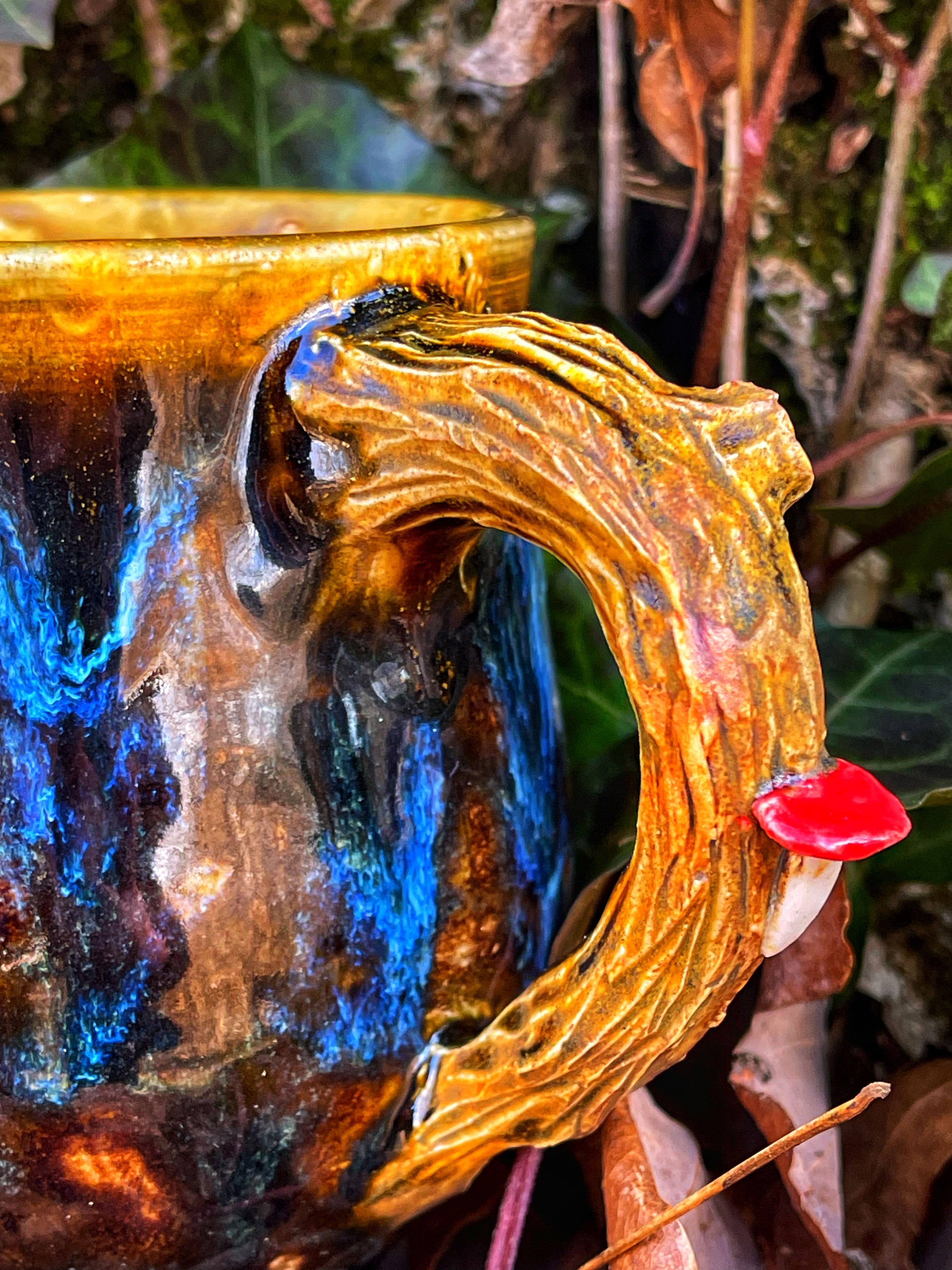 This mug is sculpted with trees and a tree branch handle and shelf mushrooms . A dragonfly perches on a branch.