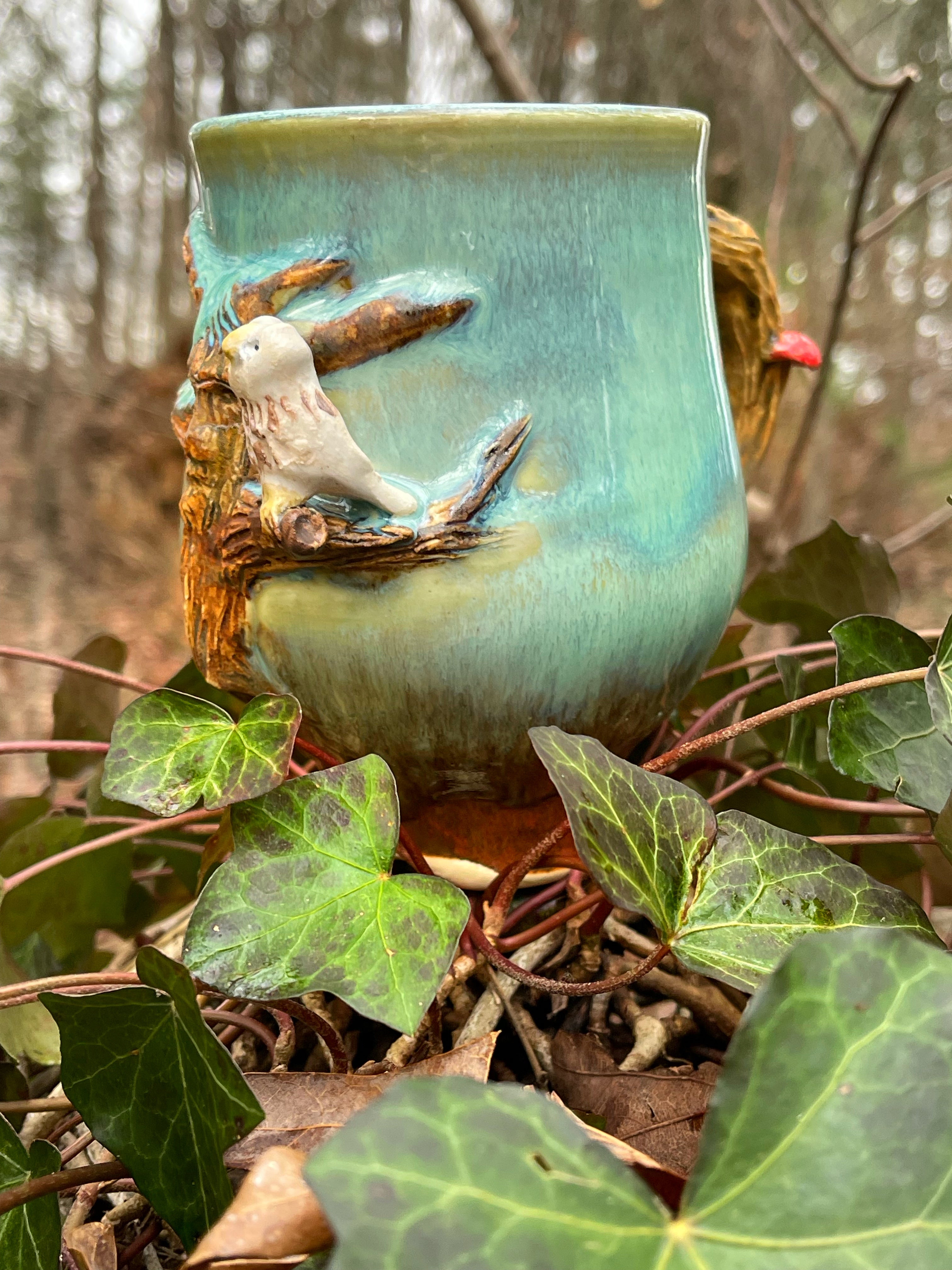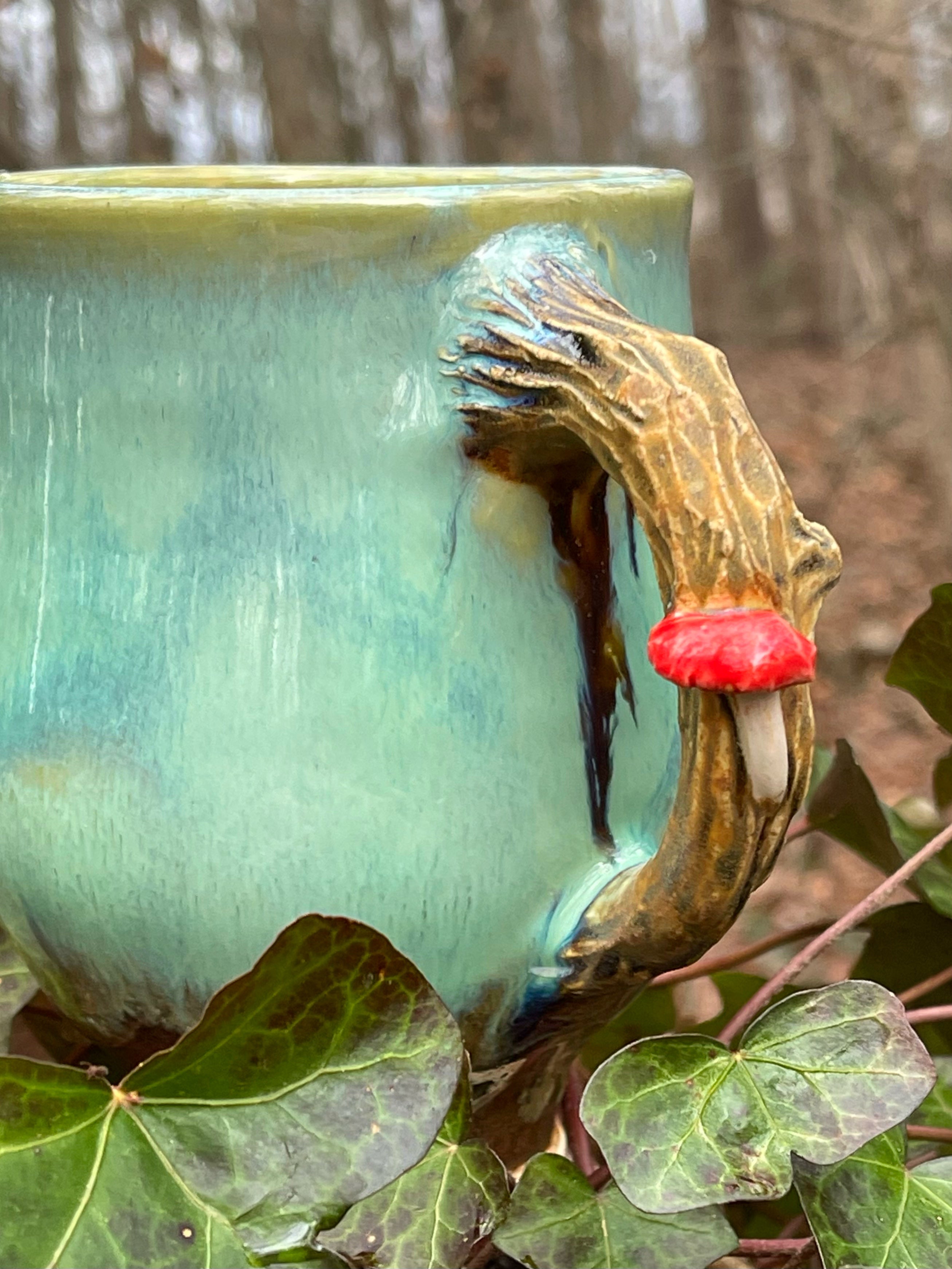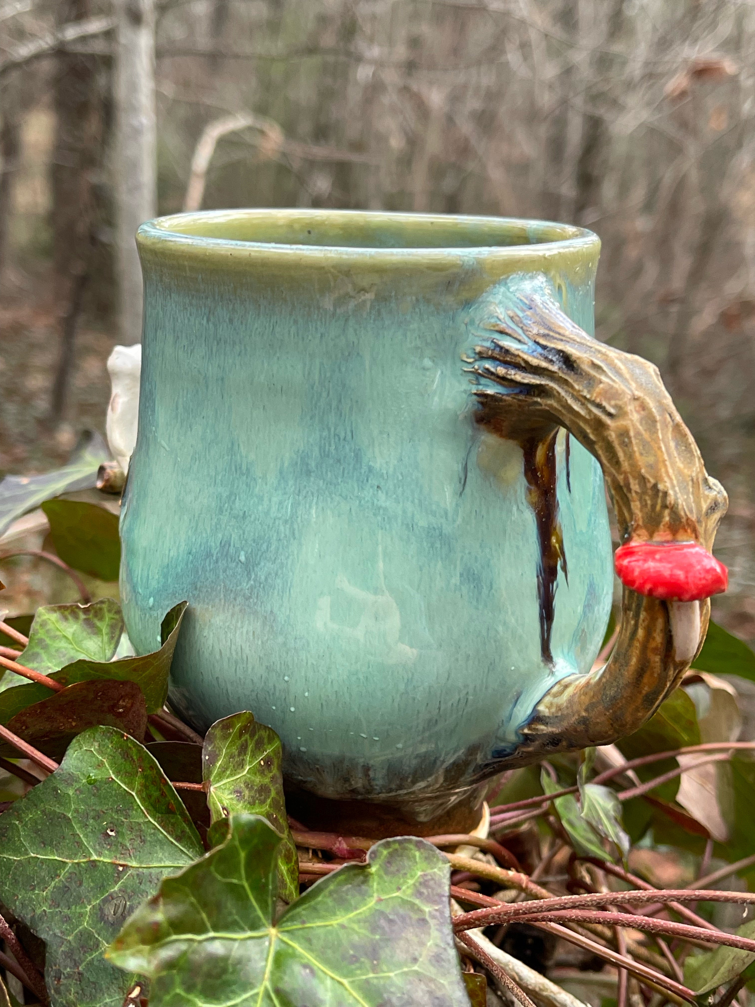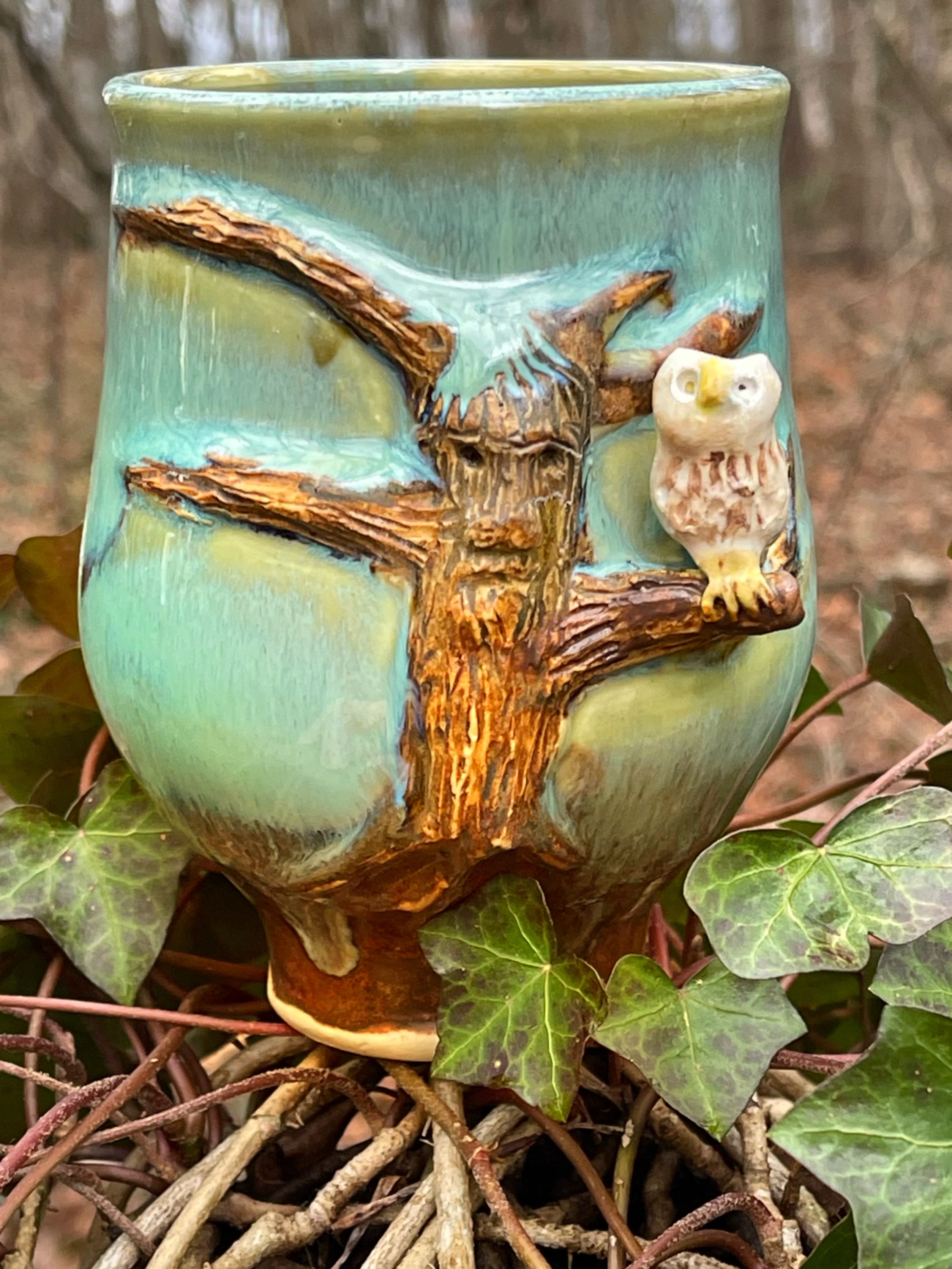 This mug is sculpted with trees and a tree branch handle and shelf mushrooms . An owl perches on a branch.