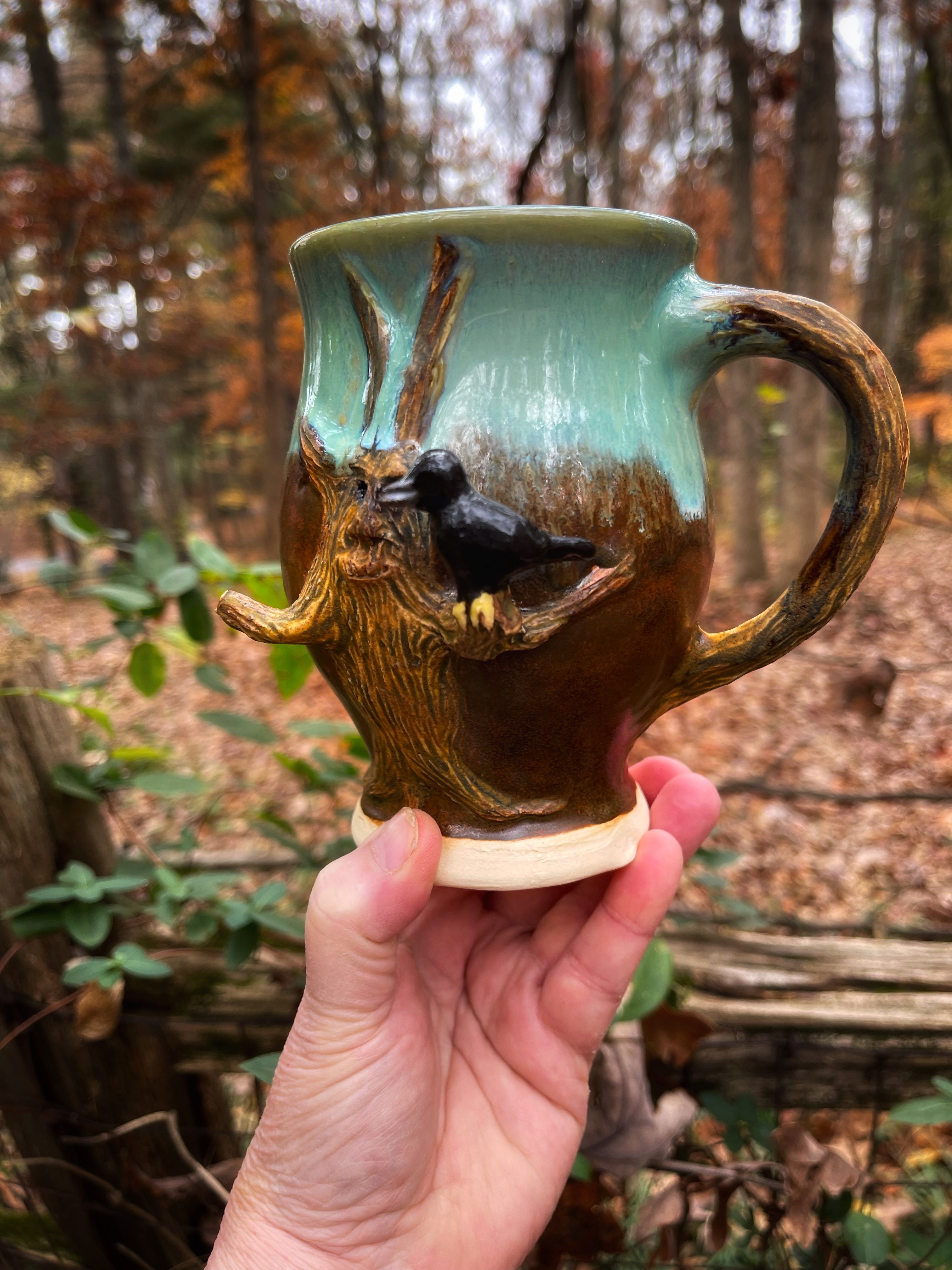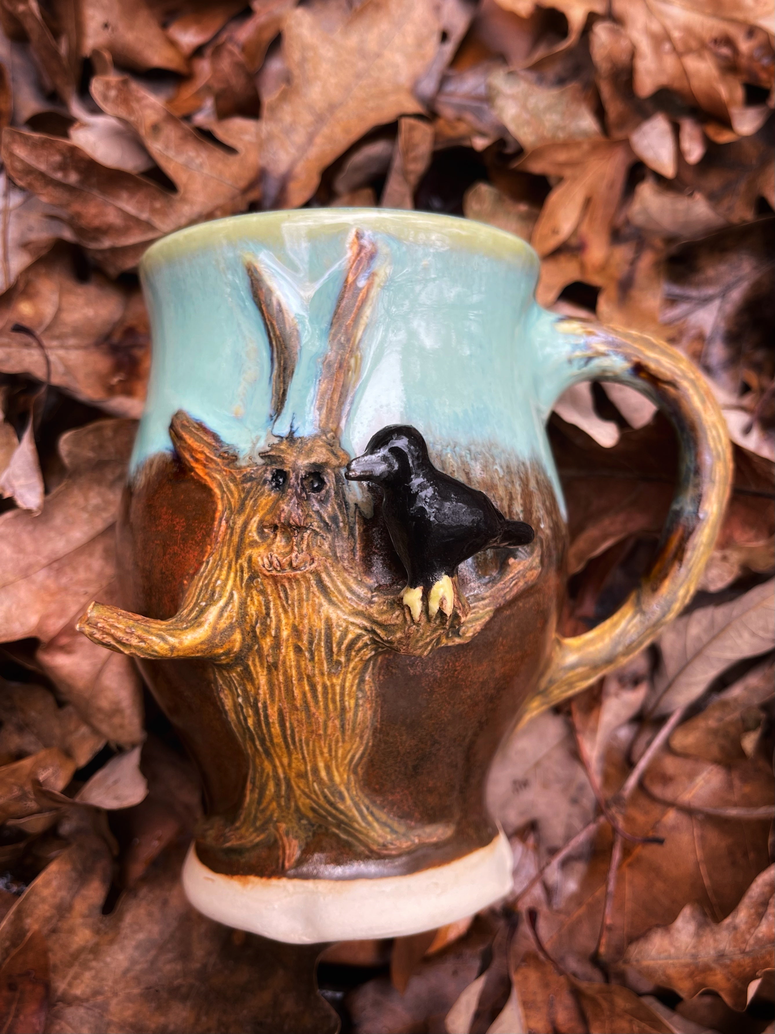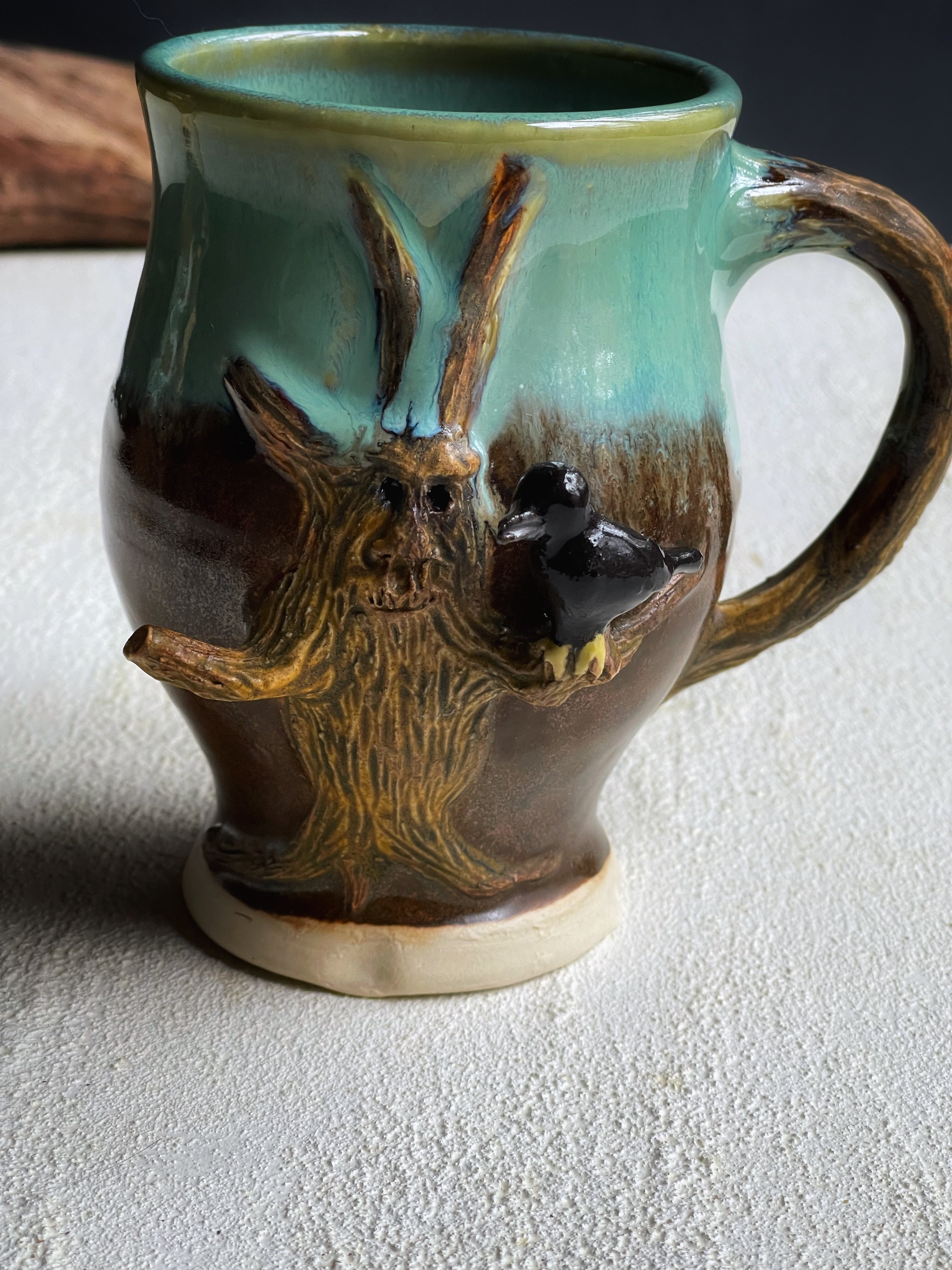 this mug is sculpted with trees and a tree branch handle. A raven perches on a branch. The raven is a protector. There is a sculpted face in the Raven’s tree, a reminder of the interconnectedness of all life. If you feel connected to ravens or to someone with an affinity to them this might be for you.