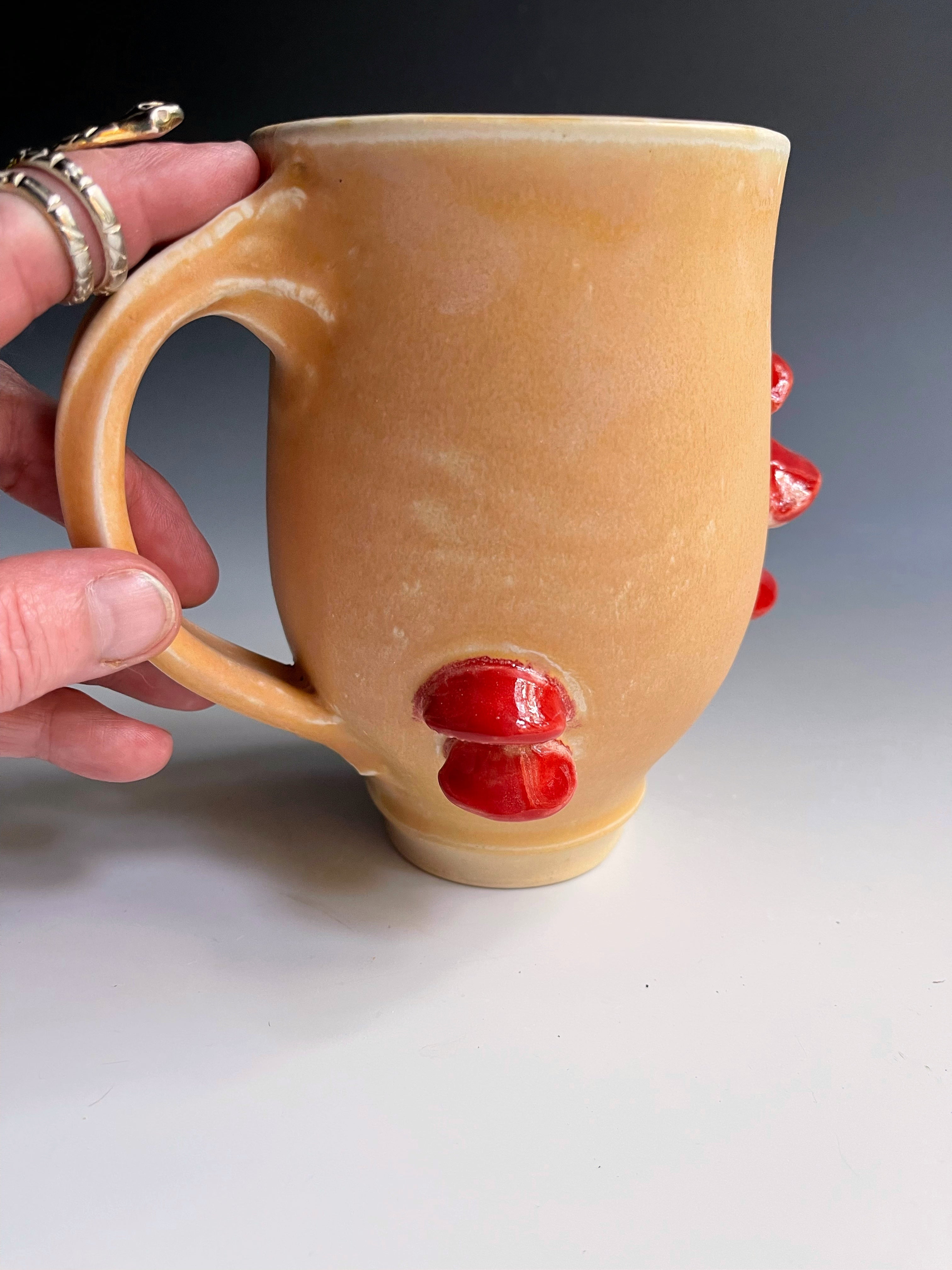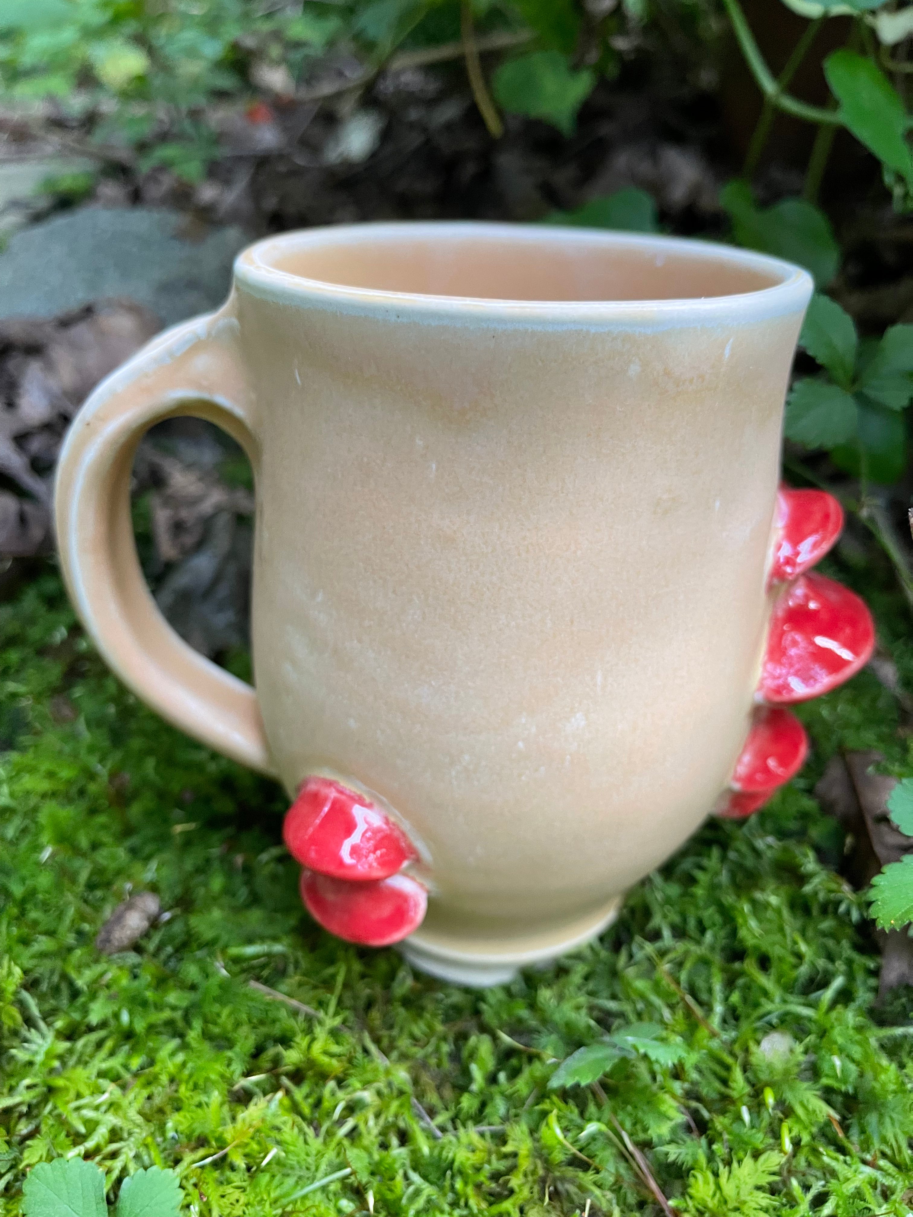Shelf Mushroom mug glazed in multicolor glazes. entirely hand sculpted and pleasingly well balanced- a pure delight to hold in your hand.